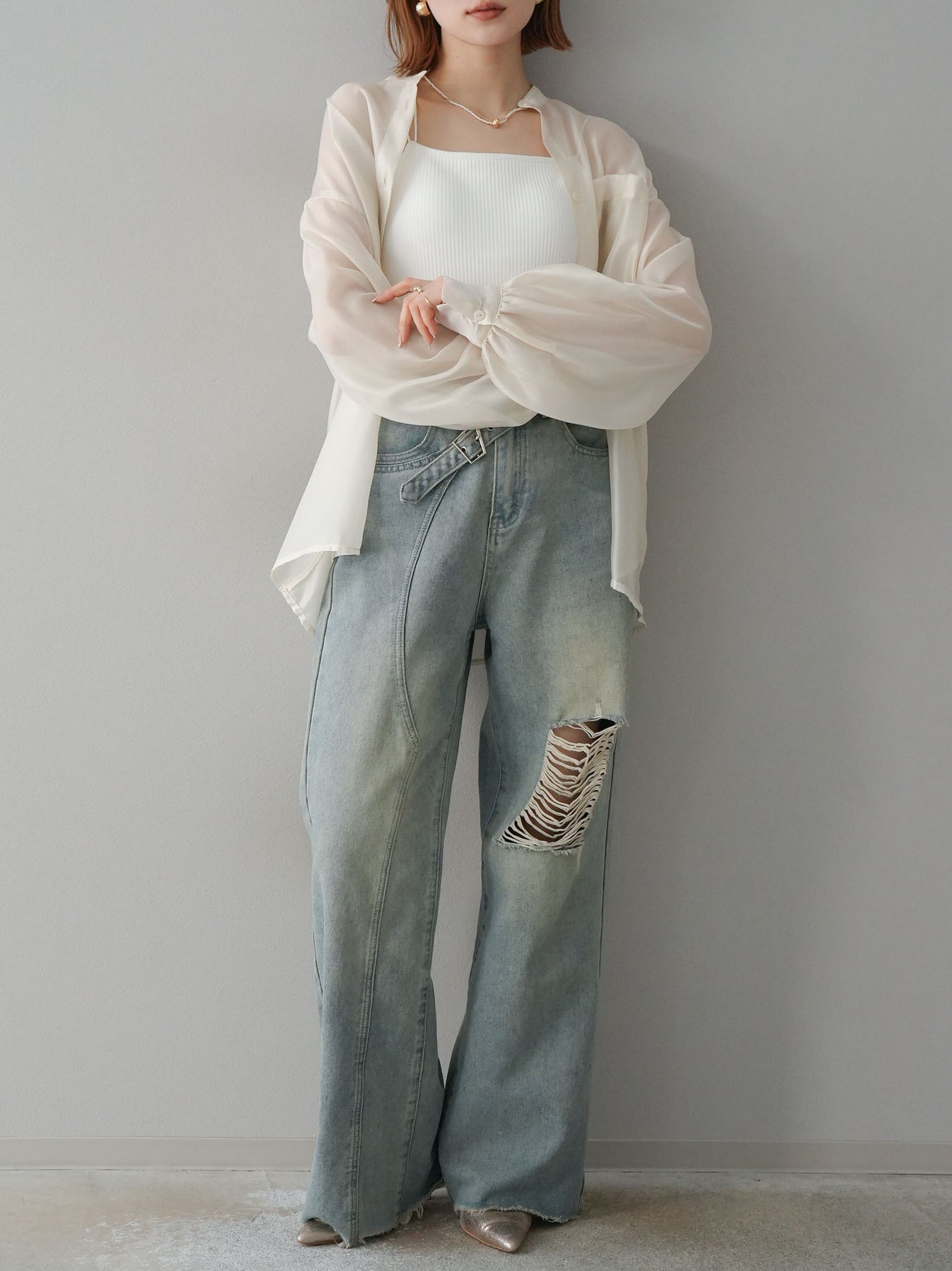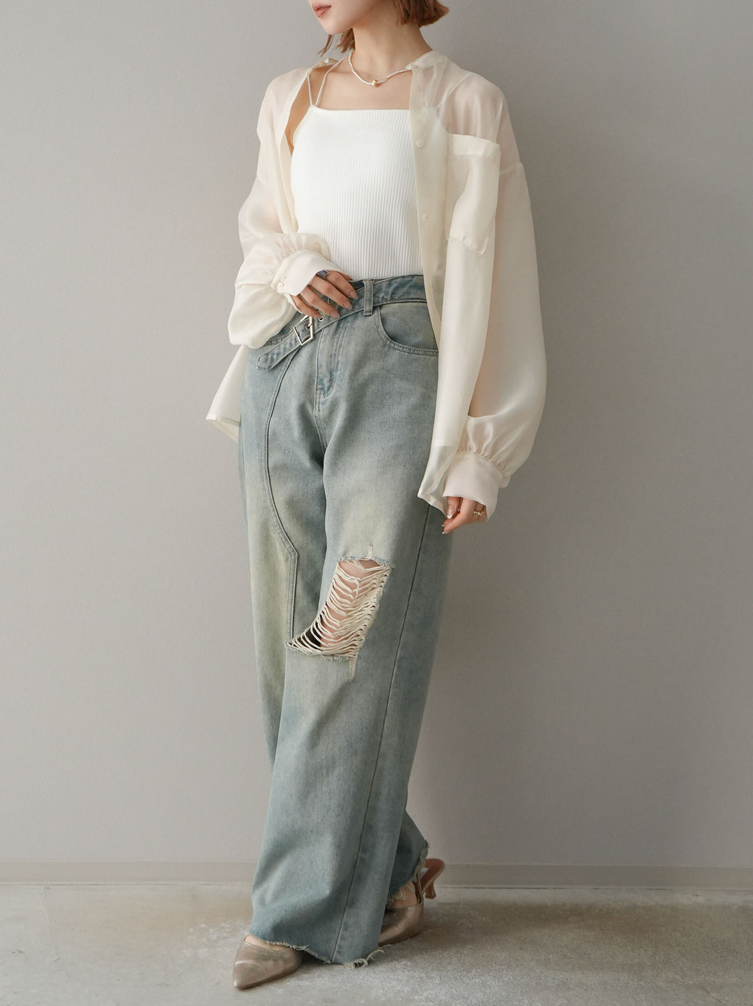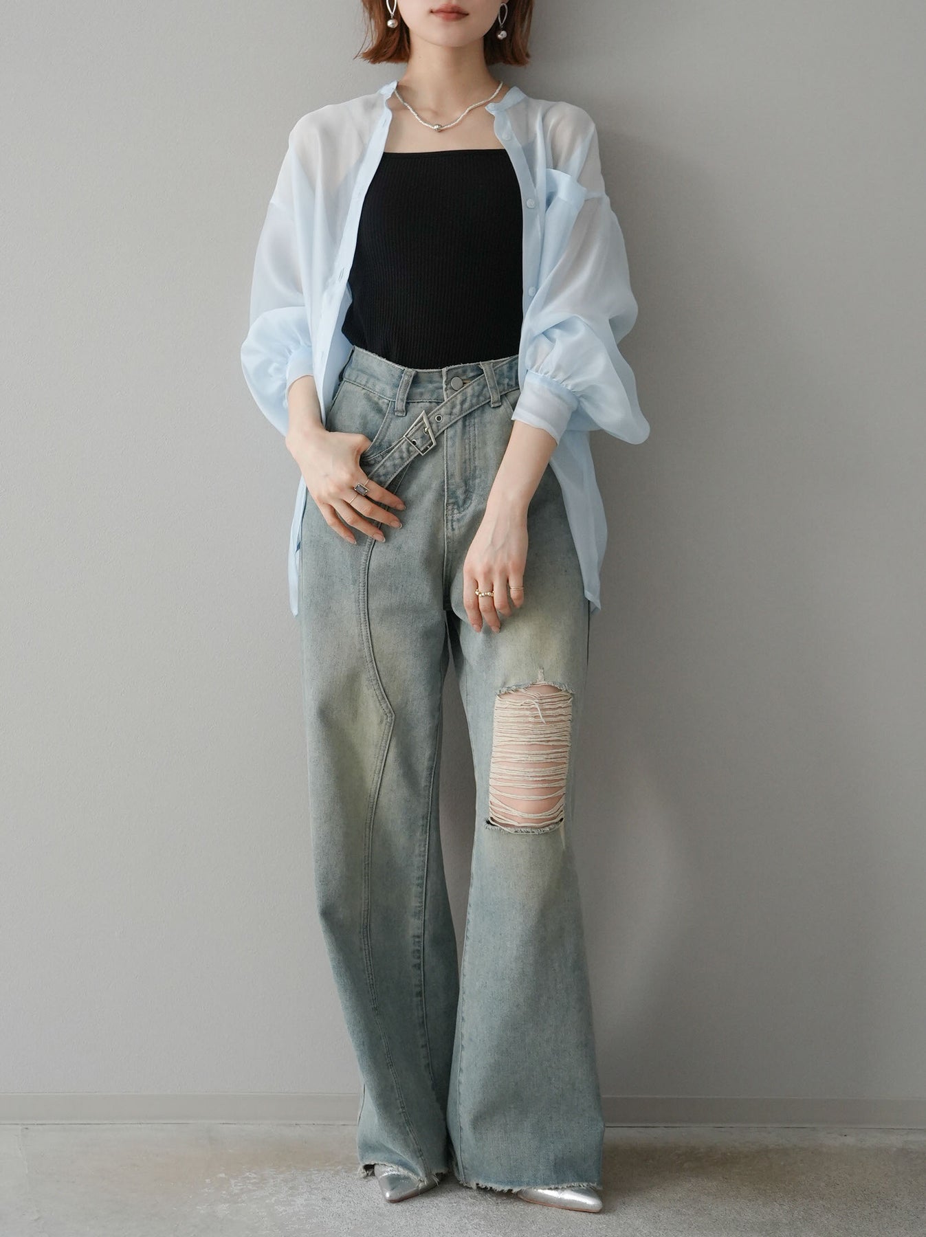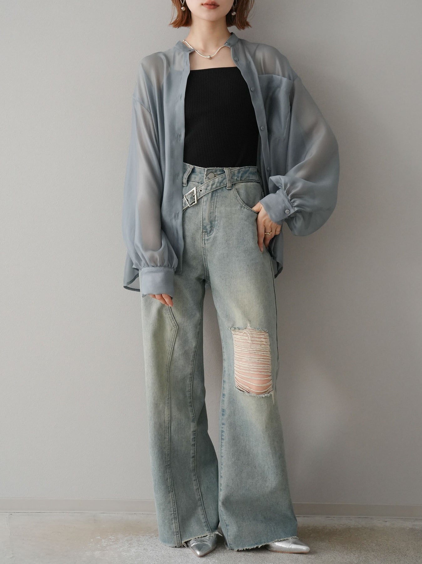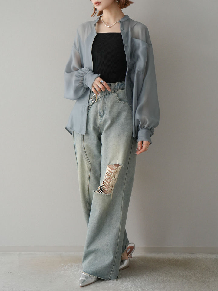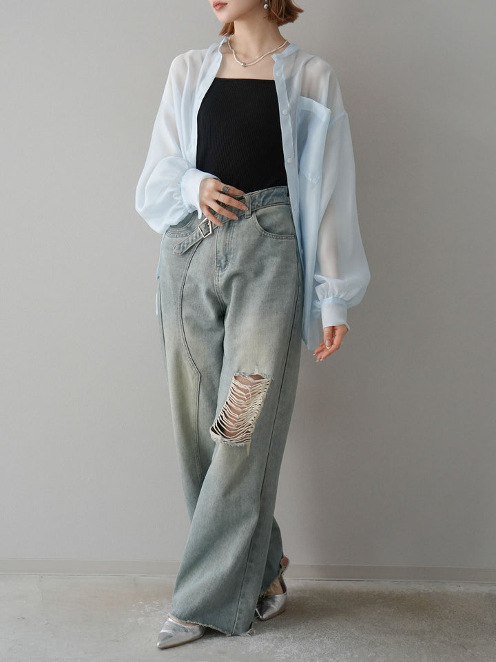 [SET]シアーシャイニーボリュームスリーブシャツ+ベルトアシンメトリーダメージデニム(2set)