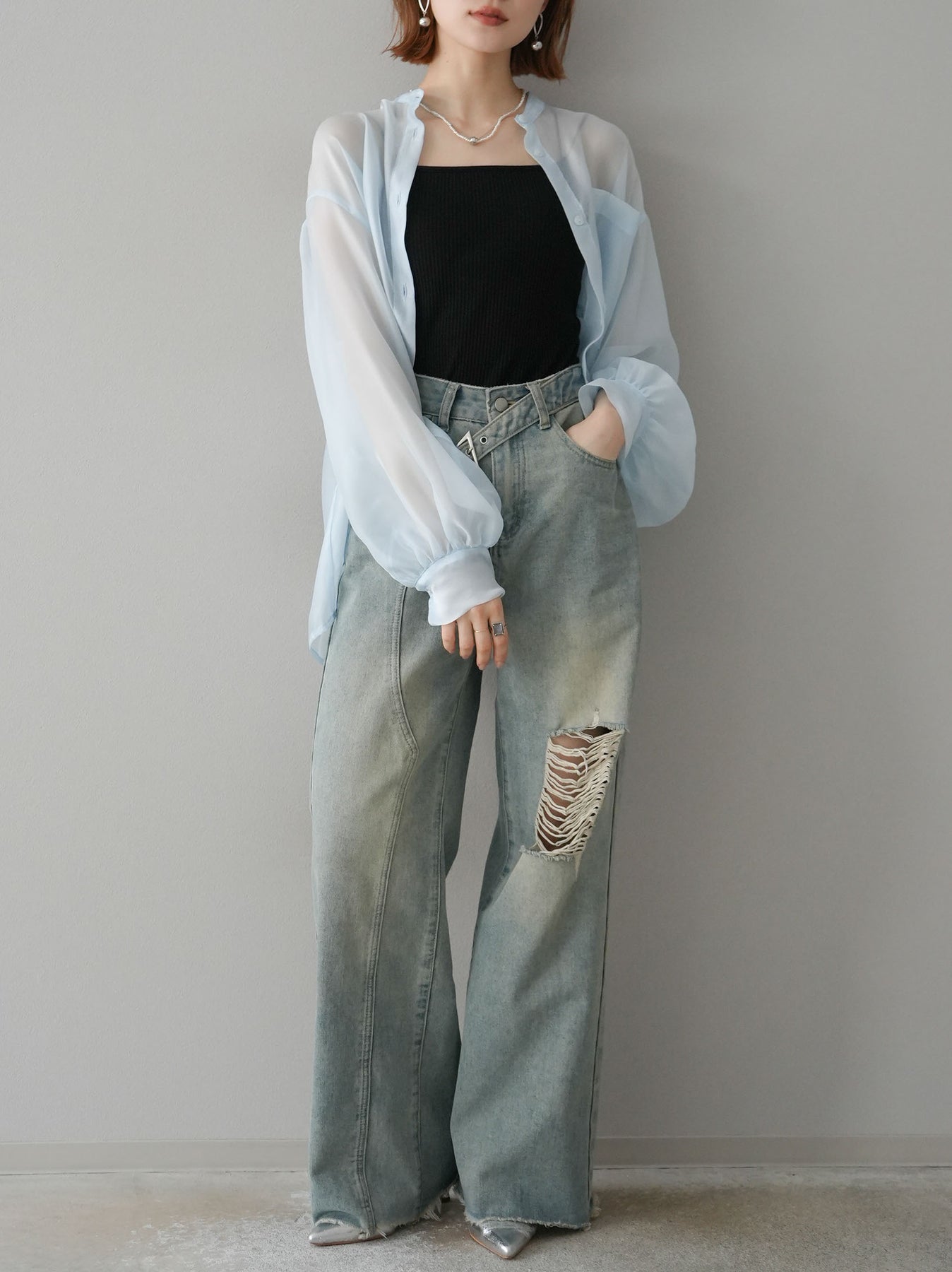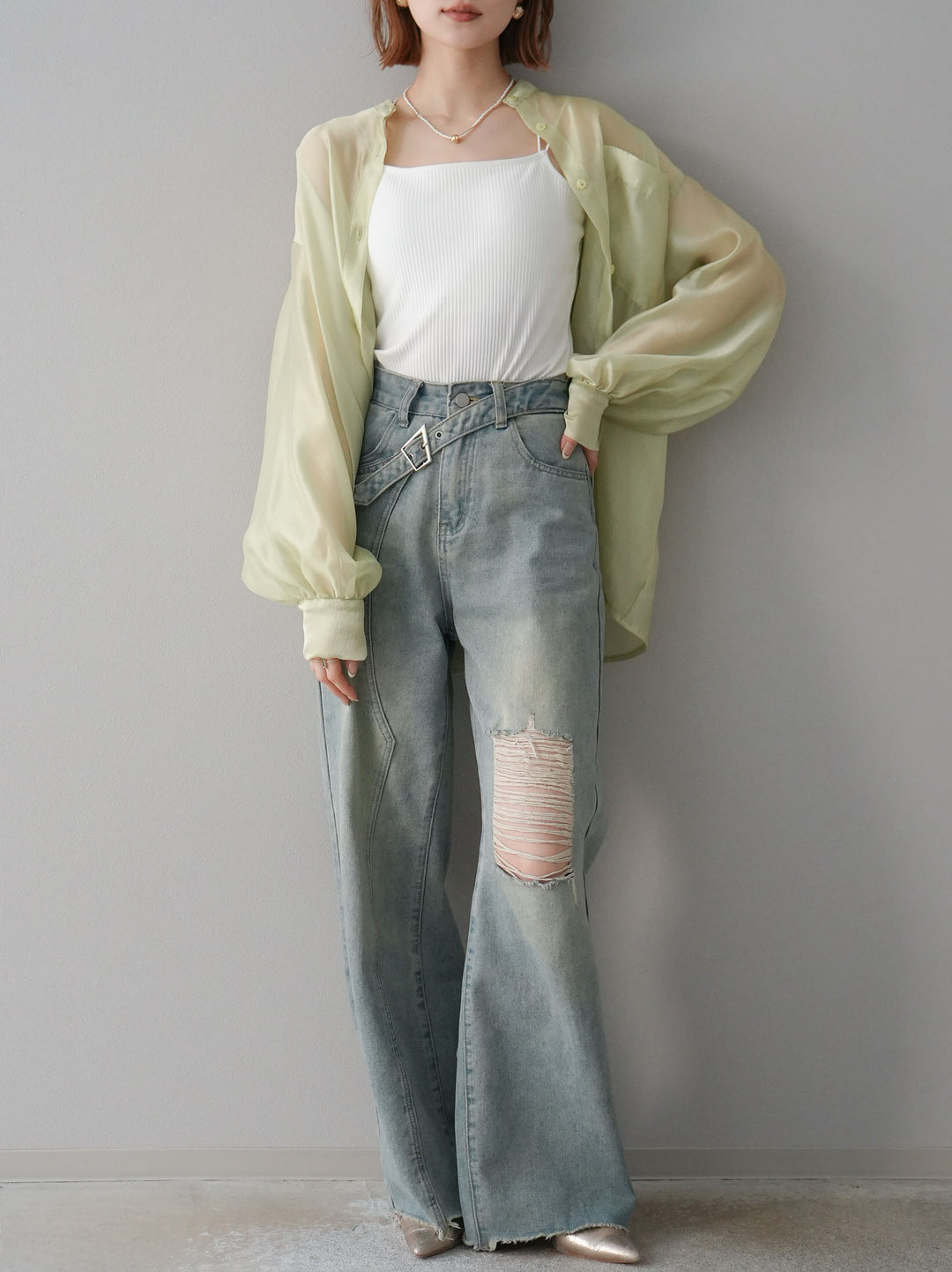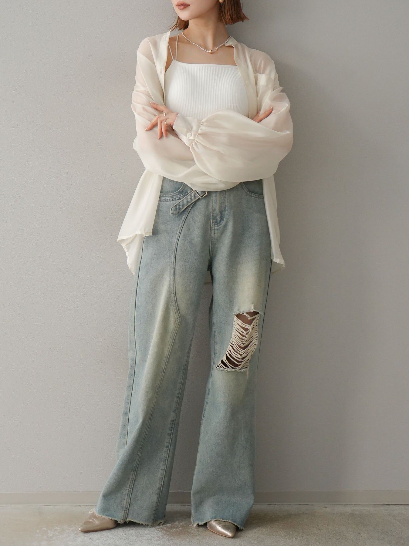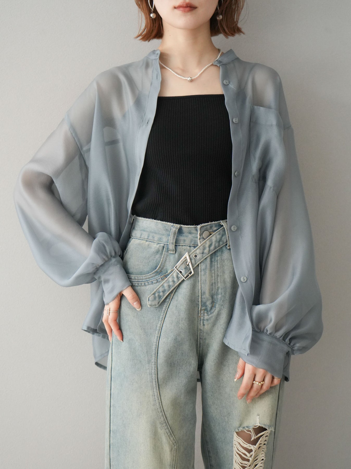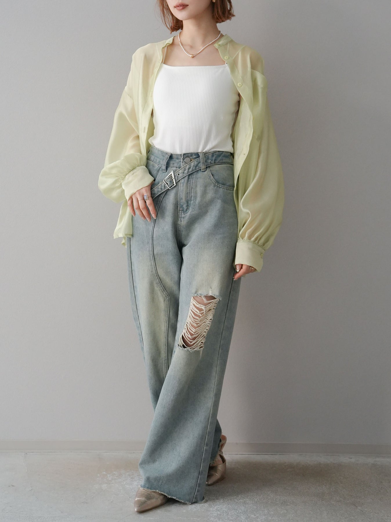 [SET]シアーシャイニーボリュームスリーブシャツ+ベルトアシンメトリーダメージデニム(2set)
