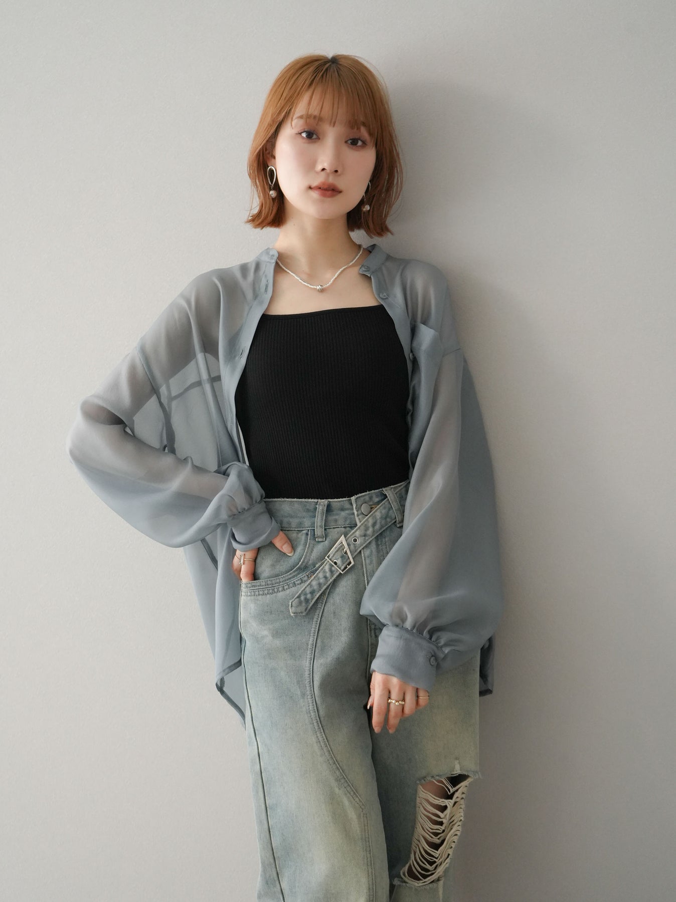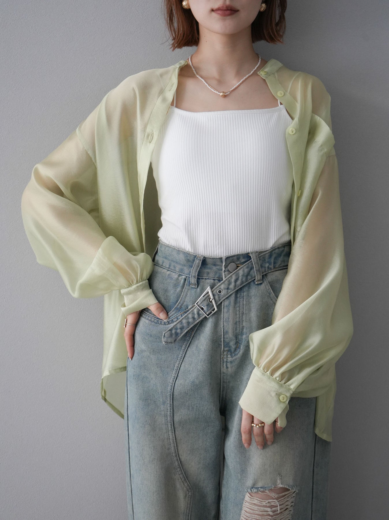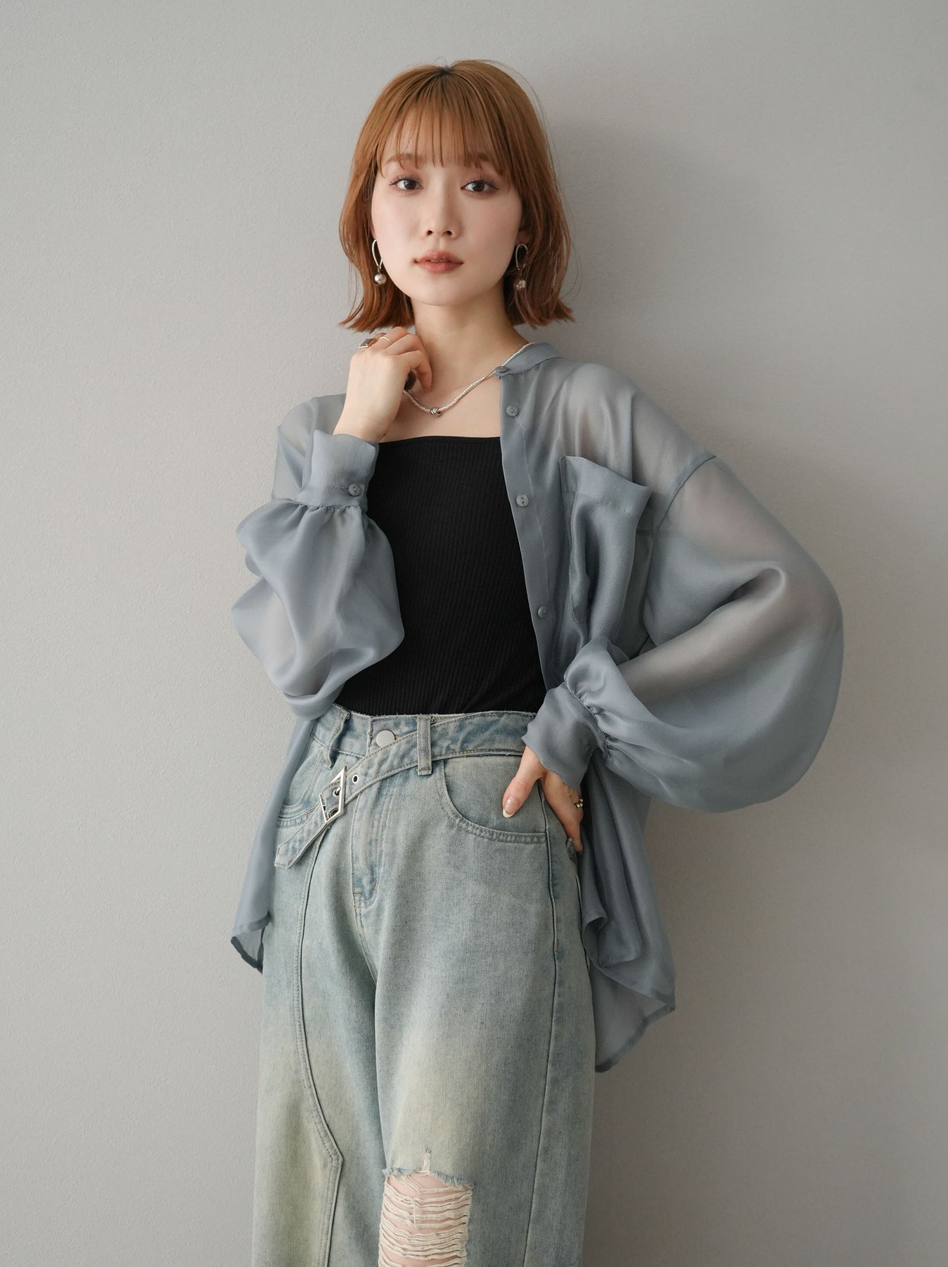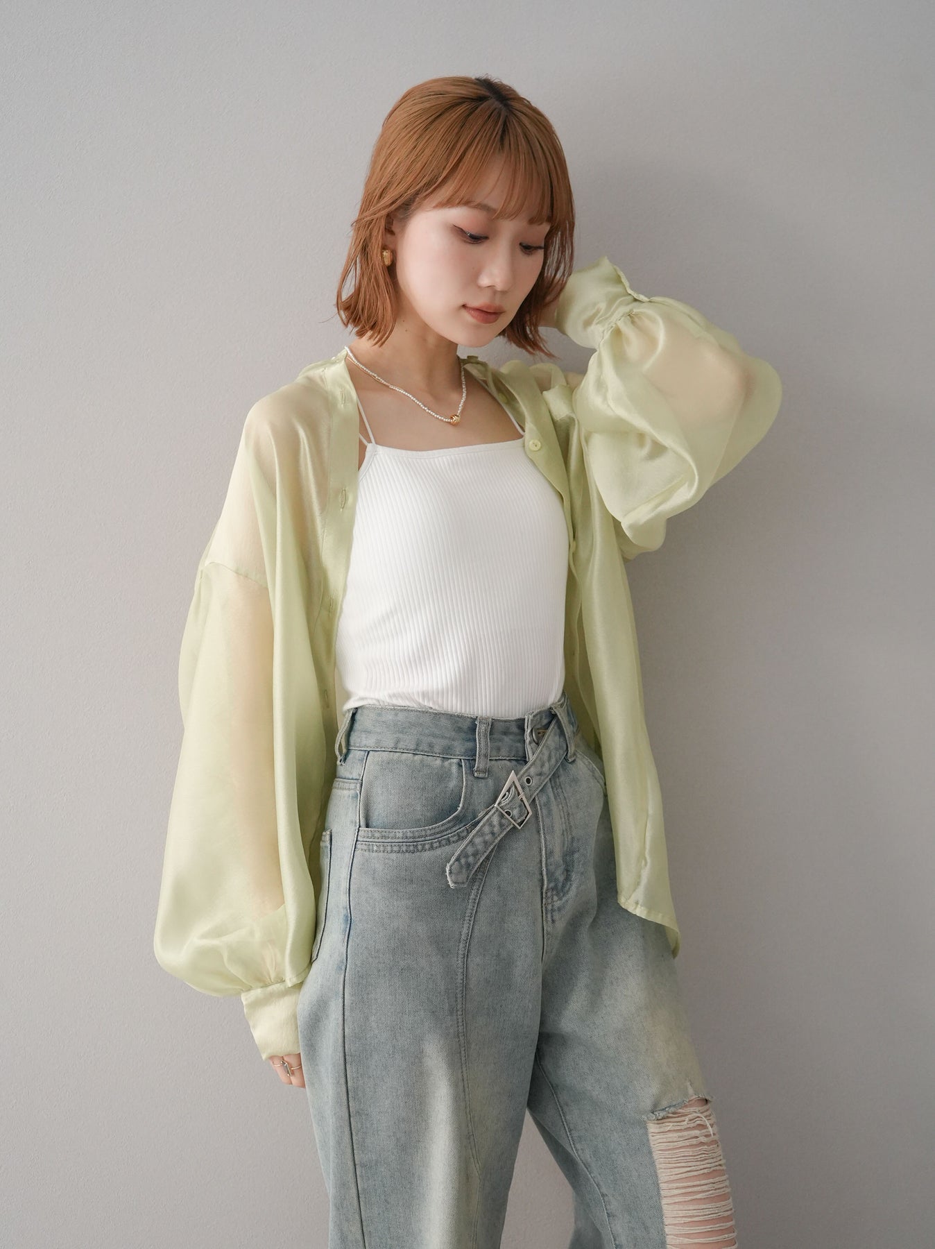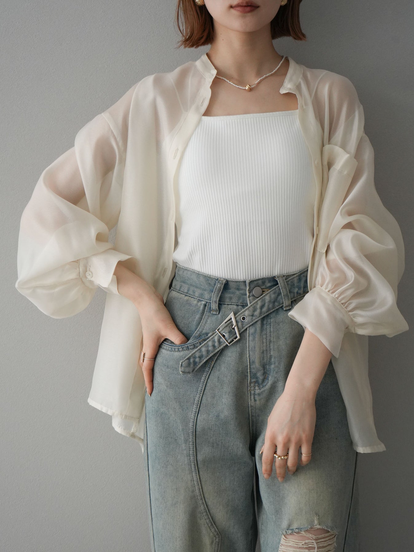 [SET]シアーシャイニーボリュームスリーブシャツ+ベルトアシンメトリーダメージデニム(2set)