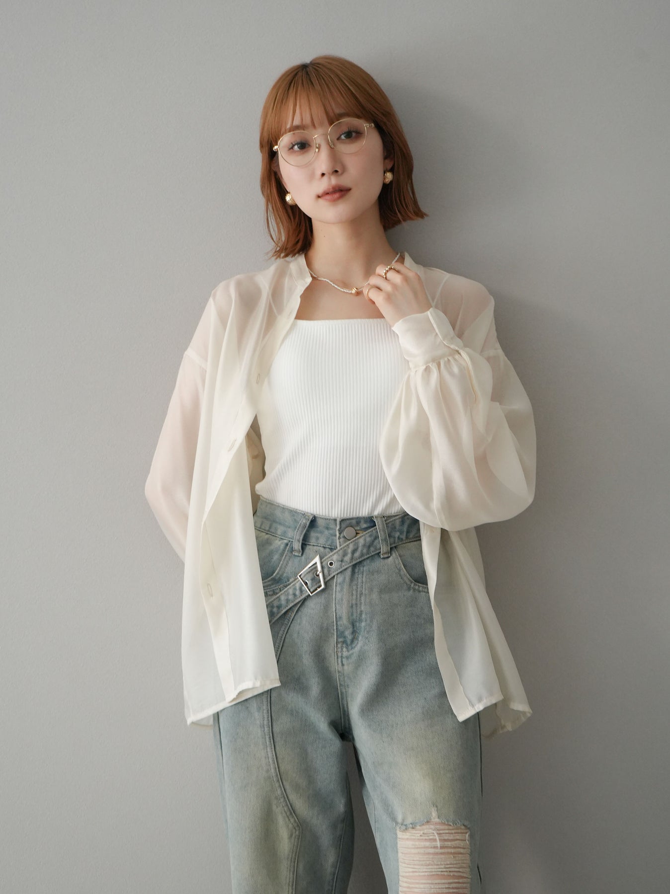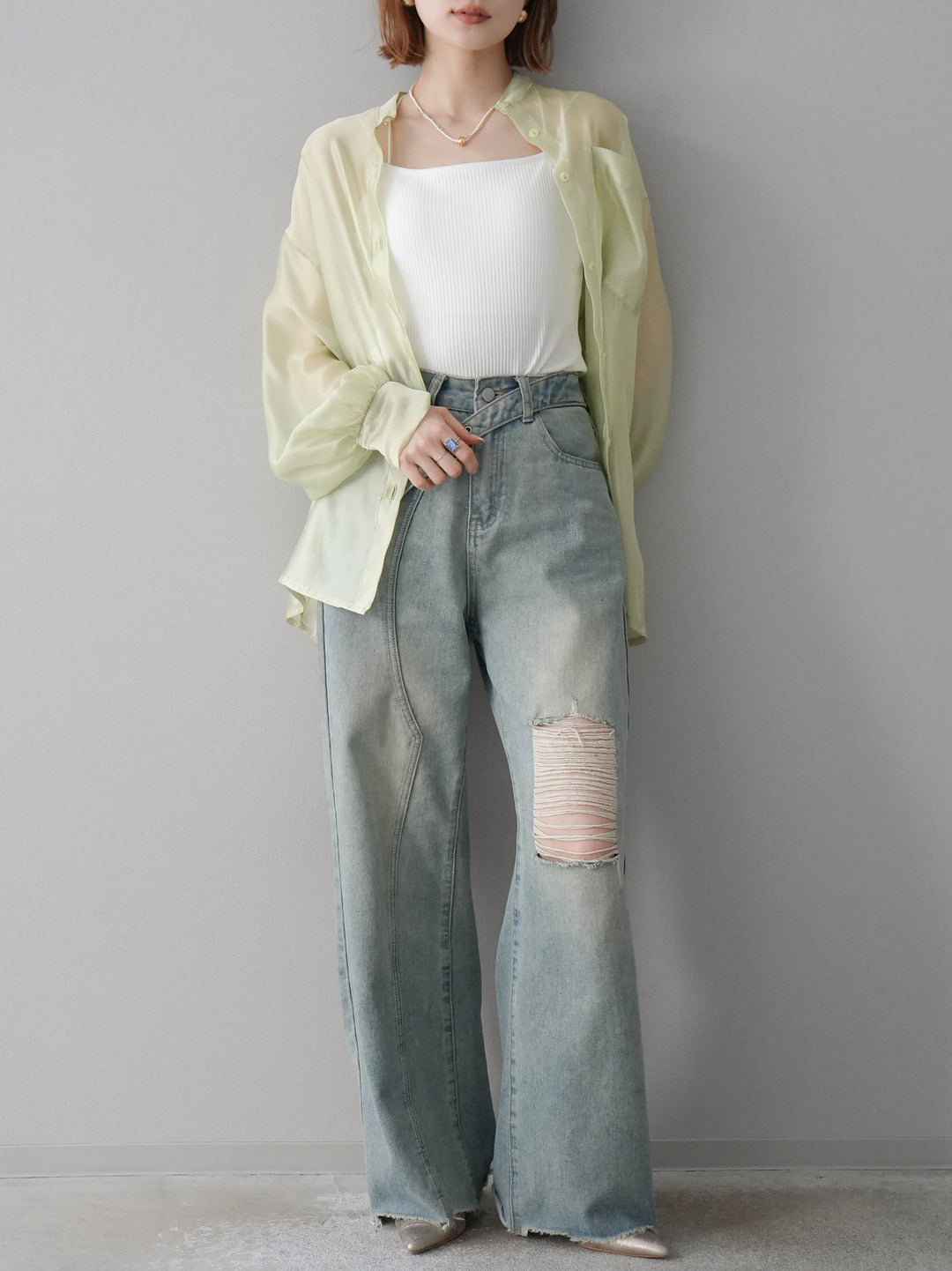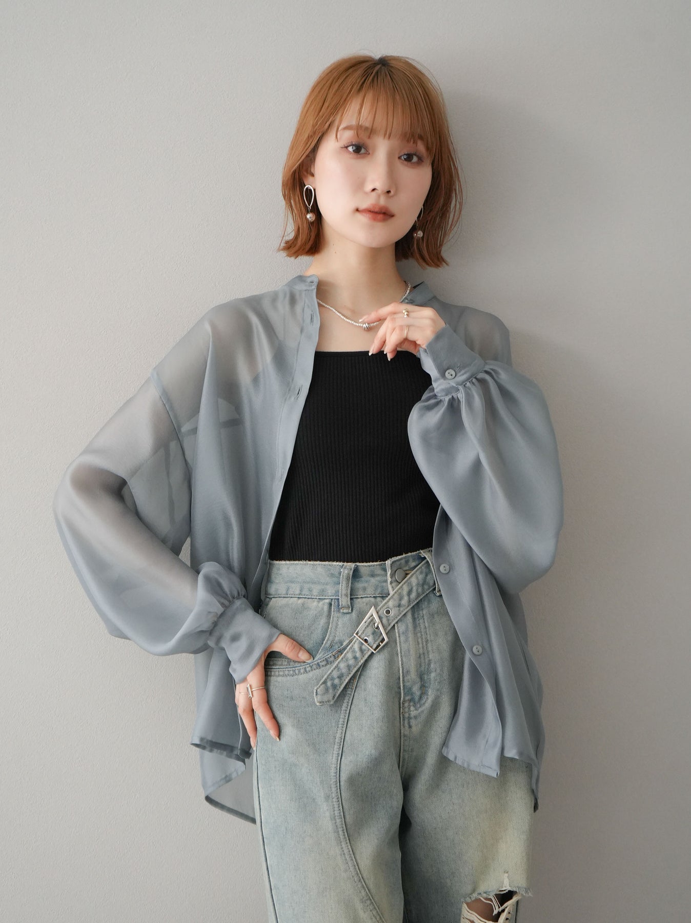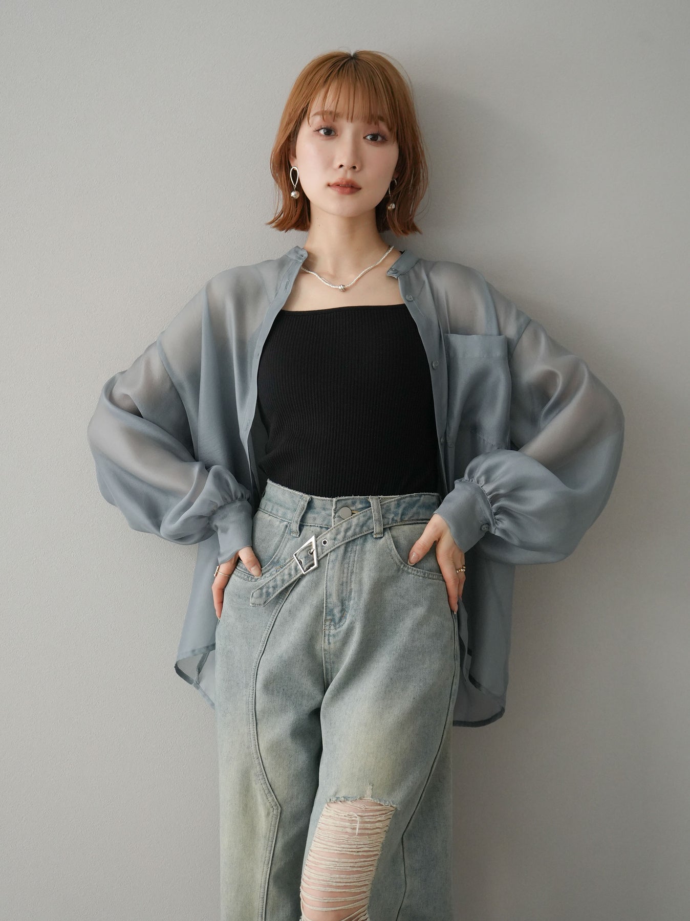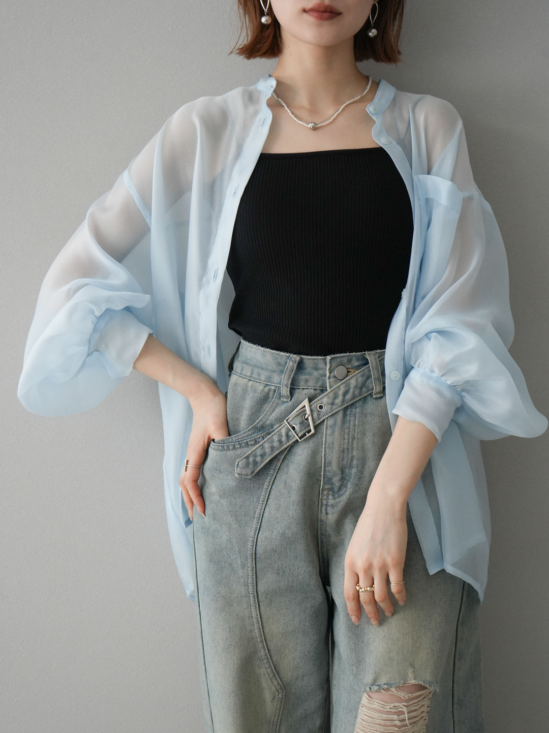 [SET]シアーシャイニーボリュームスリーブシャツ+ベルトアシンメトリーダメージデニム(2set)