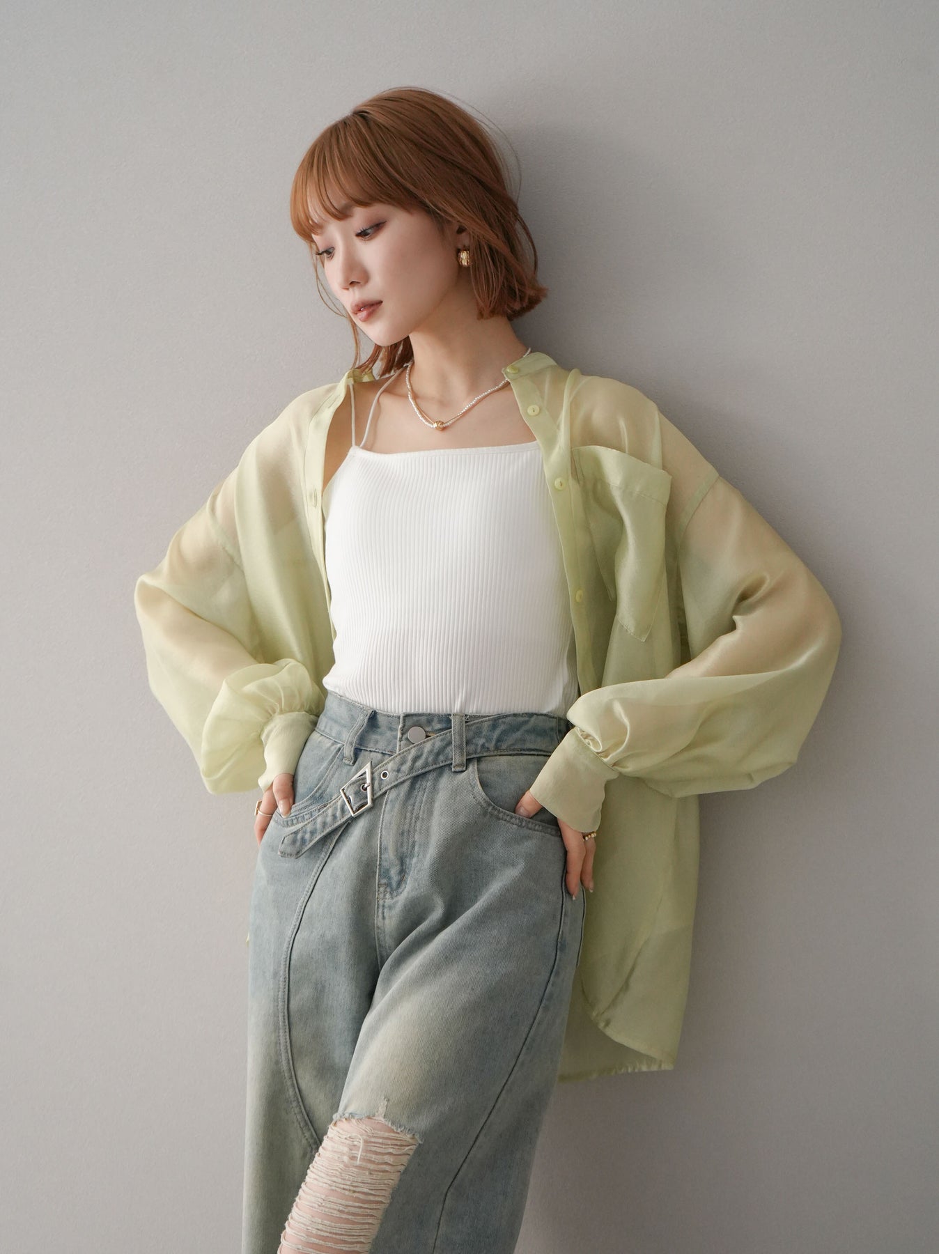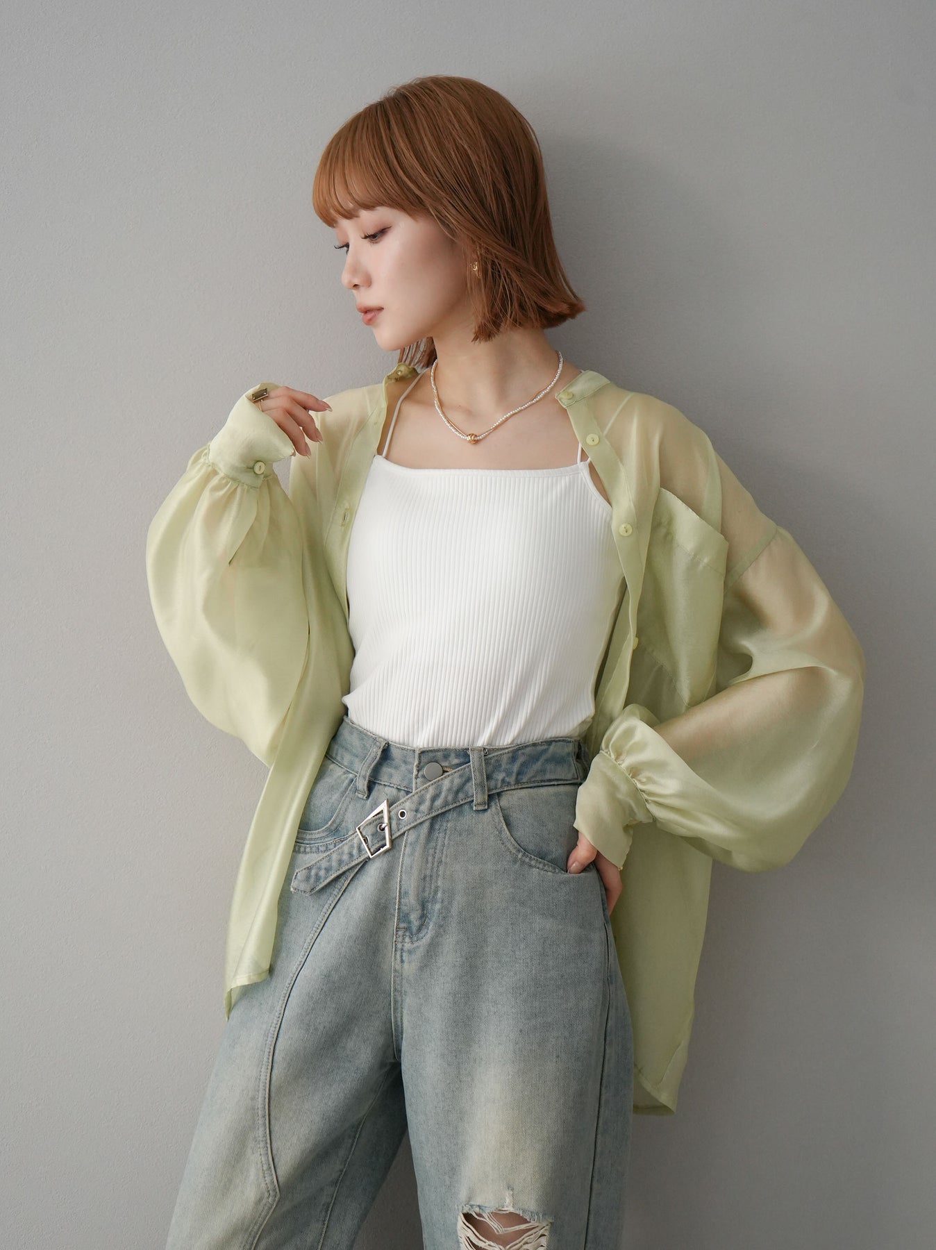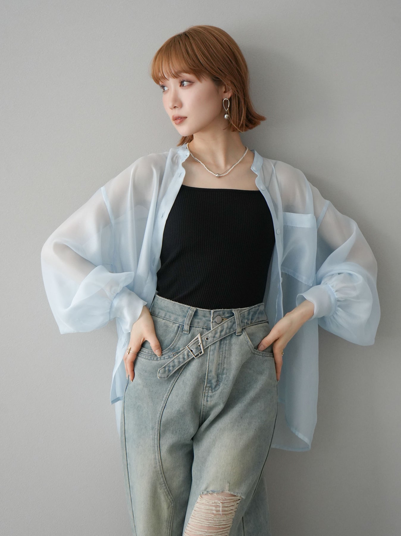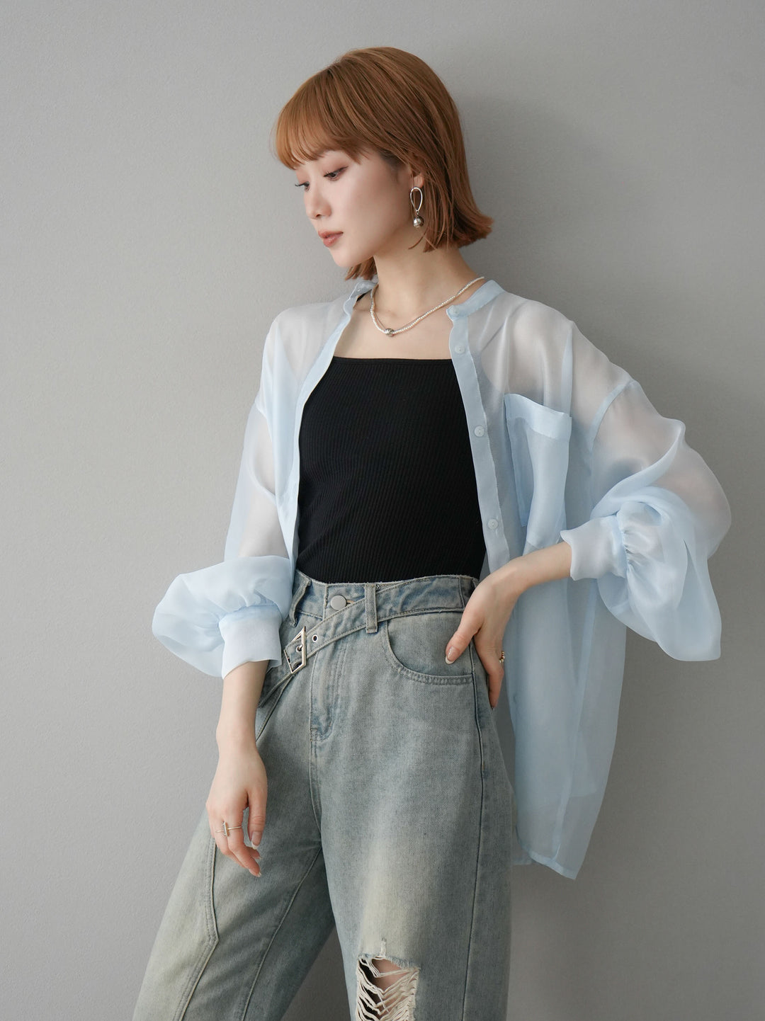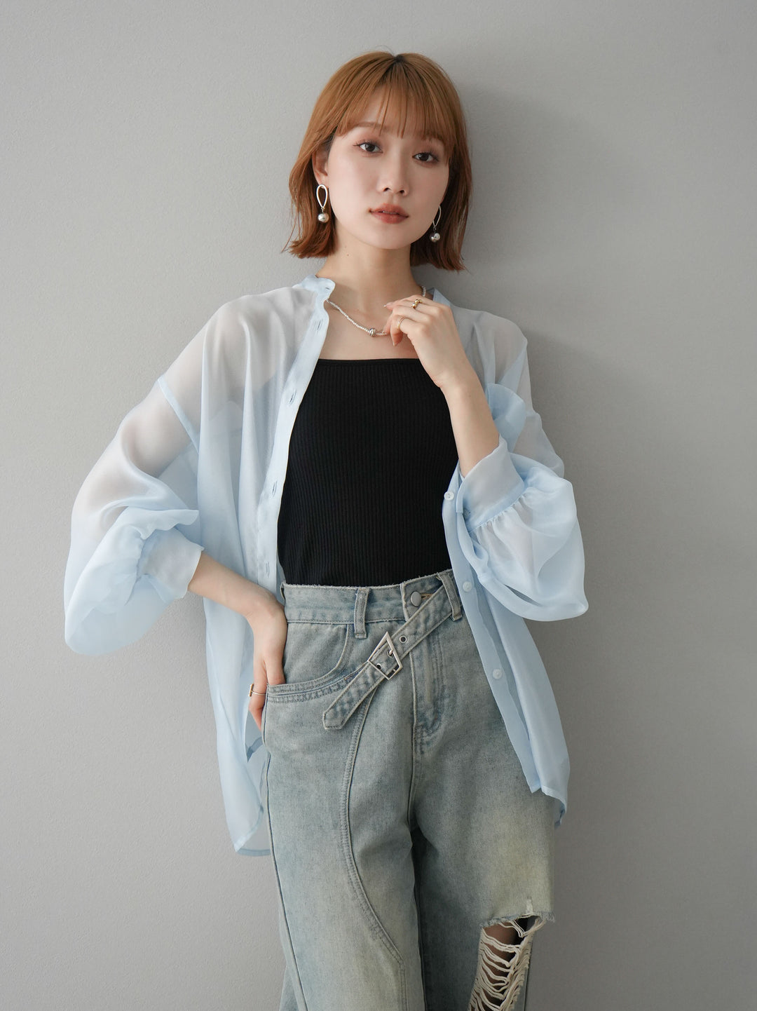 [SET]シアーシャイニーボリュームスリーブシャツ+ベルトアシンメトリーダメージデニム(2set)