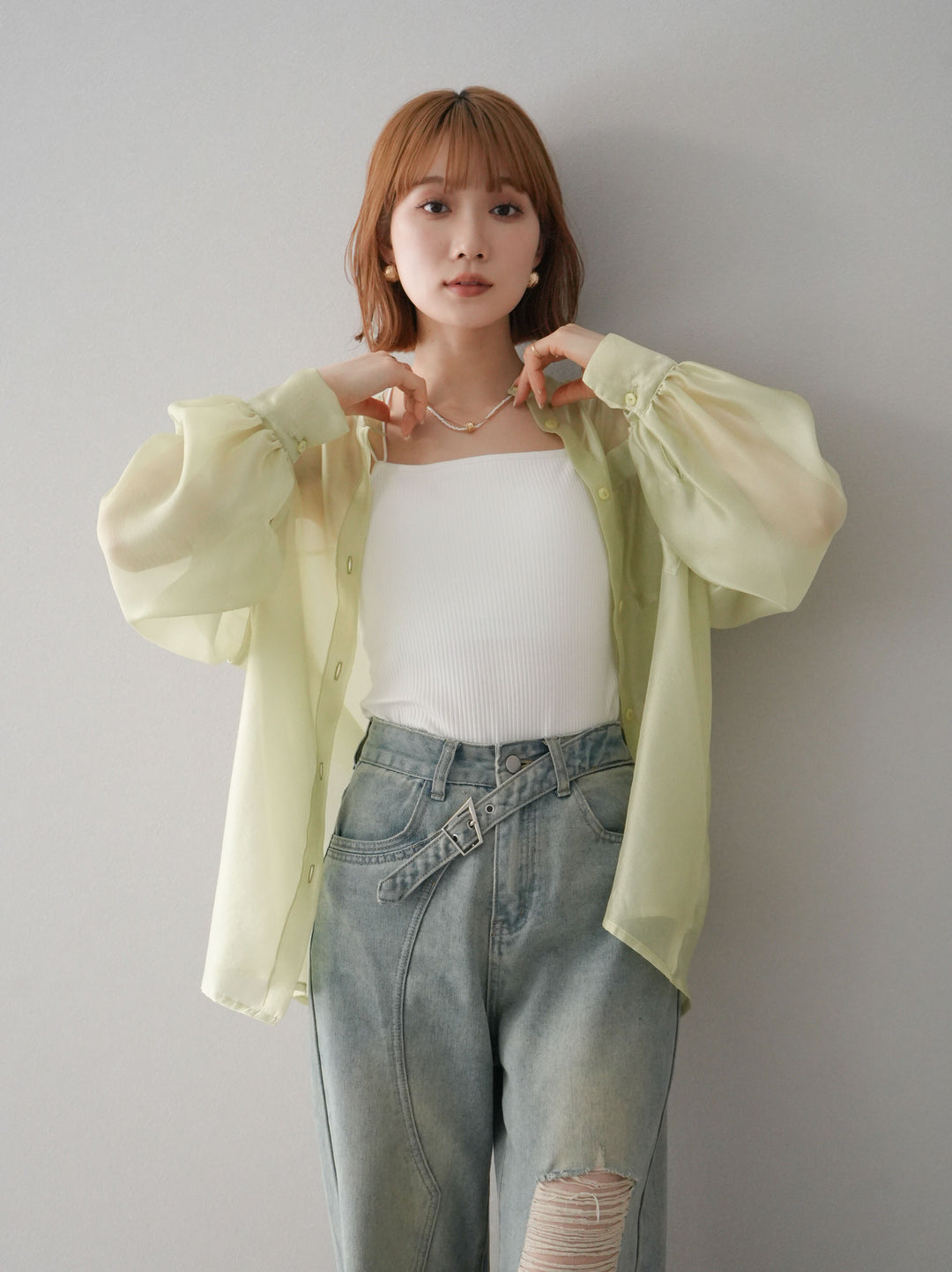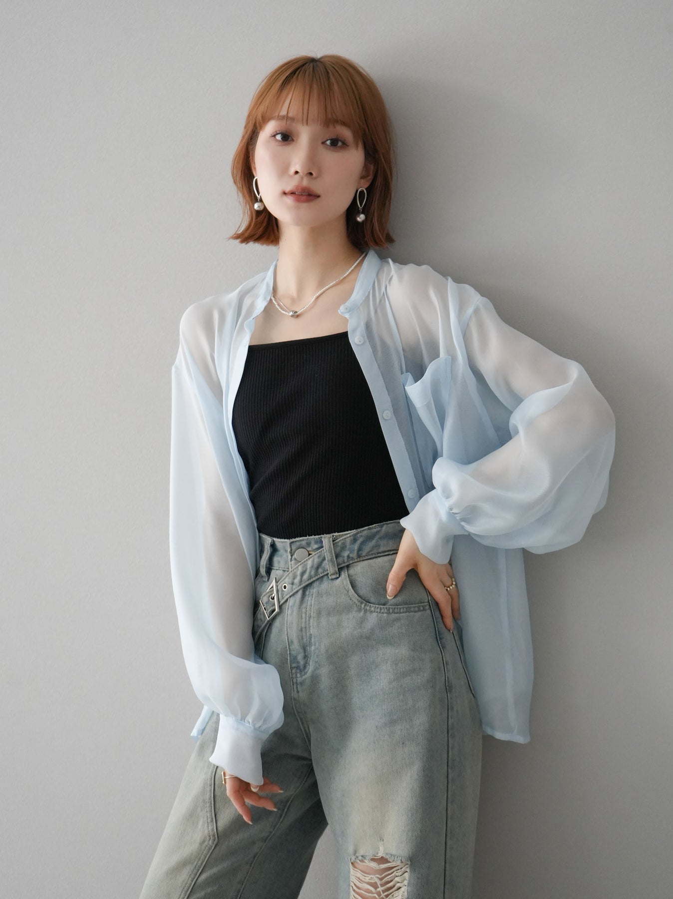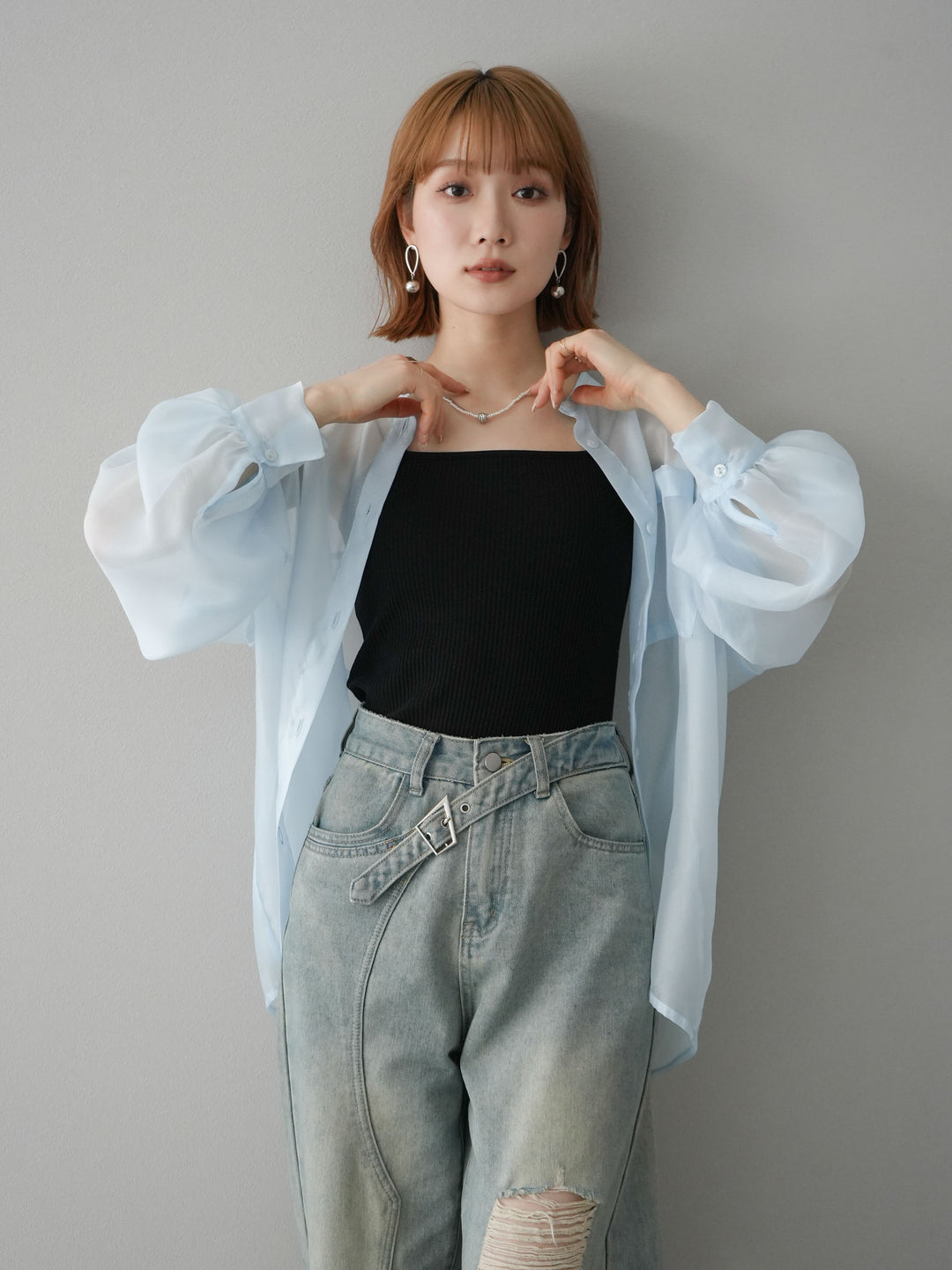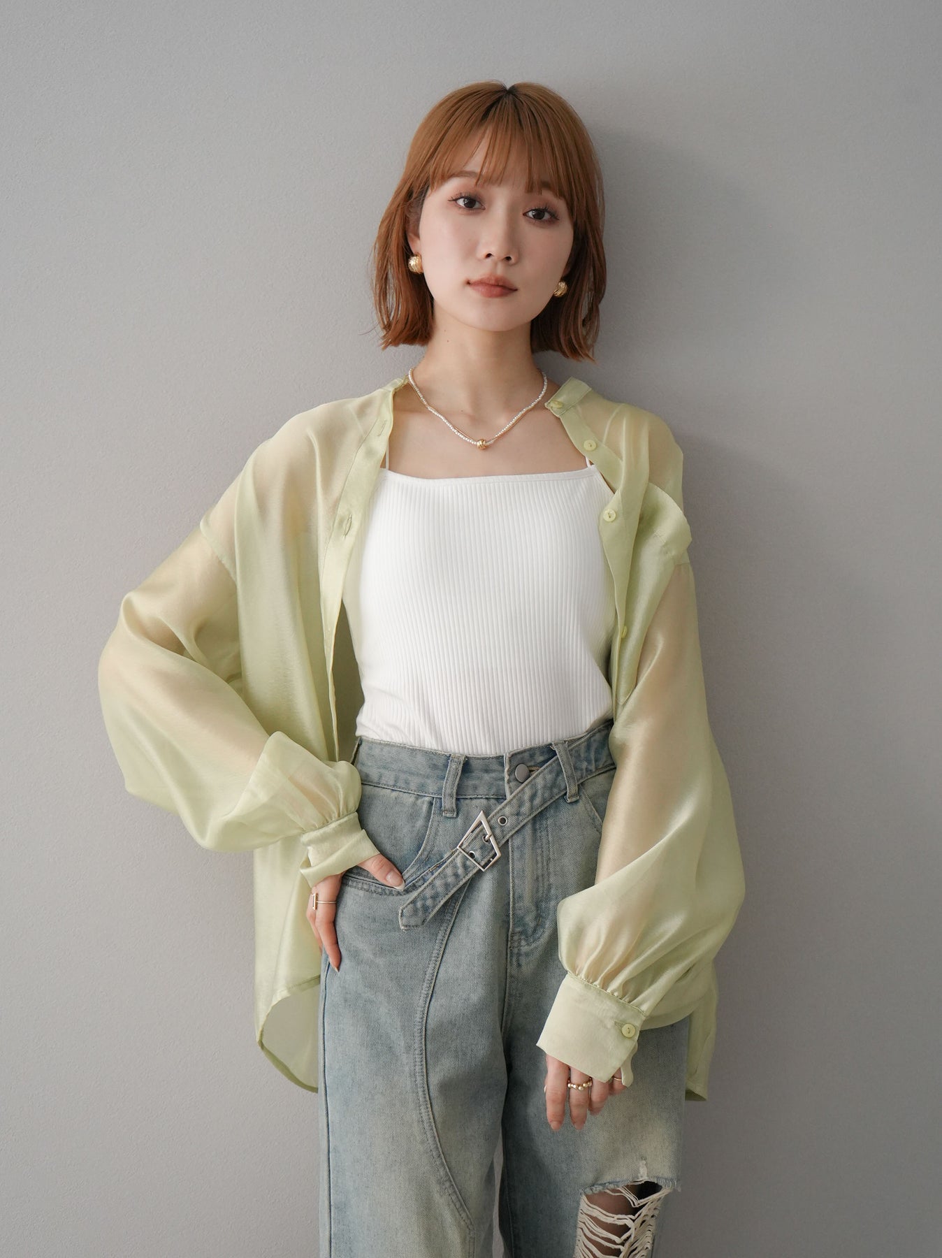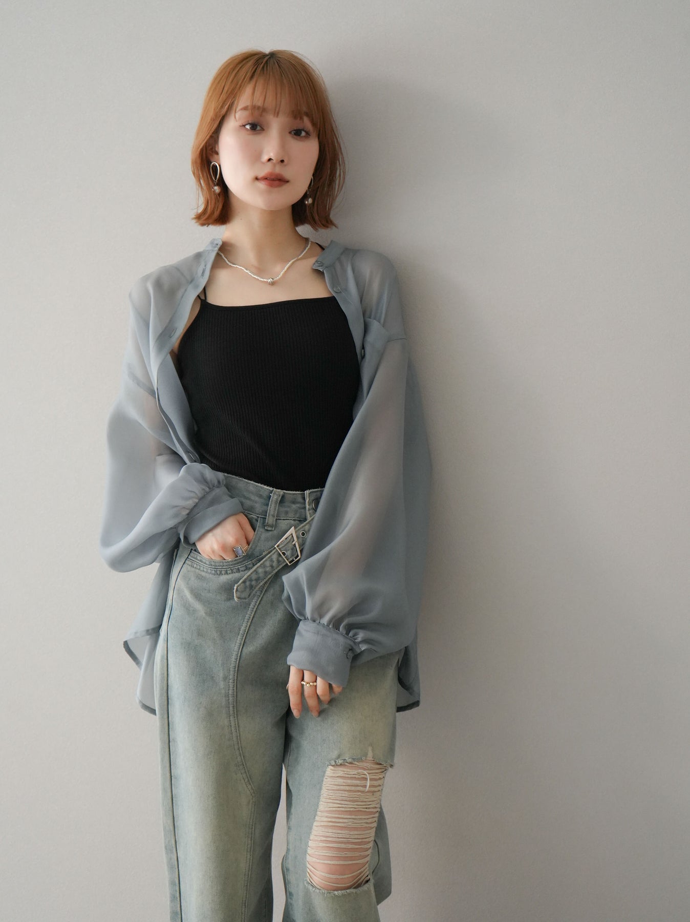 [SET]シアーシャイニーボリュームスリーブシャツ+ベルトアシンメトリーダメージデニム(2set)