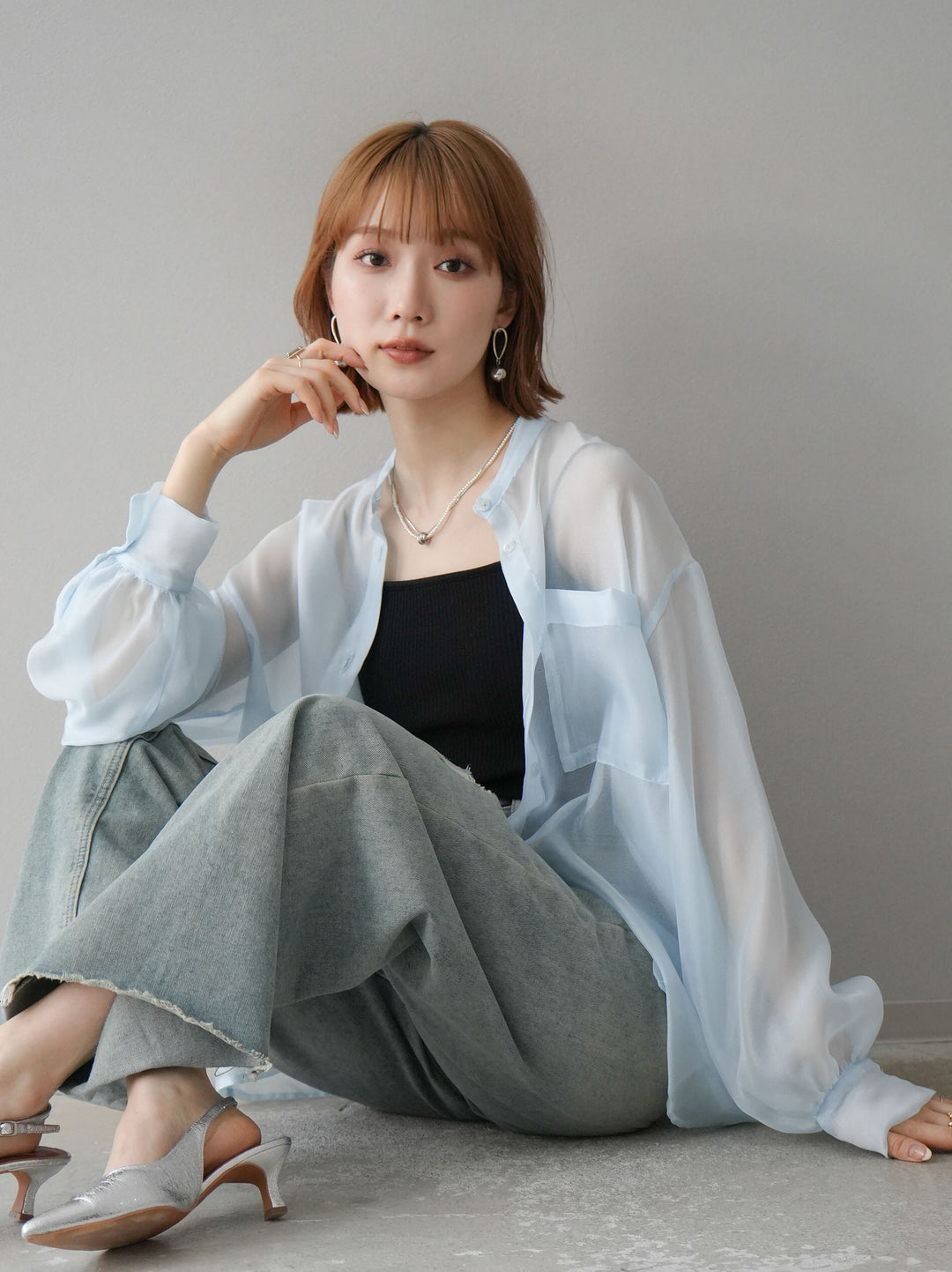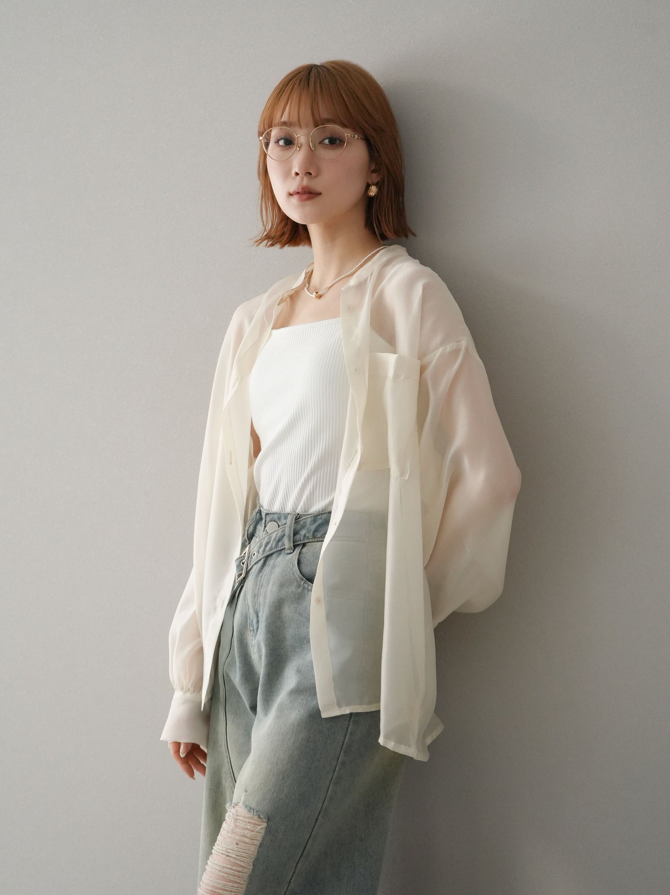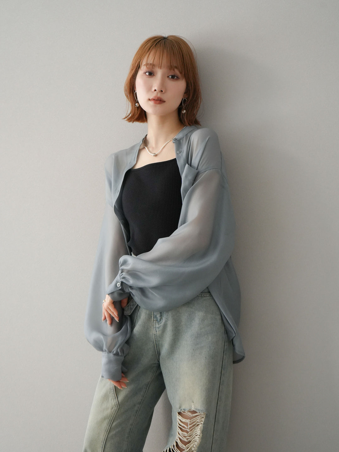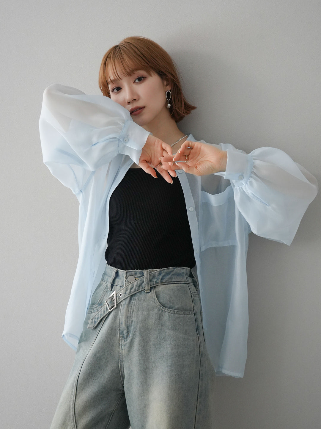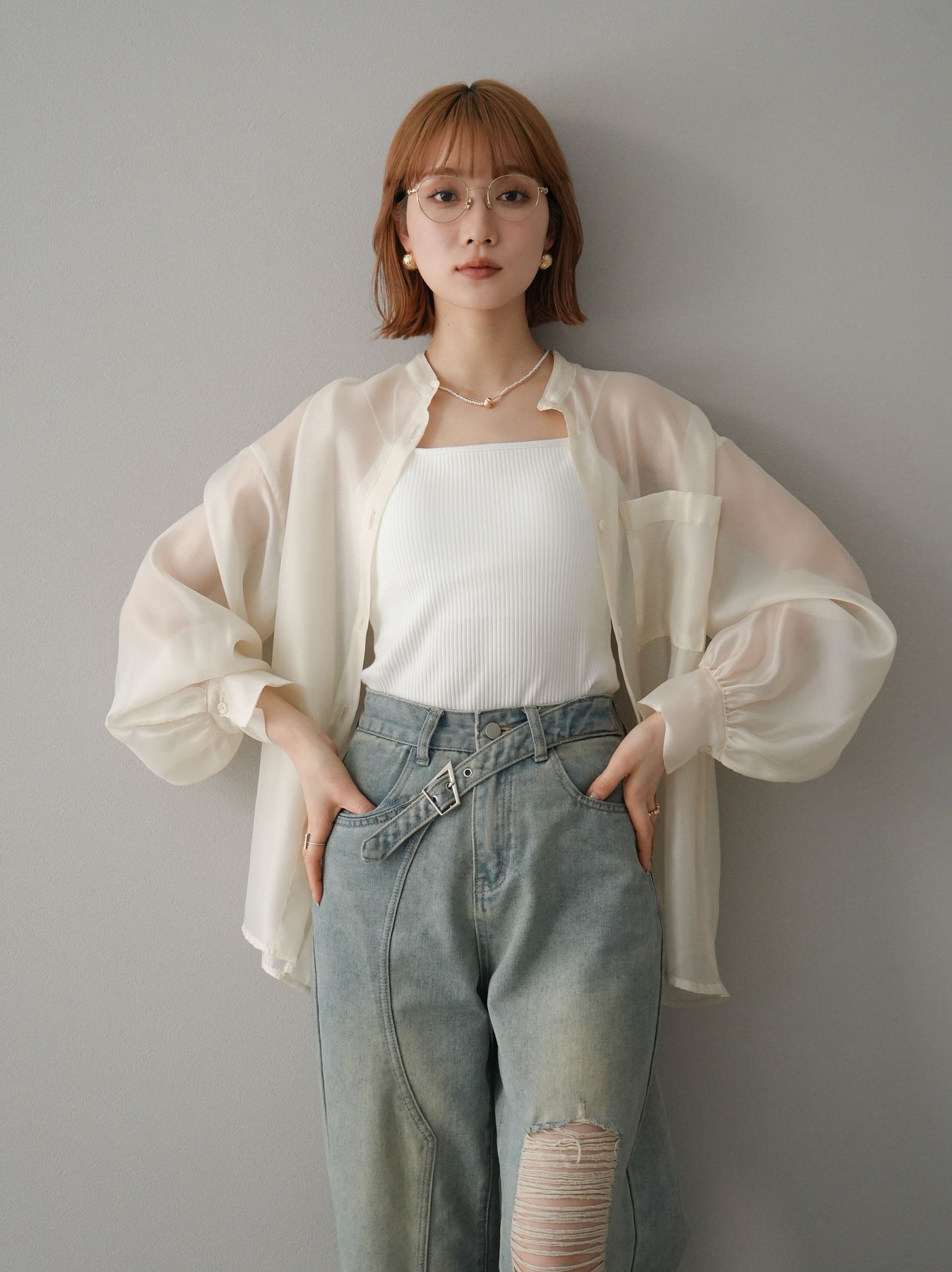 [SET]シアーシャイニーボリュームスリーブシャツ+ベルトアシンメトリーダメージデニム(2set)