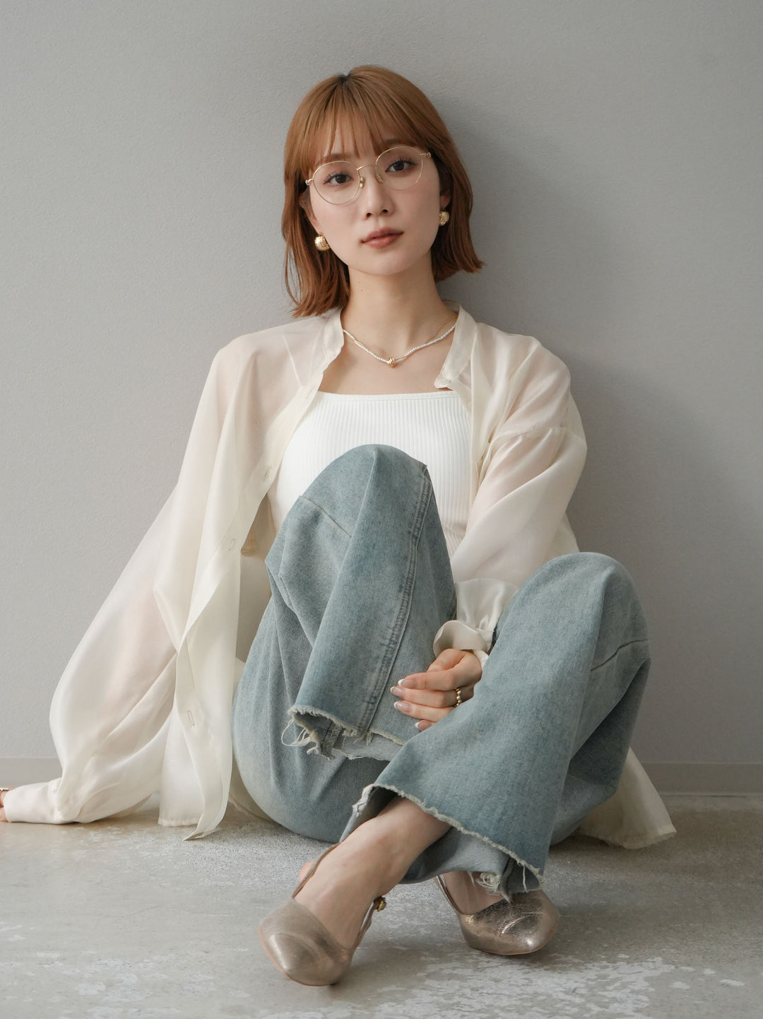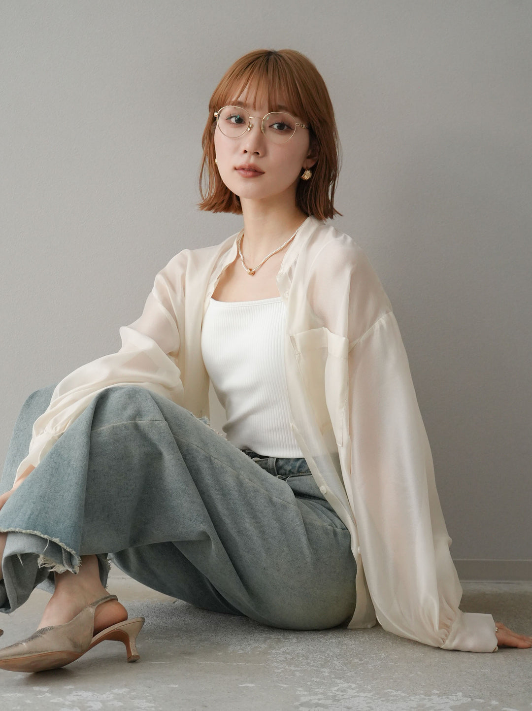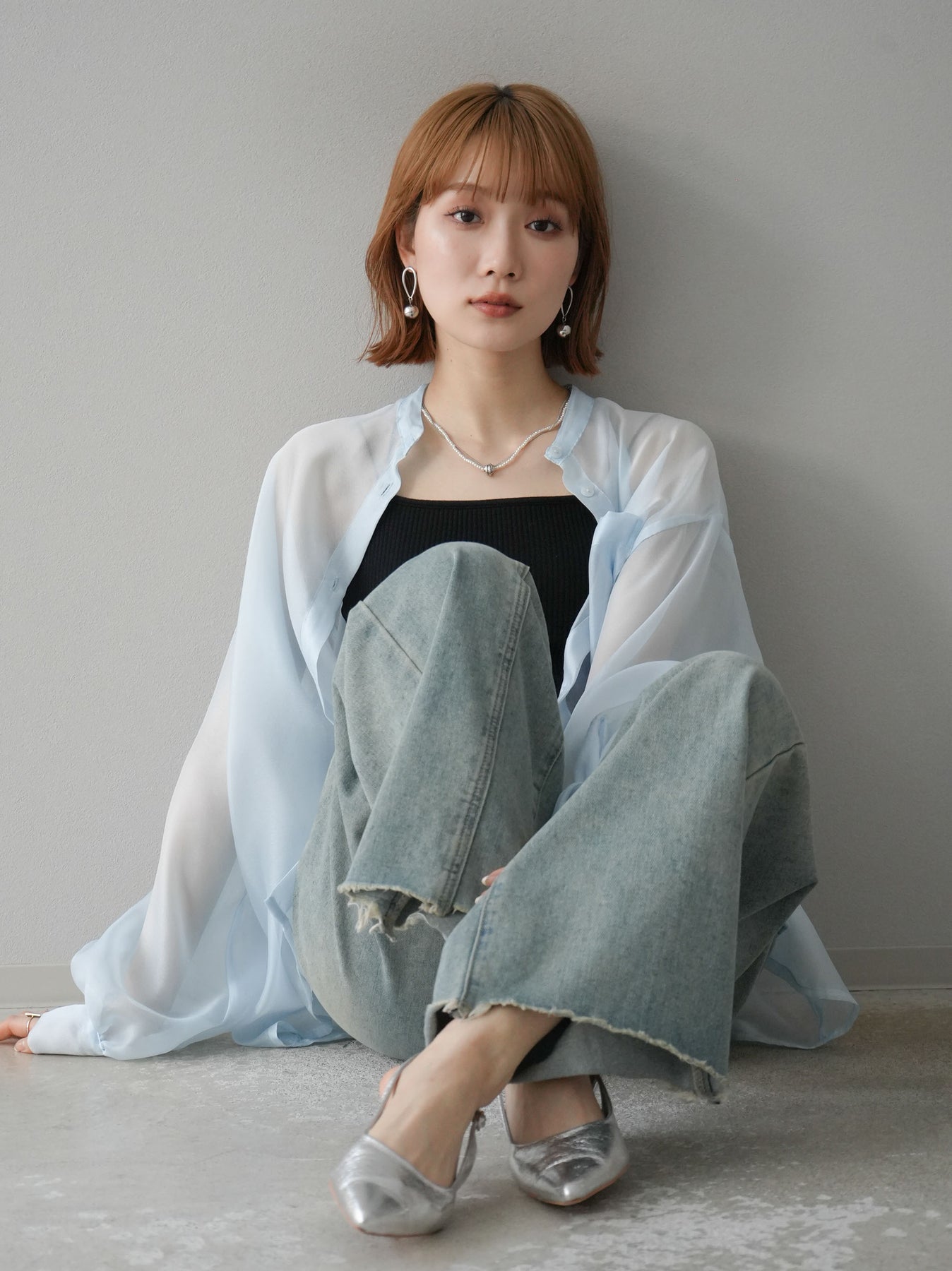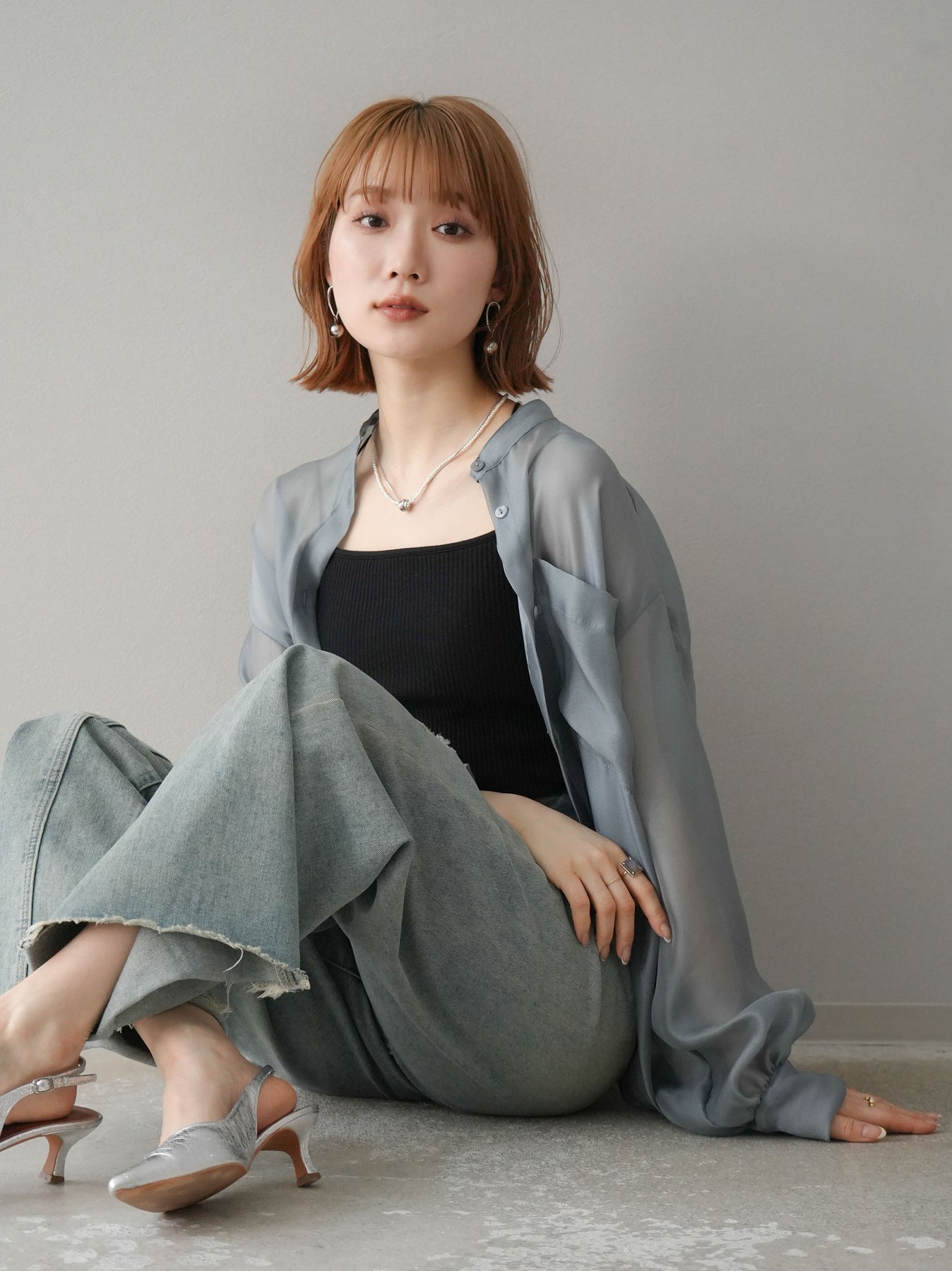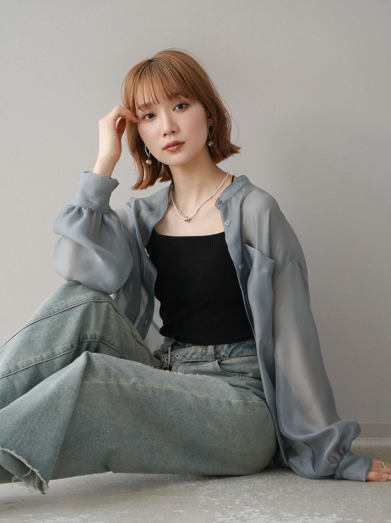 [SET]シアーシャイニーボリュームスリーブシャツ+ベルトアシンメトリーダメージデニム(2set)