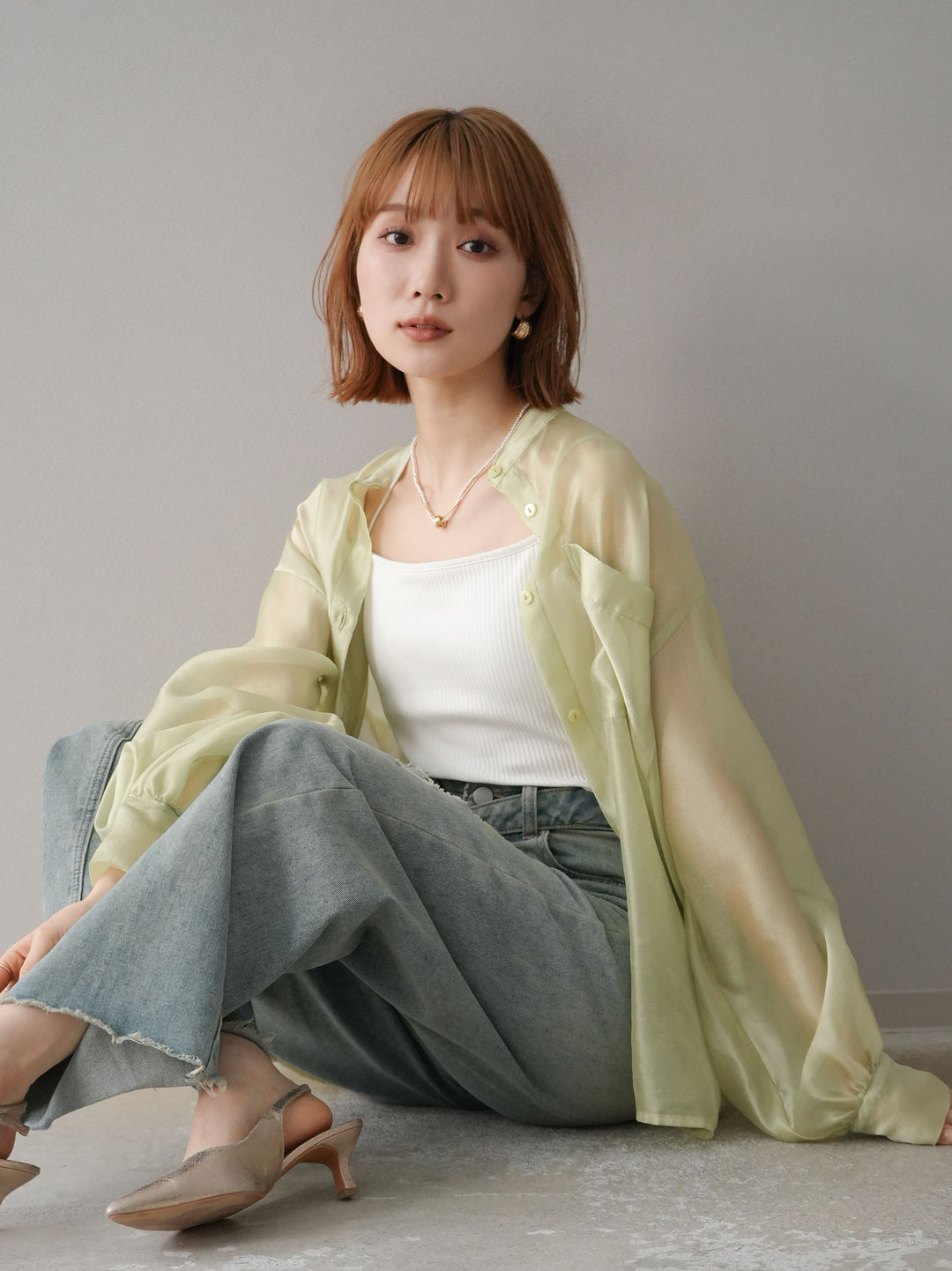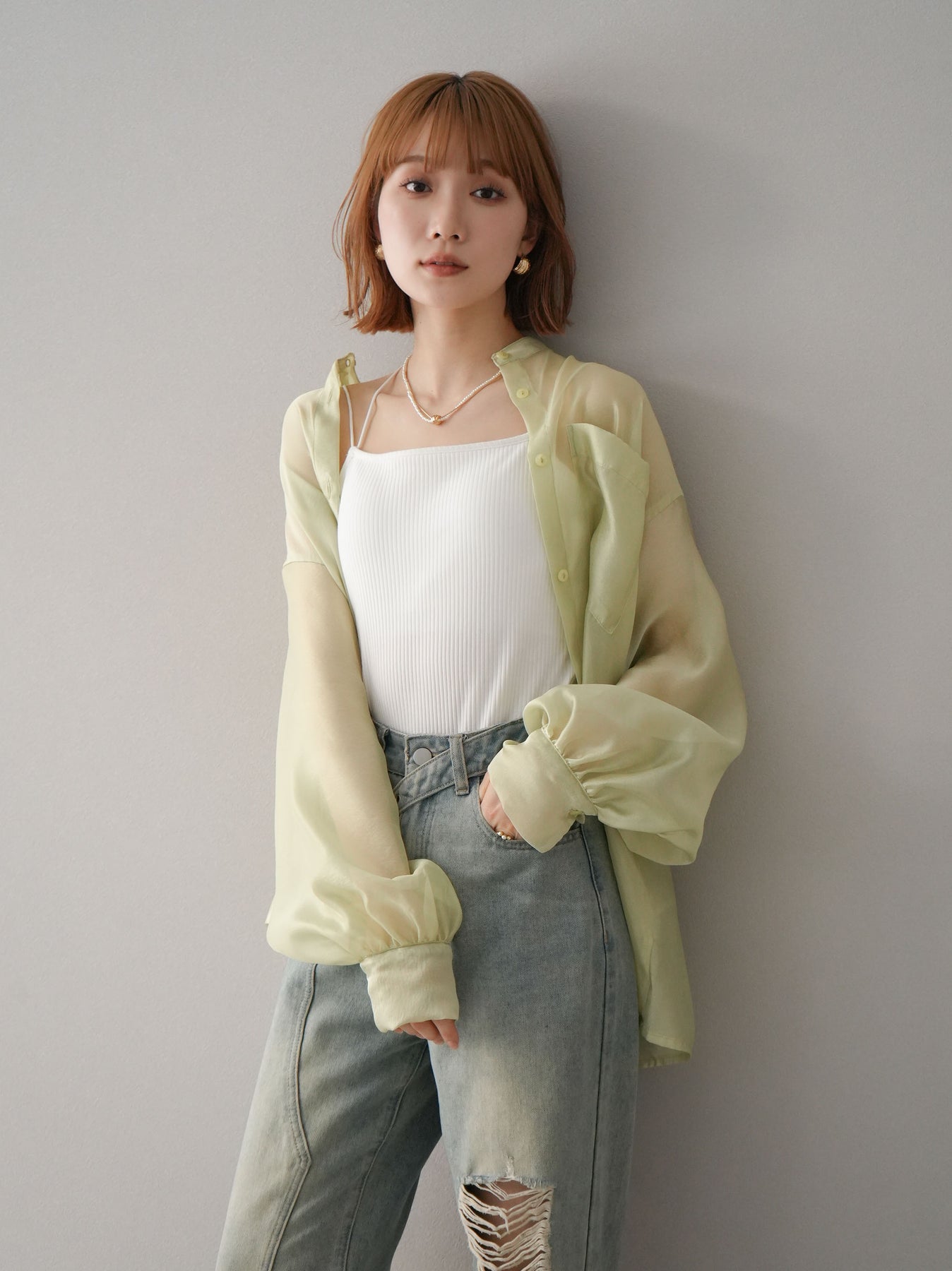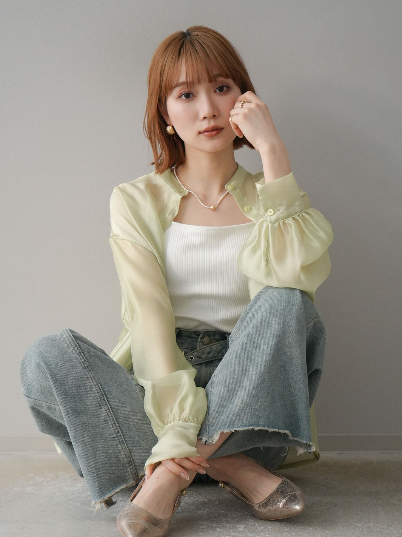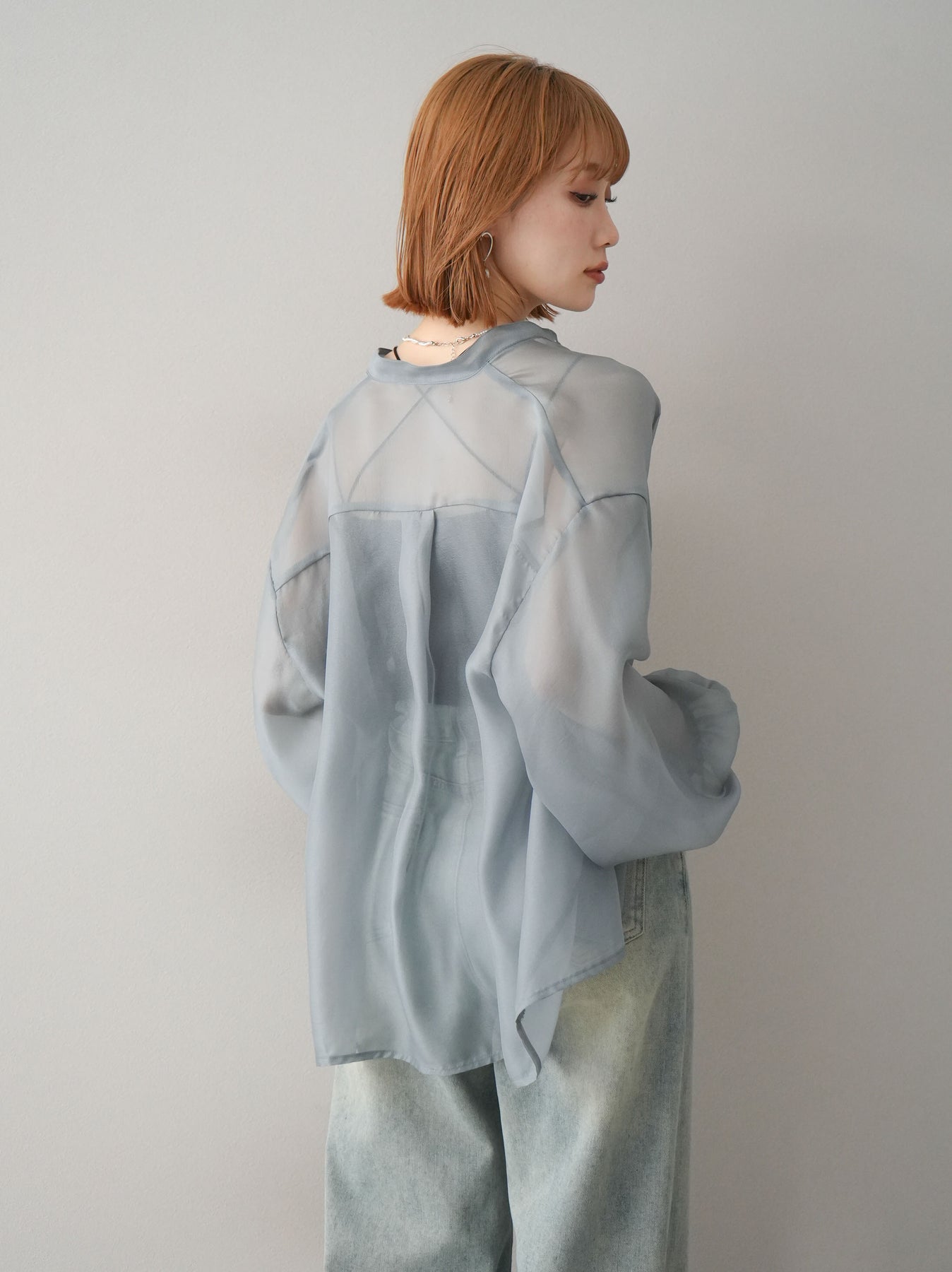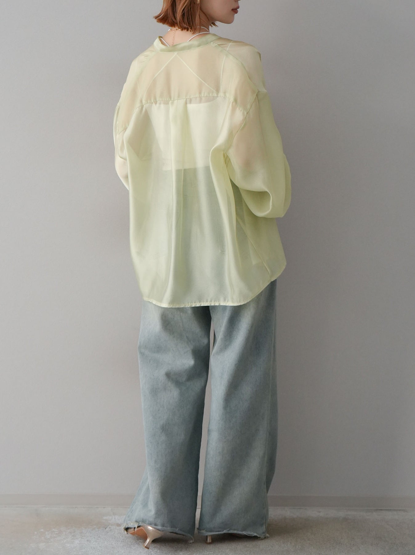 ほんのり光沢感のあるシアー素材が上品なボリュームスリーブシャツ。程よい透け感が軽やかさを演出し、トレンド感のあるスタイリングが叶います。ボリュームのある袖デザインがポイントで、シンプルながらも存在感のある一枚。羽織りとしても使えるので、幅広いコーディネートに活躍。 ※ボトムス、キャミソール(インナー)以外の商品は一律でインナーは付属していません。