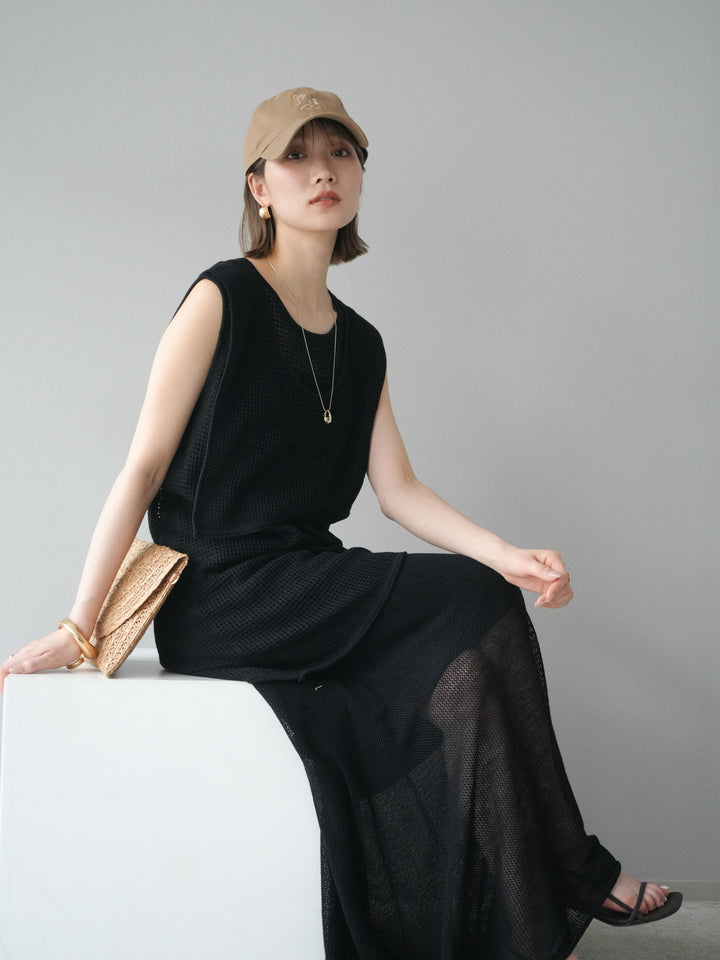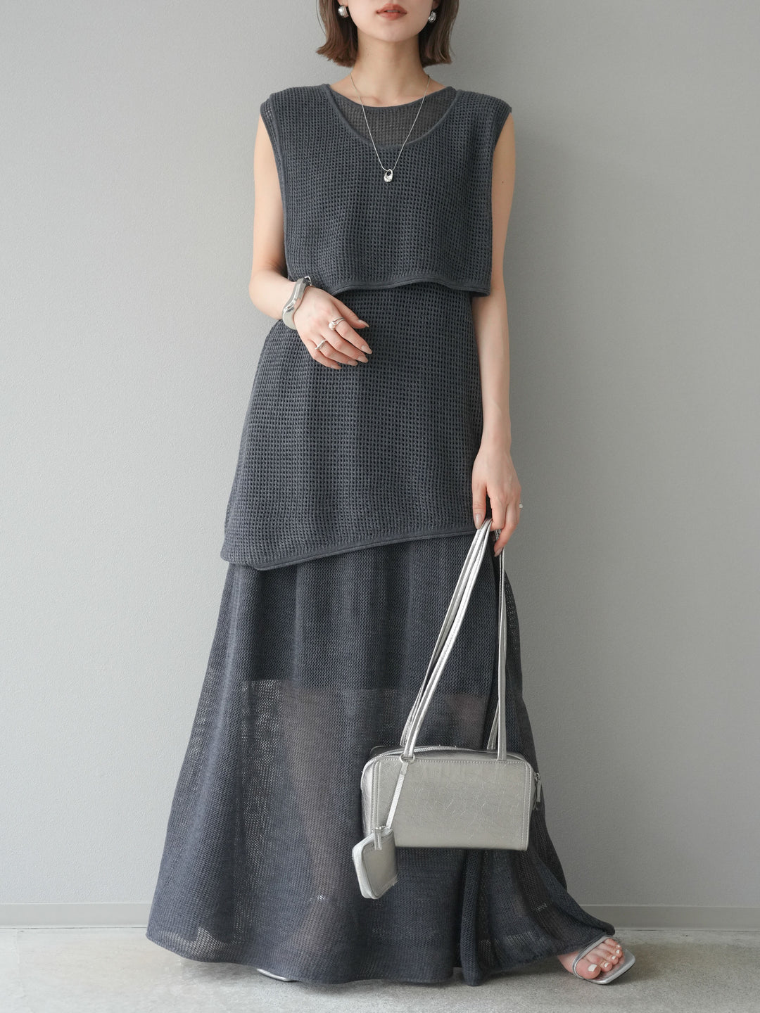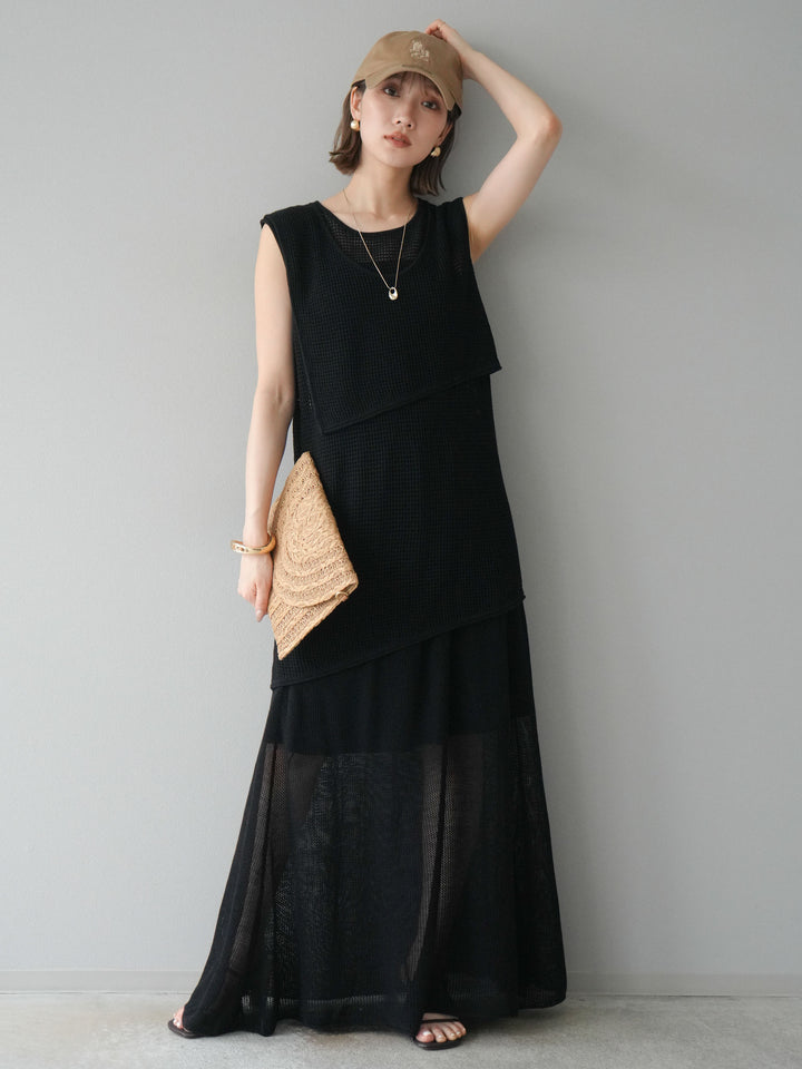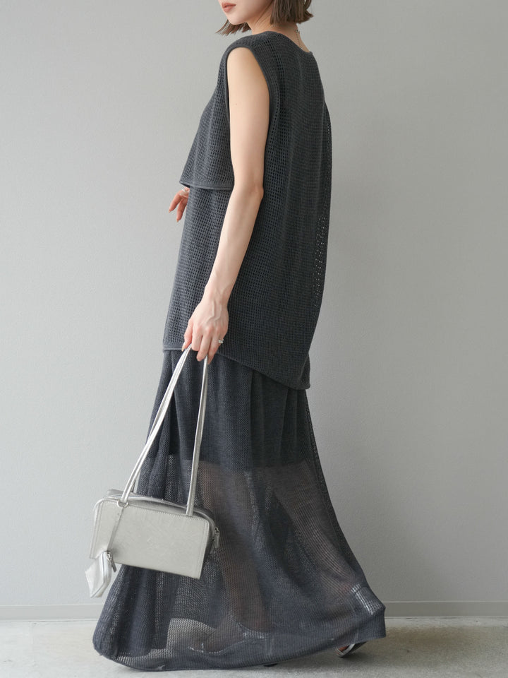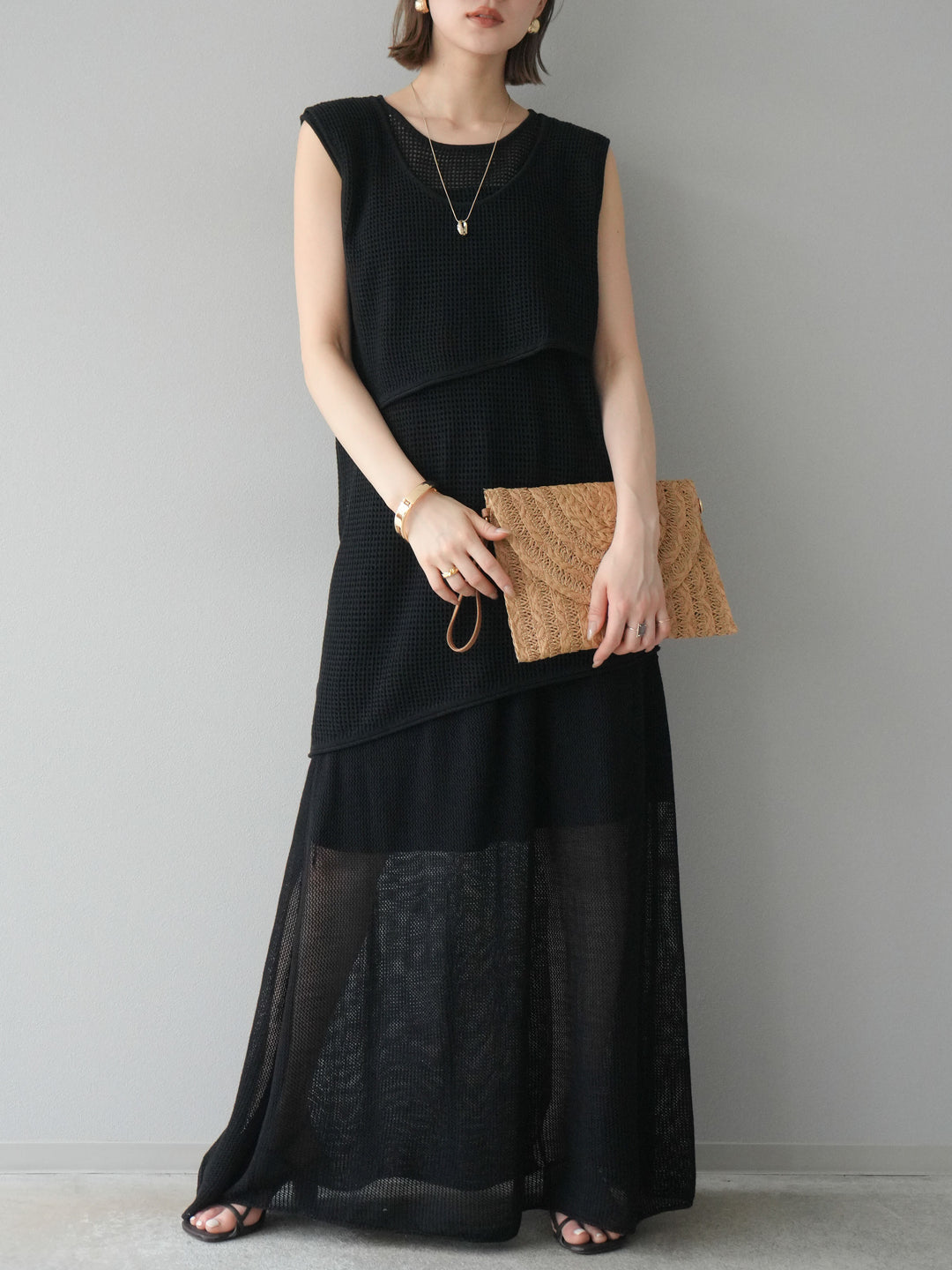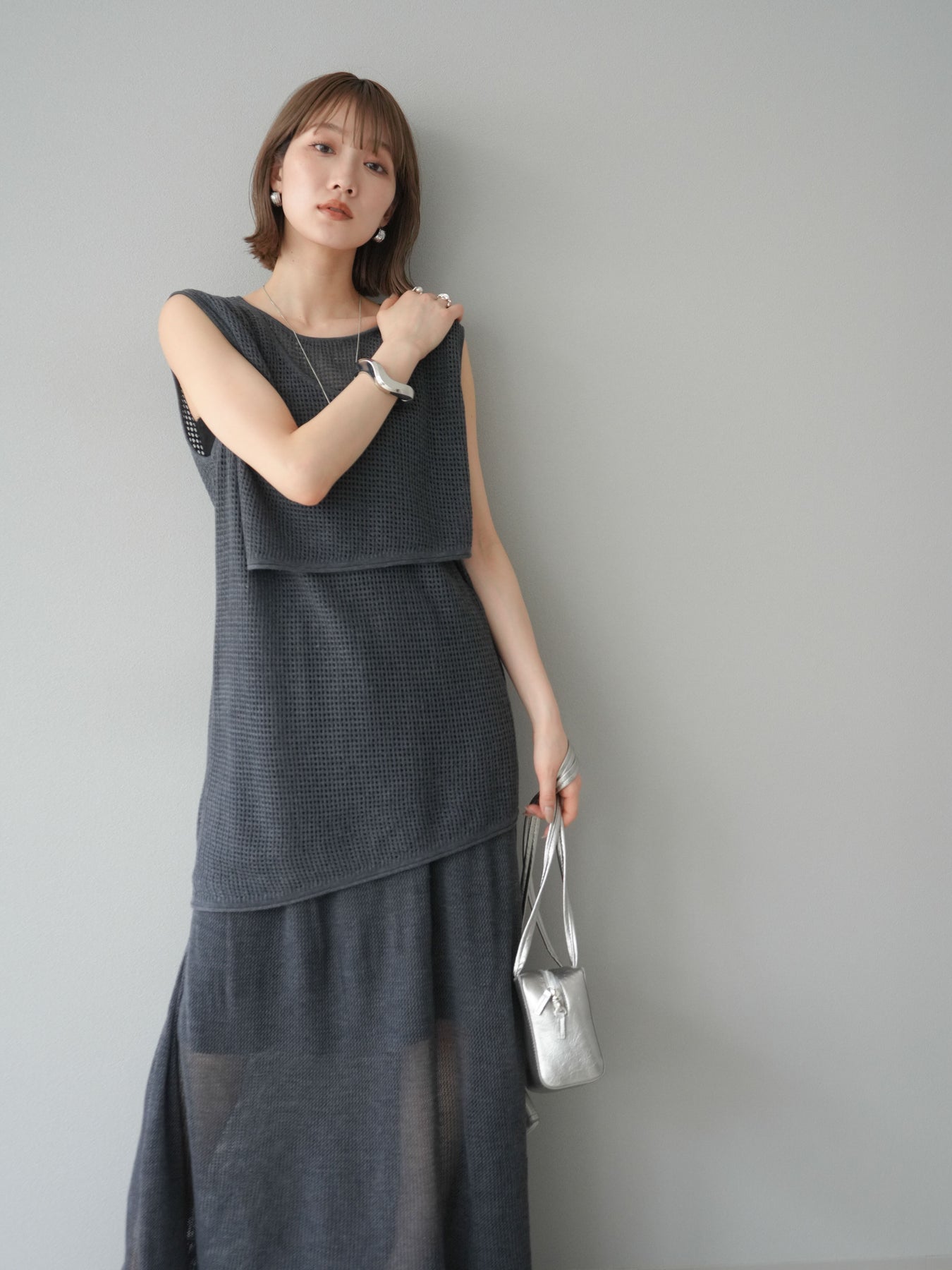 [SET]メッシュレイヤードニットトップス&スカートSET UP +選べるアクセセット(2set)