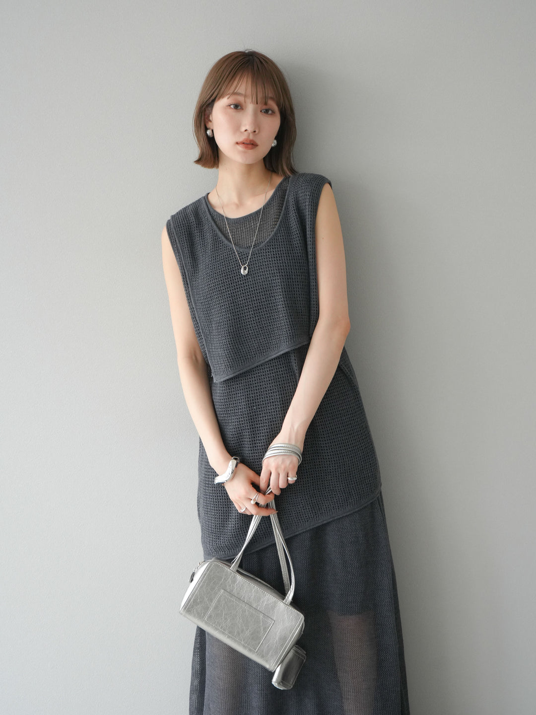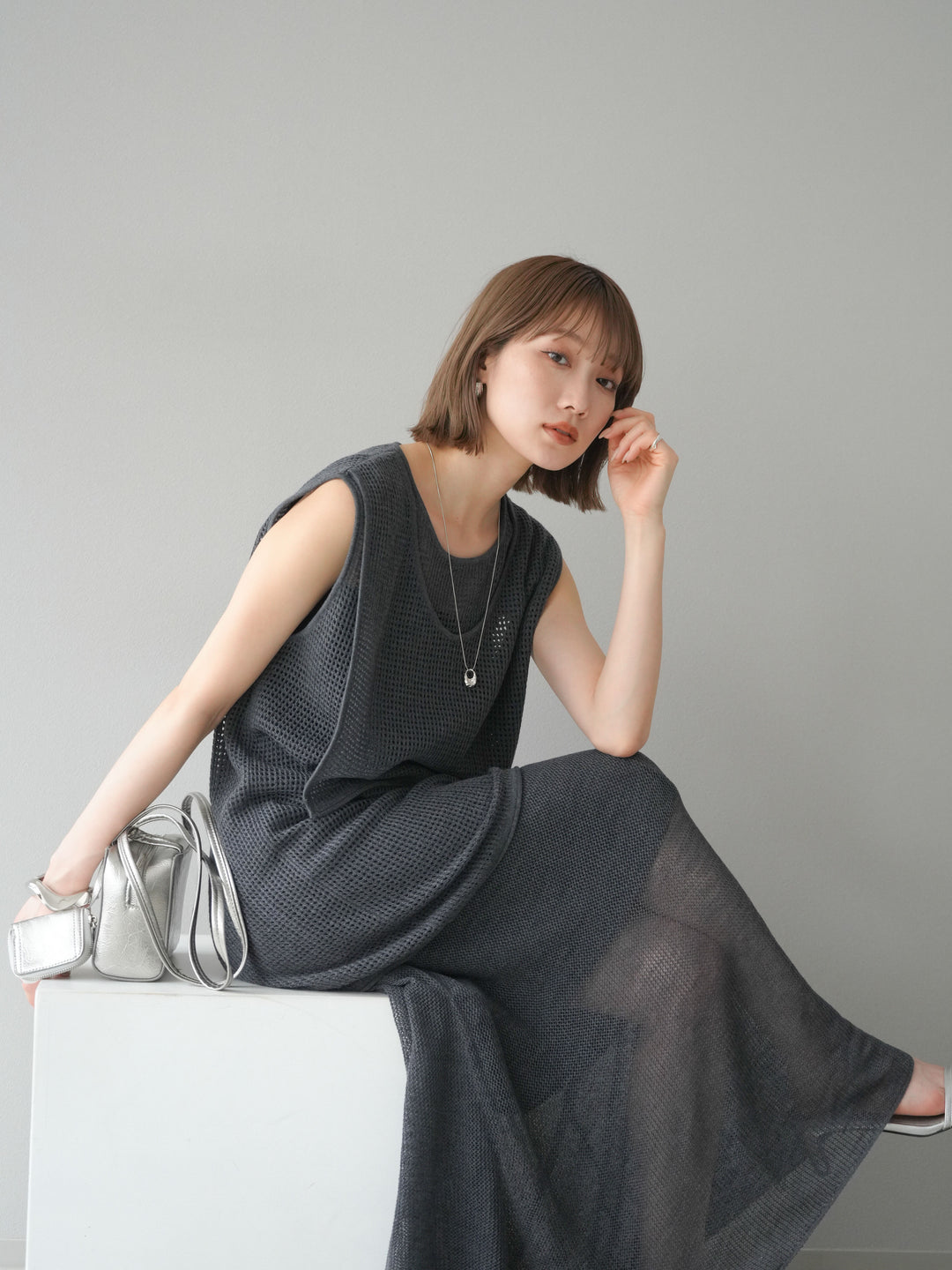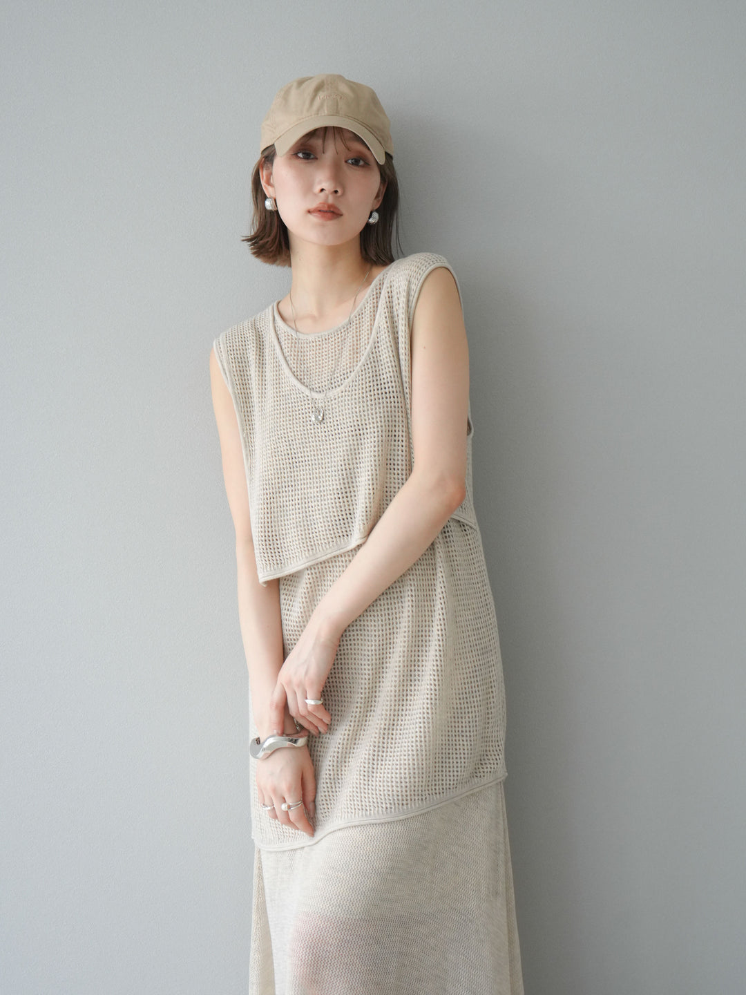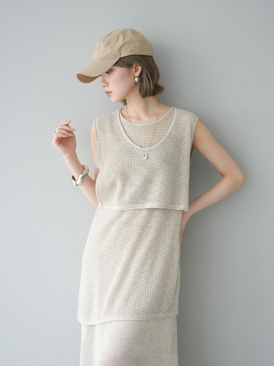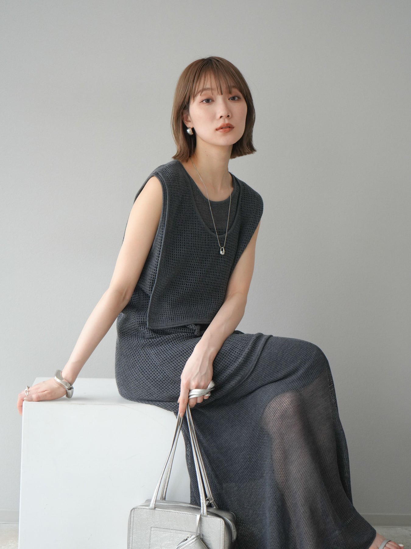 [SET]メッシュレイヤードニットトップス&スカートSET UP +選べるアクセセット(2set)