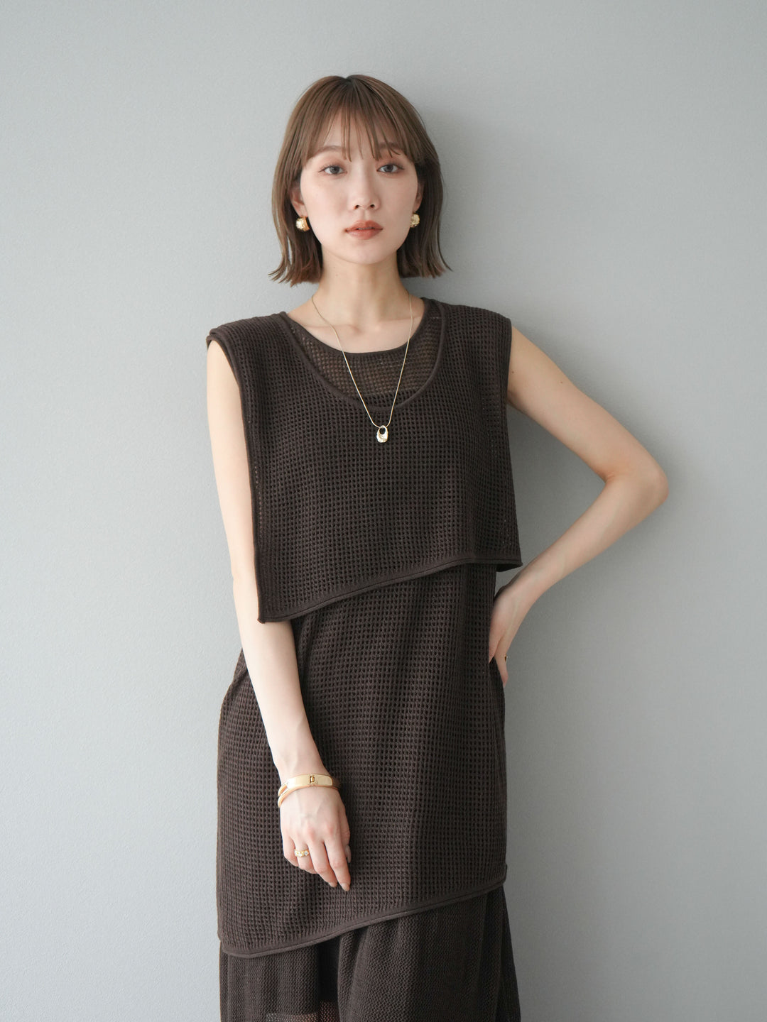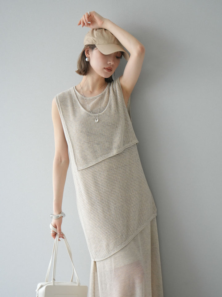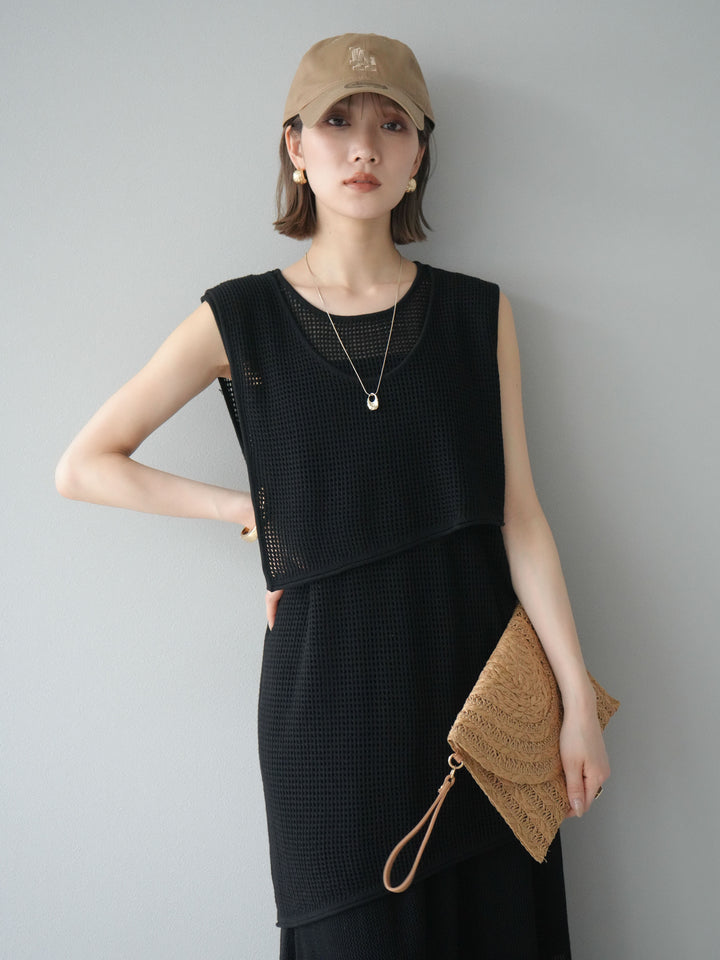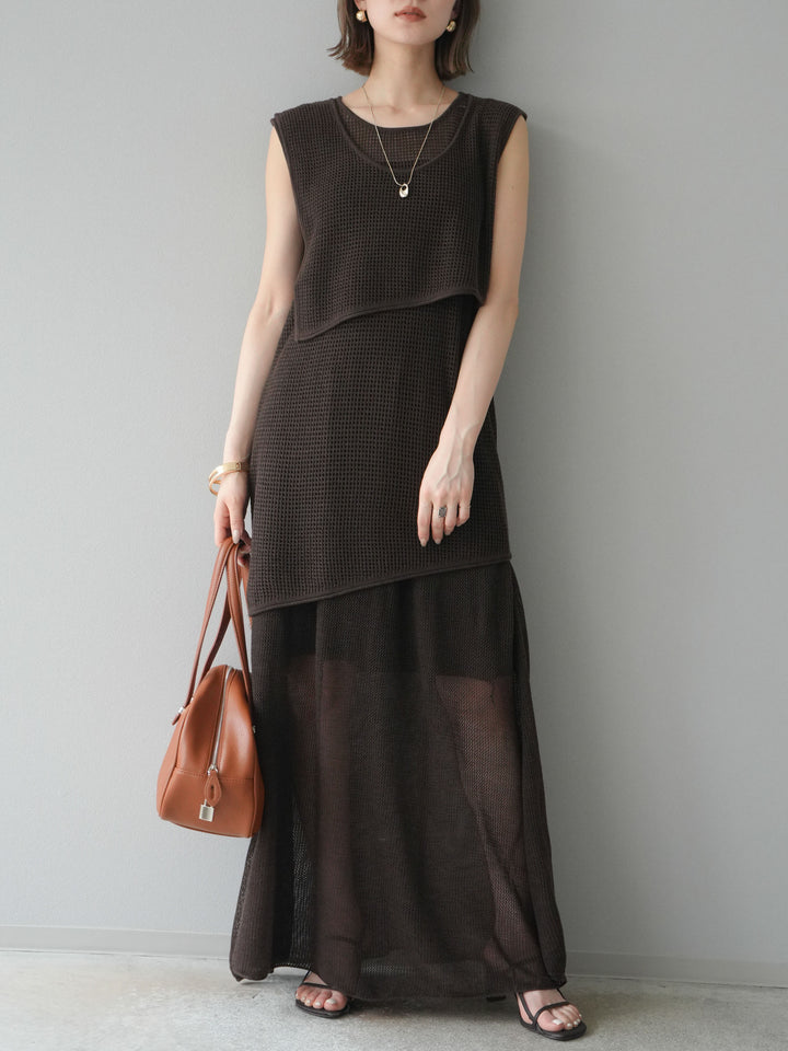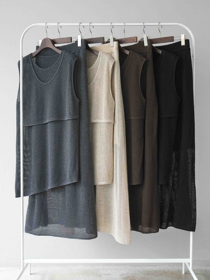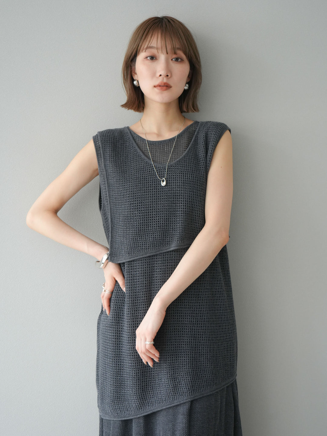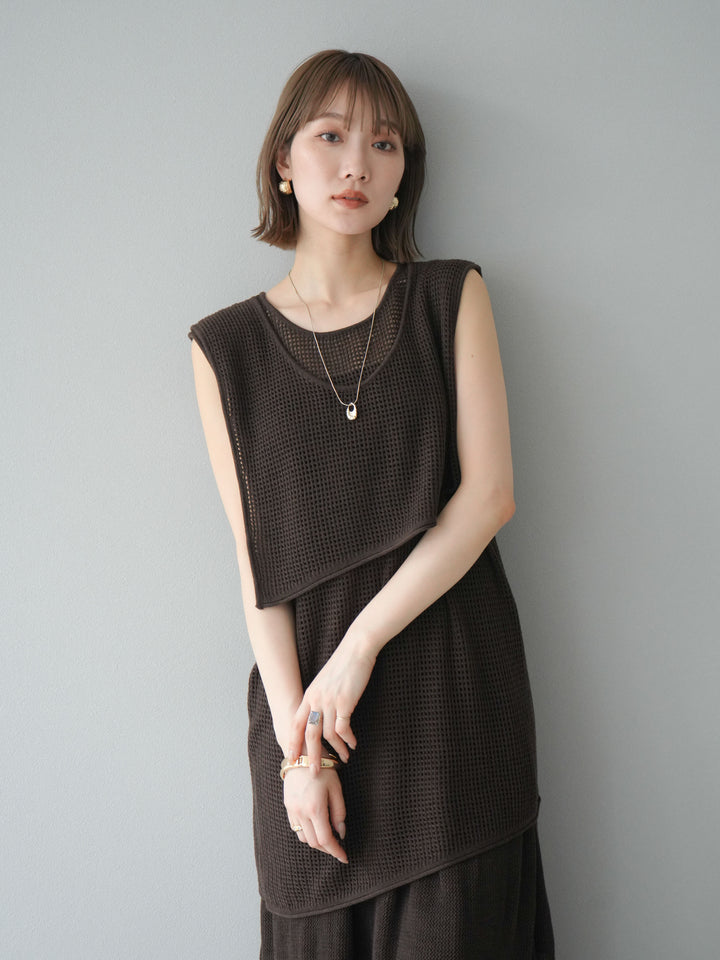 抜け感のあるメッシュ編みがトレンド感を引き立てるニットセットアップ。トップスはアシンメトリーなレイヤード風デザインで、動きのあるシルエットに。スカートはストレートラインで落ち感があり、大人っぽい印象を演出します。セットでの着用はもちろん、単品使いでも着まわし力抜群。軽やかな素材感でロングシーズン活躍します。 ※ボトムス、キャミソール(インナー)以外の商品は一律でインナーは付属していません
