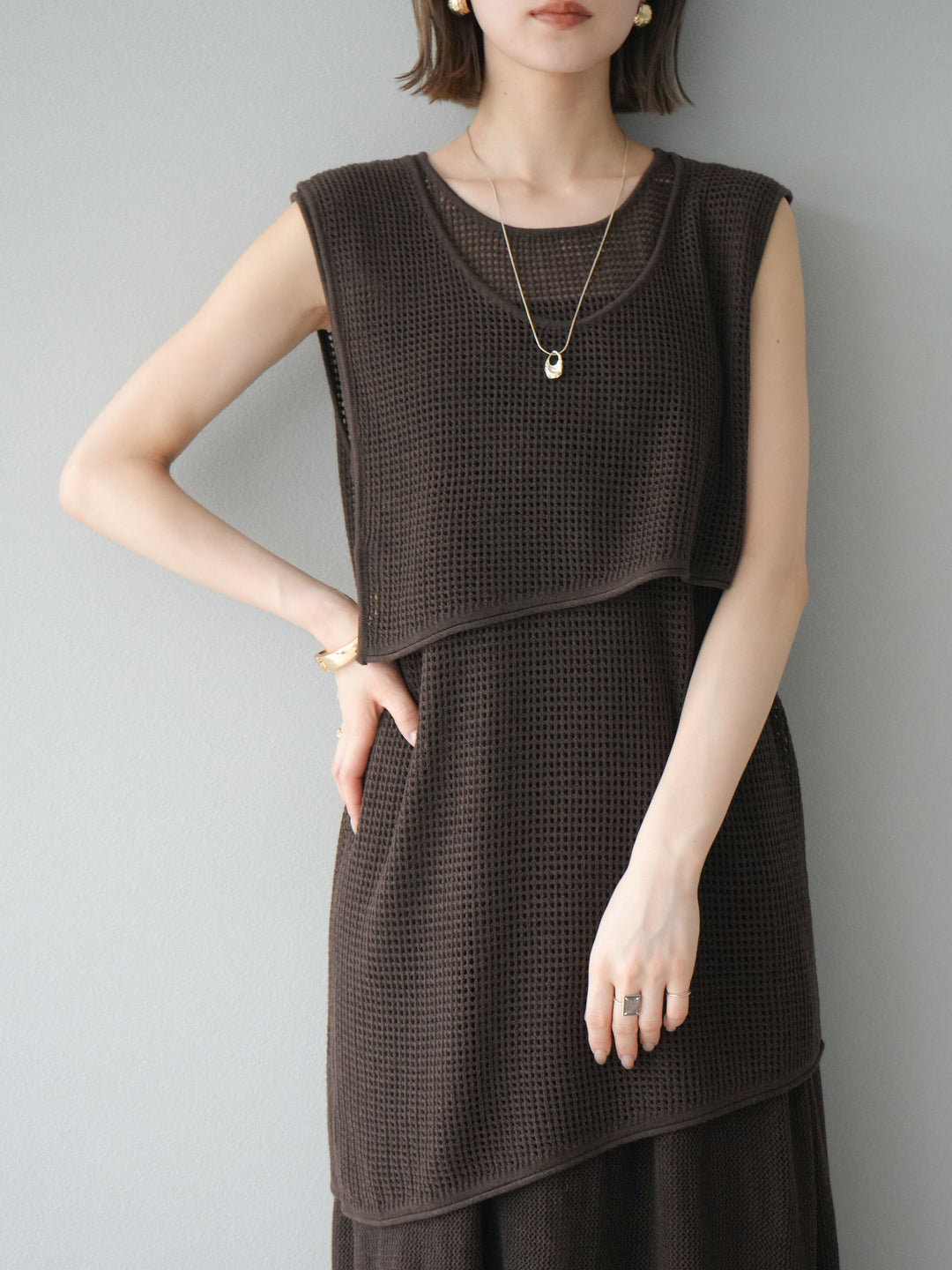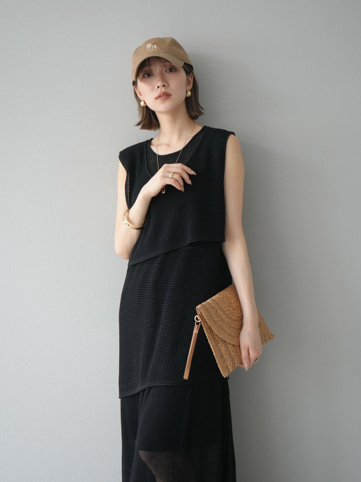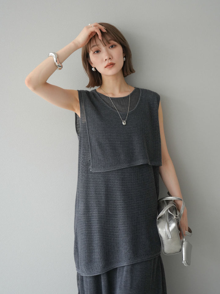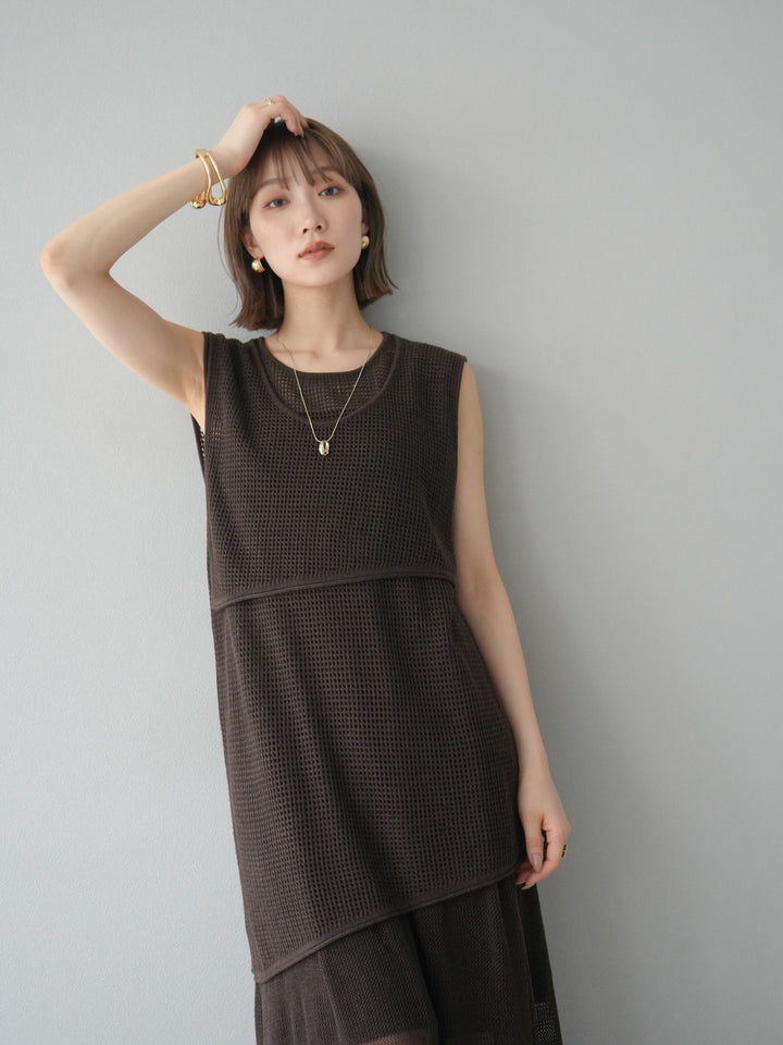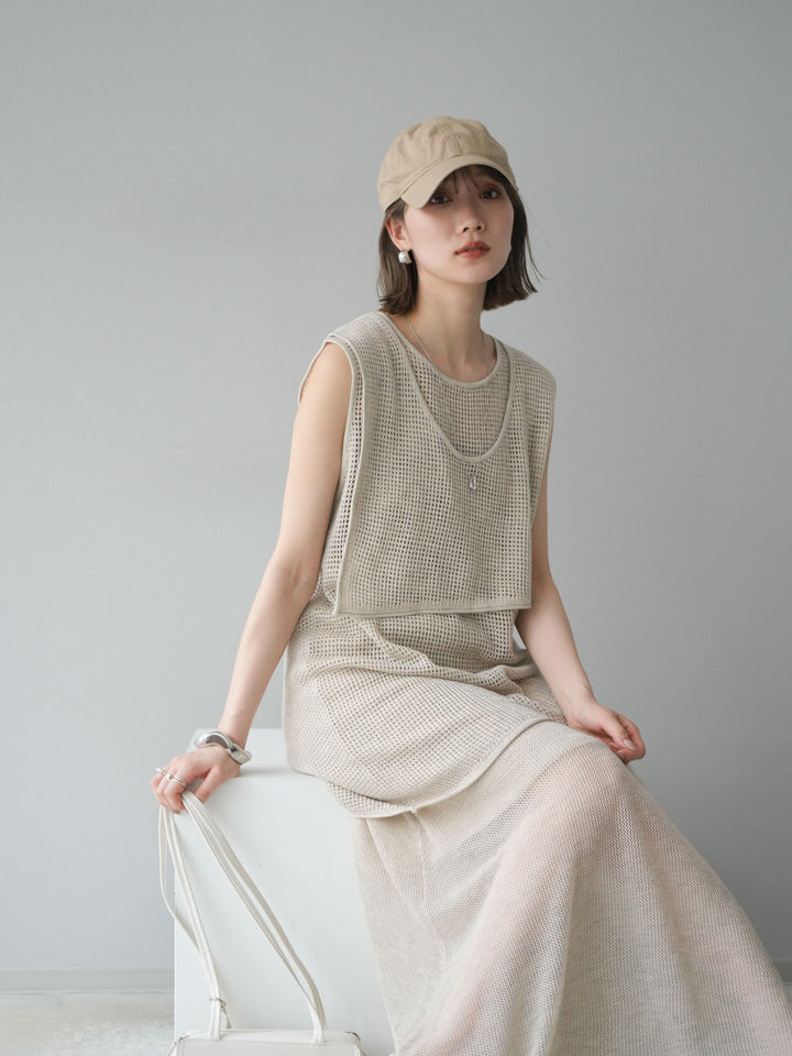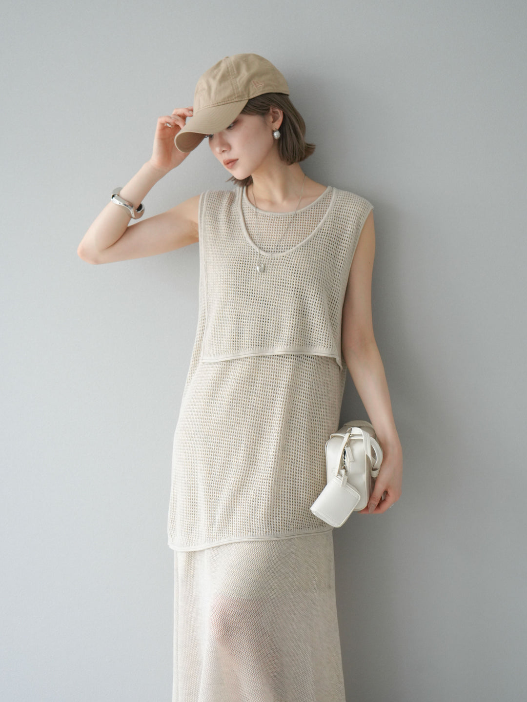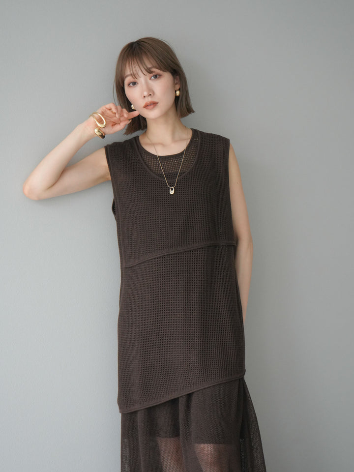 抜け感のあるメッシュ編みがトレンド感を引き立てるニットセットアップ。トップスはアシンメトリーなレイヤード風デザインで、動きのあるシルエットに。スカートはストレートラインで落ち感があり、大人っぽい印象を演出します。セットでの着用はもちろん、単品使いでも着まわし力抜群。軽やかな素材感でロングシーズン活躍します。 ※ボトムス、キャミソール(インナー)以外の商品は一律でインナーは付属していません