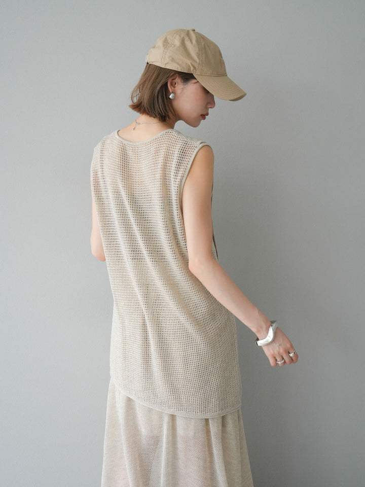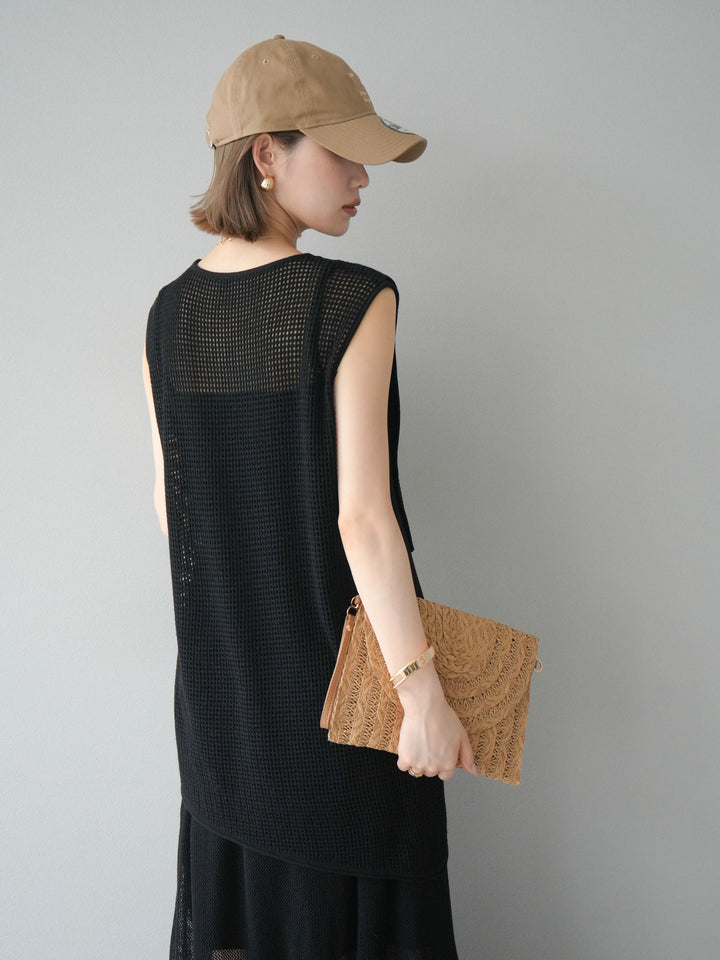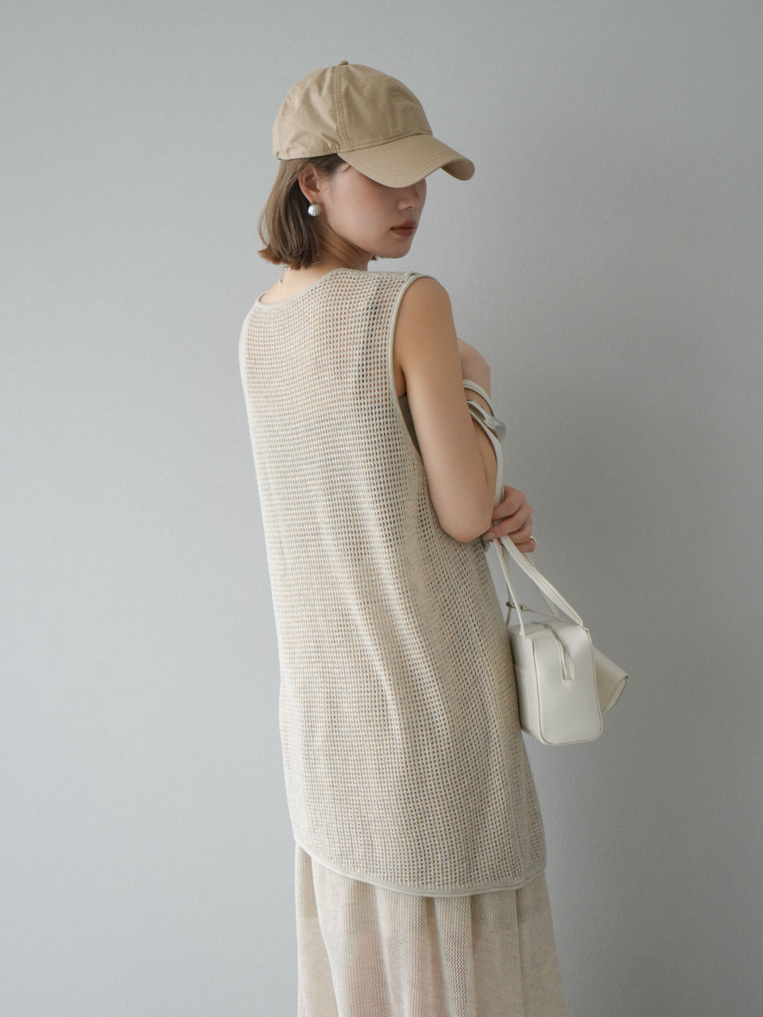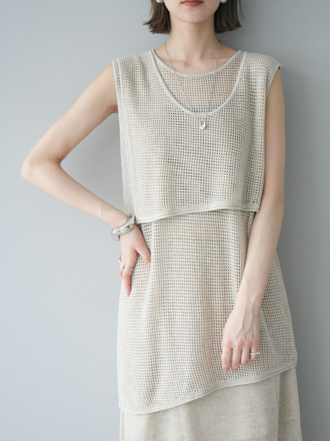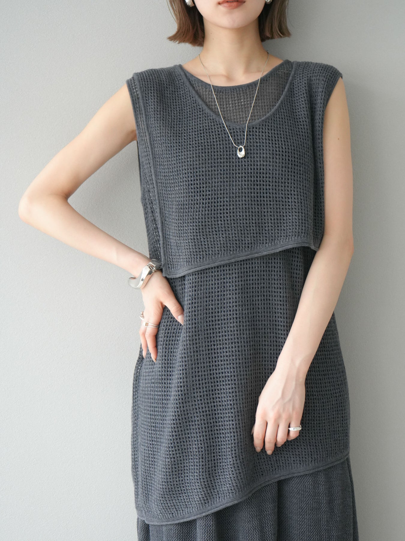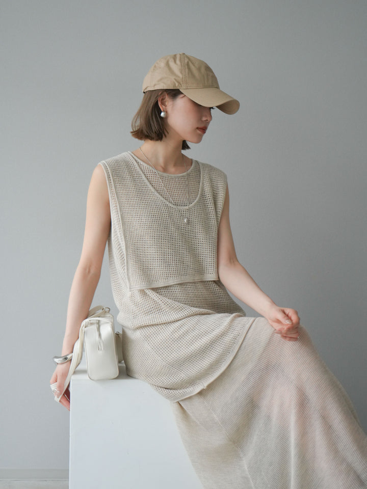 抜け感のあるメッシュ編みがトレンド感を引き立てるニットセットアップ。トップスはアシンメトリーなレイヤード風デザインで、動きのあるシルエットに。スカートはストレートラインで落ち感があり、大人っぽい印象を演出します。セットでの着用はもちろん、単品使いでも着まわし力抜群。軽やかな素材感でロングシーズン活躍します。 ※ボトムス、キャミソール(インナー)以外の商品は一律でインナーは付属していません