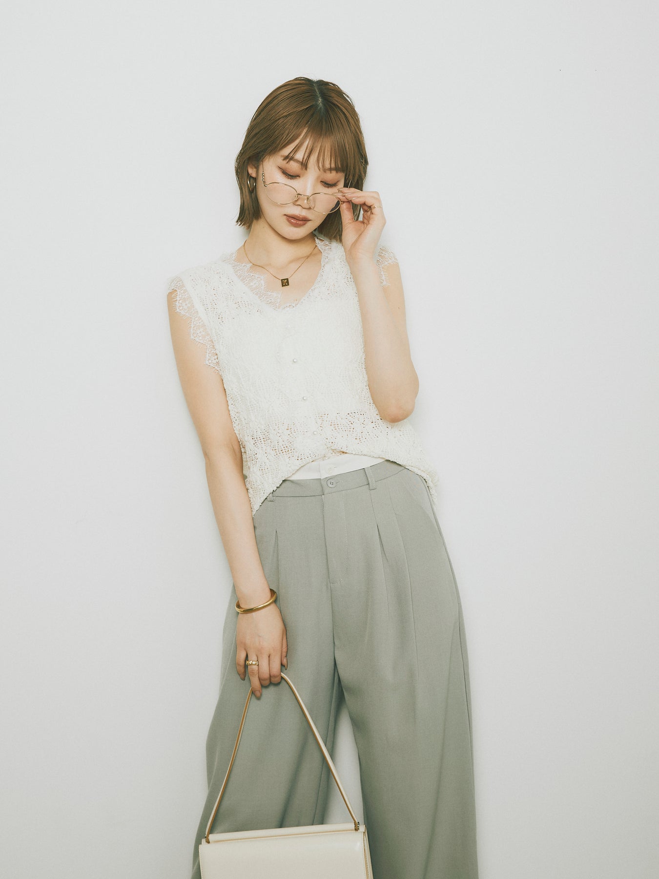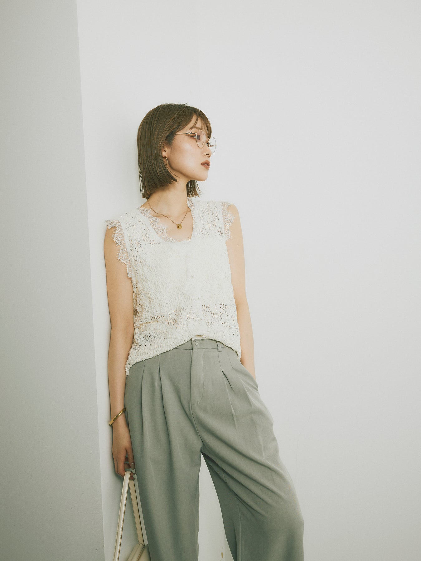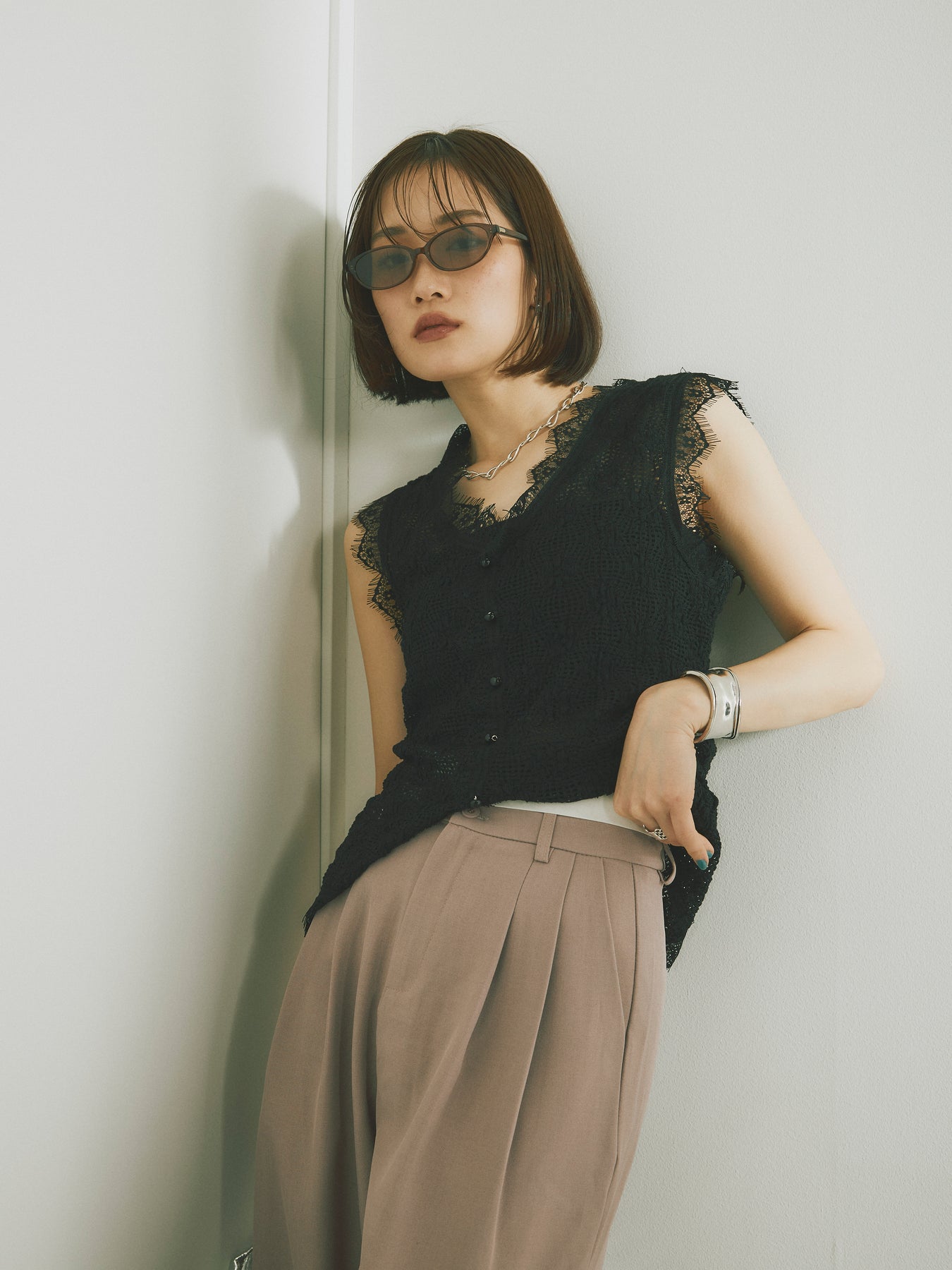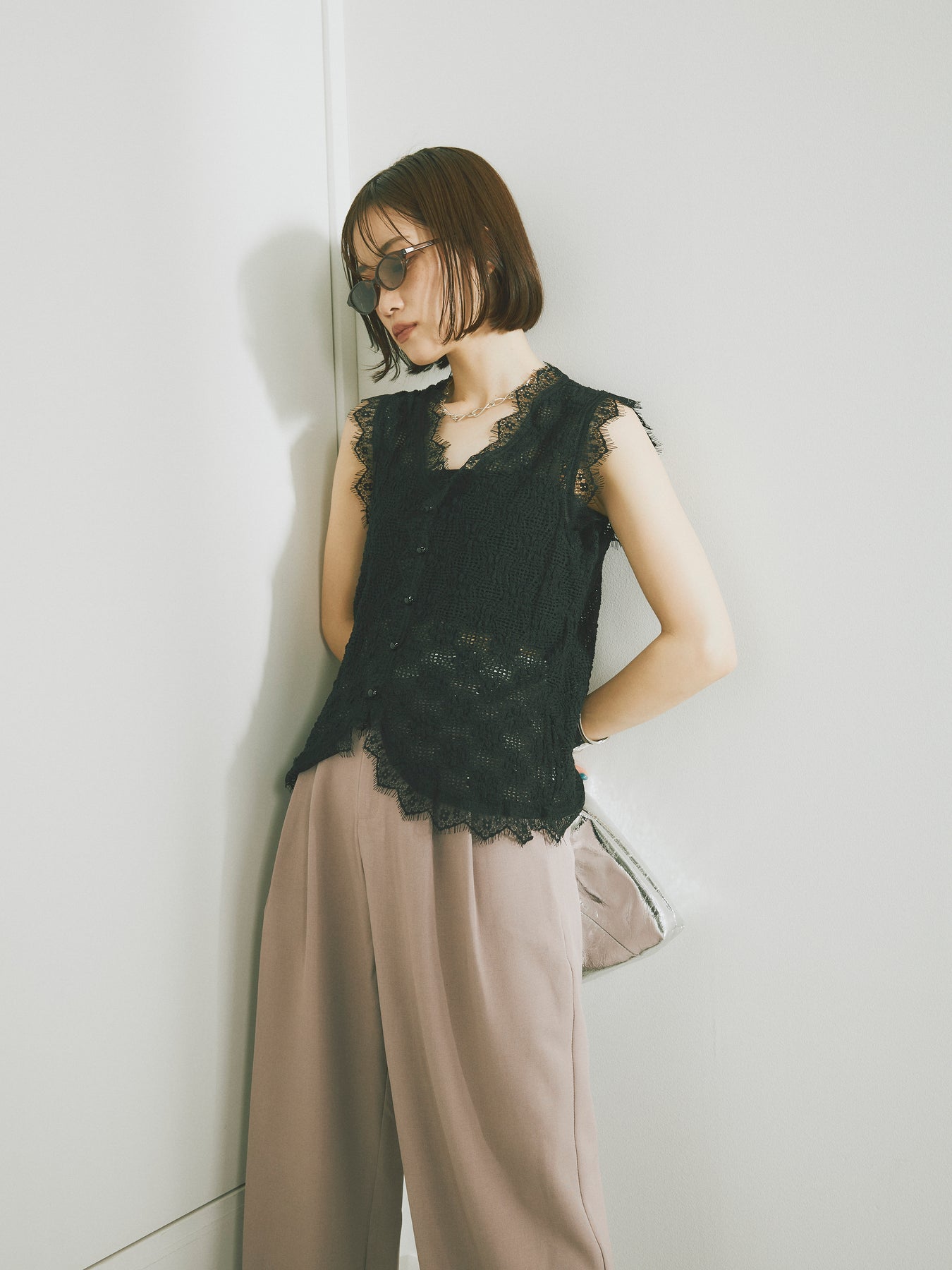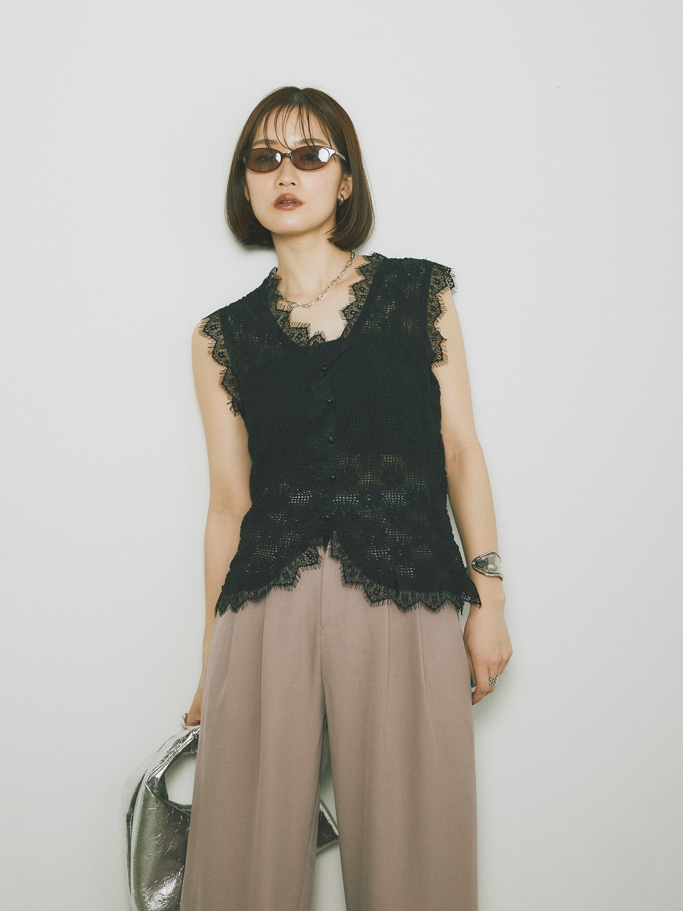 立体感のあるテープヤーンと繊細なレースを組み合わせた、印象的なノースリーブトップス。フロントはボタン仕様で、羽織りとしても活躍。スカラップのヘムラインが女性らしさを引き立て、夏のレイヤードスタイルにぴったりな一枚です。カジュアルなボトムと合わせても、ぐっと洗練された雰囲気に。トレンド感と着映え力を兼ね備えたアイテムです。 ※ボトムス、キャミソール(インナー)以外の商品は一律でインナーは付属していません
