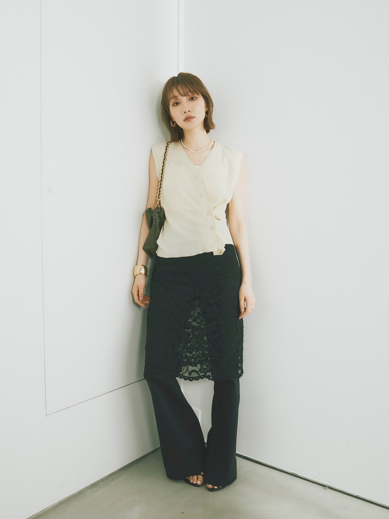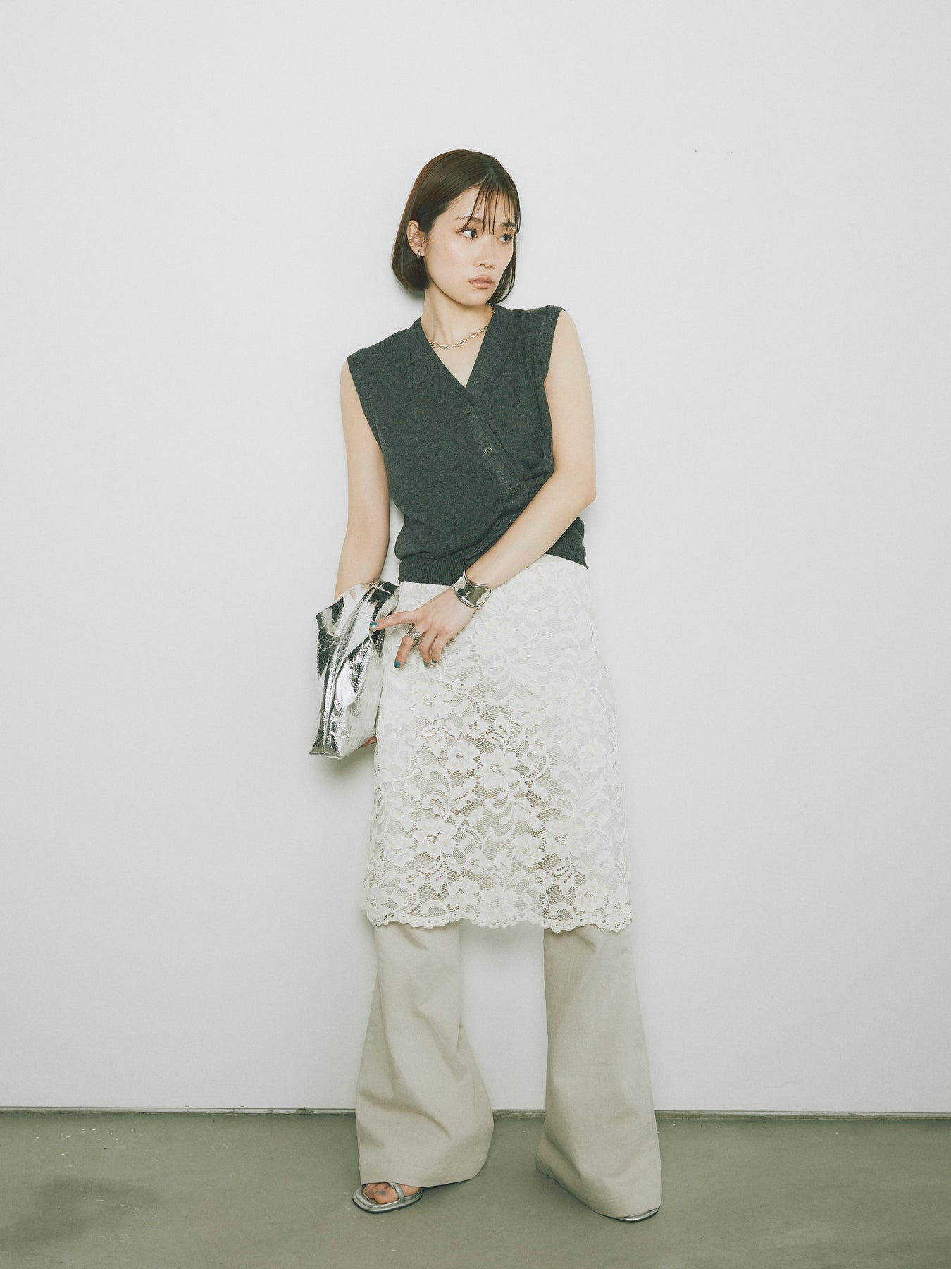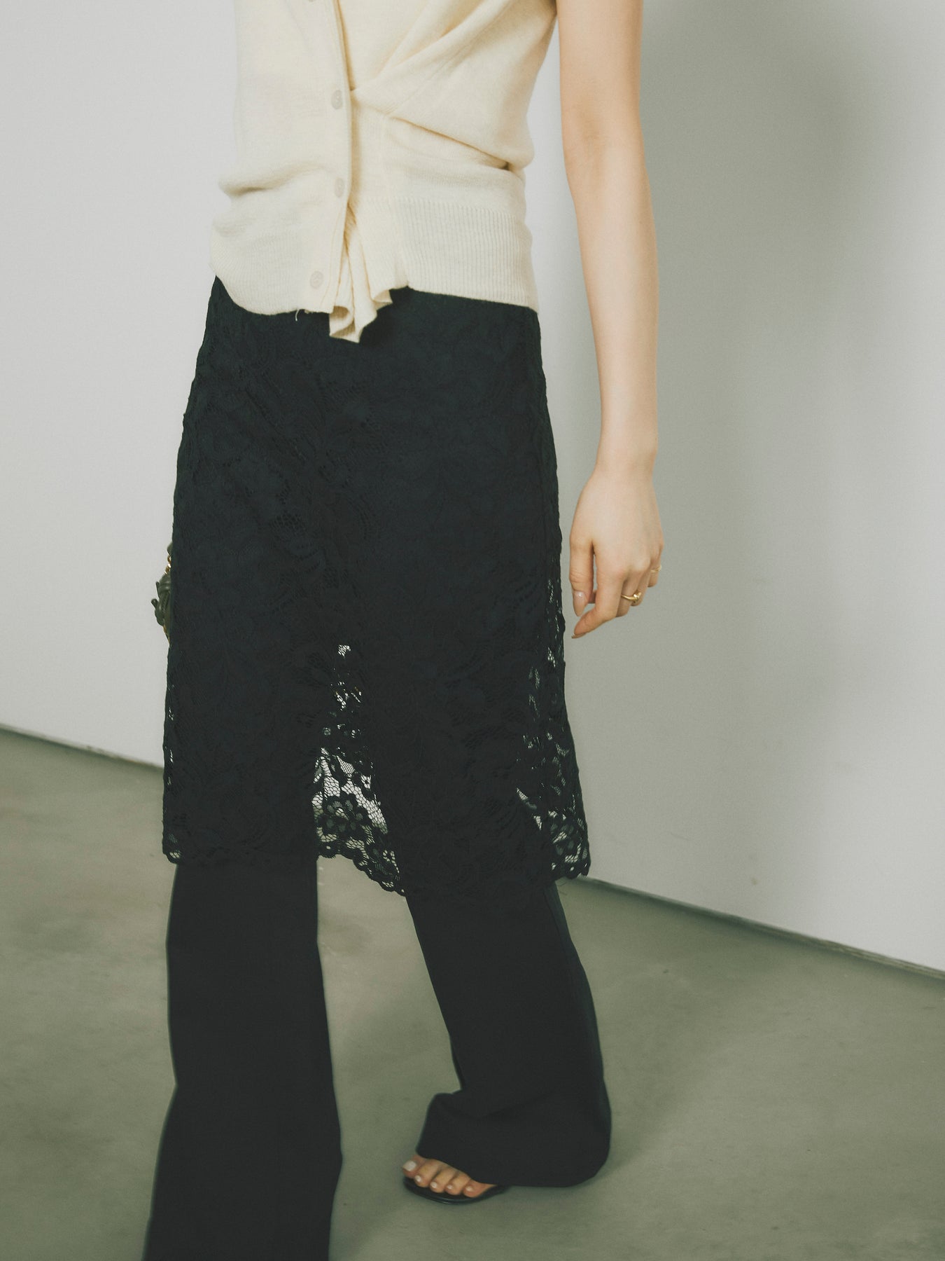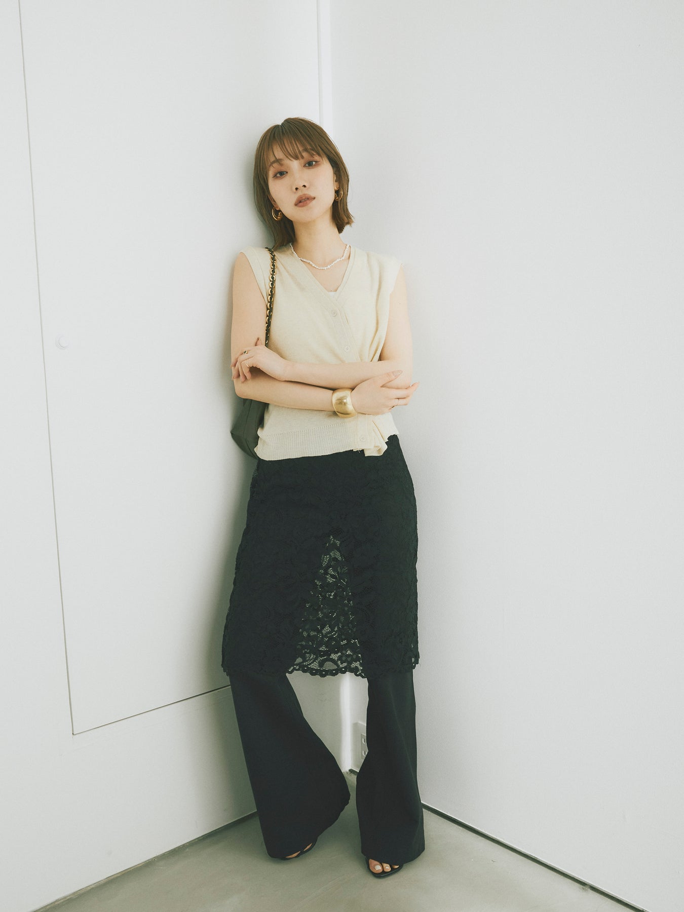 繊細なレーススカートをレイヤードした、トレンド感満載のフレアパンツ。異素材の組み合わせがスタイリングに奥行きを与え、こなれた雰囲気を演出します。スカート部分は取り外し可能で、シンプルなパンツスタイルとしても着用可能。コーデの幅を広げる、モードなムード漂う主役級アイテムです。 ※ボトムス、キャミソール(インナー)以外の商品は一律でインナーは付属していません