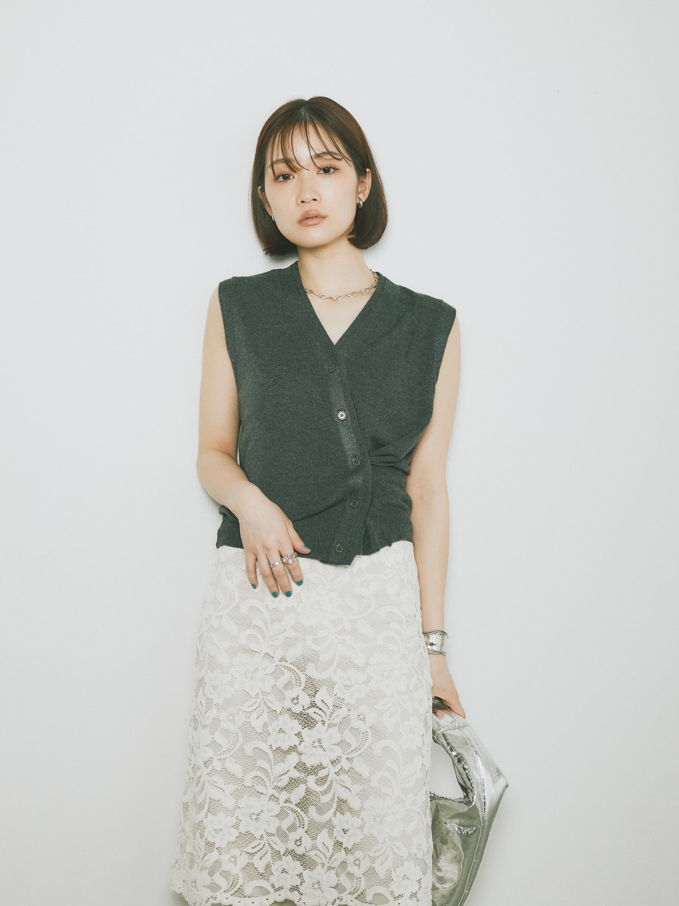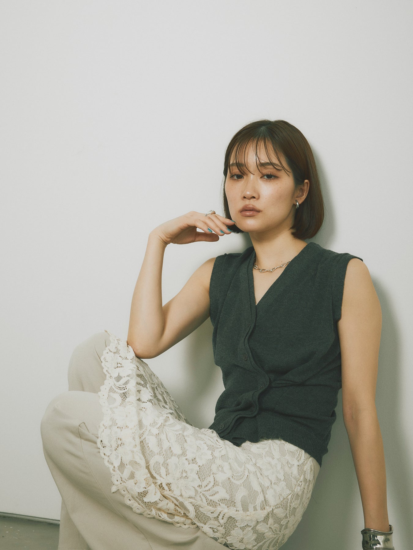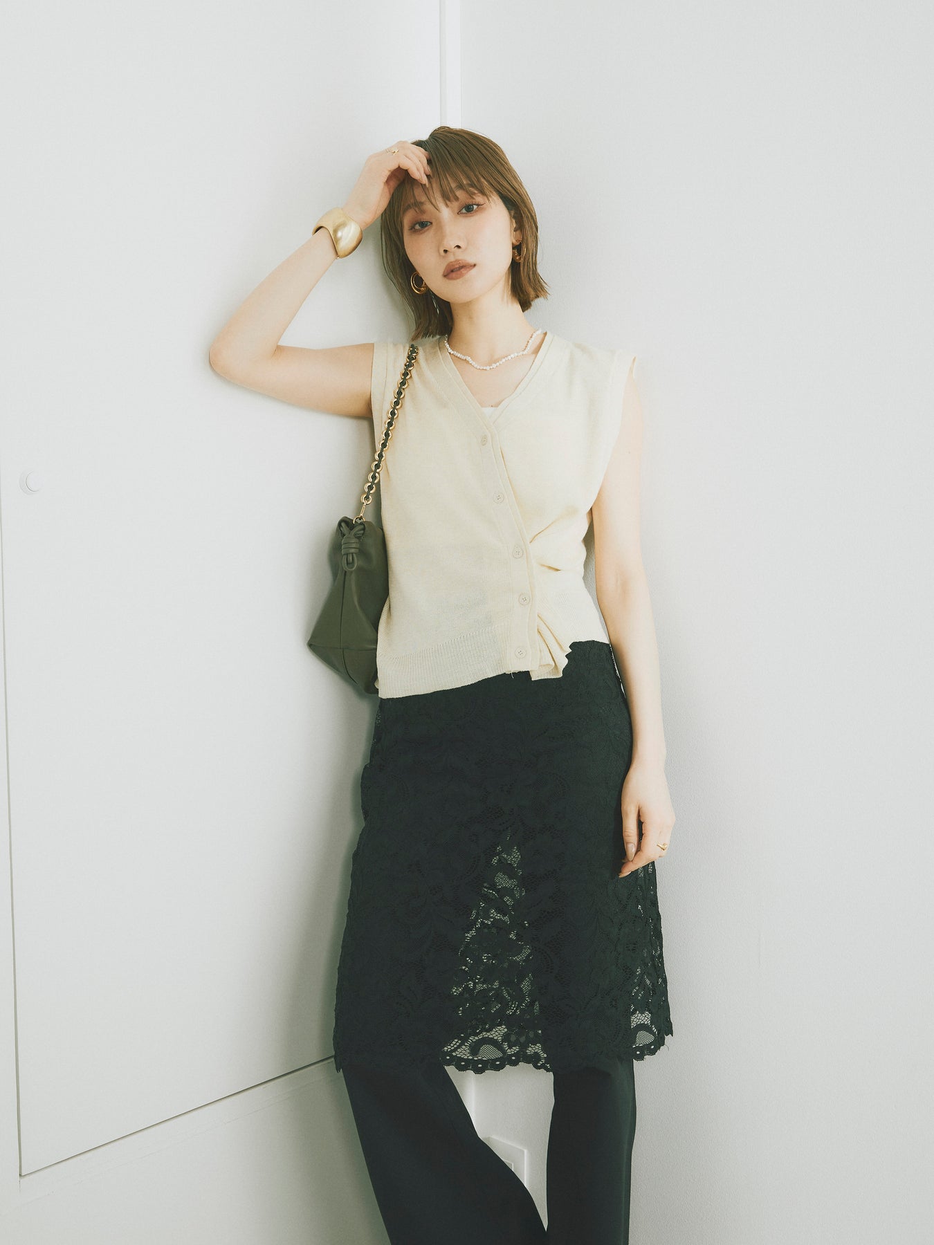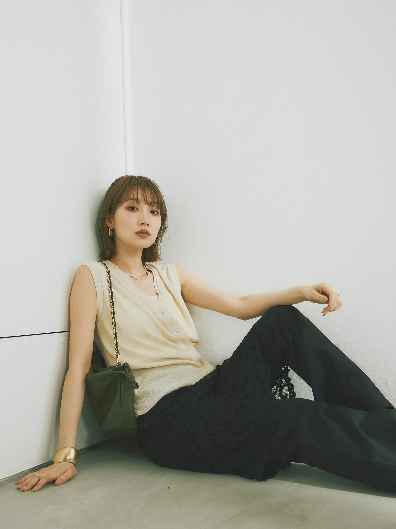 フロントとバック、どちらを前にしても着られる2WAY仕様のニットベスト。ボタンの開閉でアレンジが効き、レイヤードスタイルにもぴったりな一枚です。コンパクトなシルエットが女性らしさを引き立てつつ、カジュアルにもモードにも着こなせる万能アイテム。トレンド感のあるスタイリングが叶います。 ※ボトムス、キャミソール(インナー)以外の商品は一律でインナーは付属していません
