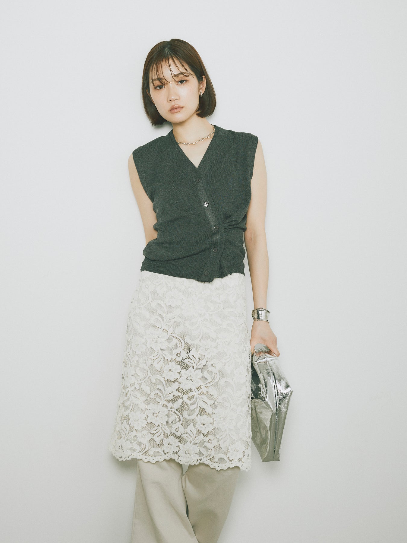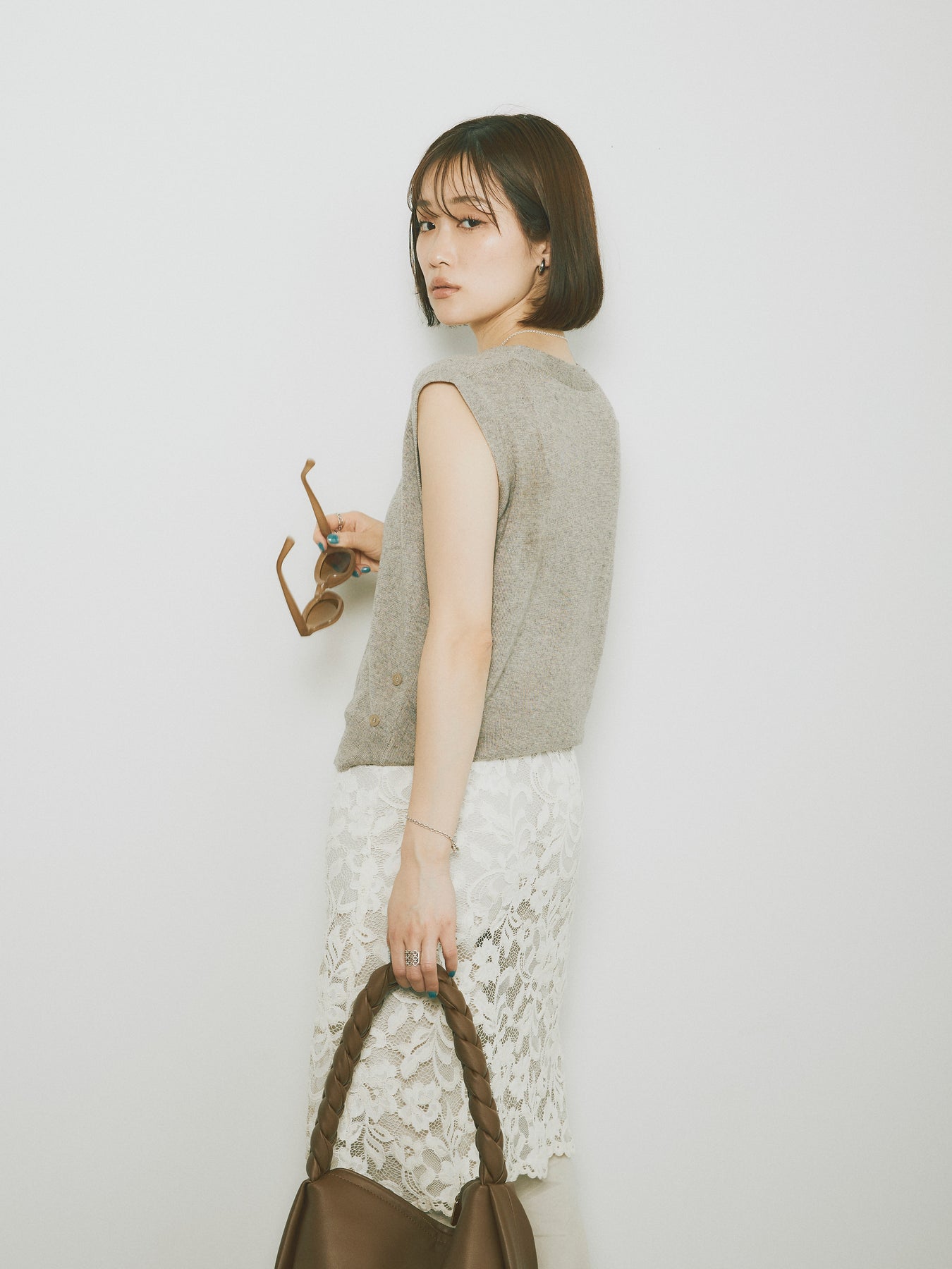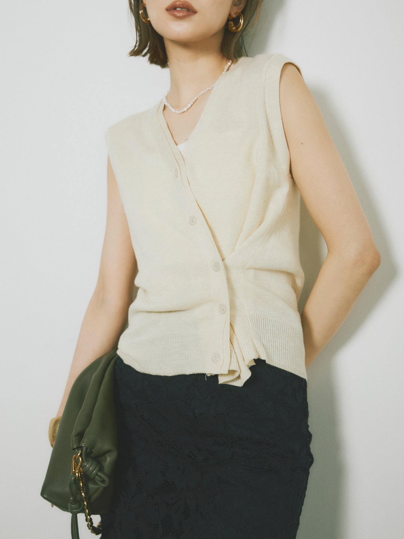 フロントとバック、どちらを前にしても着られる2WAY仕様のニットベスト。ボタンの開閉でアレンジが効き、レイヤードスタイルにもぴったりな一枚です。コンパクトなシルエットが女性らしさを引き立てつつ、カジュアルにもモードにも着こなせる万能アイテム。トレンド感のあるスタイリングが叶います。 ※ボトムス、キャミソール(インナー)以外の商品は一律でインナーは付属していません