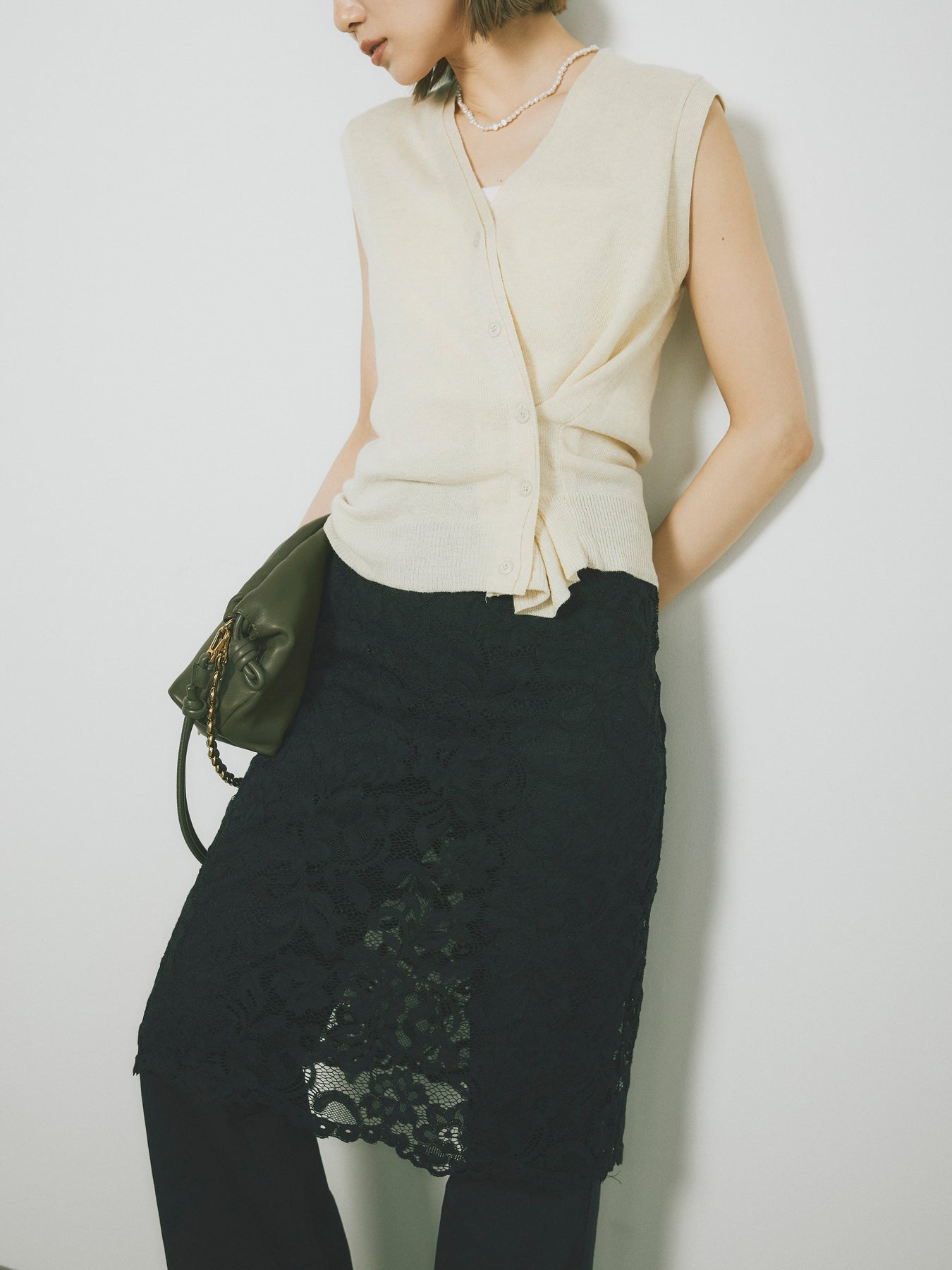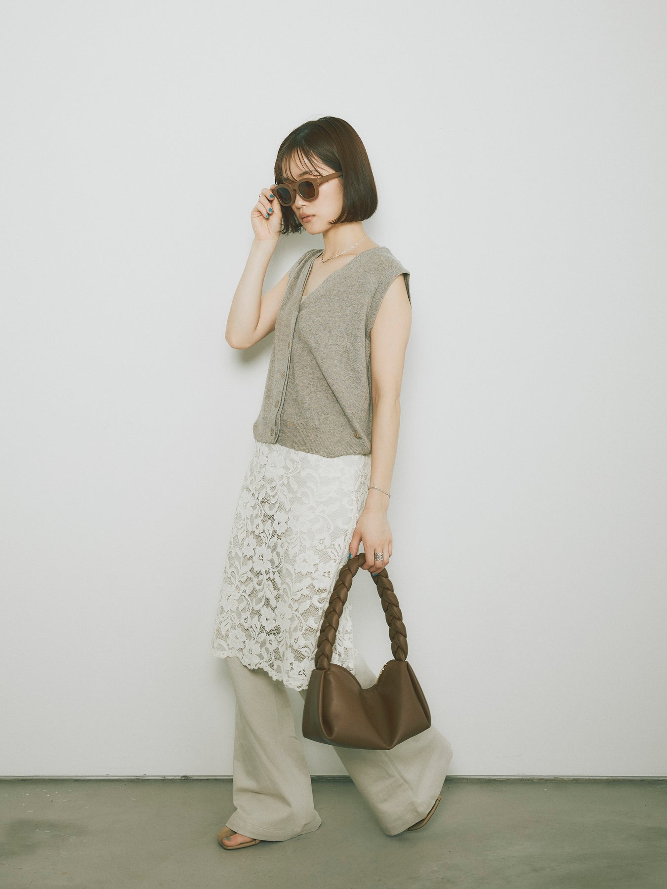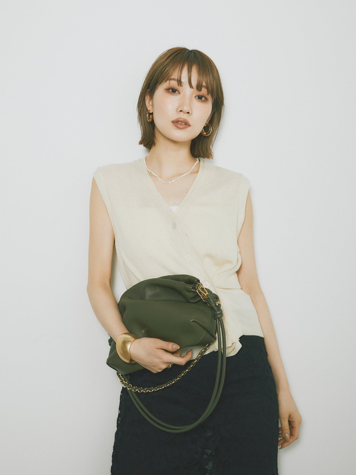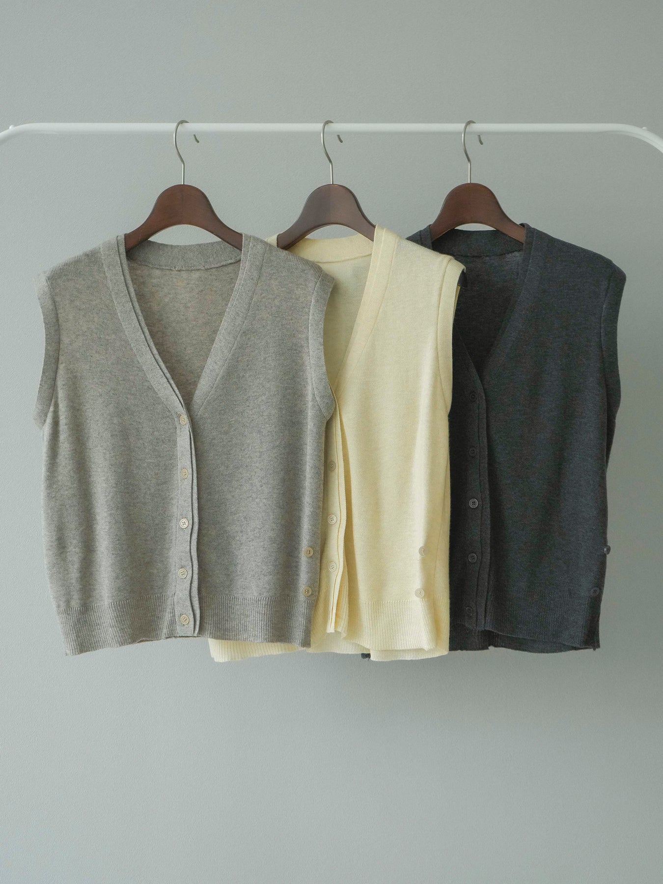 フロントとバック、どちらを前にしても着られる2WAY仕様のニットベスト。ボタンの開閉でアレンジが効き、レイヤードスタイルにもぴったりな一枚です。コンパクトなシルエットが女性らしさを引き立てつつ、カジュアルにもモードにも着こなせる万能アイテム。トレンド感のあるスタイリングが叶います。 ※ボトムス、キャミソール(インナー)以外の商品は一律でインナーは付属していません