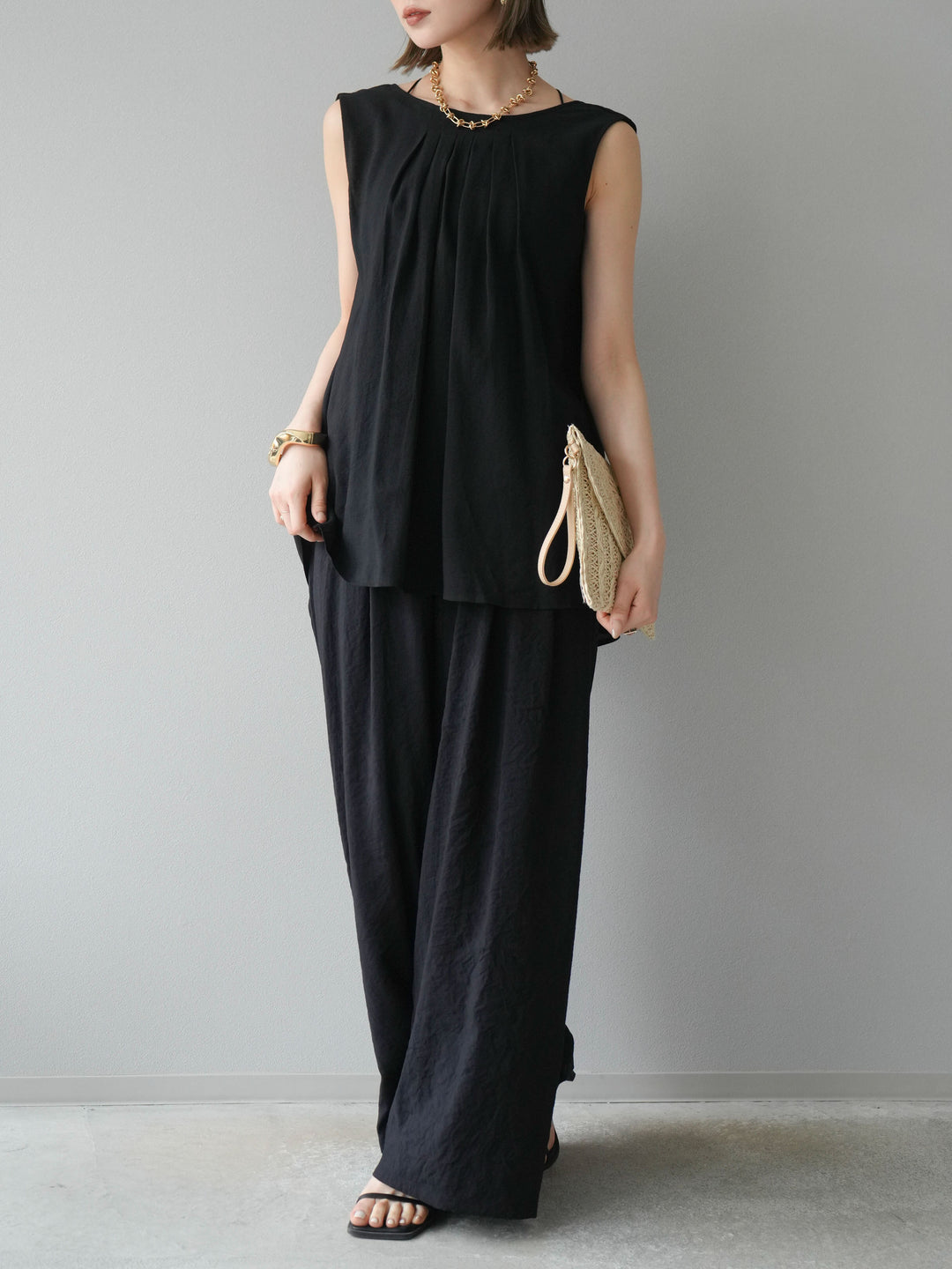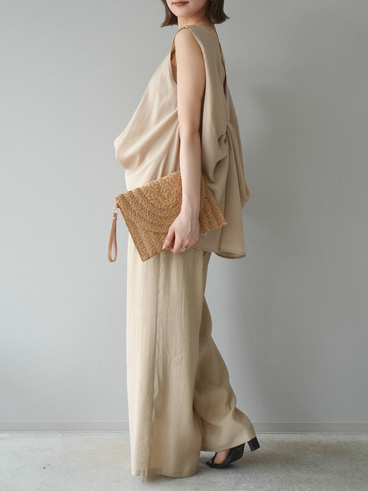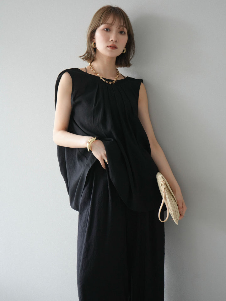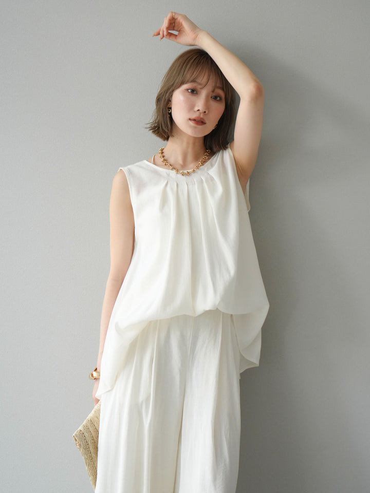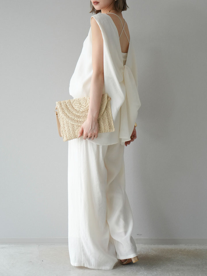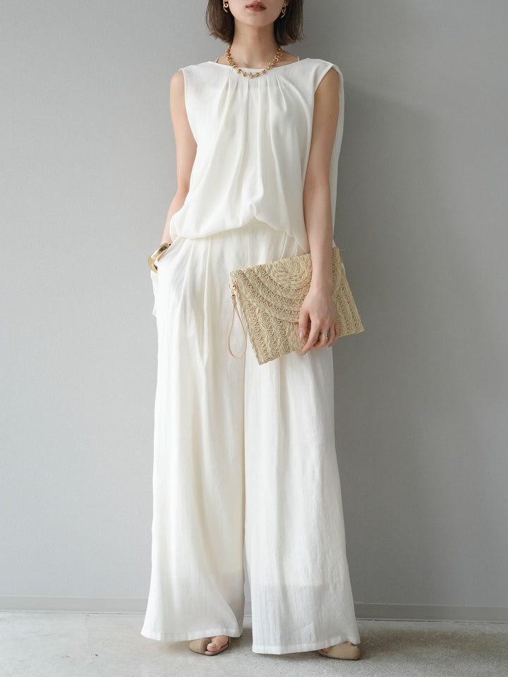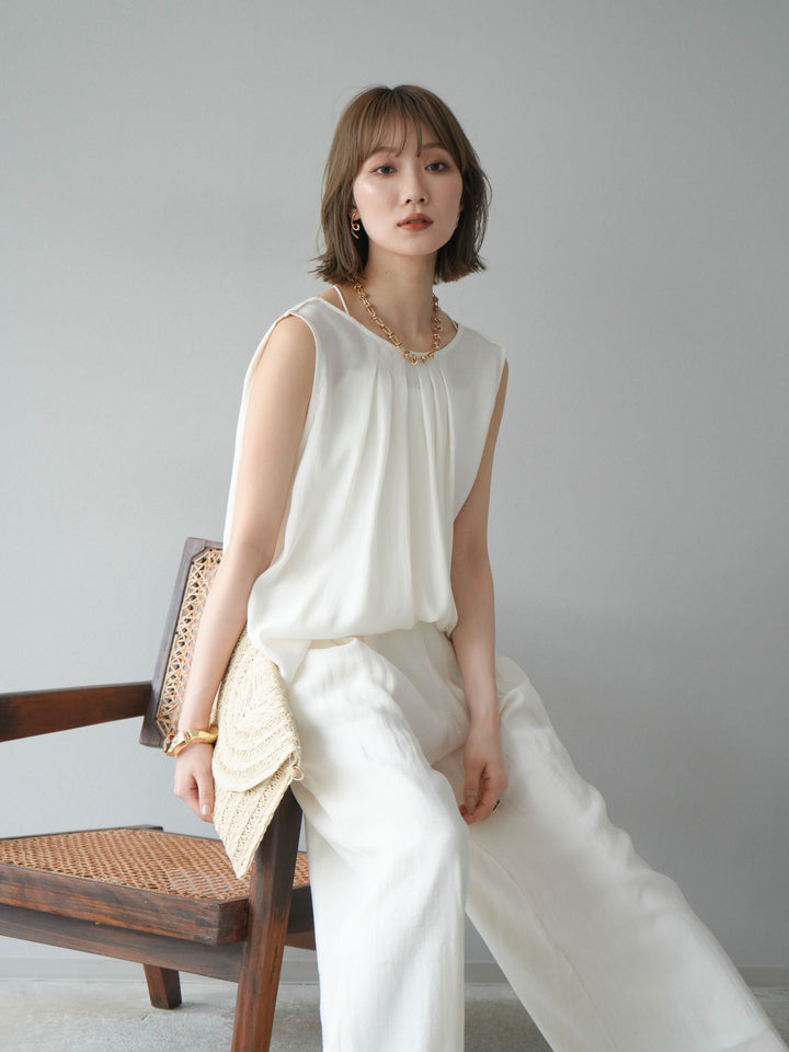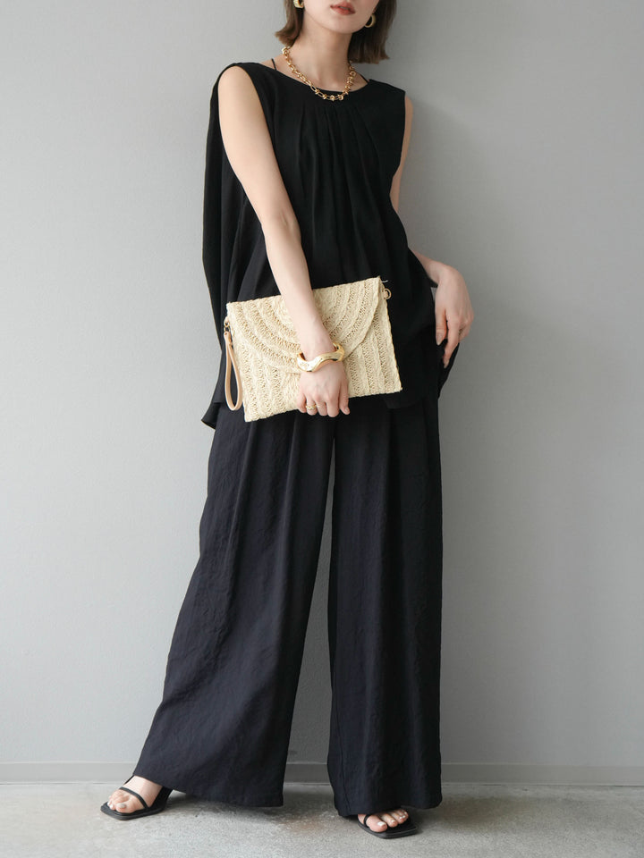 [SET]シボ加工バックツイストブラウス+ダブルストラップカットリブブラキャミソール+シボ加工イージーワイドパンツ(3set)