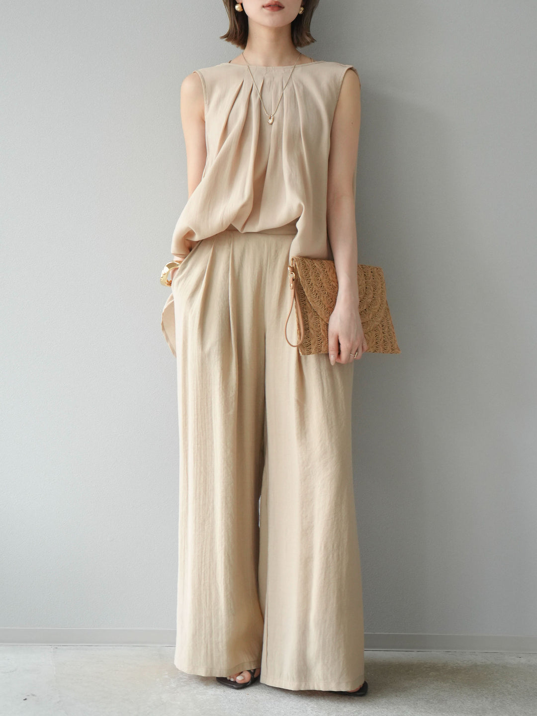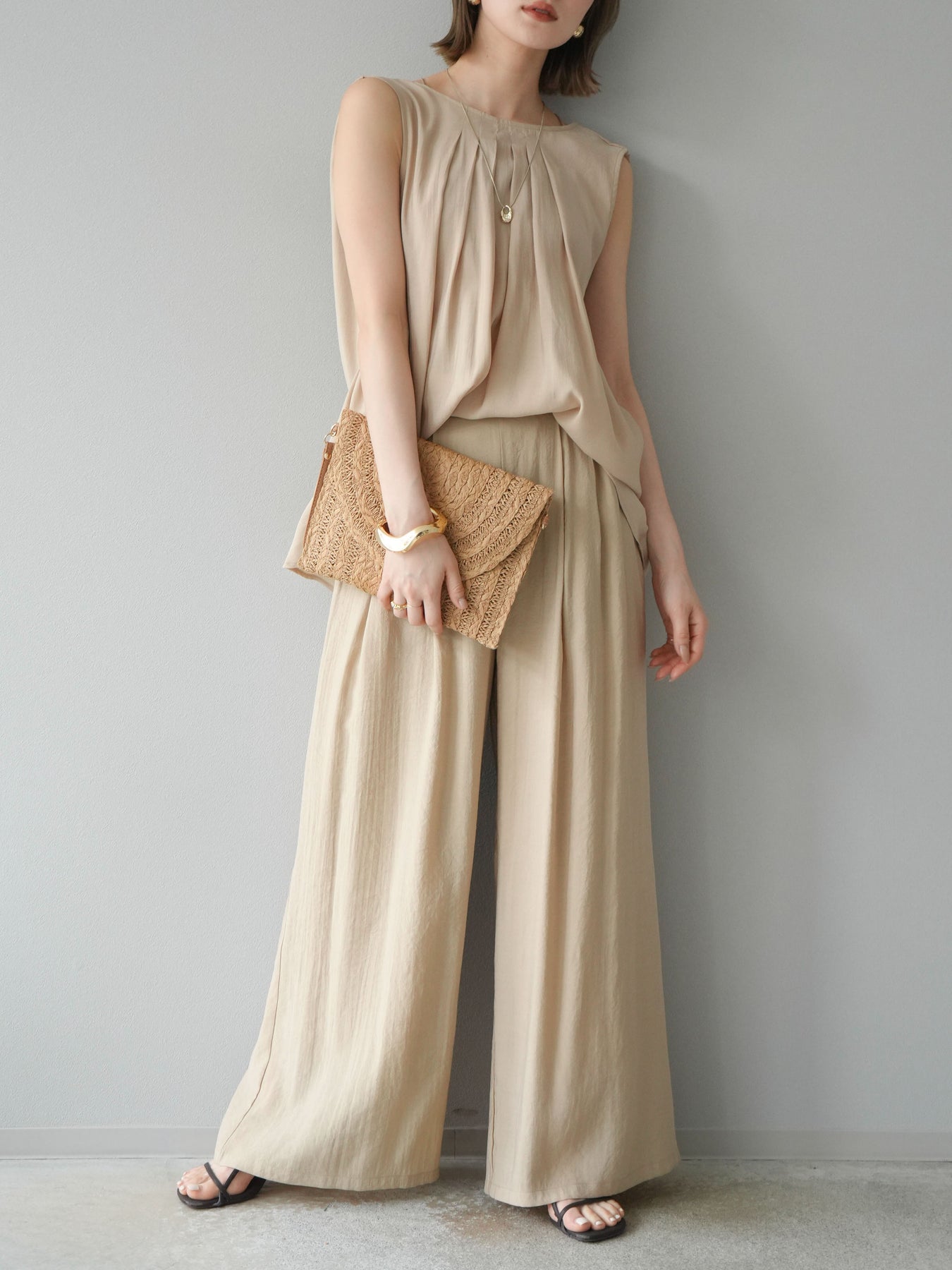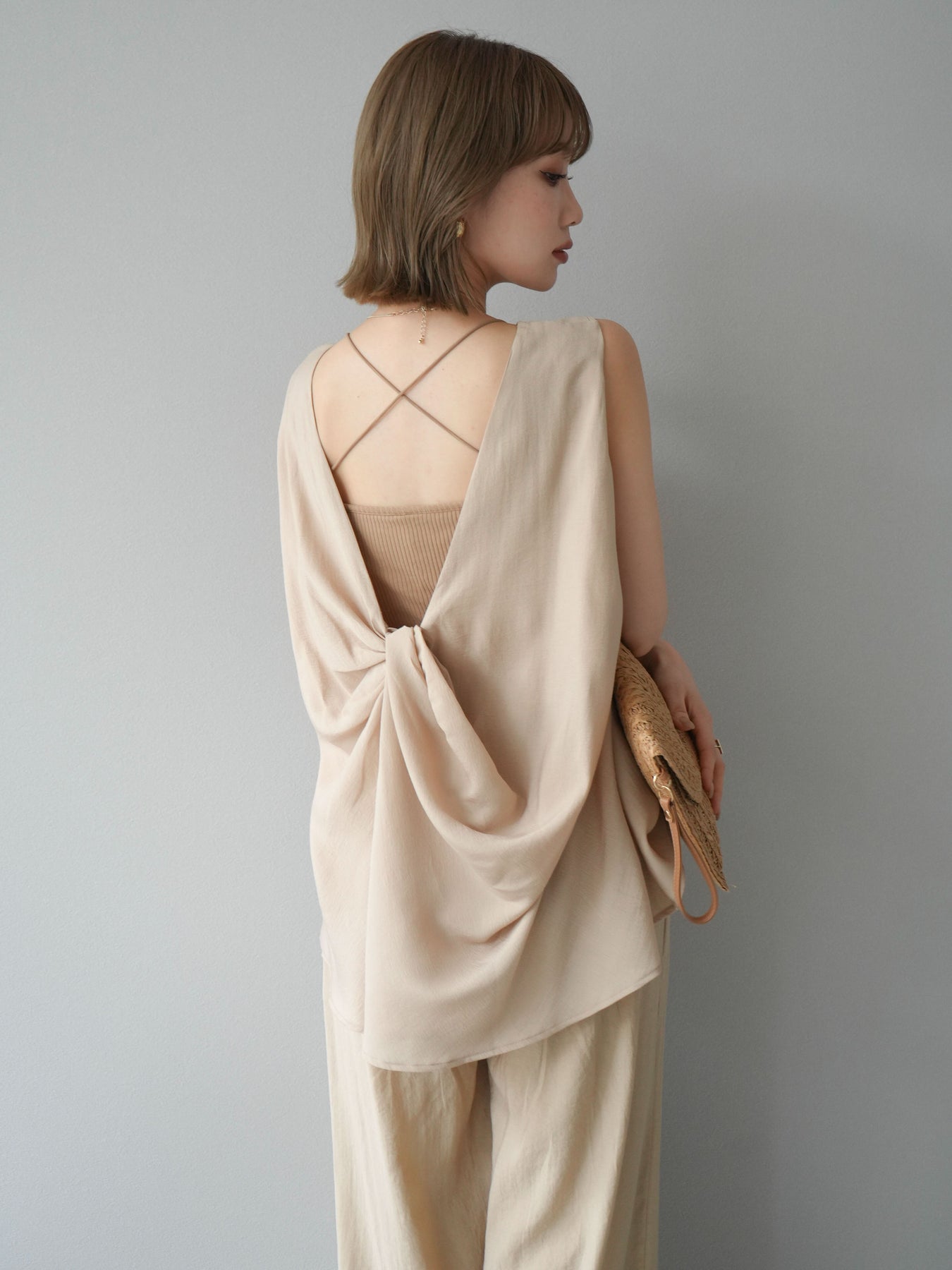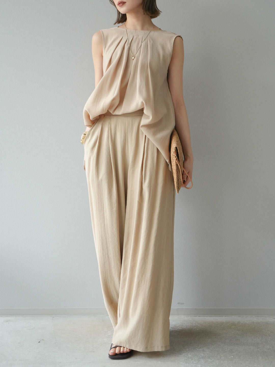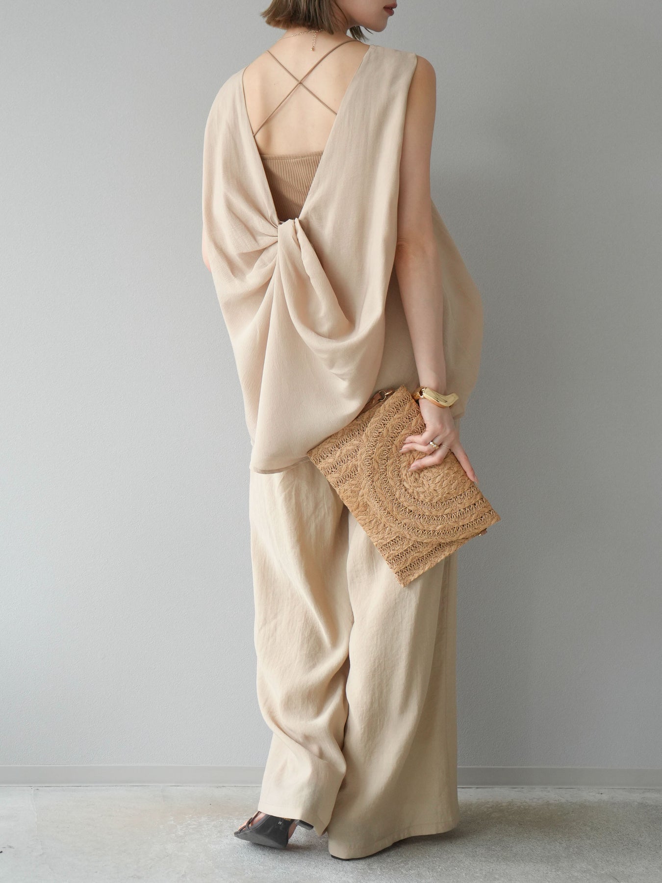 [SET]シボ加工バックツイストブラウス+ダブルストラップカットリブブラキャミソール+シボ加工イージーワイドパンツ(3set)