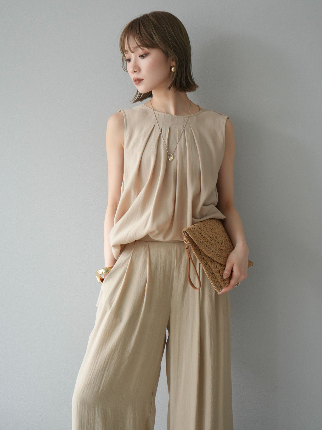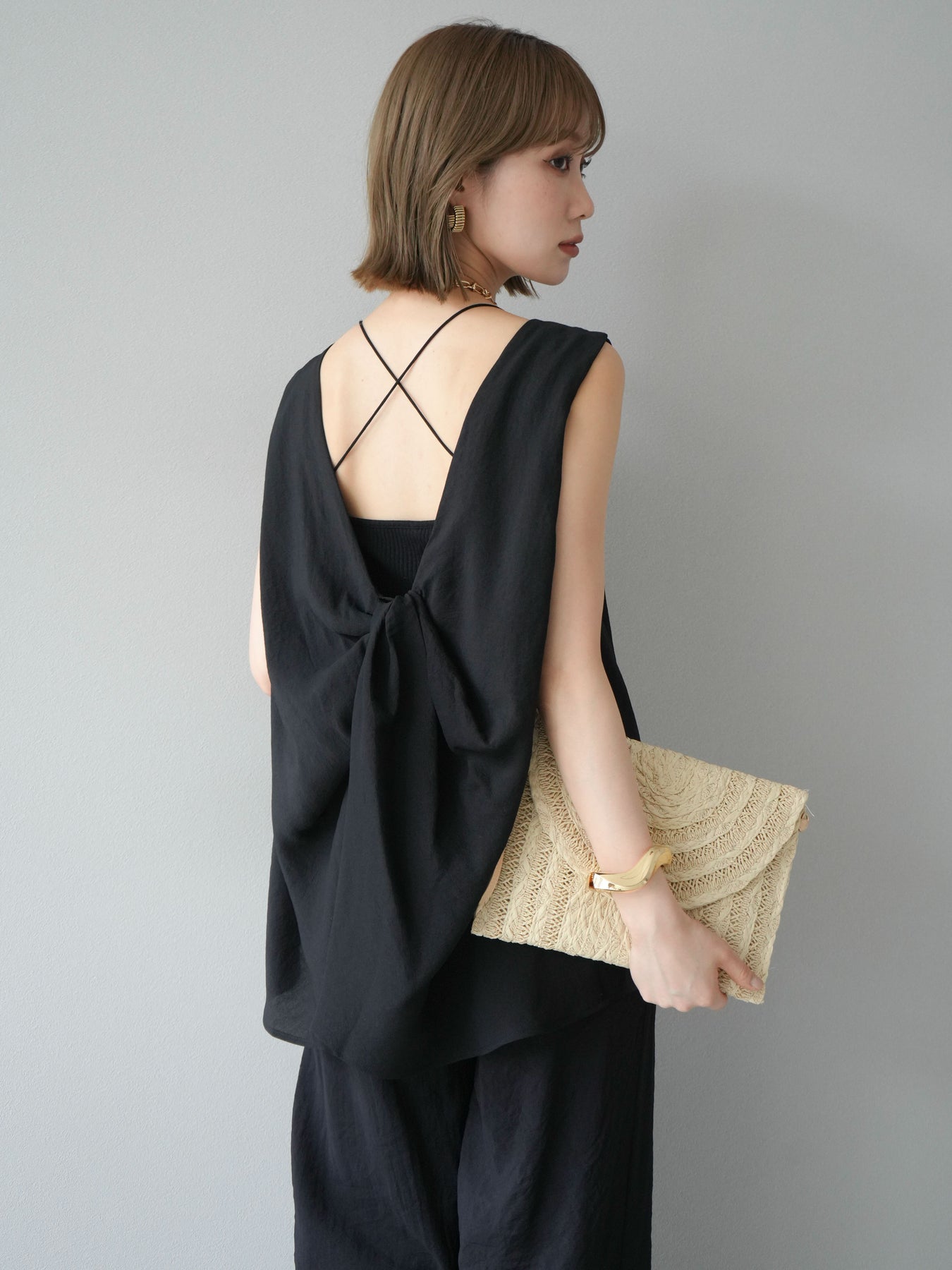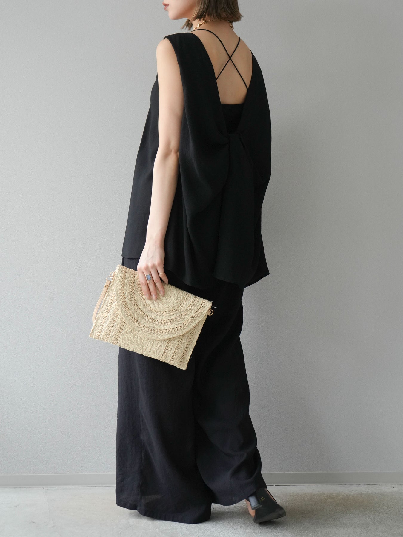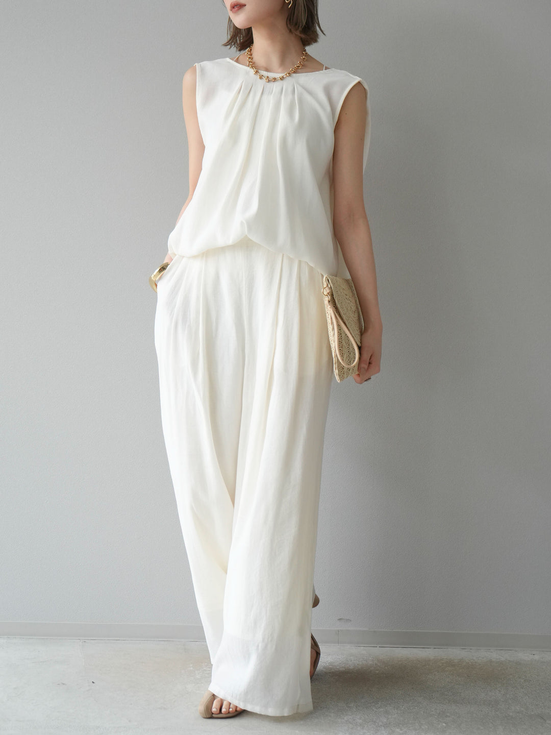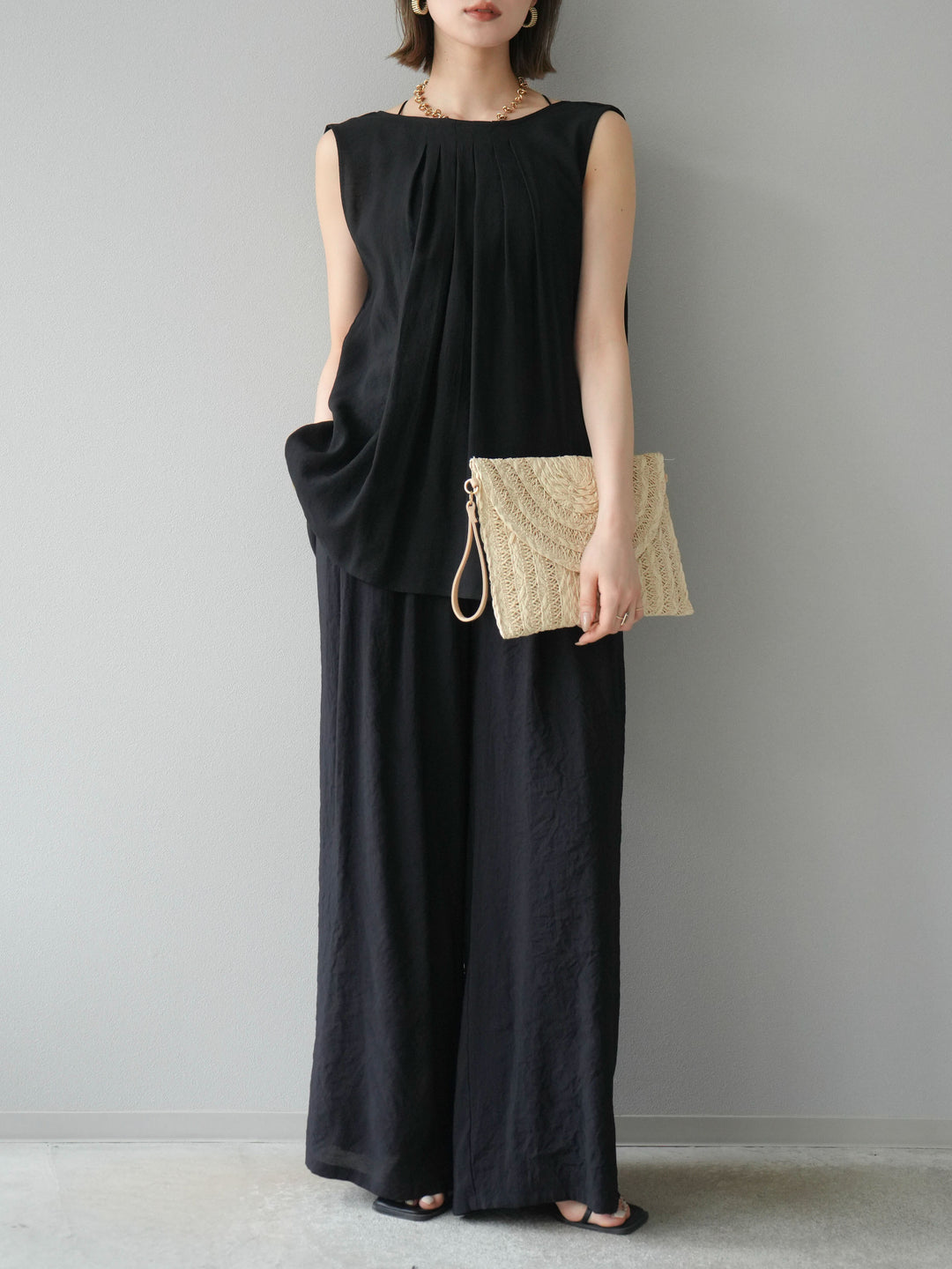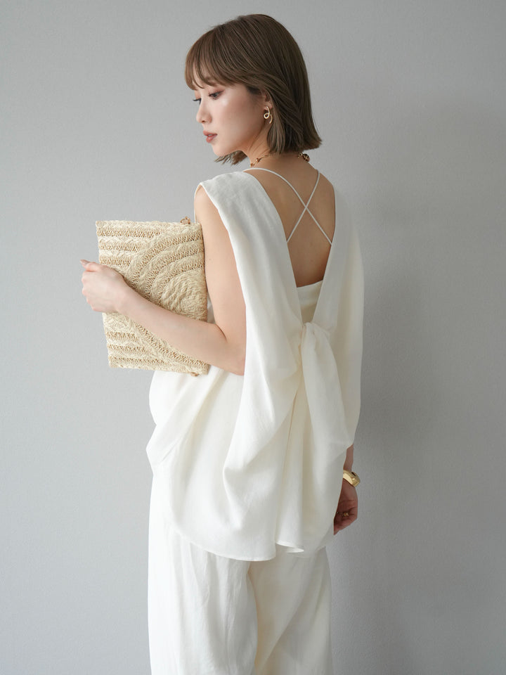 [SET]シボ加工バックツイストブラウス+ダブルストラップカットリブブラキャミソール+シボ加工イージーワイドパンツ(3set)