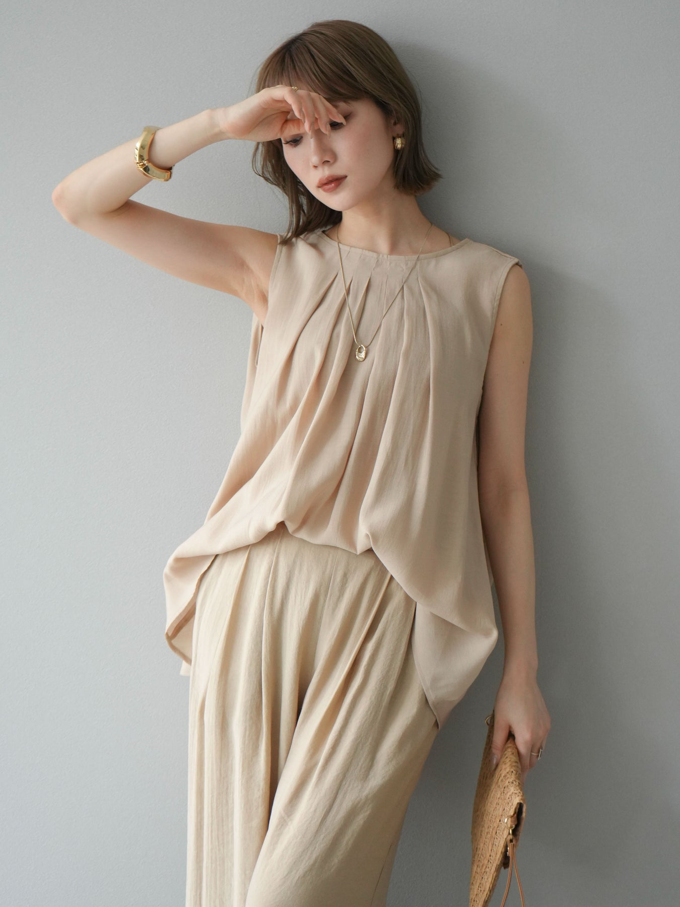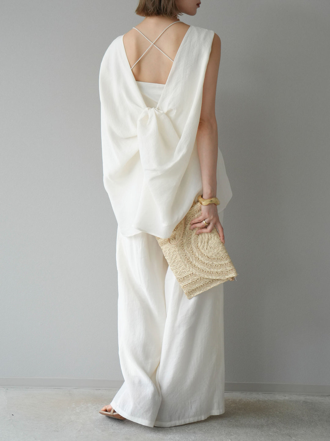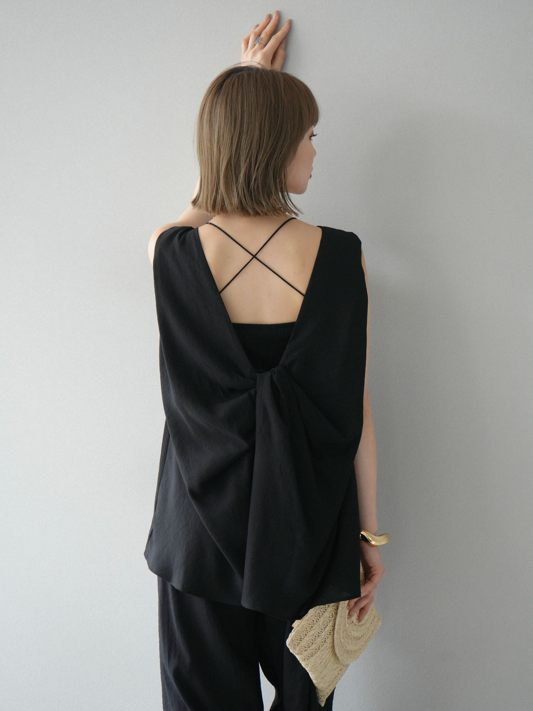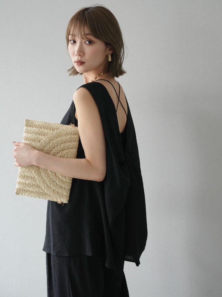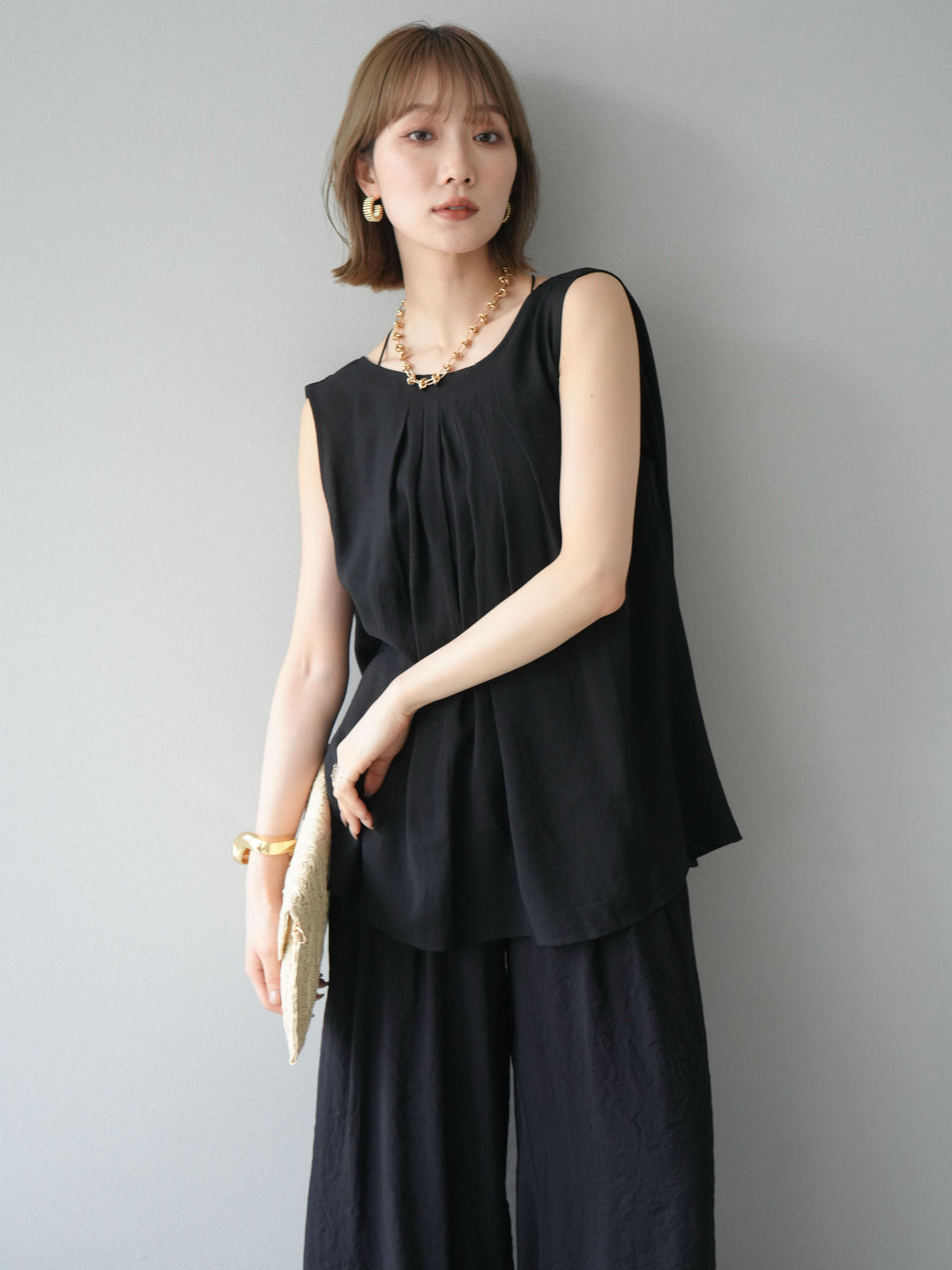 [SET]シボ加工バックツイストブラウス+ダブルストラップカットリブブラキャミソール+シボ加工イージーワイドパンツ(3set)