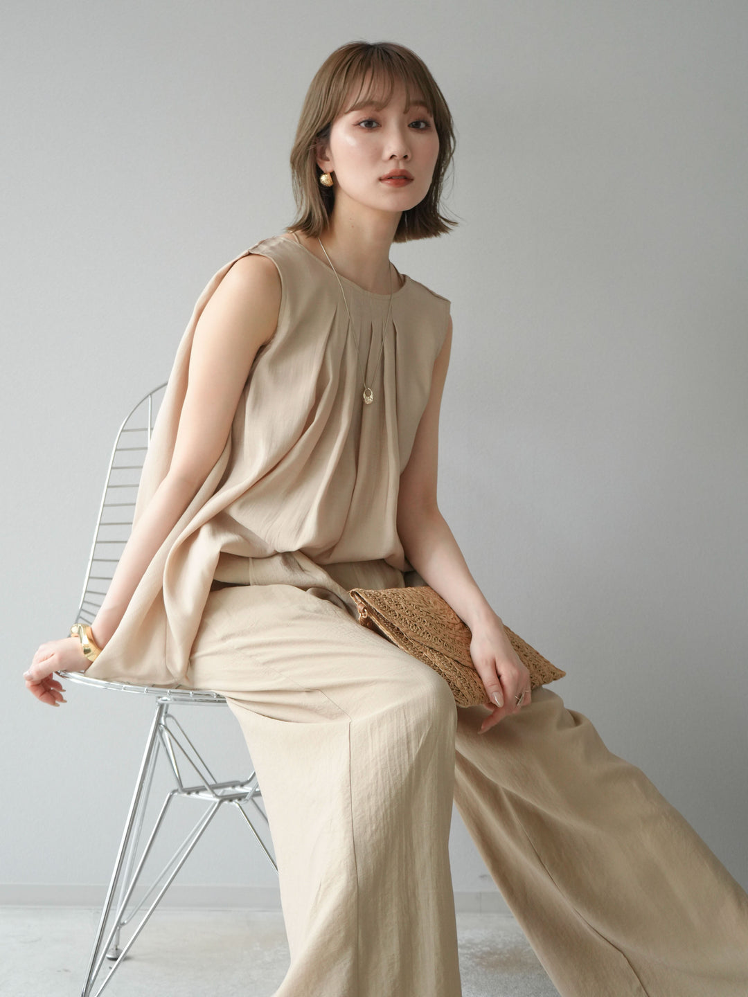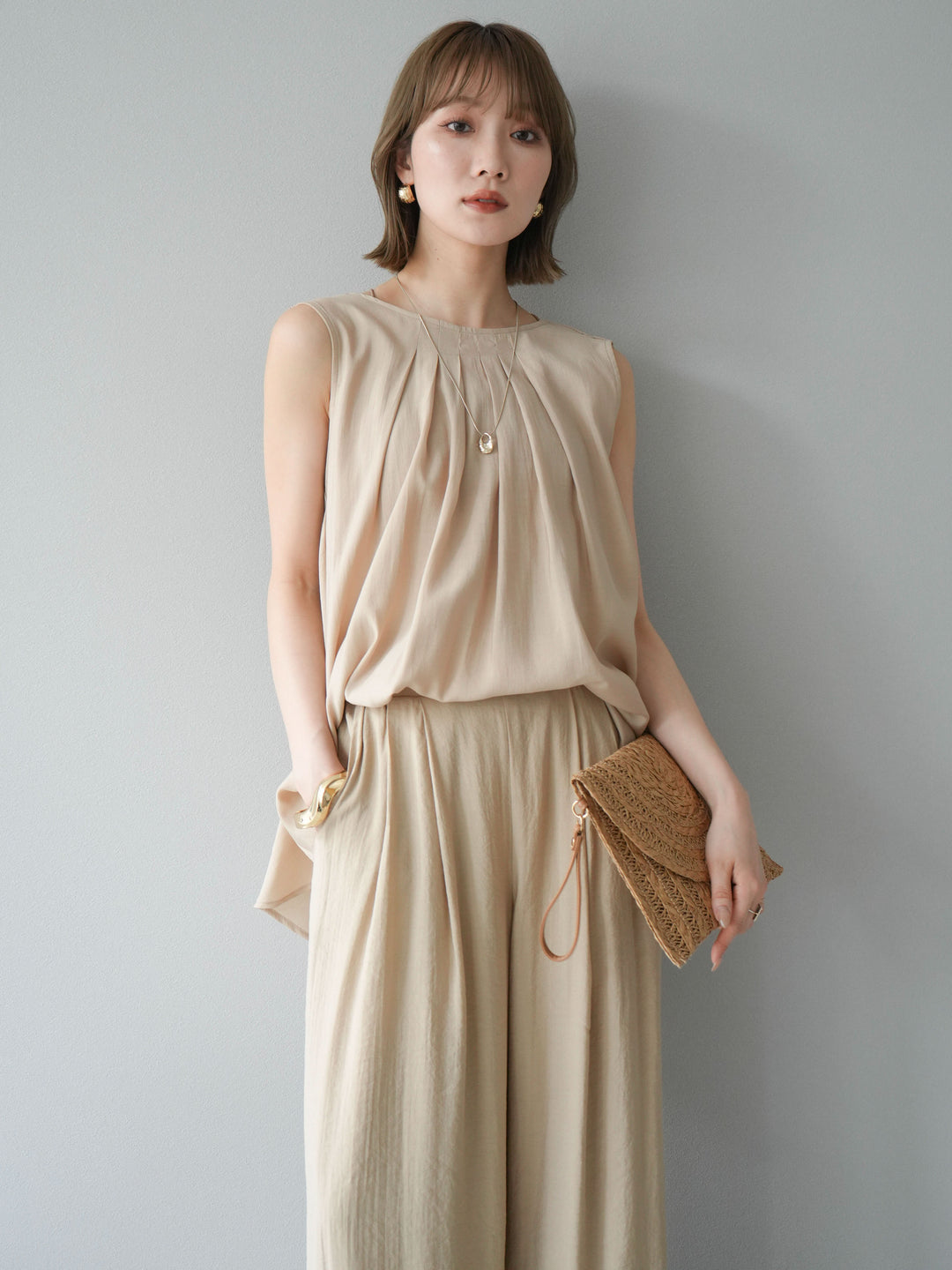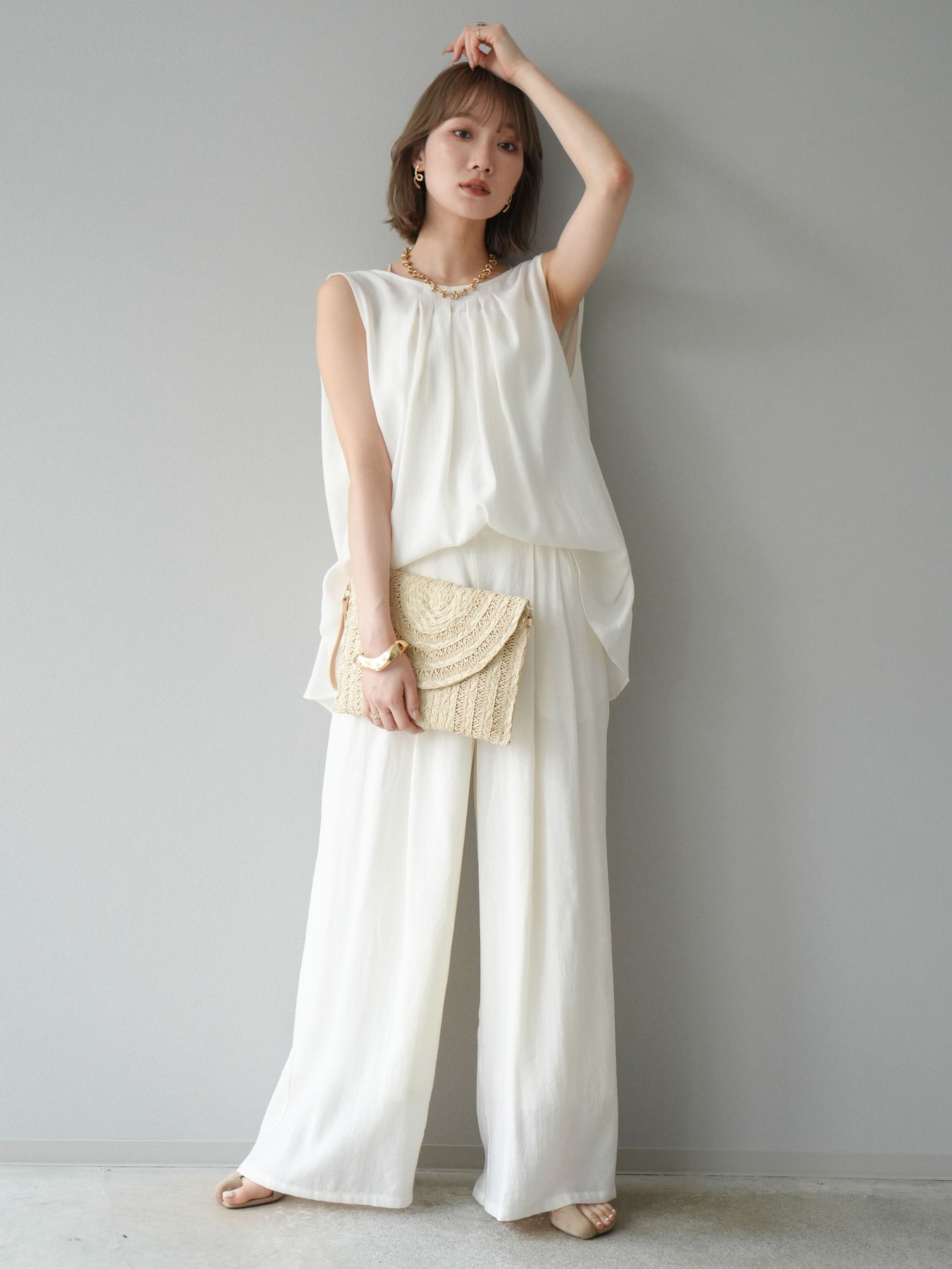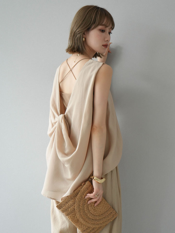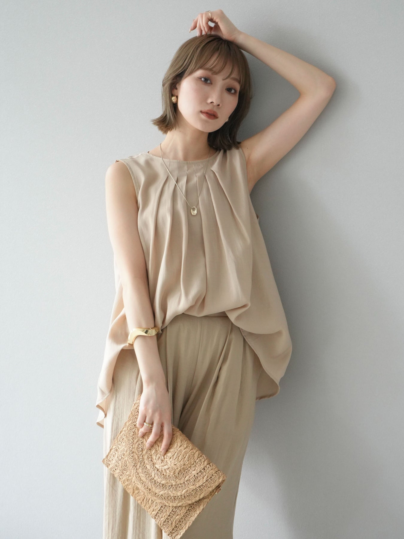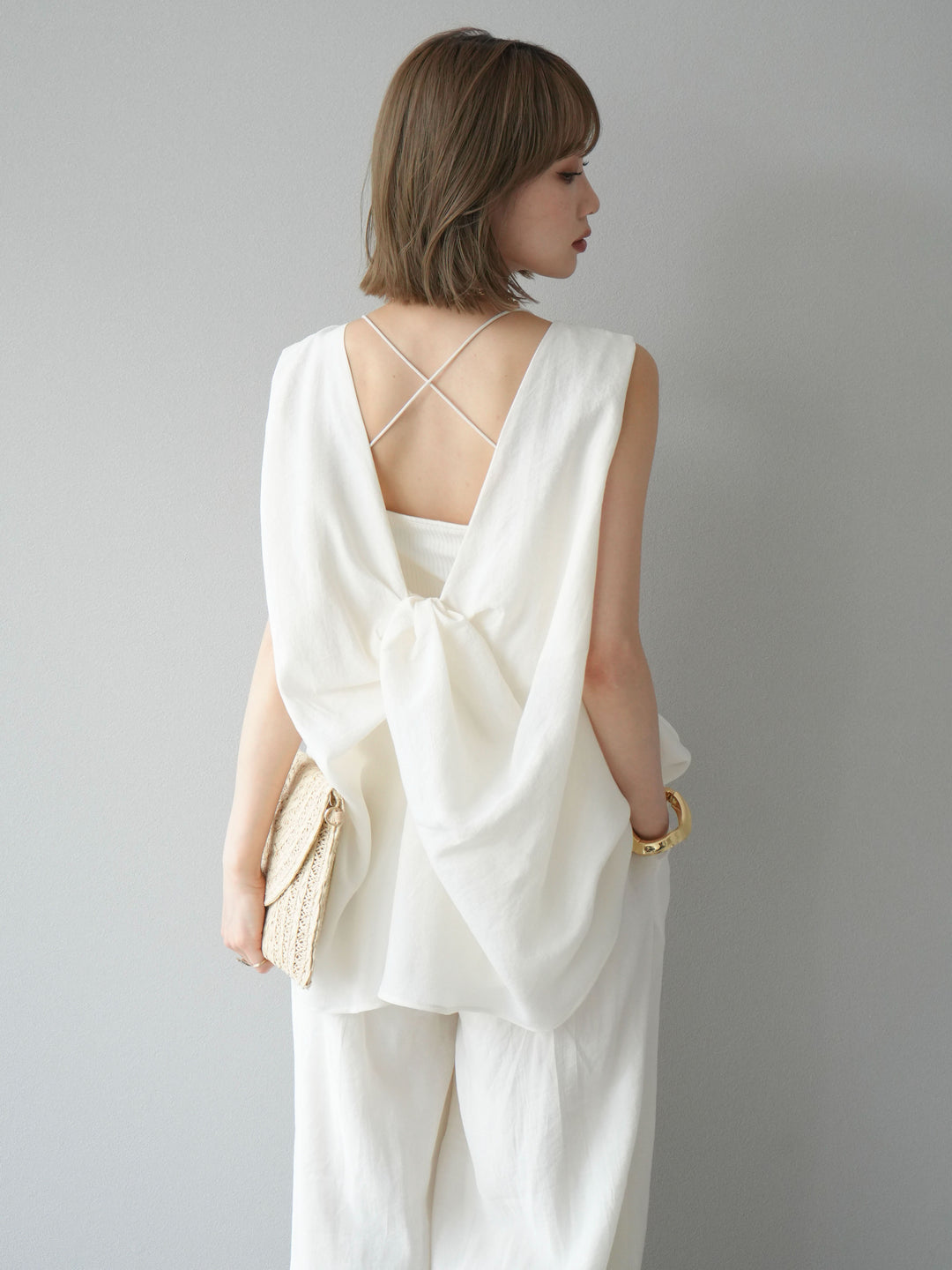 [SET]シボ加工バックツイストブラウス+ダブルストラップカットリブブラキャミソール+シボ加工イージーワイドパンツ(3set)