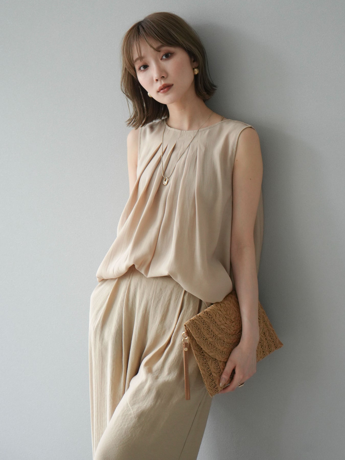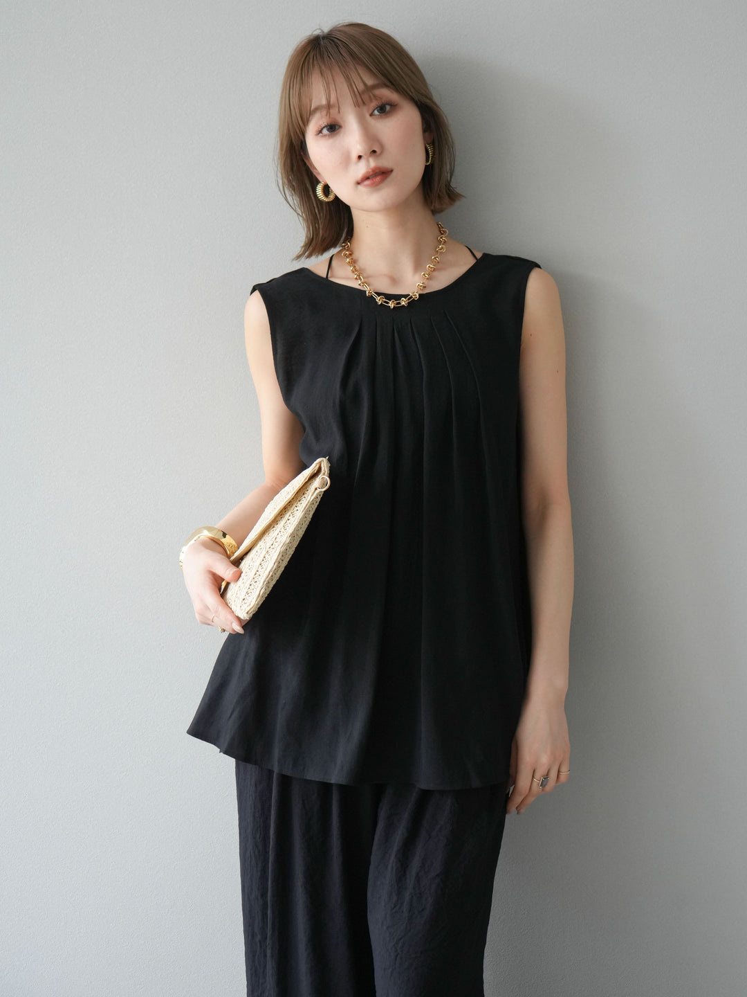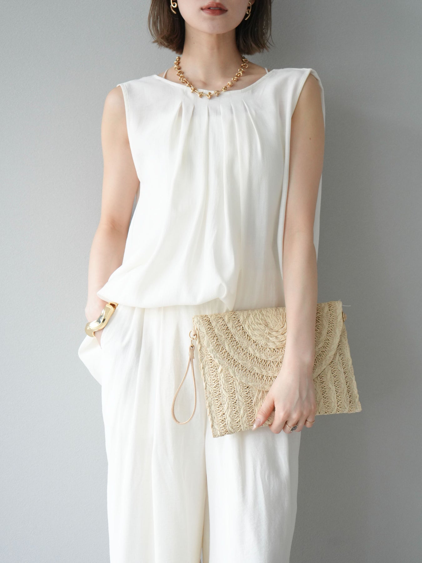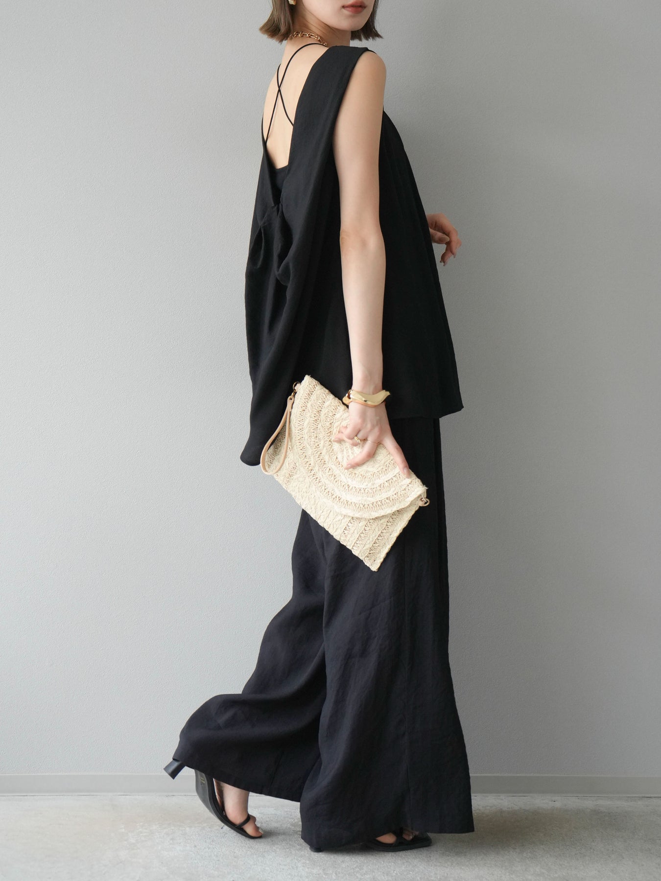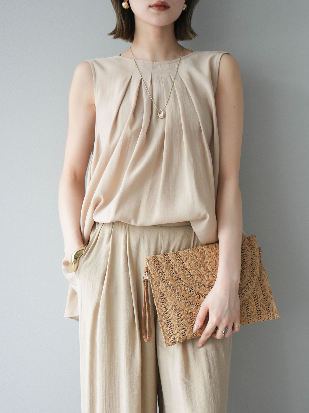 [SET]シボ加工バックツイストブラウス+ダブルストラップカットリブブラキャミソール+シボ加工イージーワイドパンツ(3set)