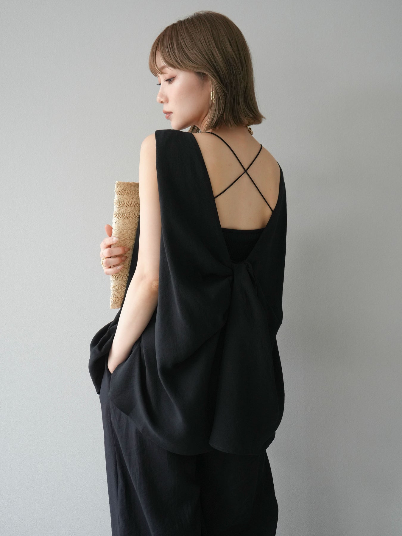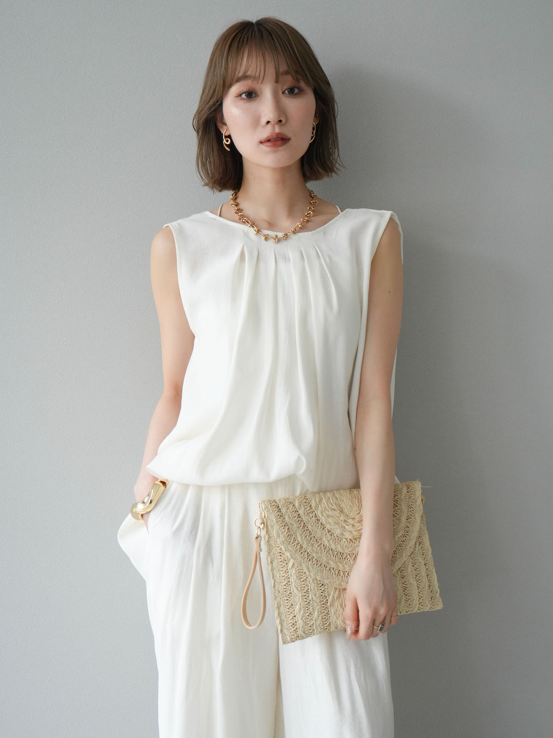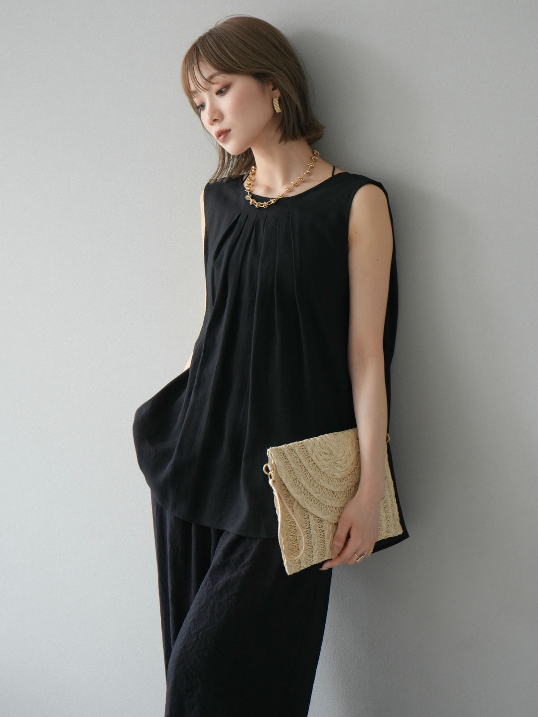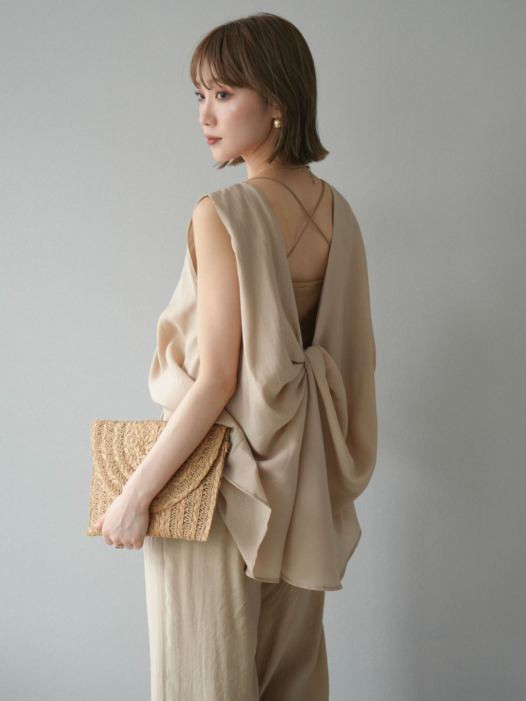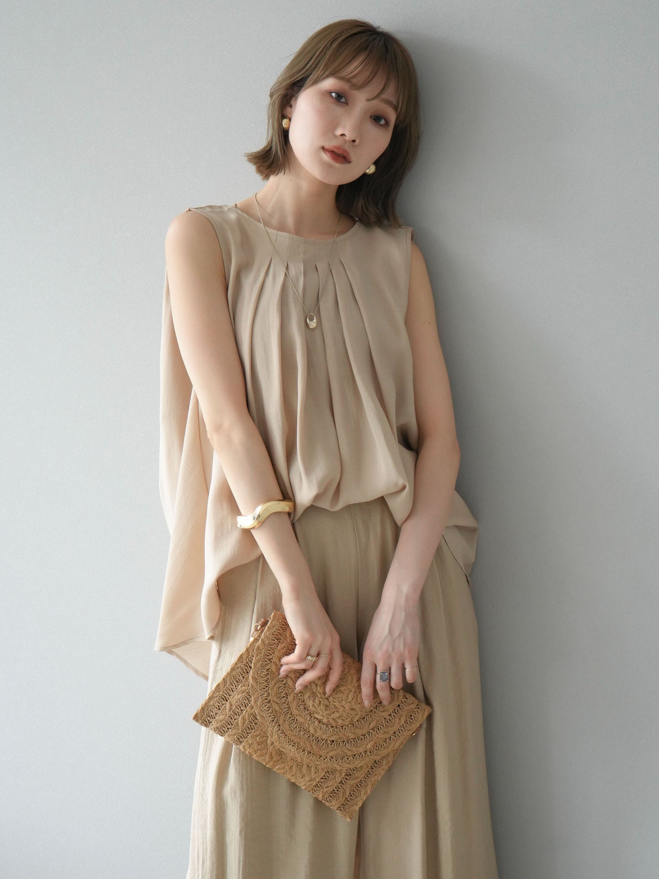 [SET]シボ加工バックツイストブラウス+ダブルストラップカットリブブラキャミソール+シボ加工イージーワイドパンツ(3set)