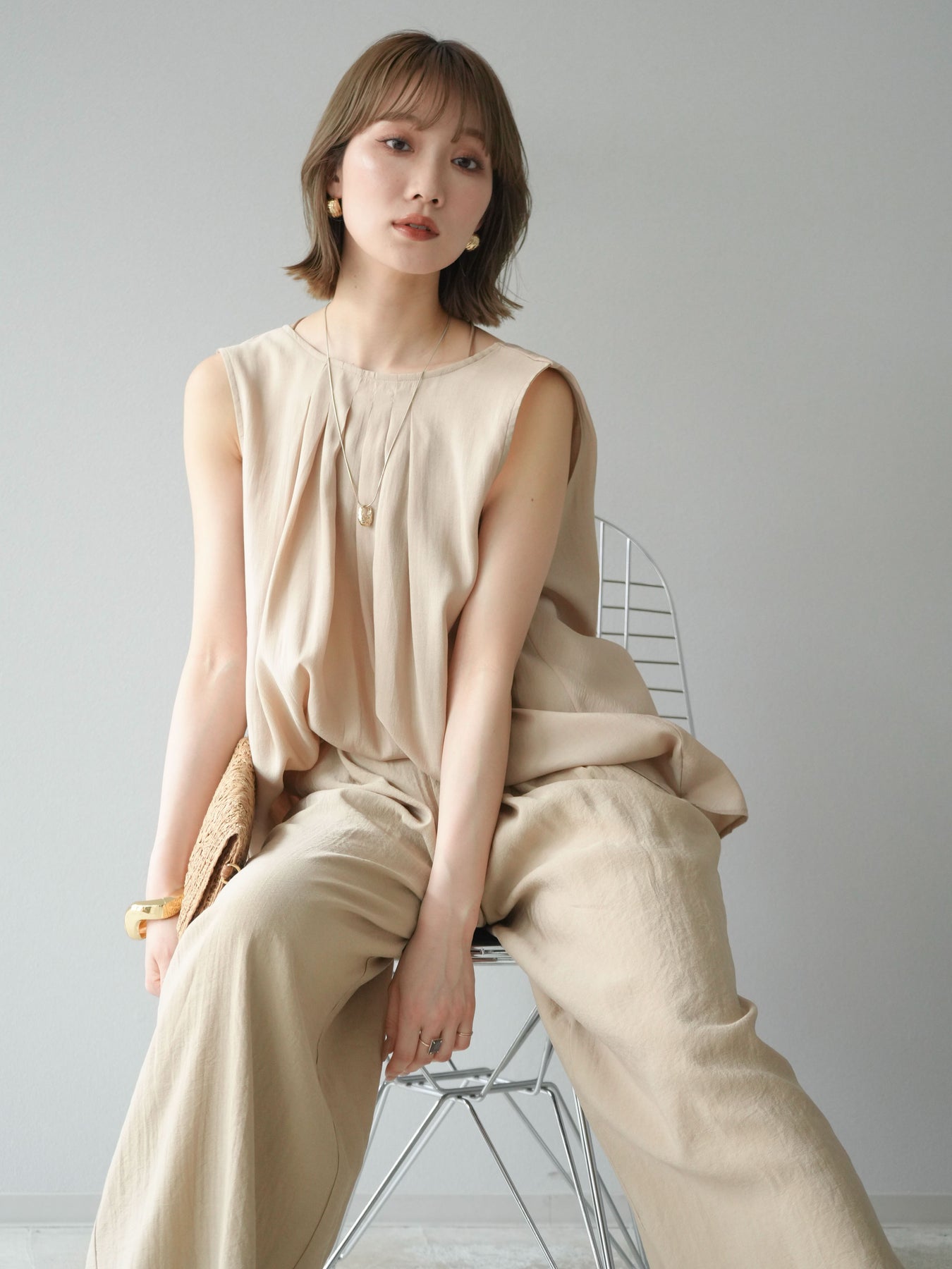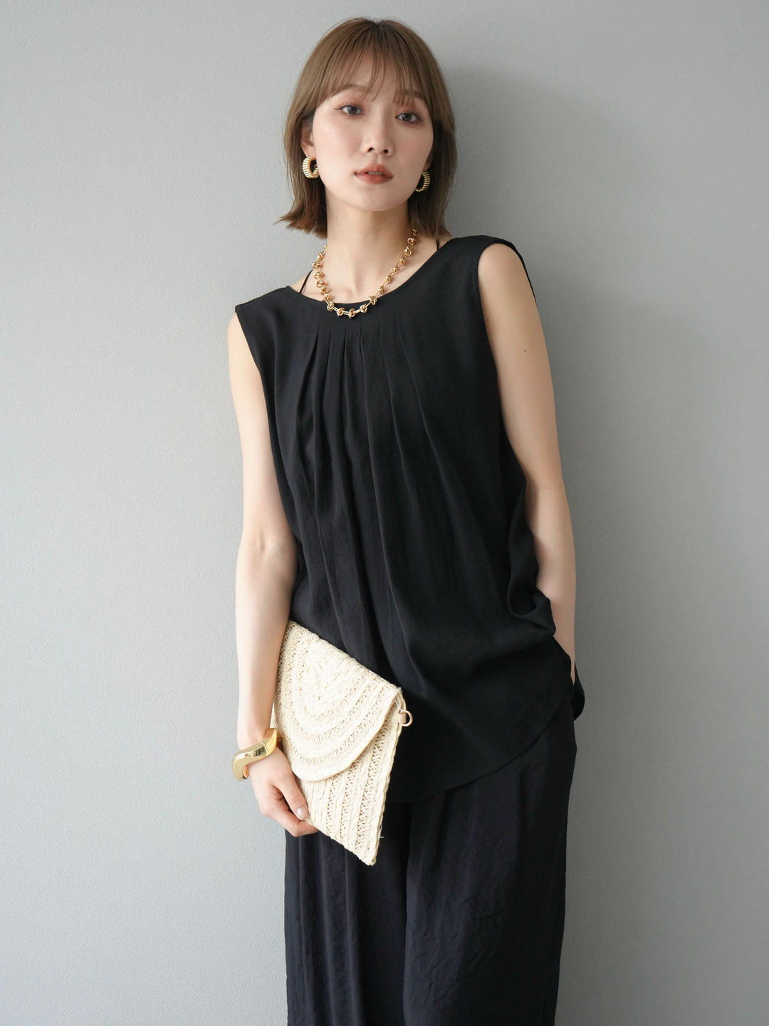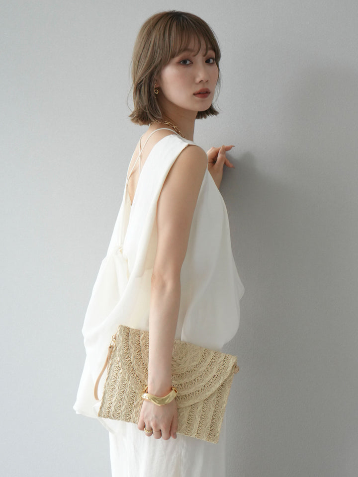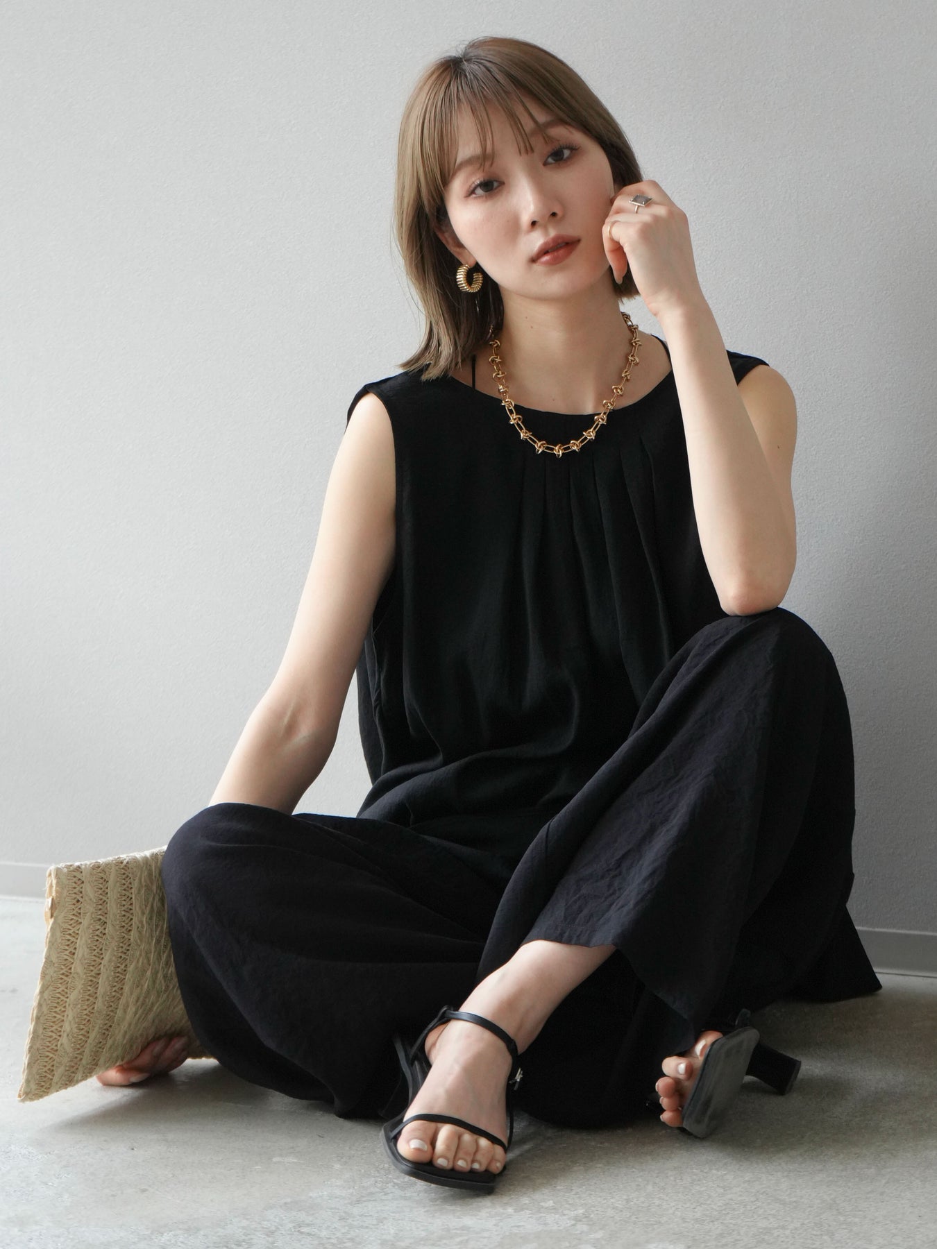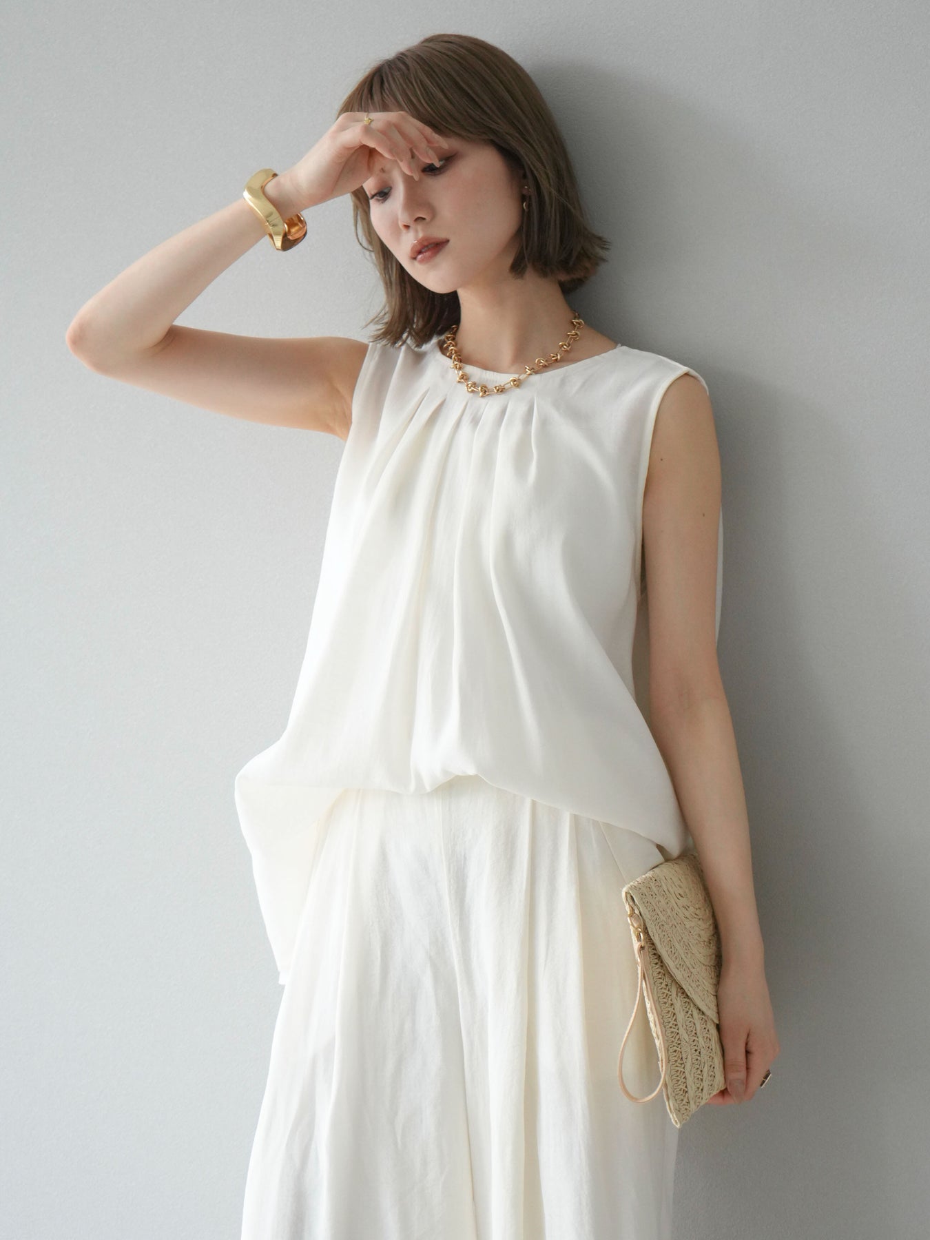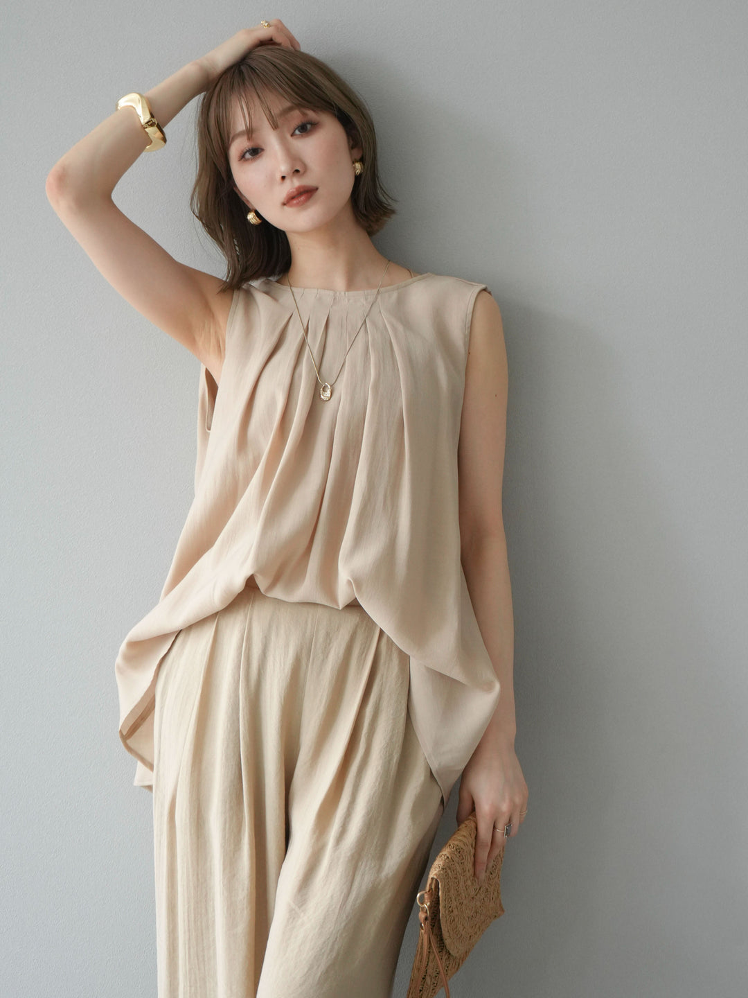 [SET]シボ加工バックツイストブラウス+ダブルストラップカットリブブラキャミソール+シボ加工イージーワイドパンツ(3set)