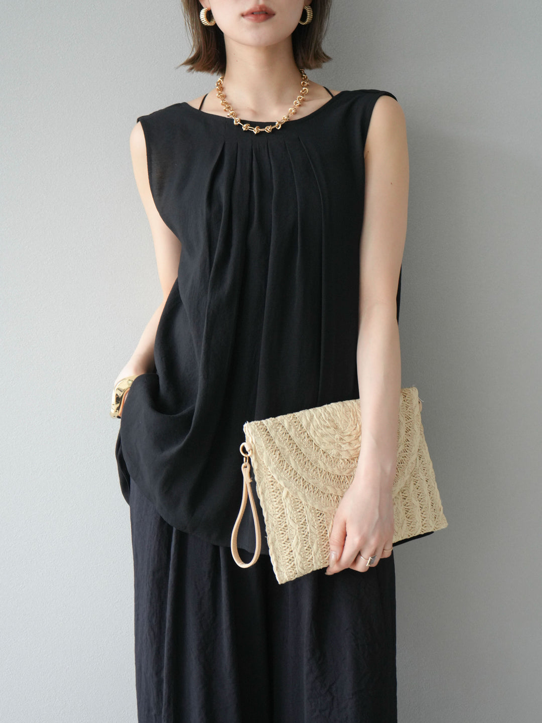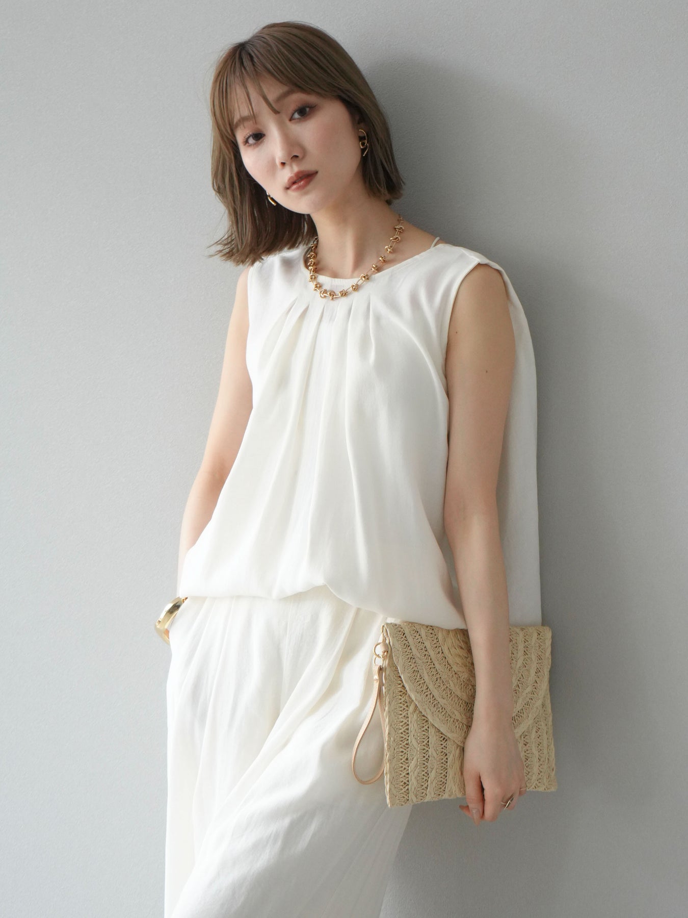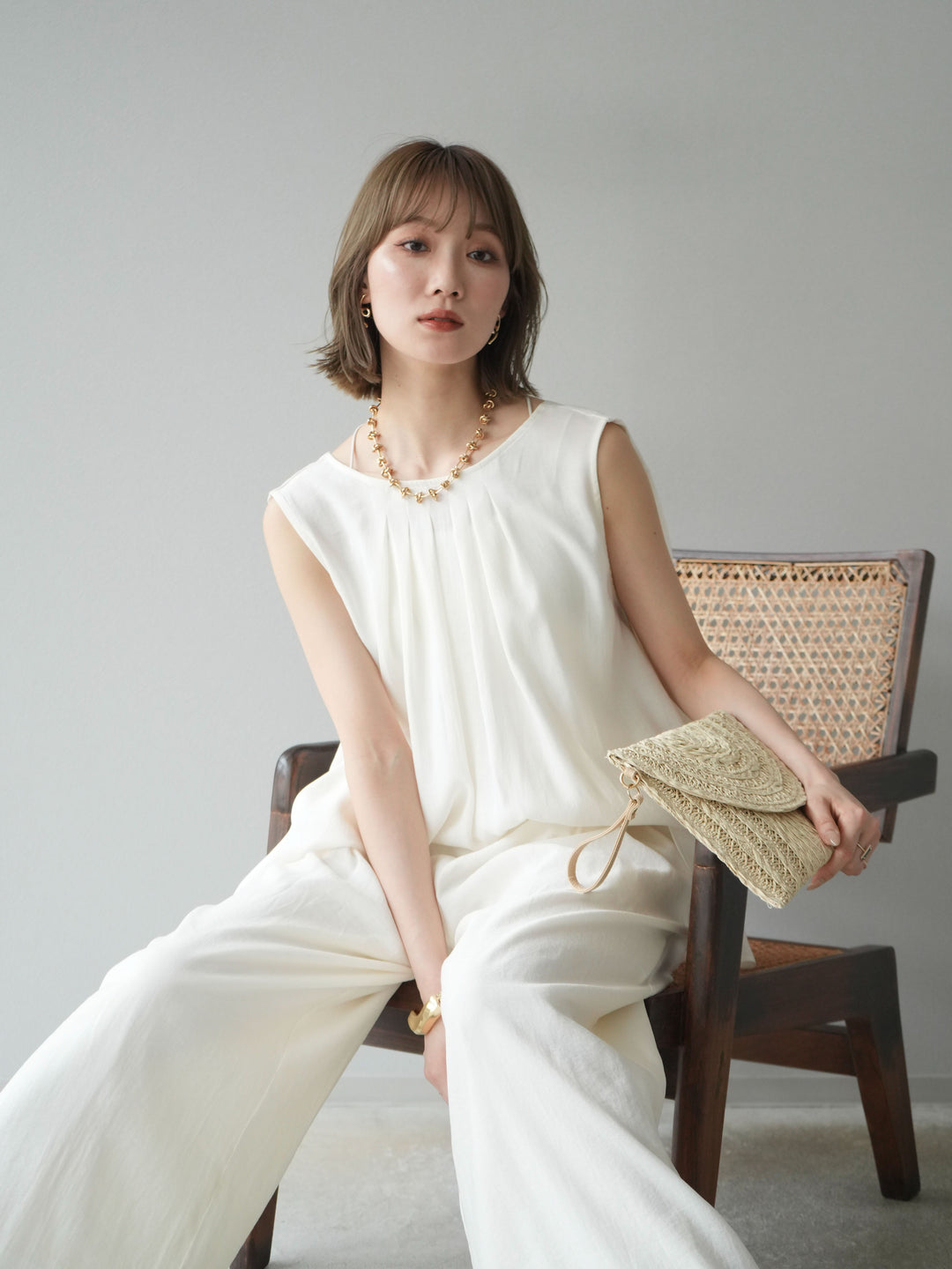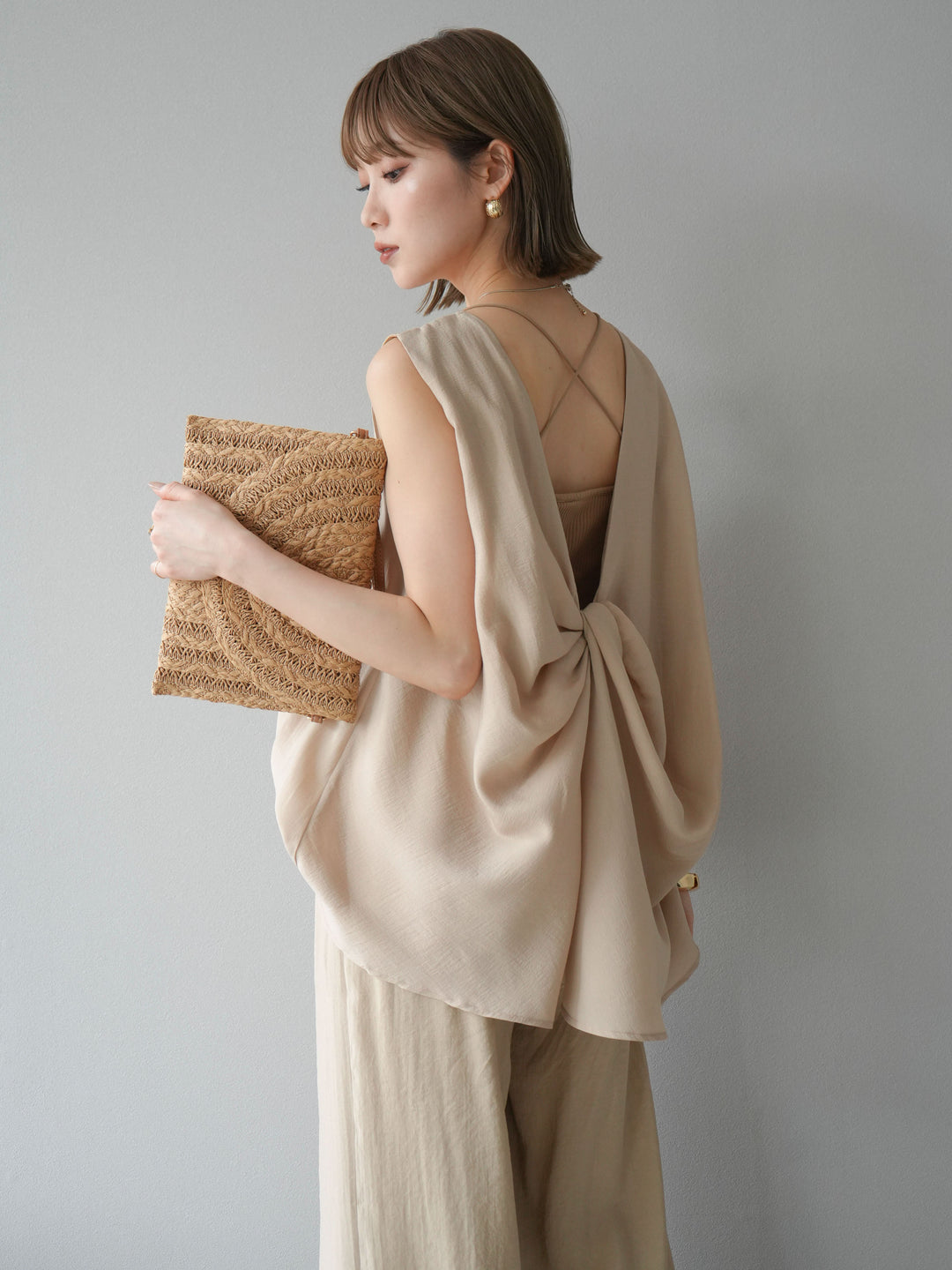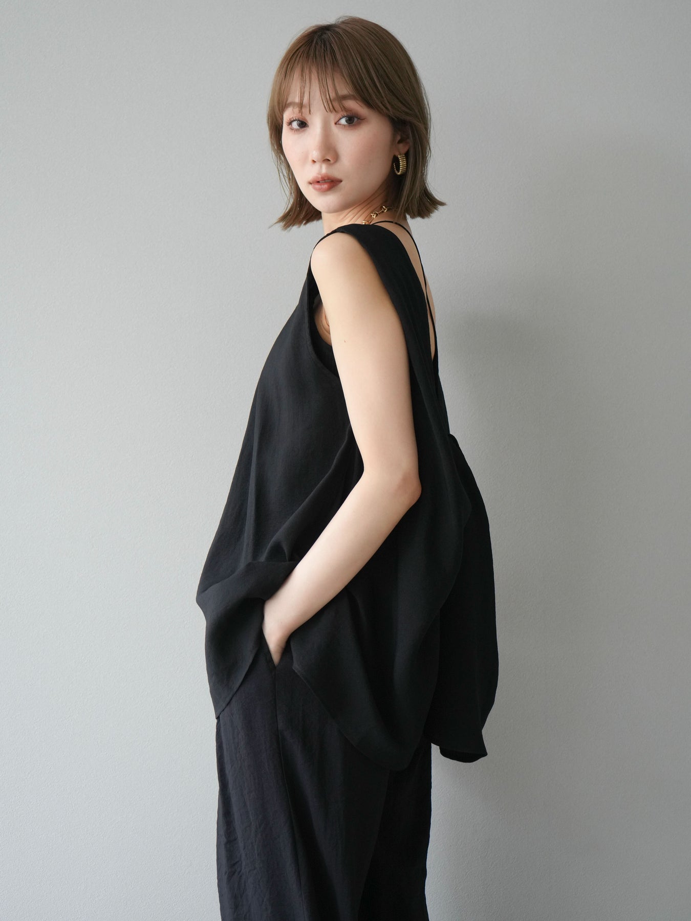 [SET]シボ加工バックツイストブラウス+ダブルストラップカットリブブラキャミソール+シボ加工イージーワイドパンツ(3set)