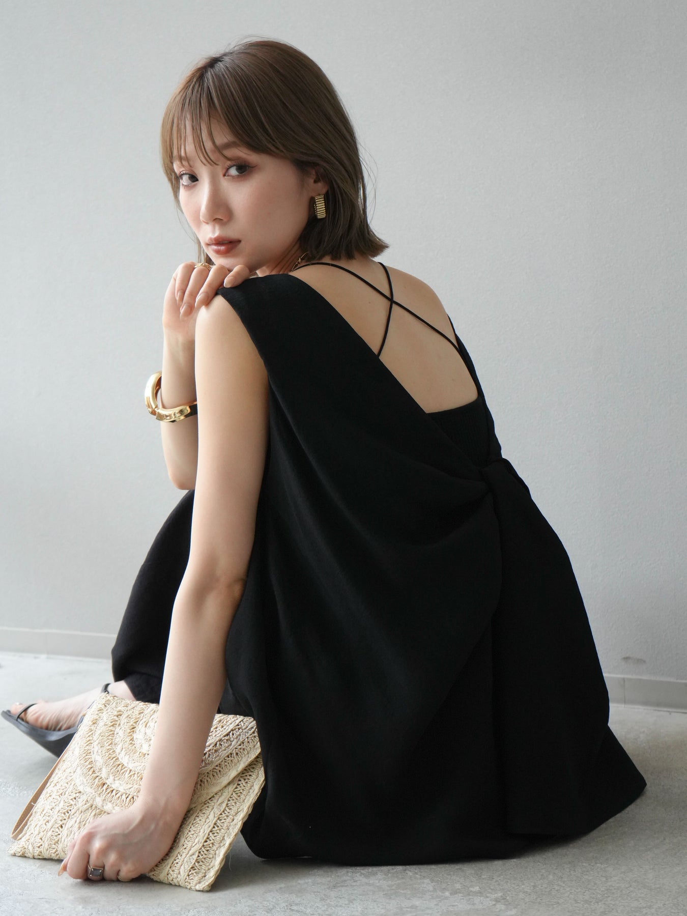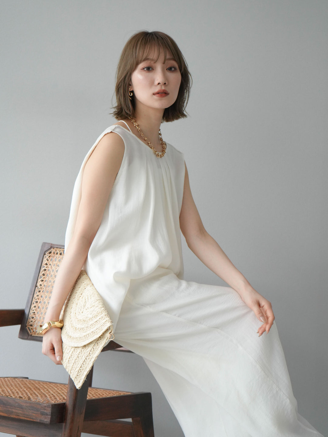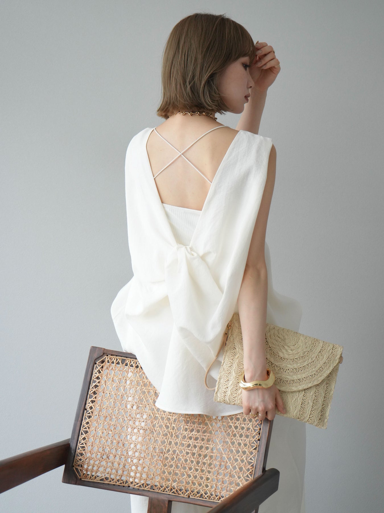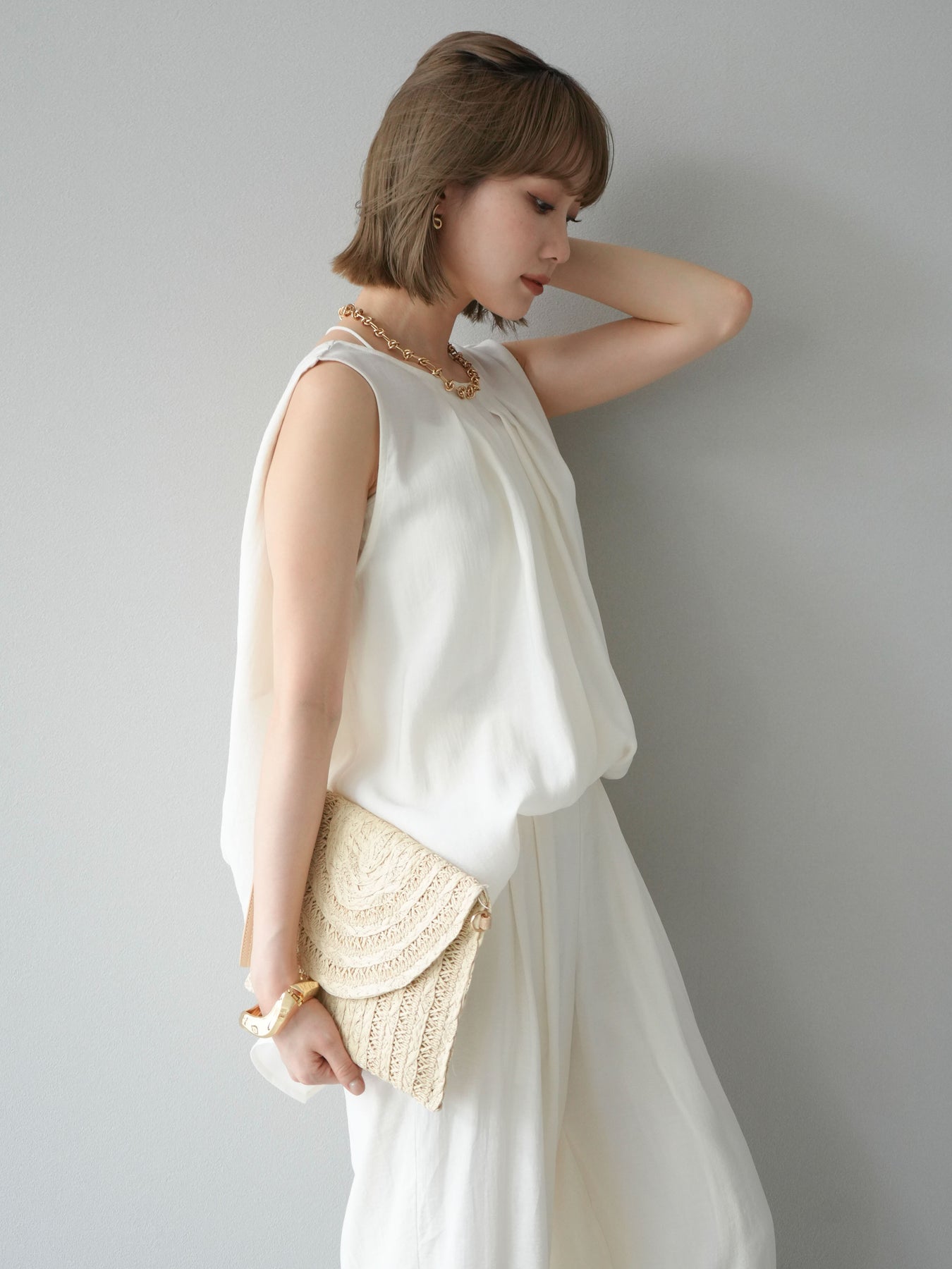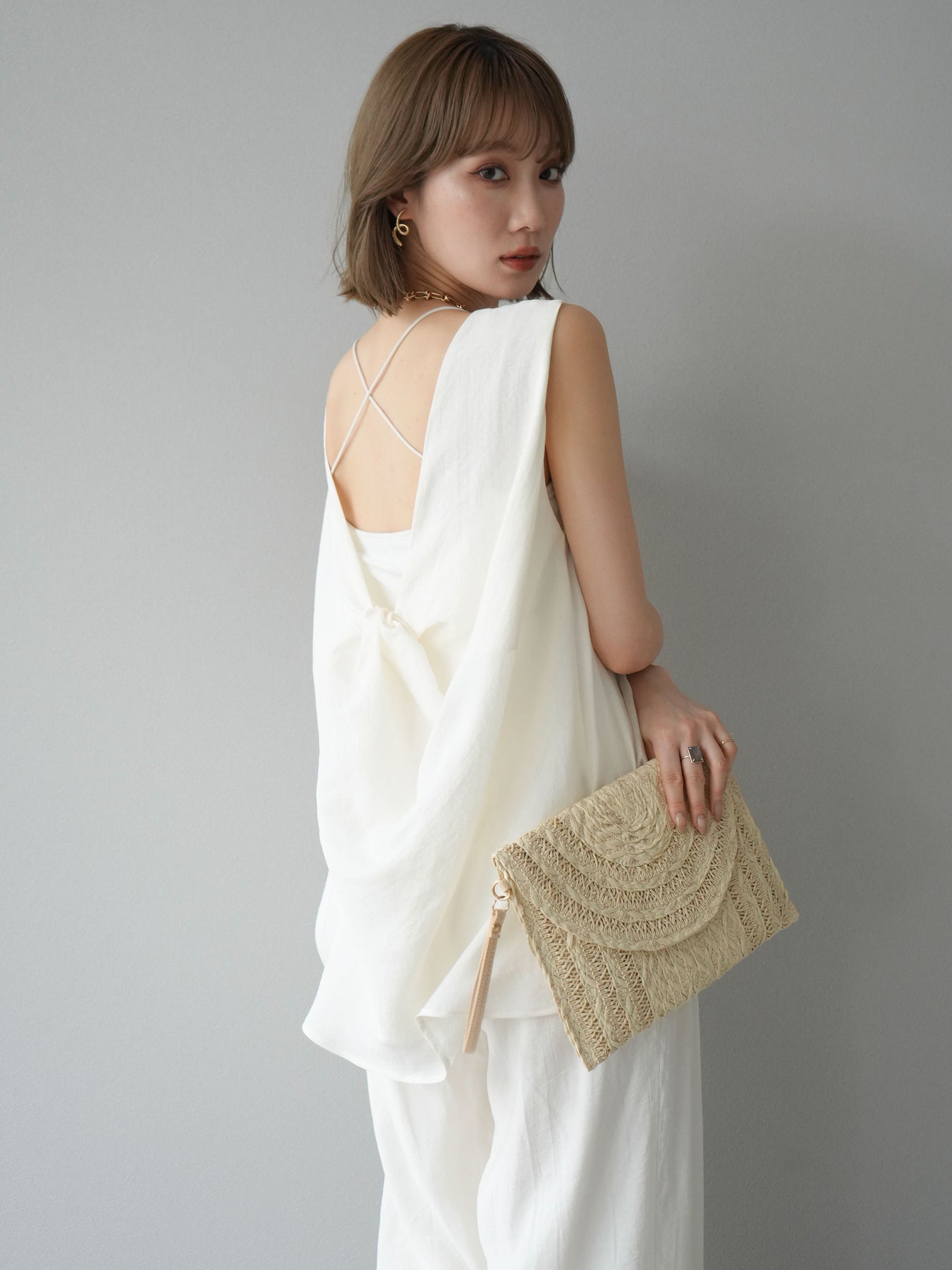 [SET]シボ加工バックツイストブラウス+ダブルストラップカットリブブラキャミソール+シボ加工イージーワイドパンツ(3set)