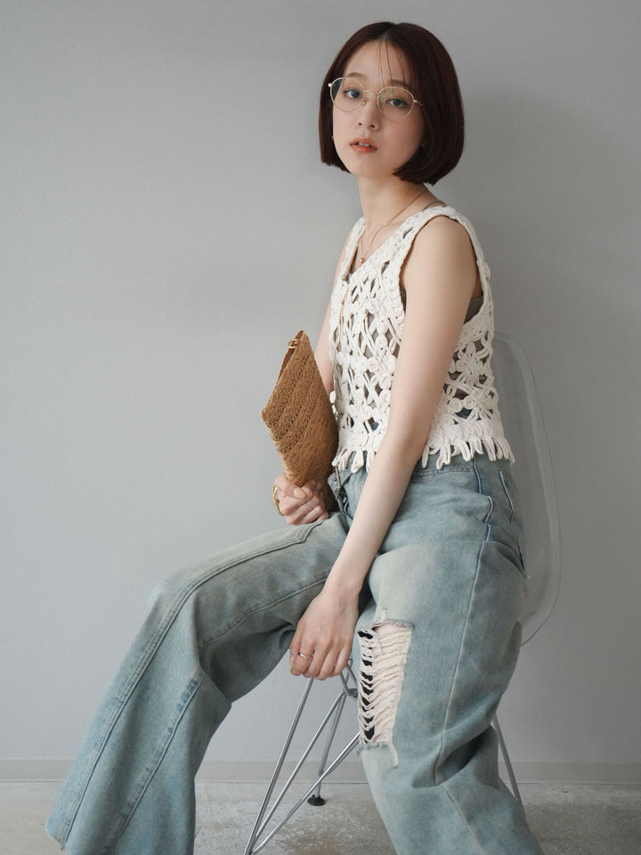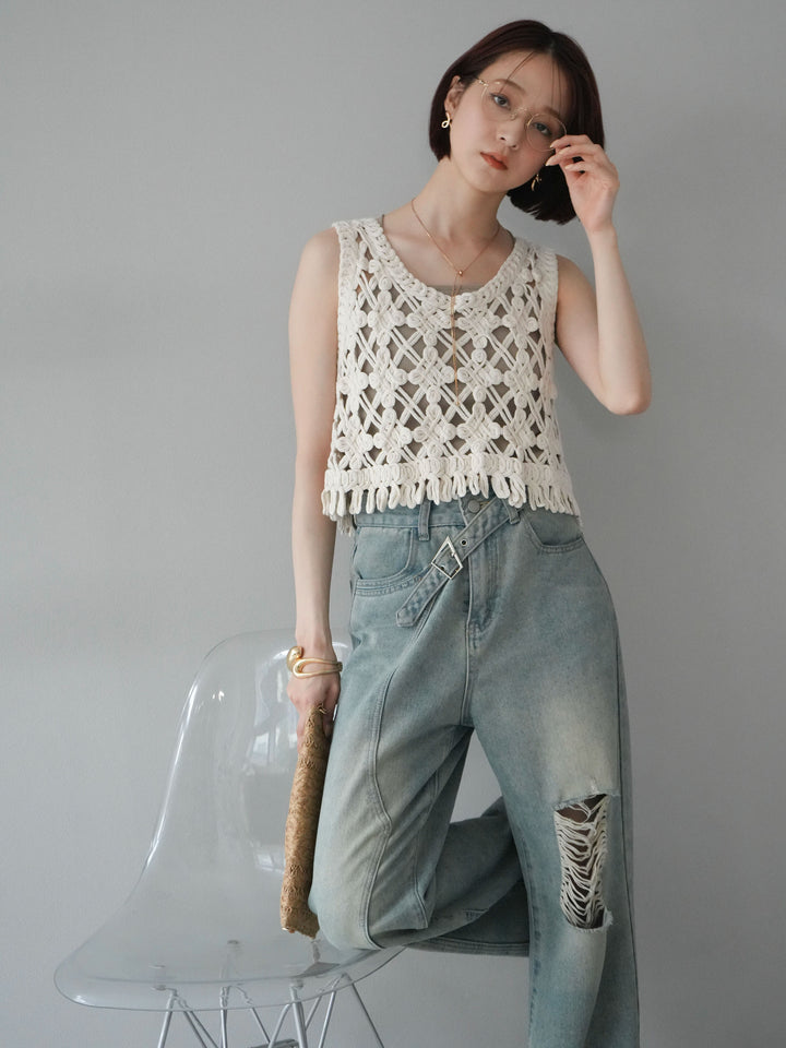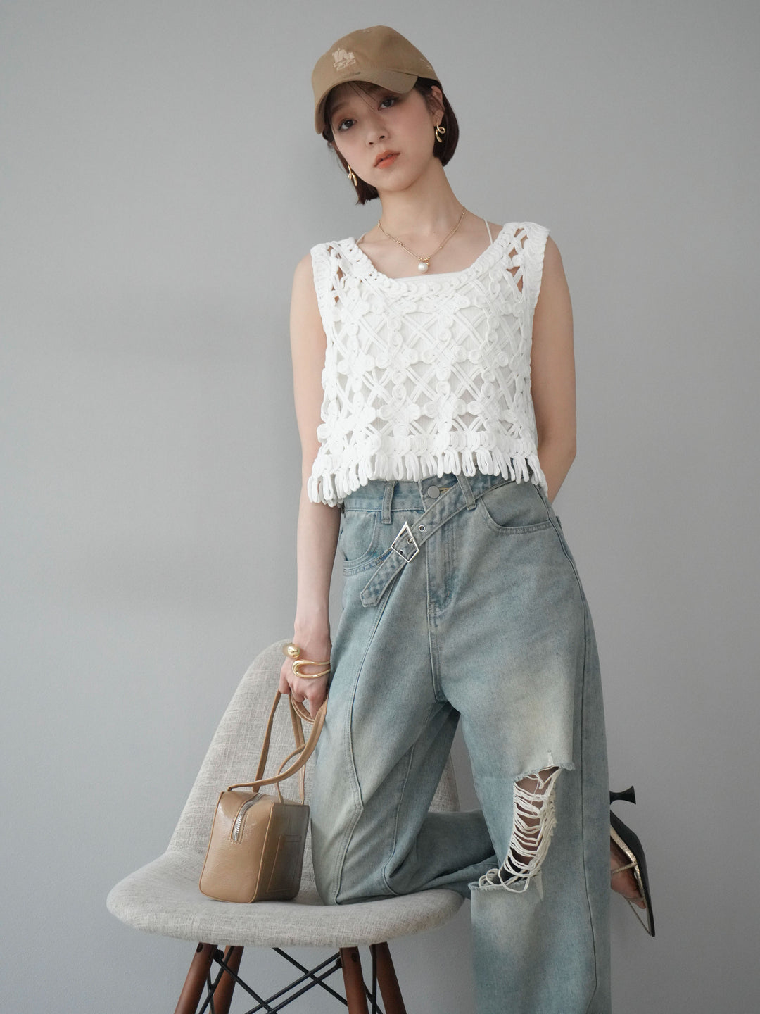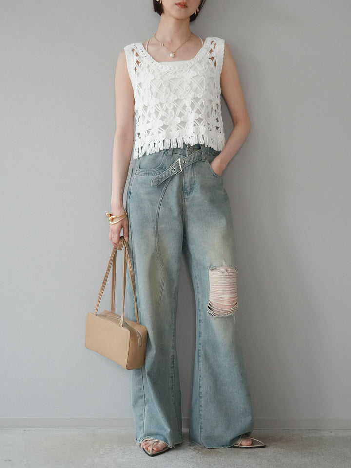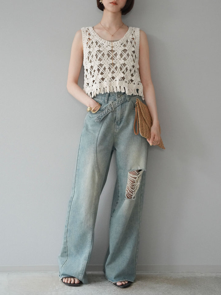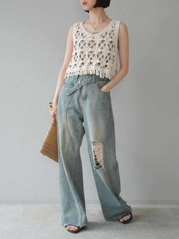 [SET]クロシェ編みフリンジベスト+ベルトアシンメトリーダメージデニム(2set)