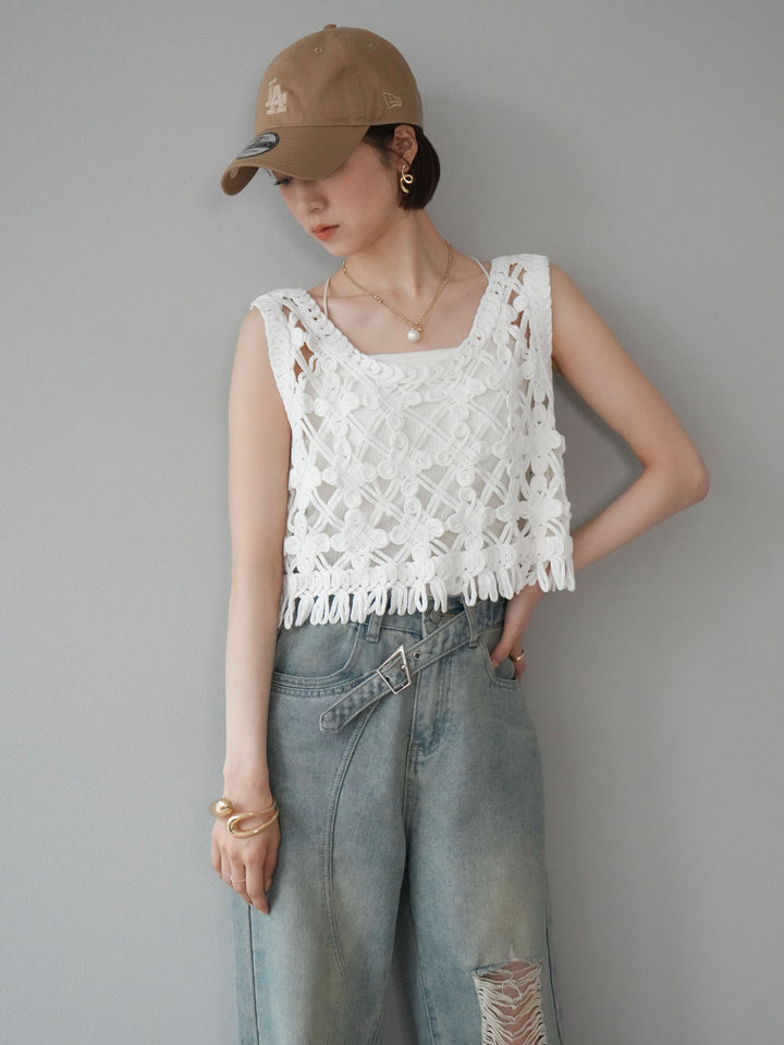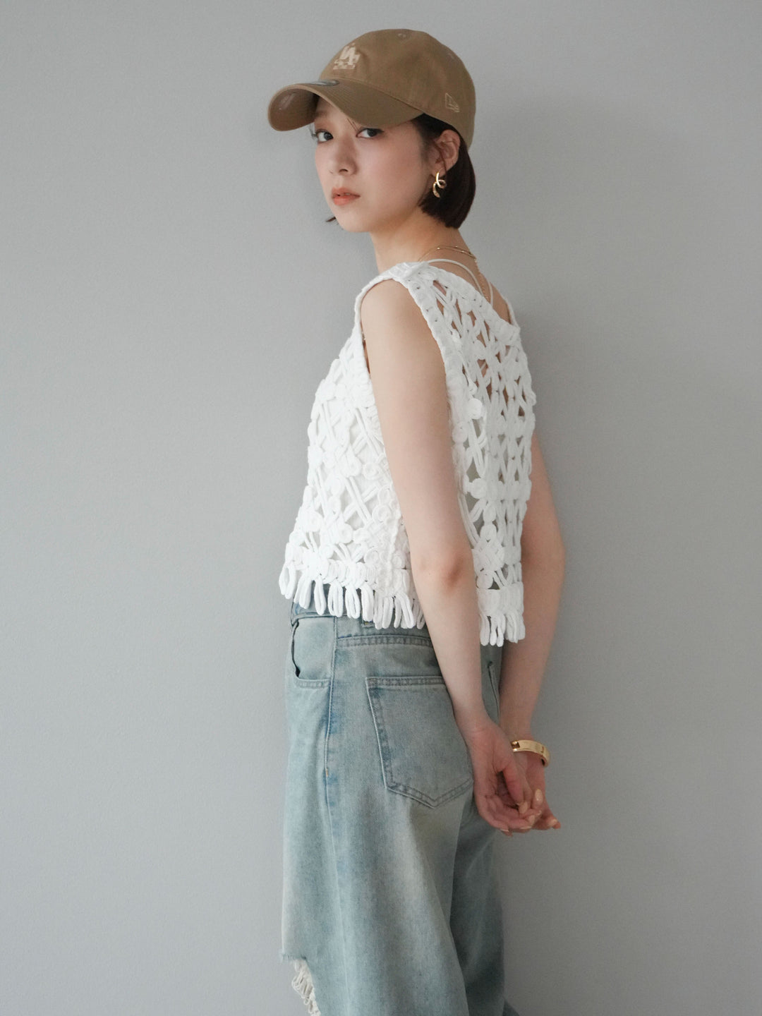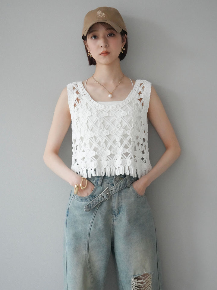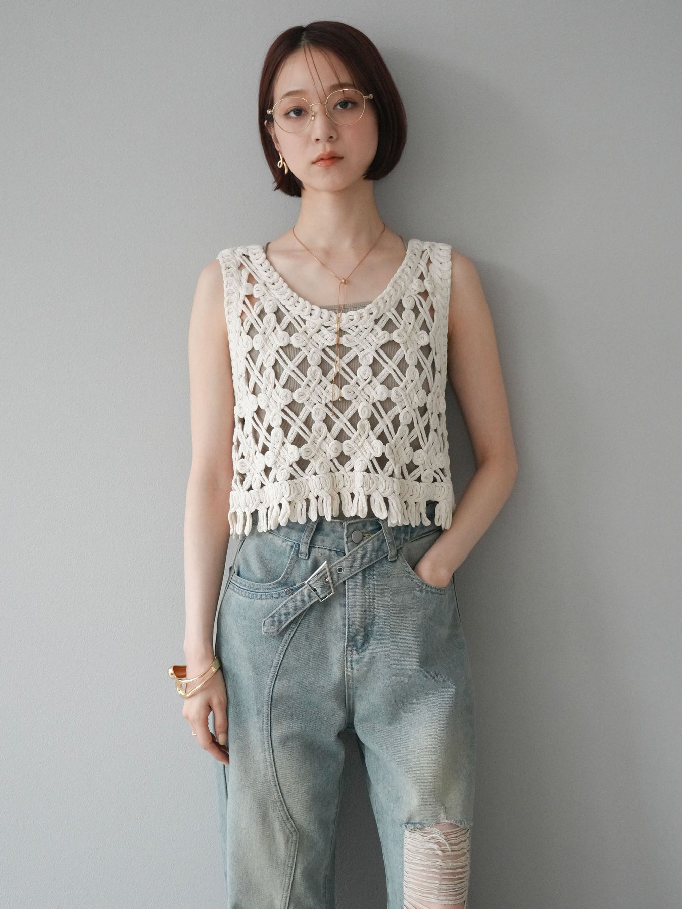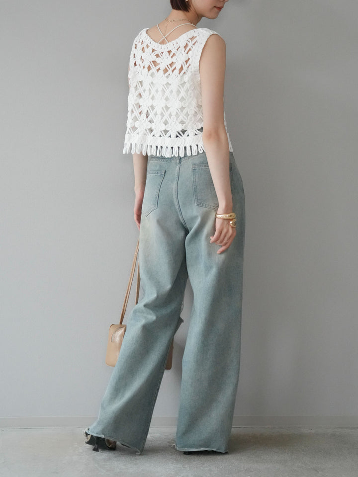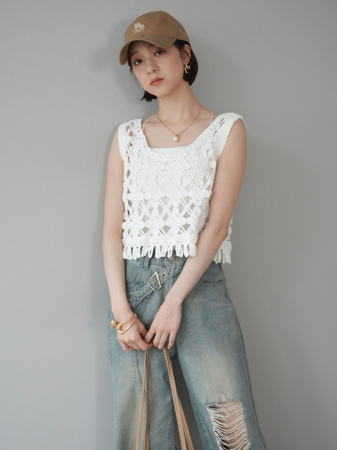 [SET]クロシェ編みフリンジベスト+ベルトアシンメトリーダメージデニム(2set)