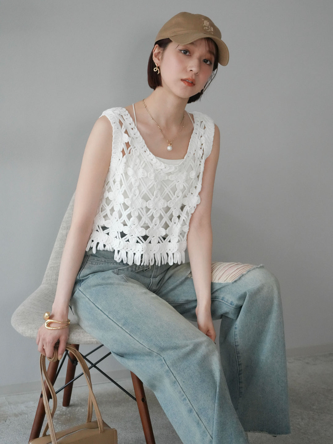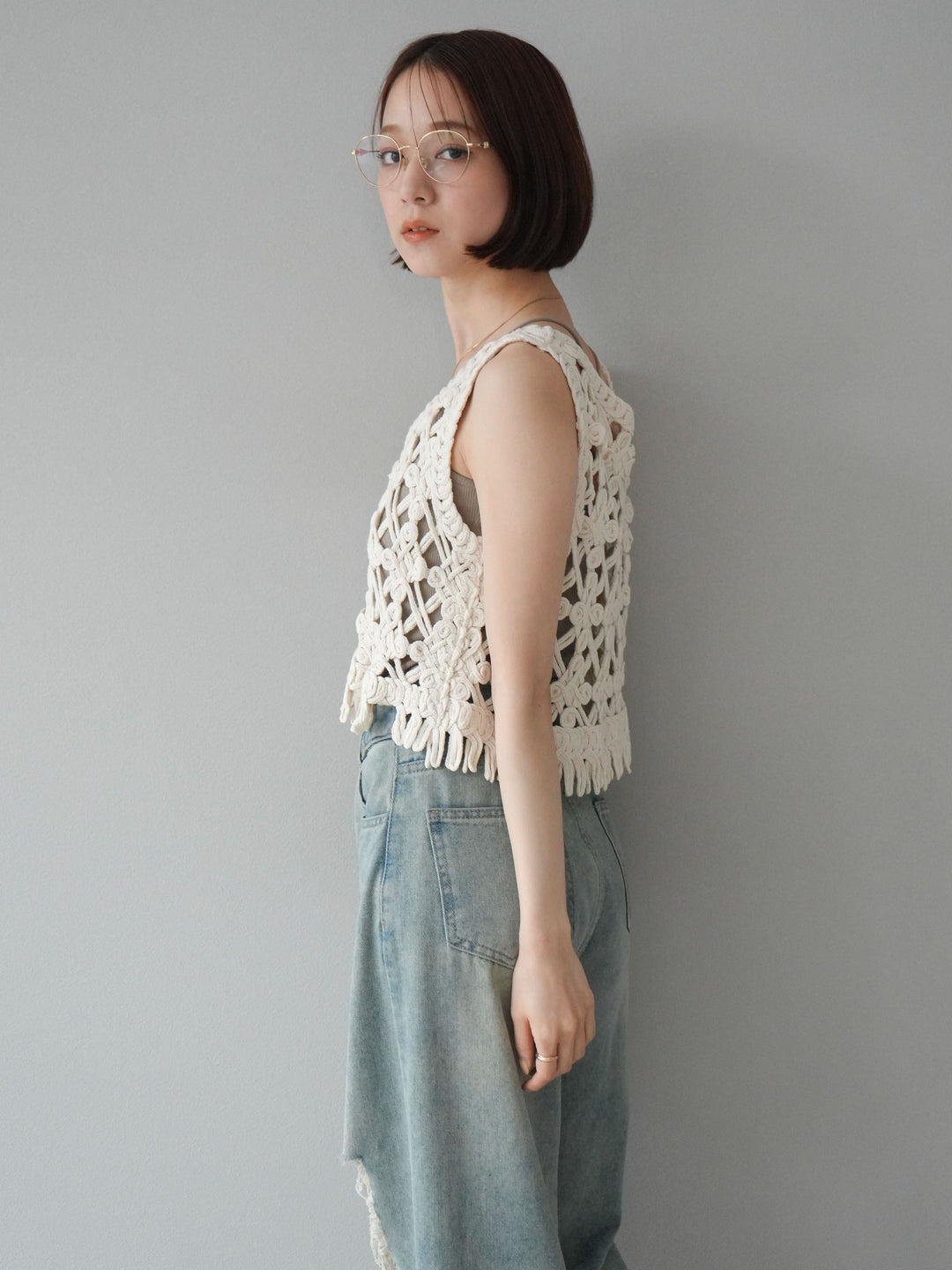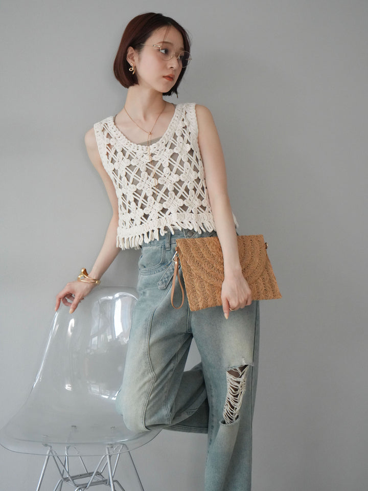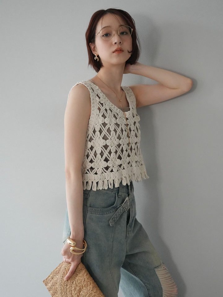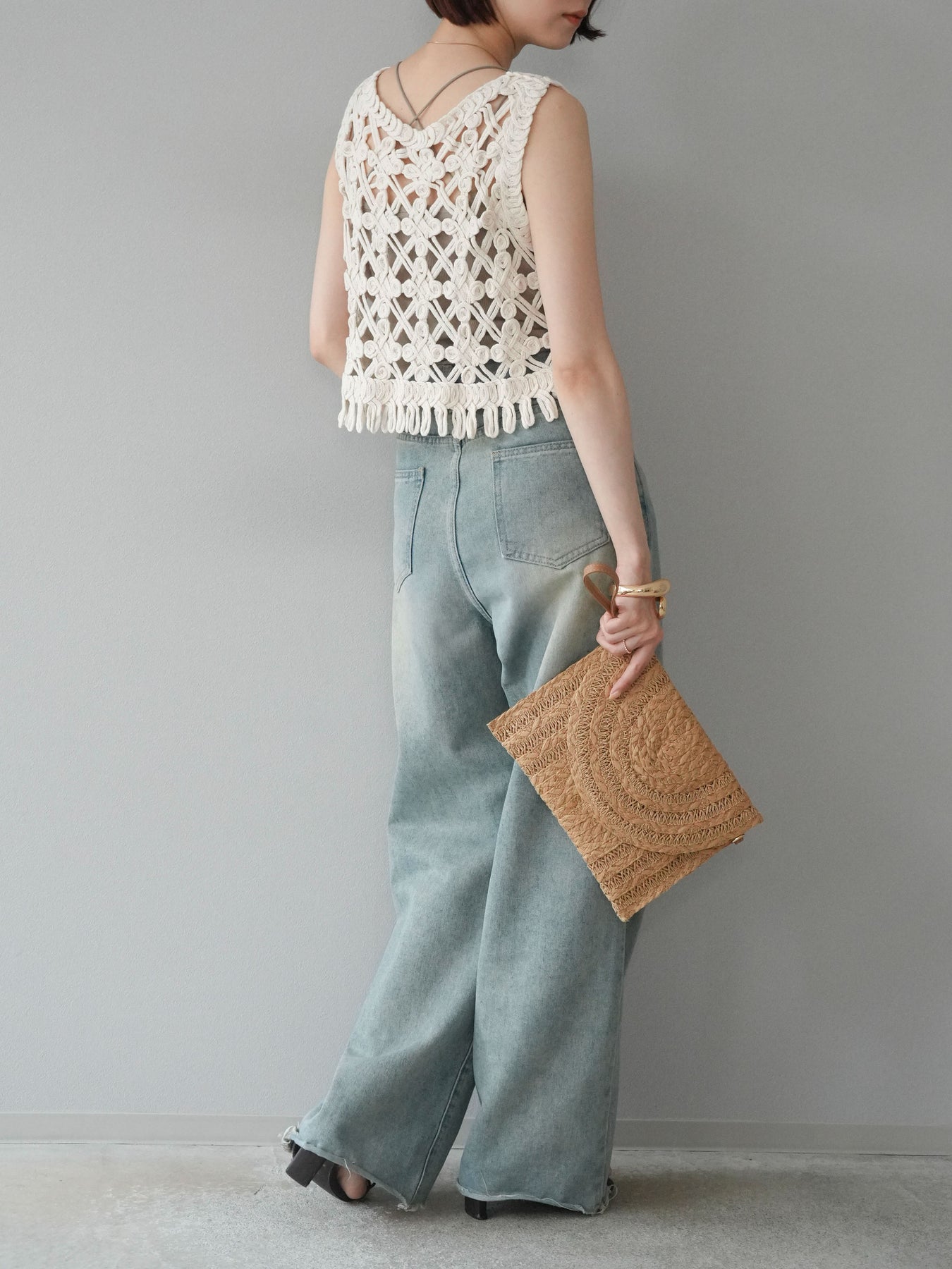 [SET]クロシェ編みフリンジベスト+ベルトアシンメトリーダメージデニム(2set)