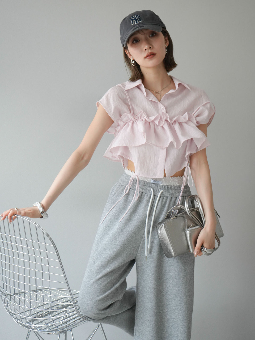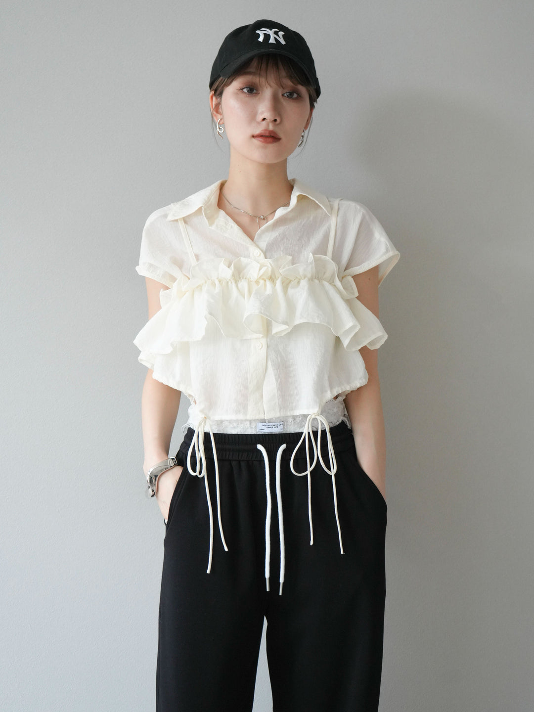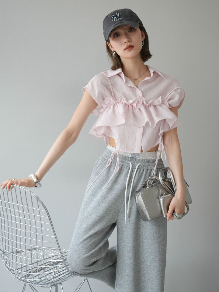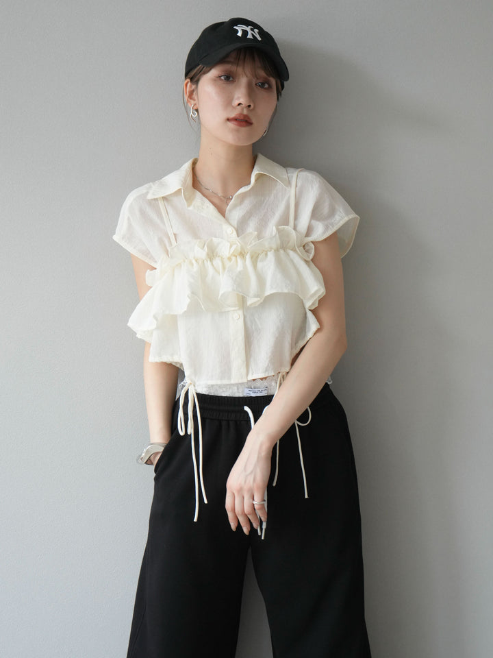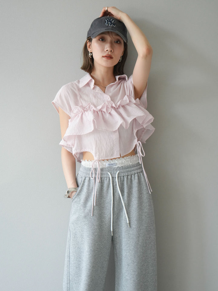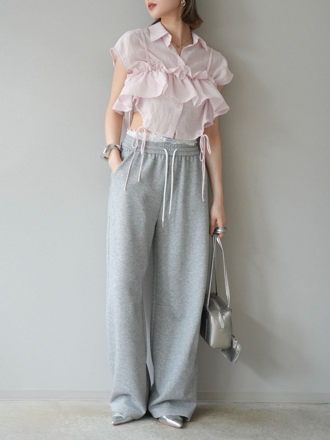 [SET]レーヨンデザインシャツビスチェアンサンブル+レースレイヤードスウェットパンツ(2set)