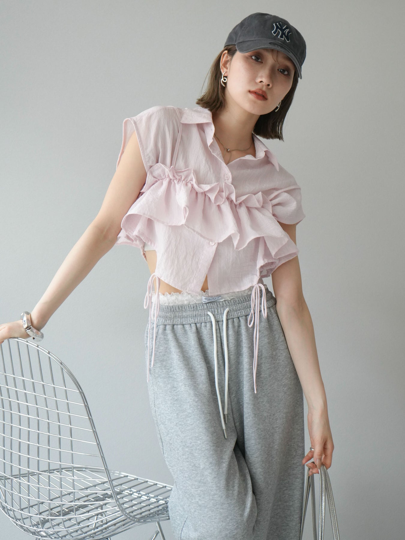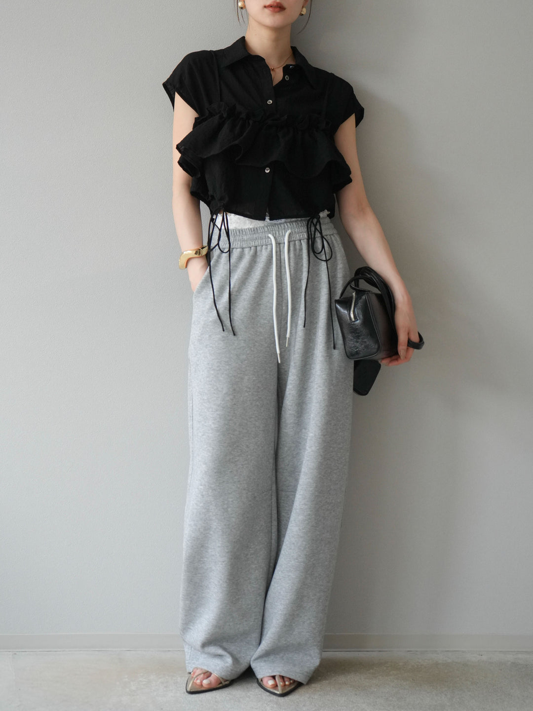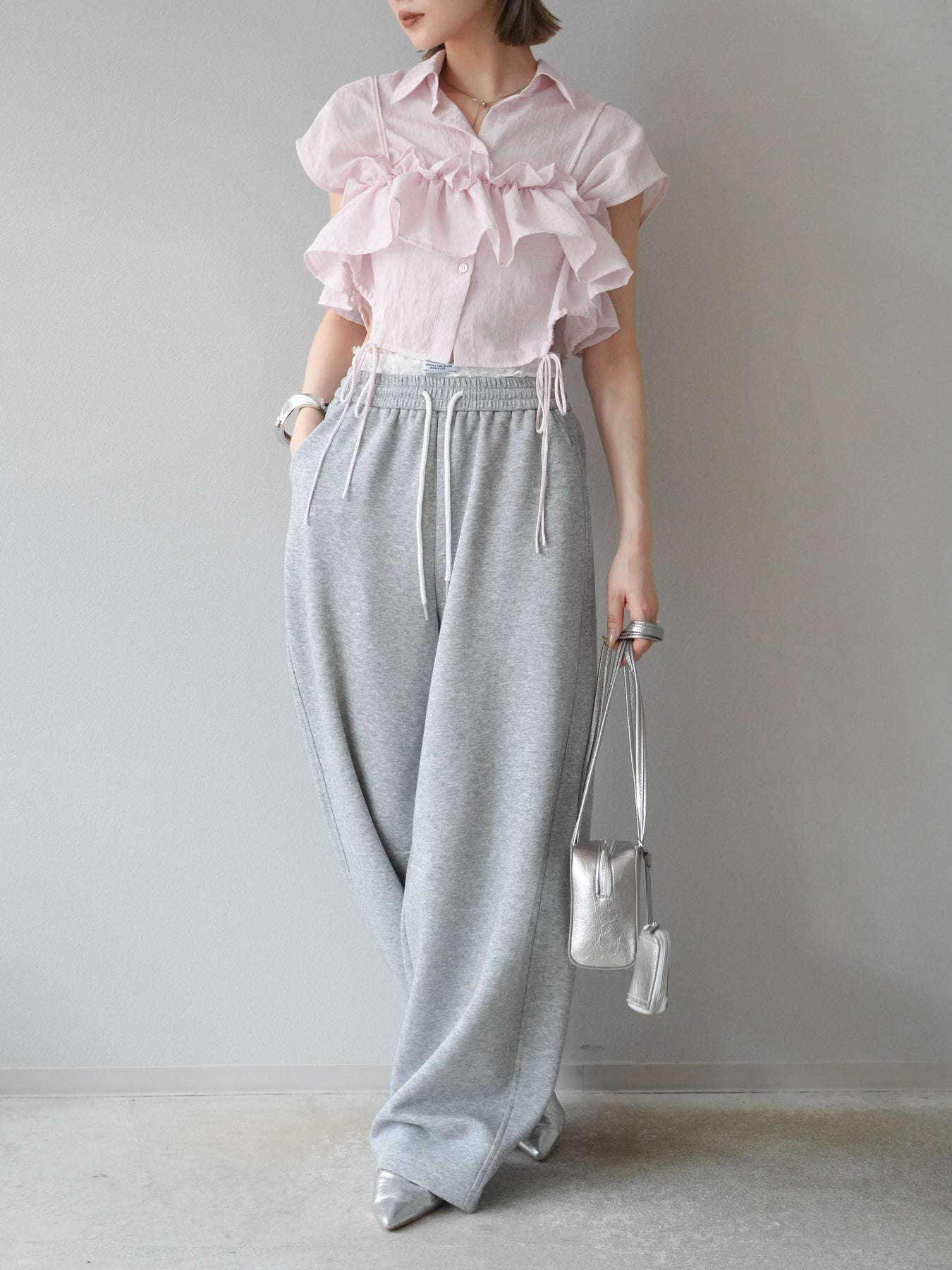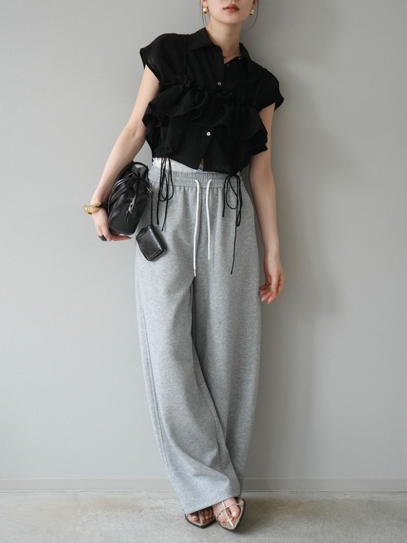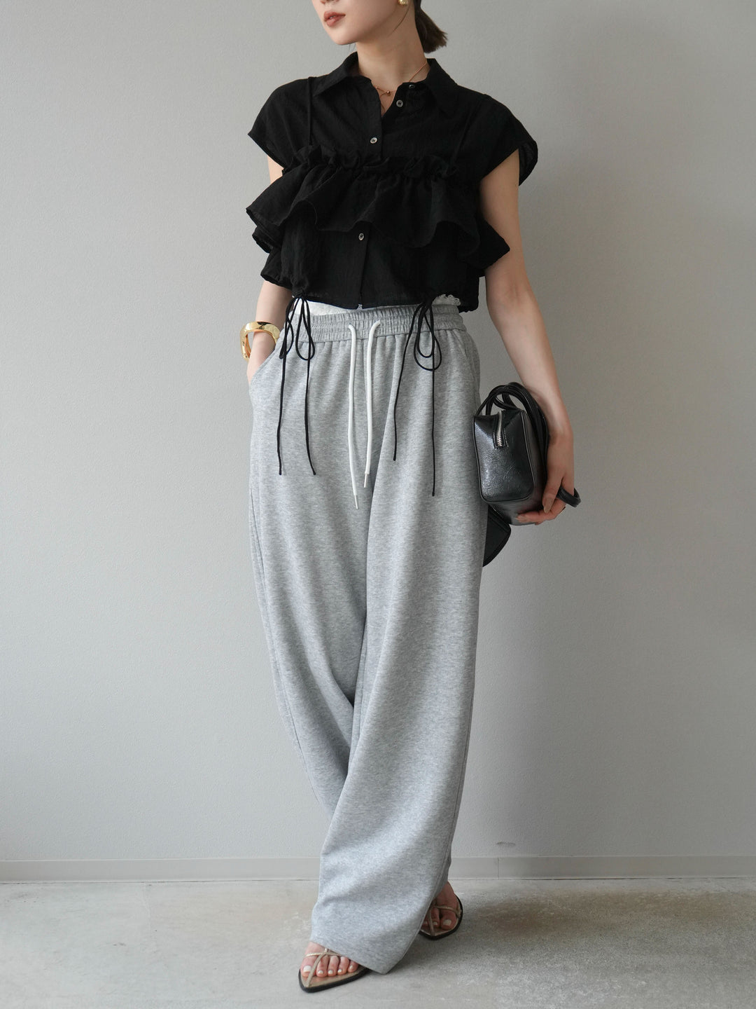 [SET]レーヨンデザインシャツビスチェアンサンブル+レースレイヤードスウェットパンツ(2set)