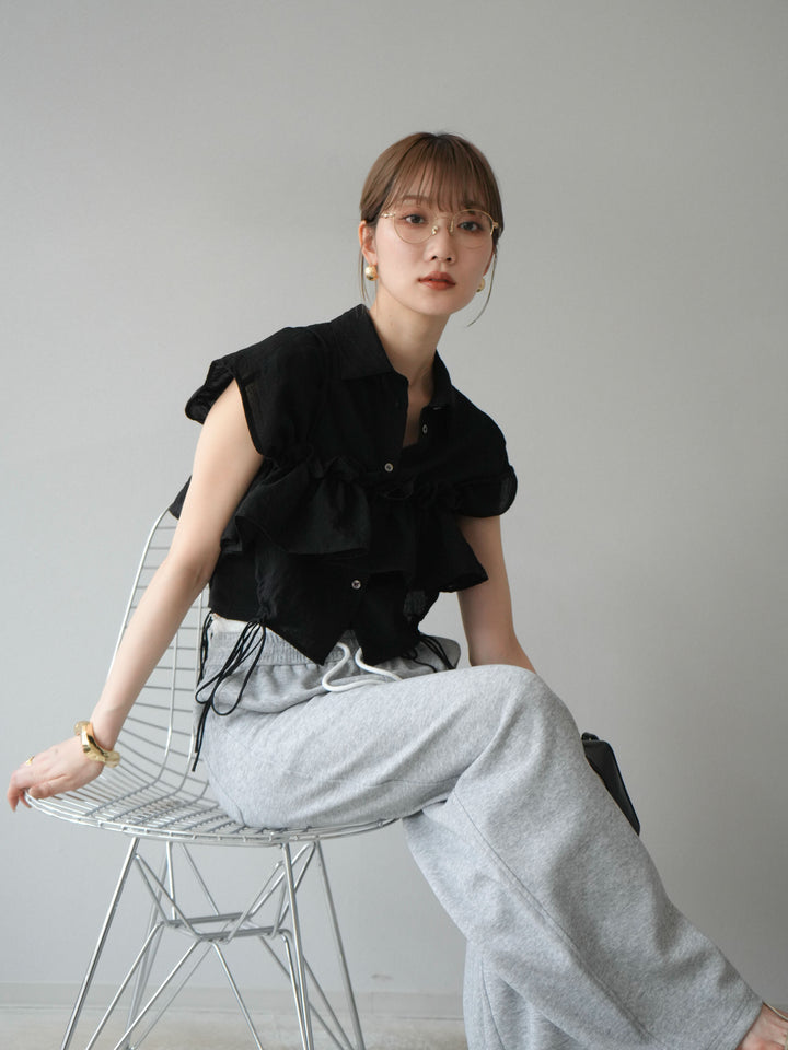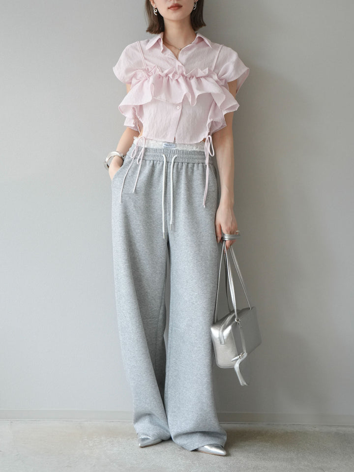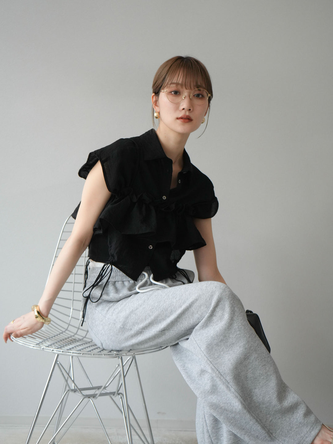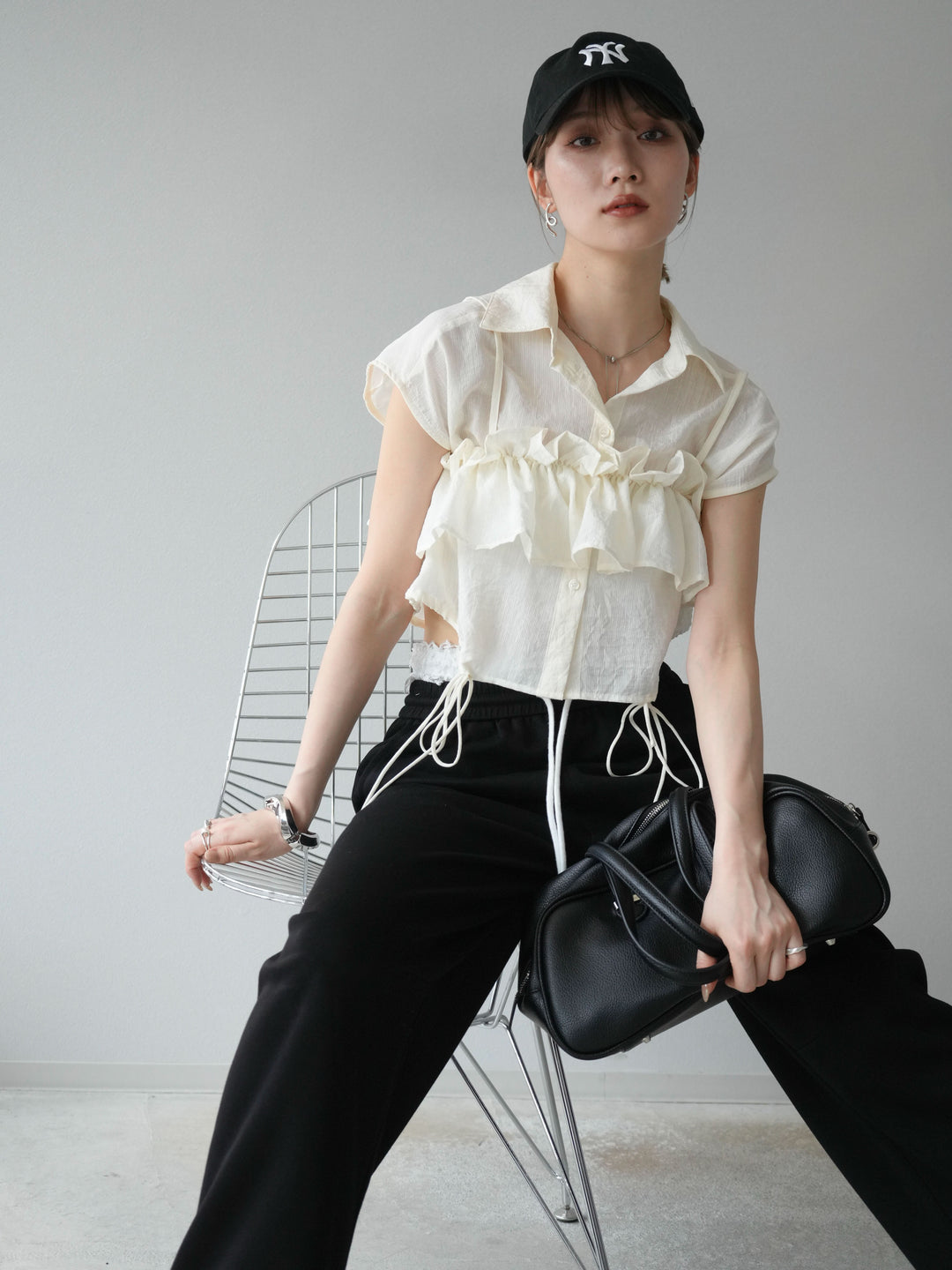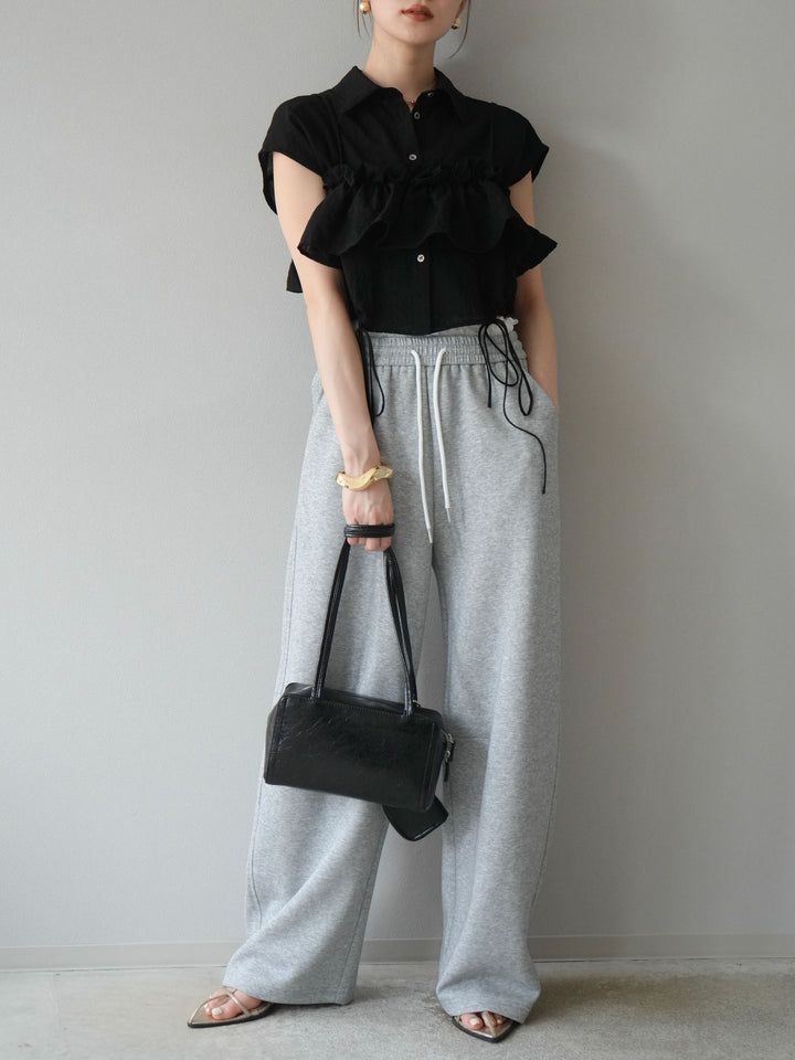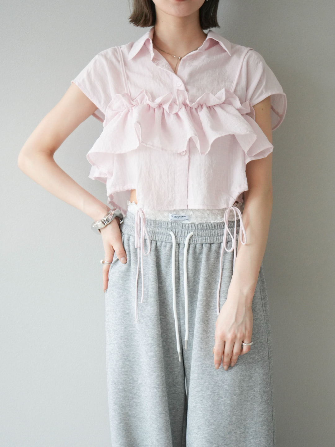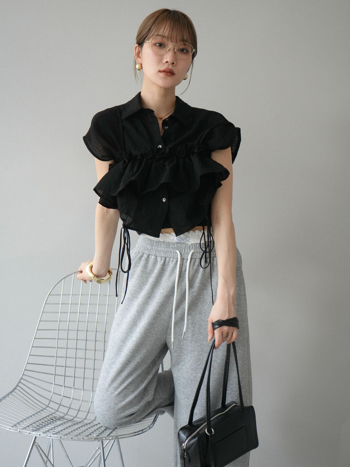 [SET]レーヨンデザインシャツビスチェアンサンブル+レースレイヤードスウェットパンツ(2set)