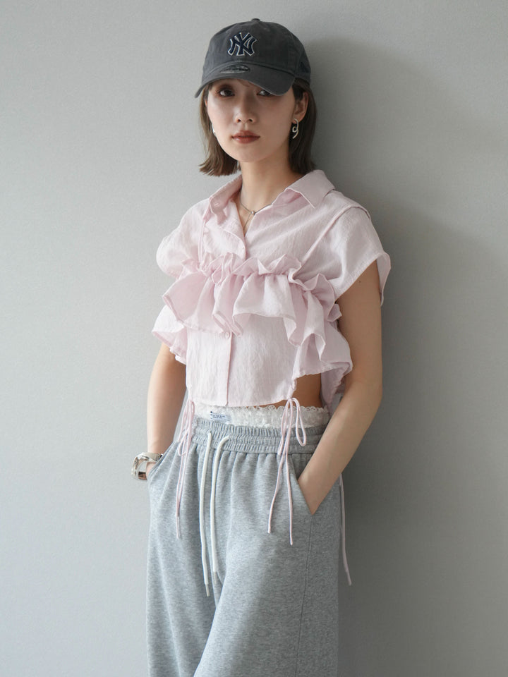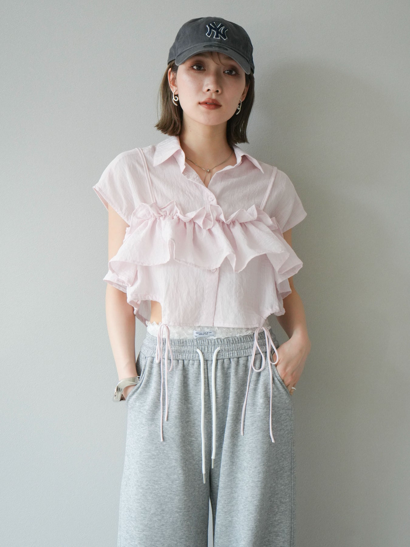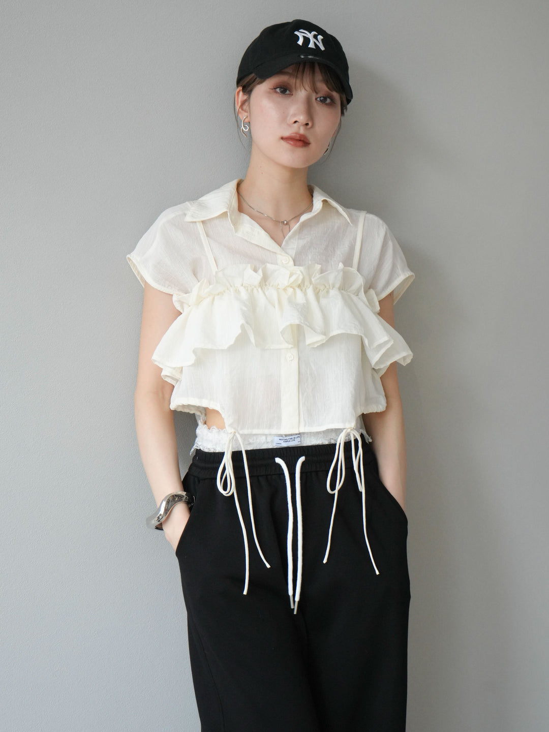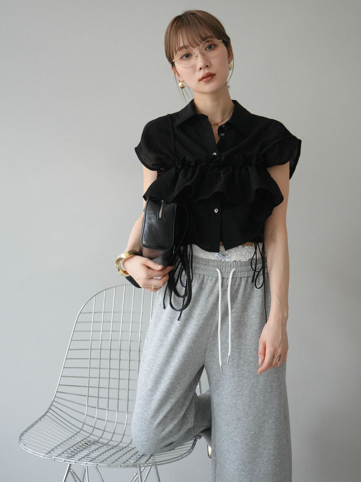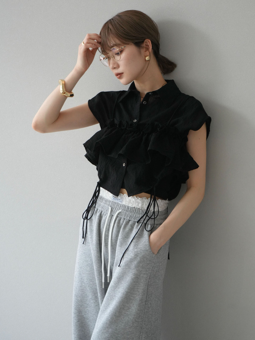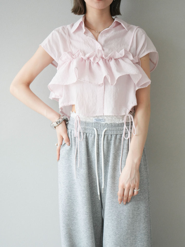 [SET]レーヨンデザインシャツビスチェアンサンブル+レースレイヤードスウェットパンツ(2set)