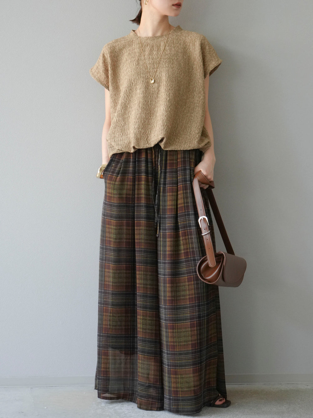 リネン風の素材感で軽やかさとナチュラルな雰囲気を楽しめるダブルタックデザインのワイドパンツ。しっかりとしたタックとワイドなシルエットが、スタイルを美しく見せるアイテムです。ウエストはボタンでしっかりとフィットし、リラックスした着心地を提供します。