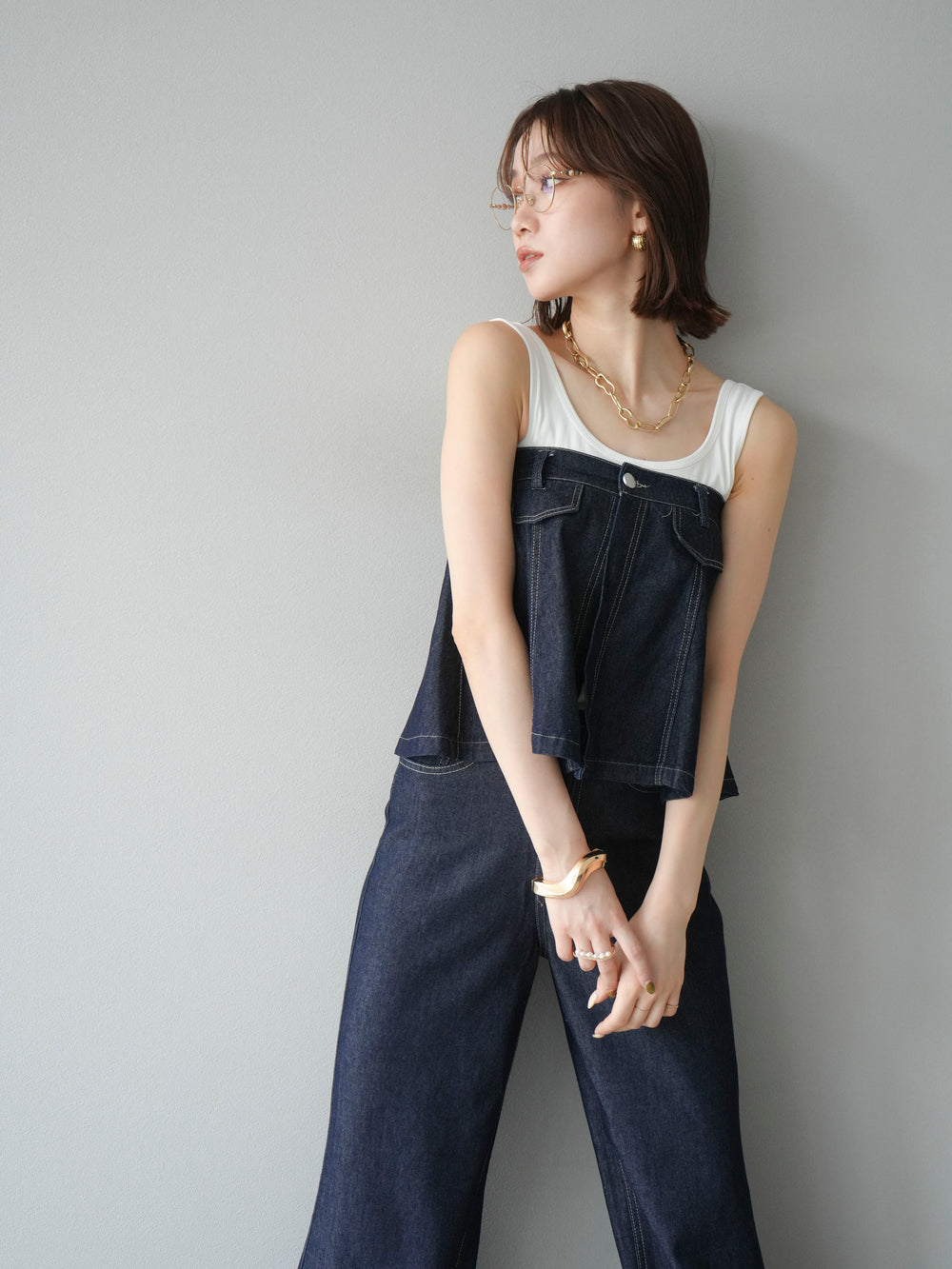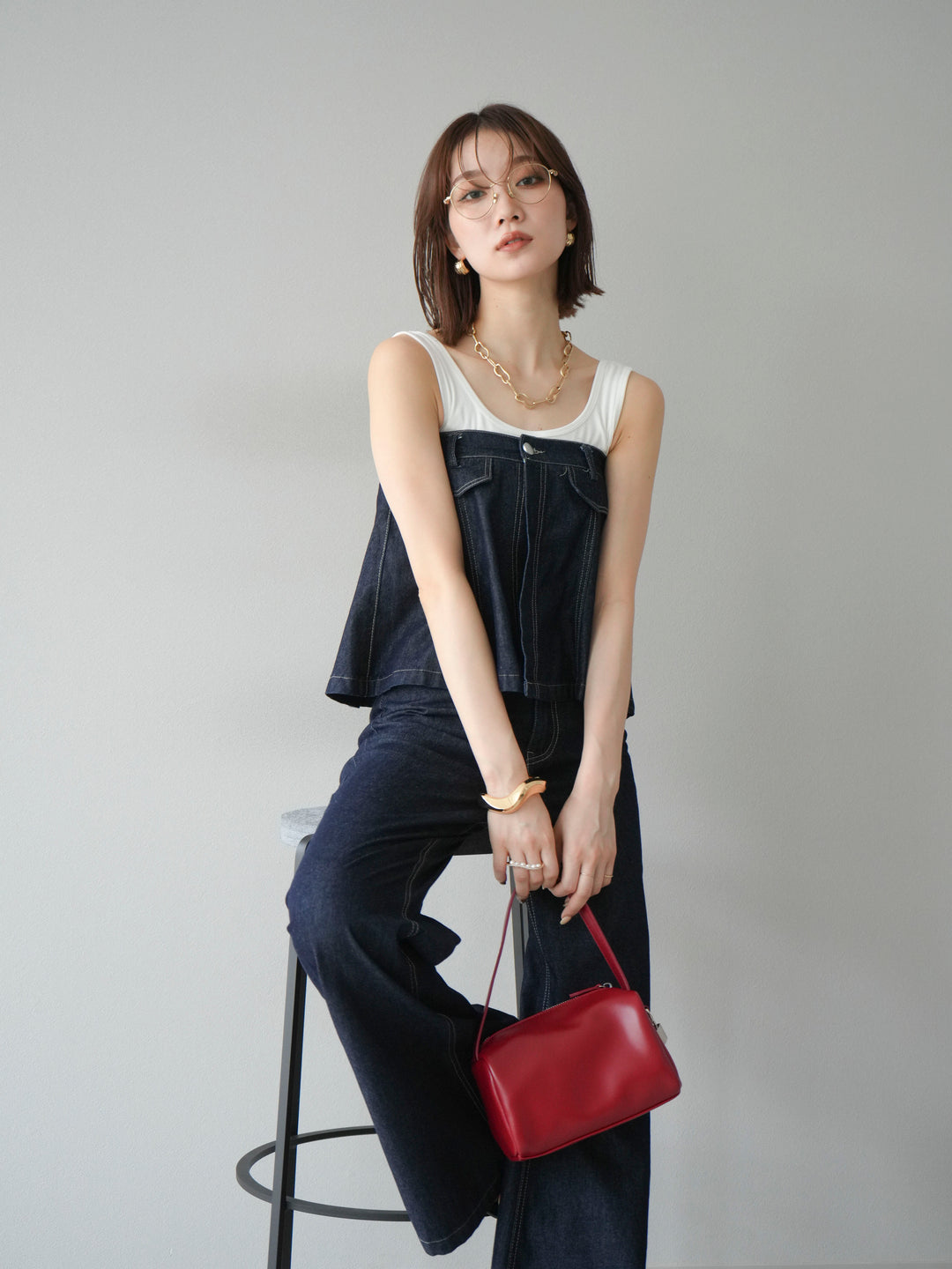 [SET]フェイクレザーノースリーブジャケット+レースキャミミニワンピース+リネンタッチダブルタックワイドパンツ(3set)