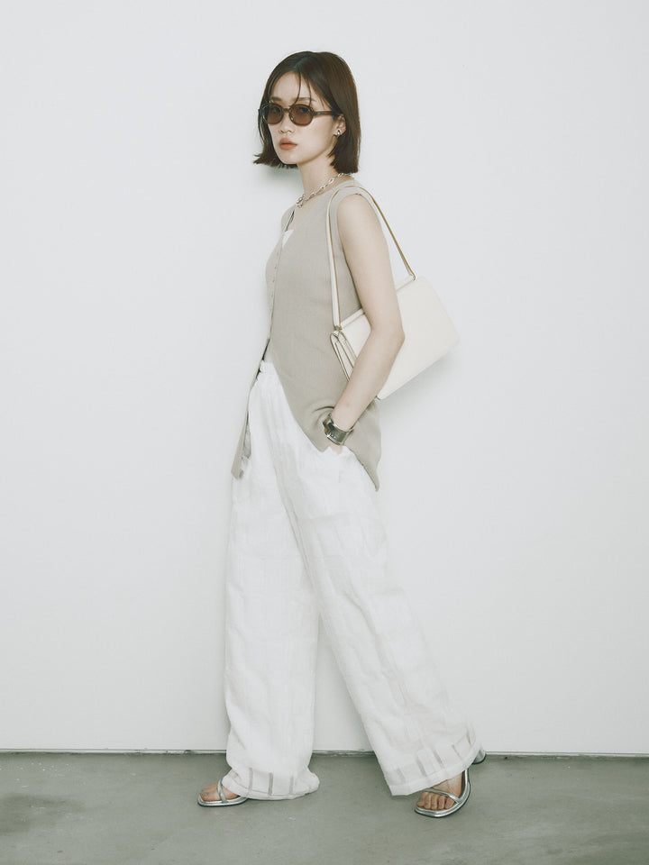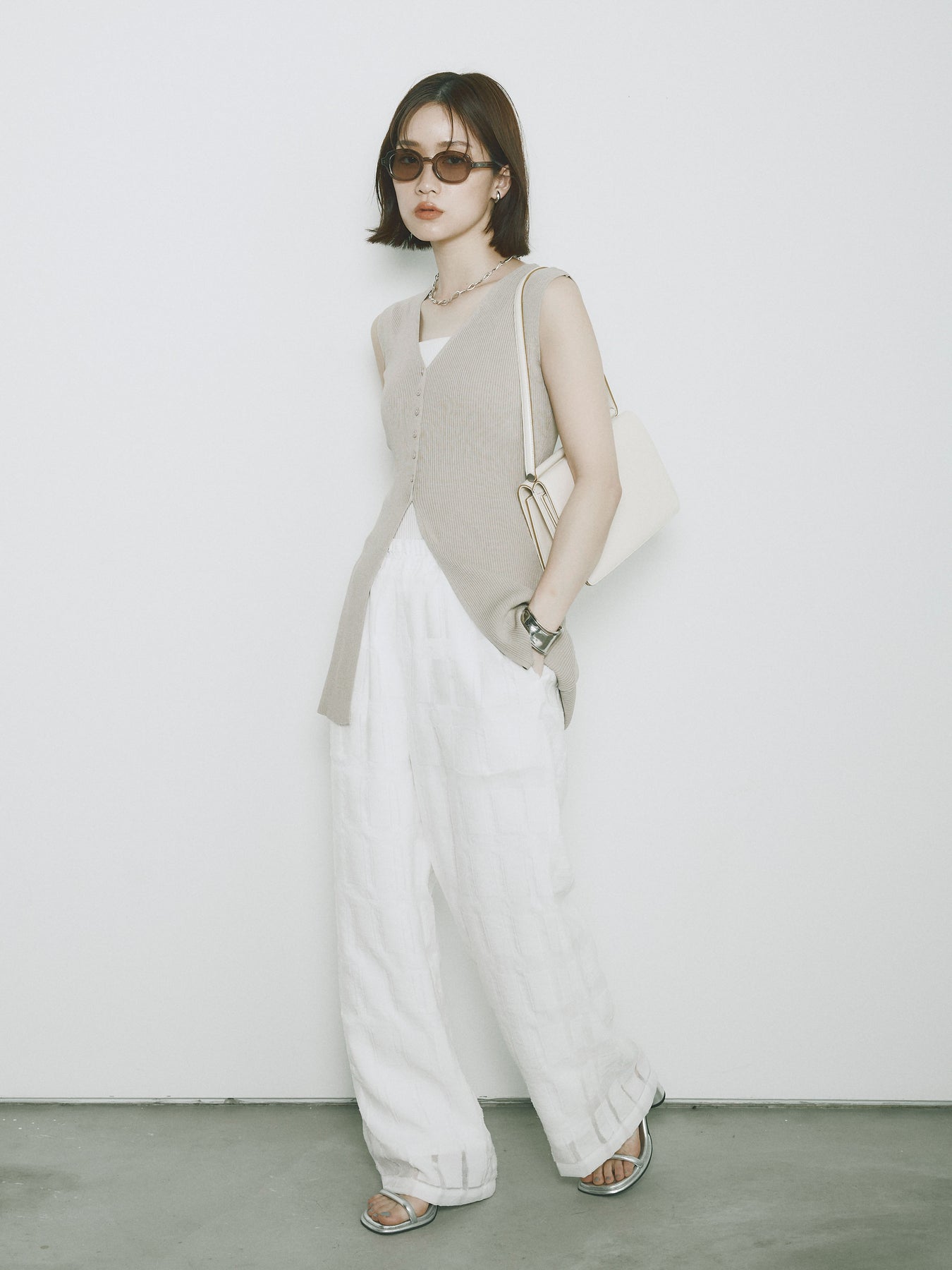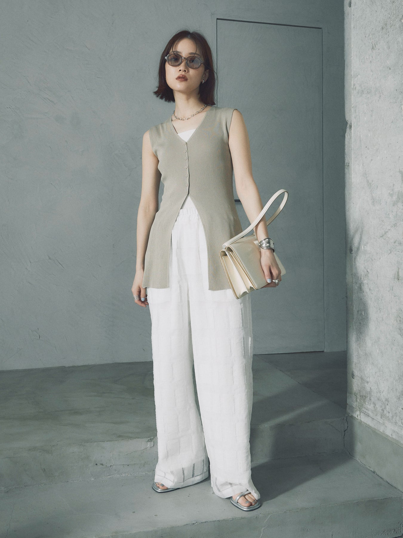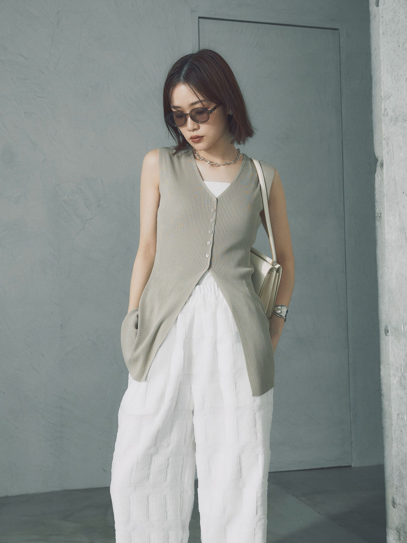 リブ編みの伸縮性のある素材を使用したフロントスリットデザインのニットトップス。シンプルながらも女性らしいシェイプラインを作り出し、上品な印象を与えます。Vネックデザインとフロントボタンで、カジュアルからエレガントまで幅広いスタイルに対応可能。シンプルながら存在感のある一枚です。 ※ボトムス、キャミソール(インナー)以外の商品は一律でインナーは付属していません。