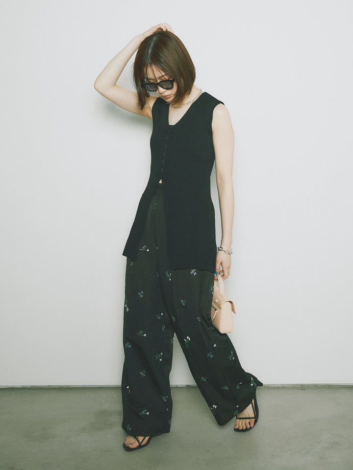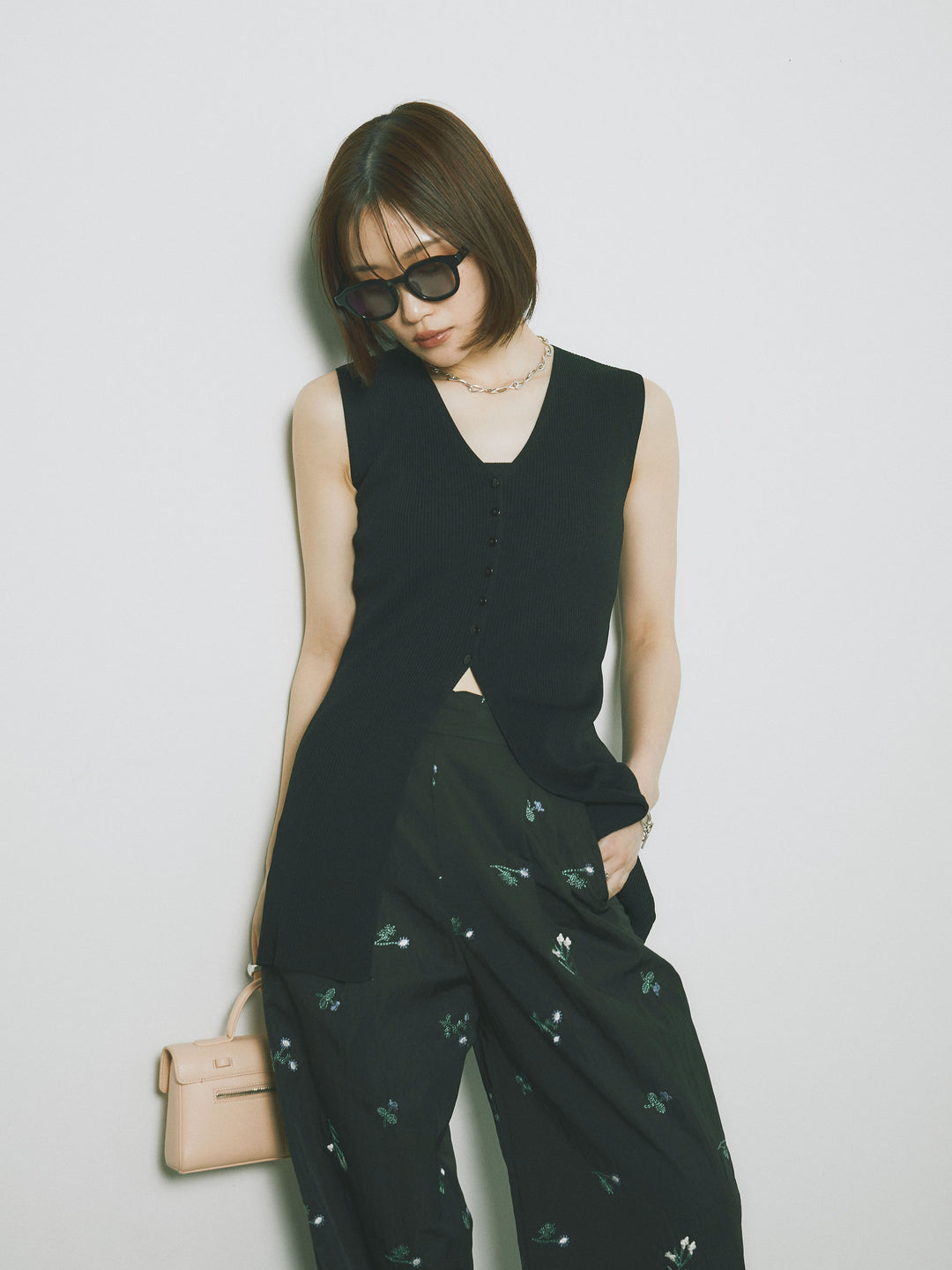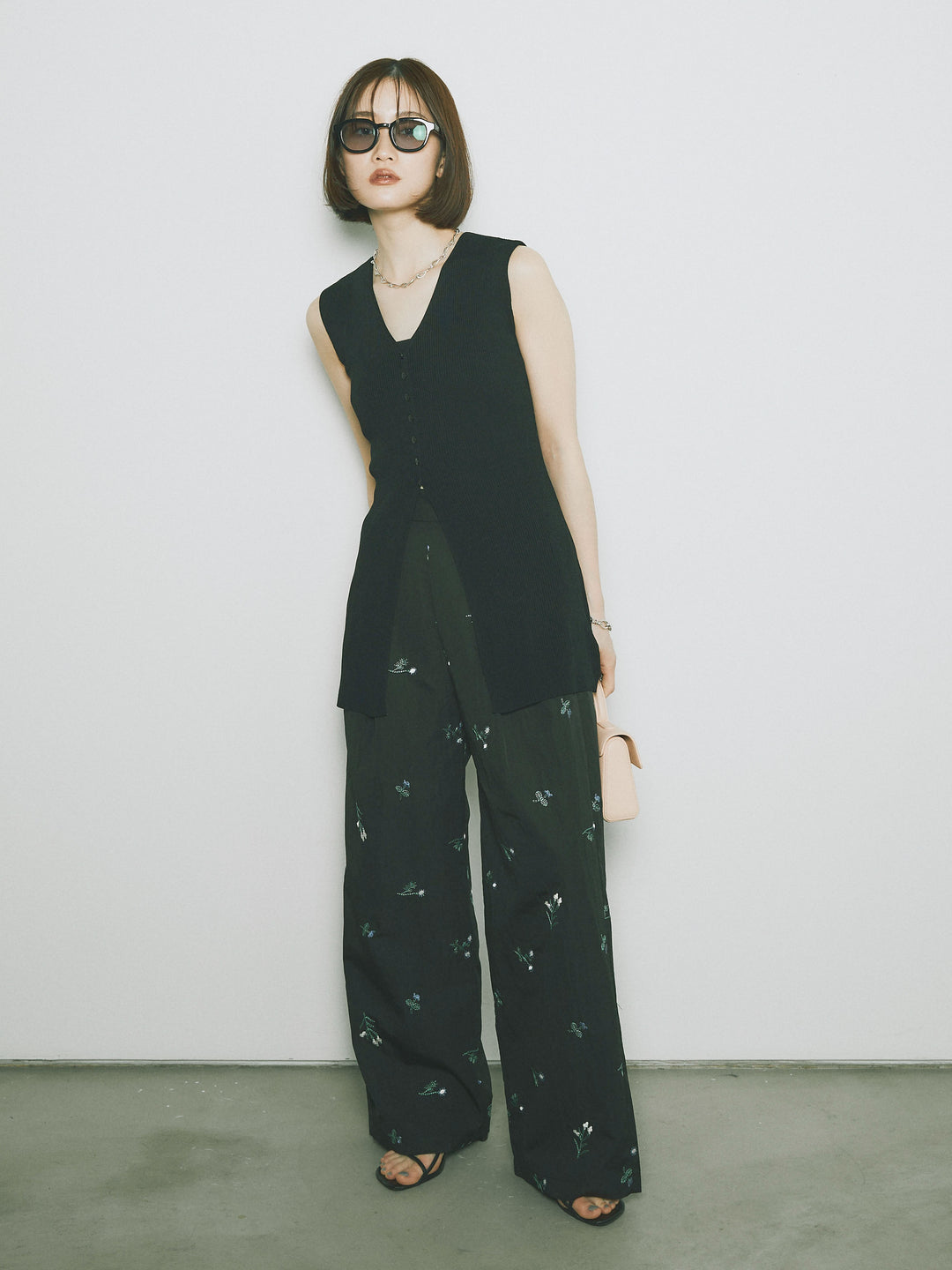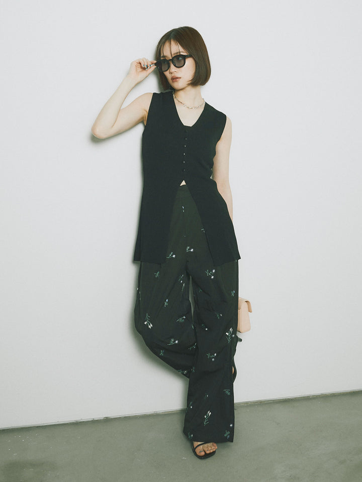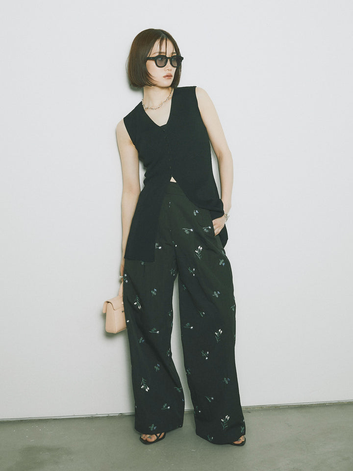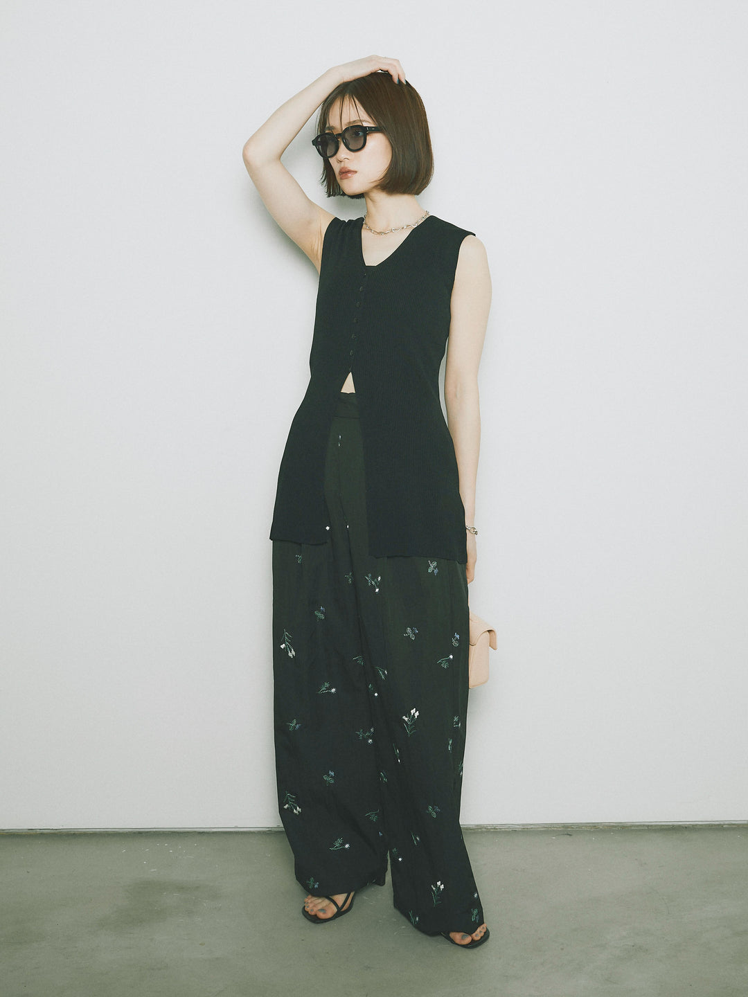 [SET]フロントスリットリブシェイプニットトップス+フラワー刺繍タフタタックパンツ(2set)