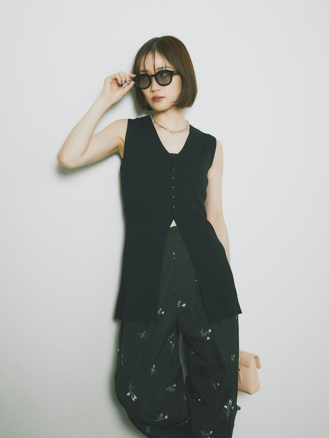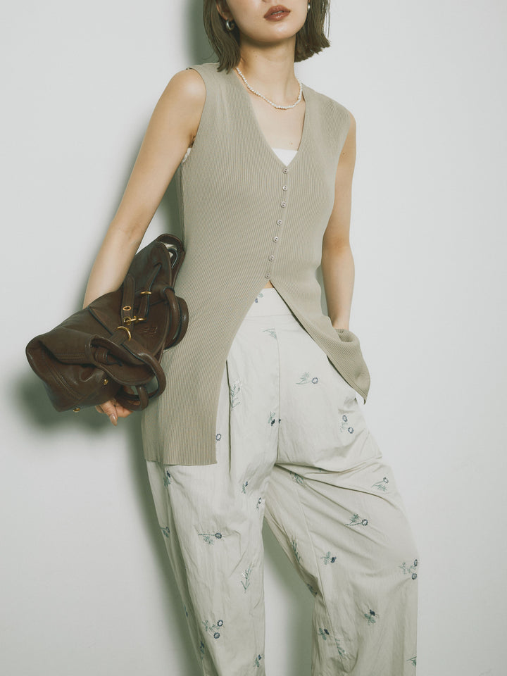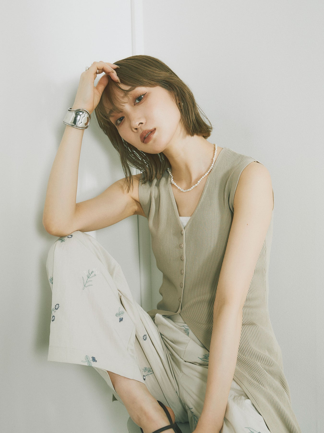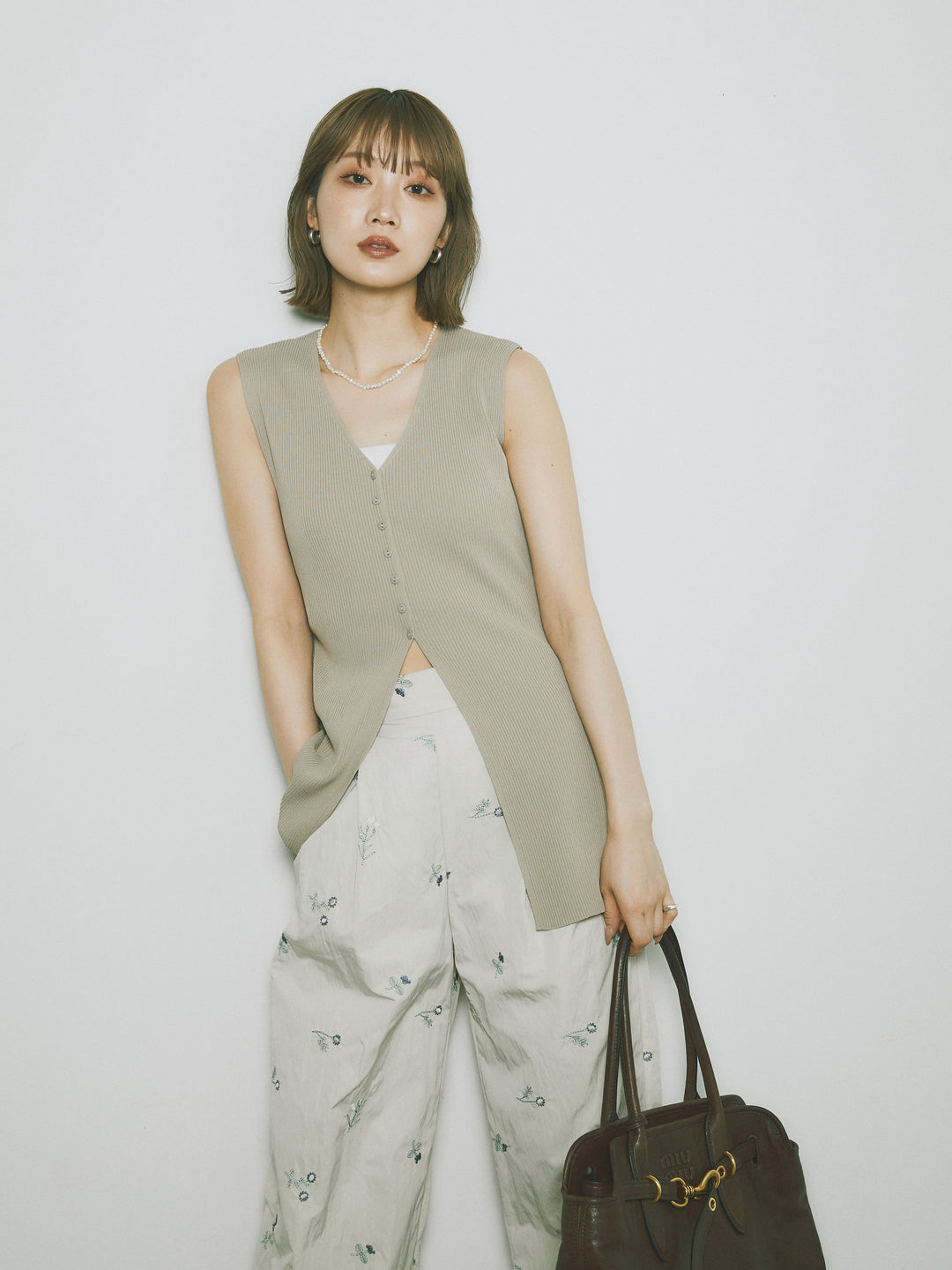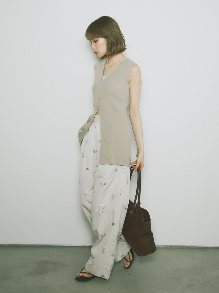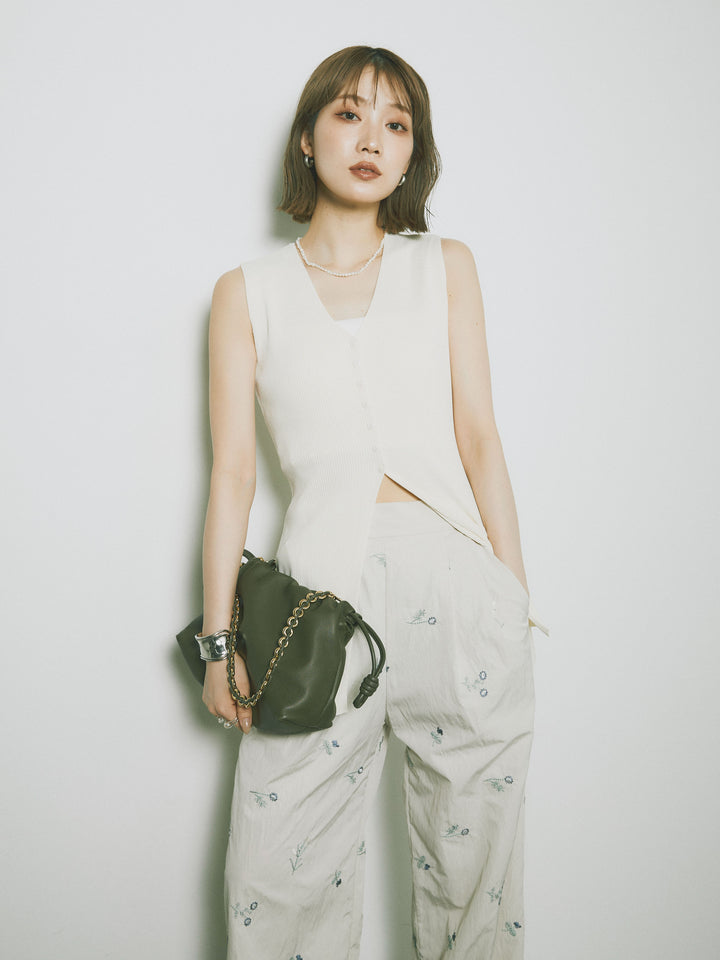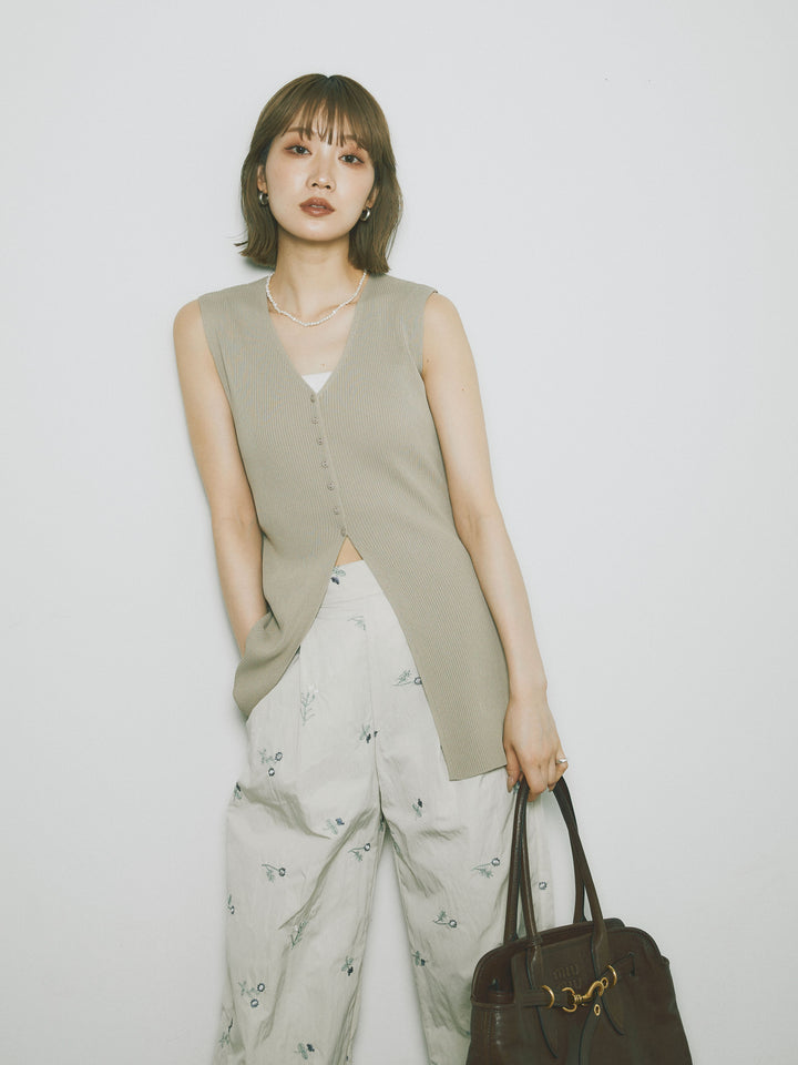 [SET]フロントスリットリブシェイプニットトップス+フラワー刺繍タフタタックパンツ(2set)
