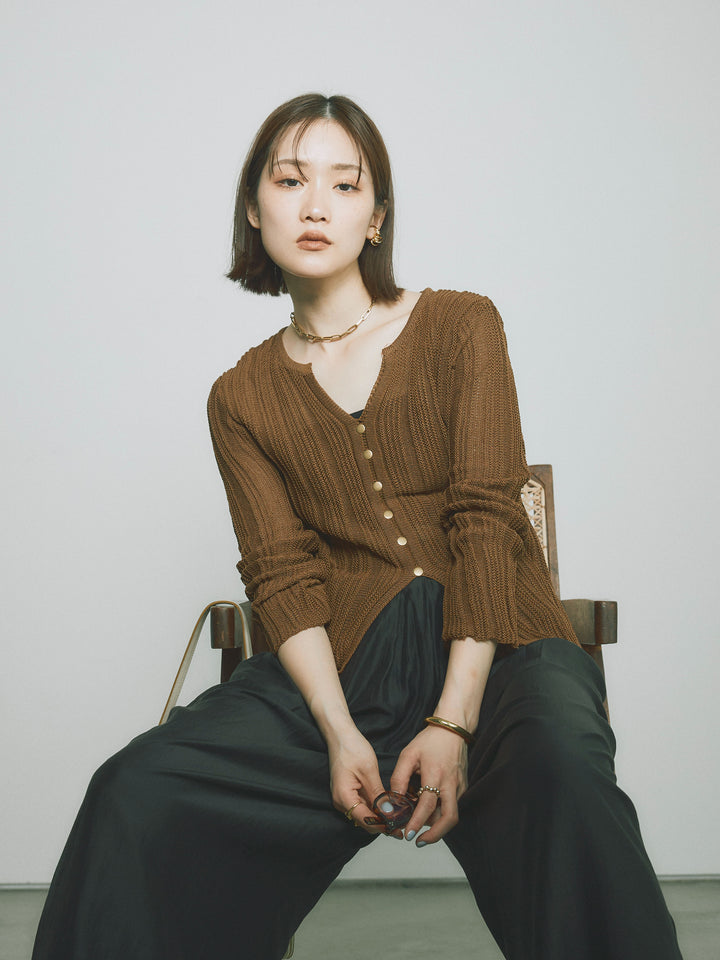 リブ編み素材を使用した、フロントスリットデザインのニットトップス。Vネックとフロントボタンがポイントとなり、シンプルながらも女性らしいシルエットを作り出します。程よくフィットする素材感で、上品でありながら着心地も抜群。カジュアルにもエレガントにも活躍するアイテムです。 ※ボトムス、キャミソール(インナー)以外の商品は一律でインナーは付属していません。
