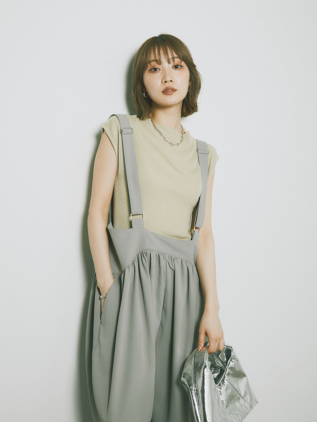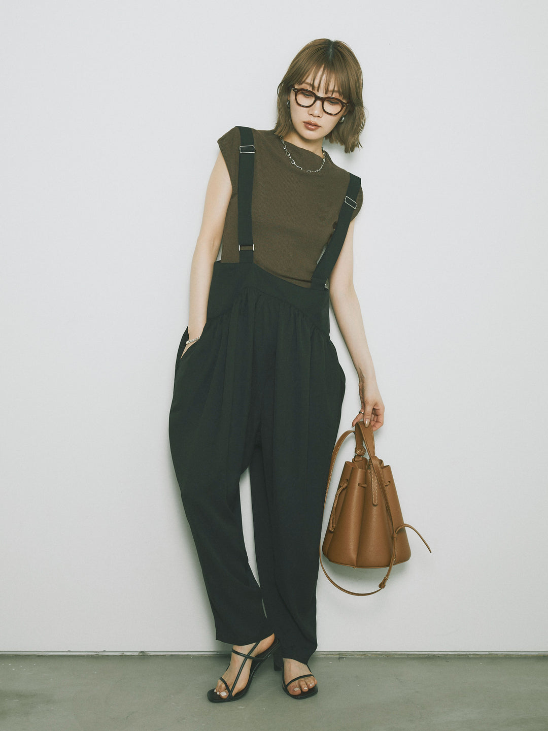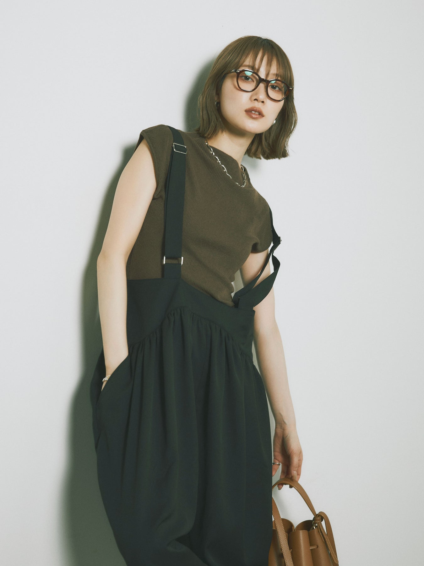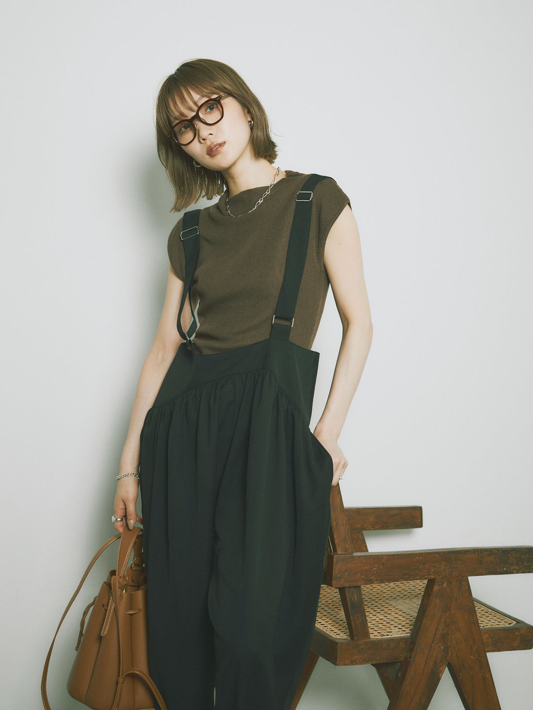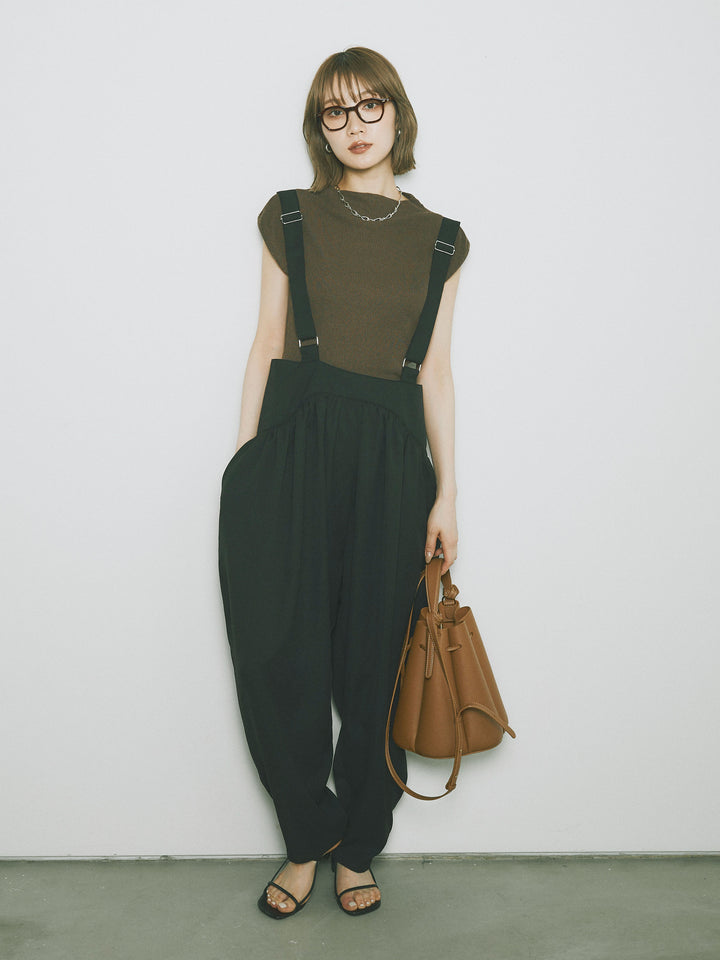 [SET]プチネックノースリーブリブニットトップス+サスペンダーバルーンパンツ(2set)