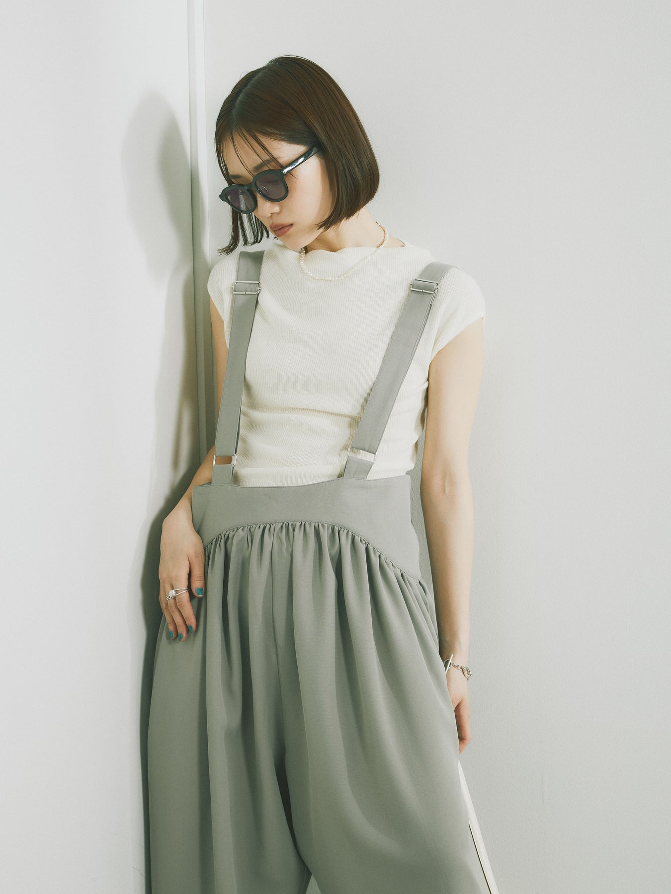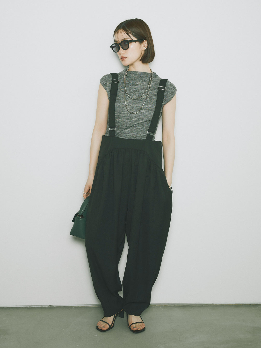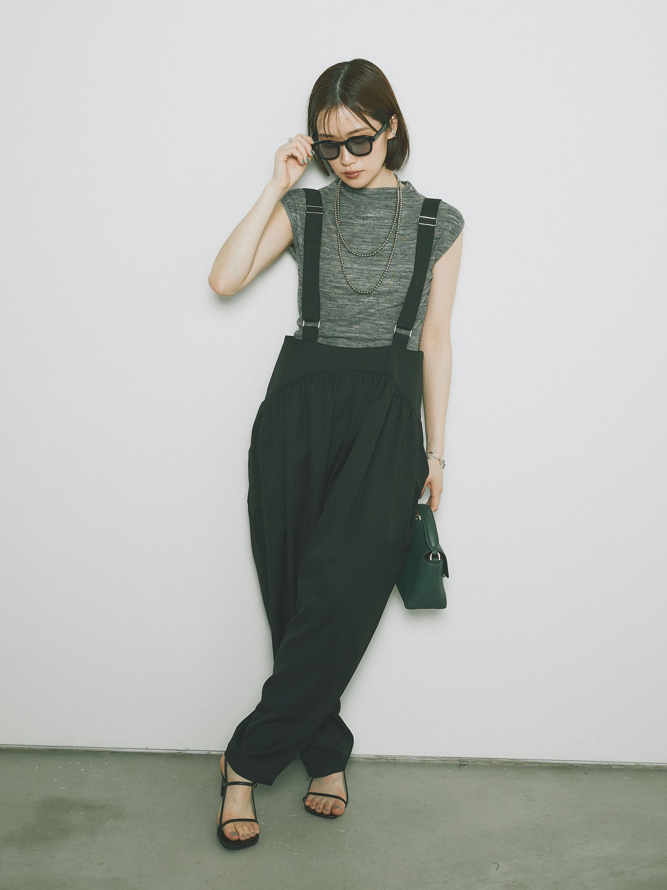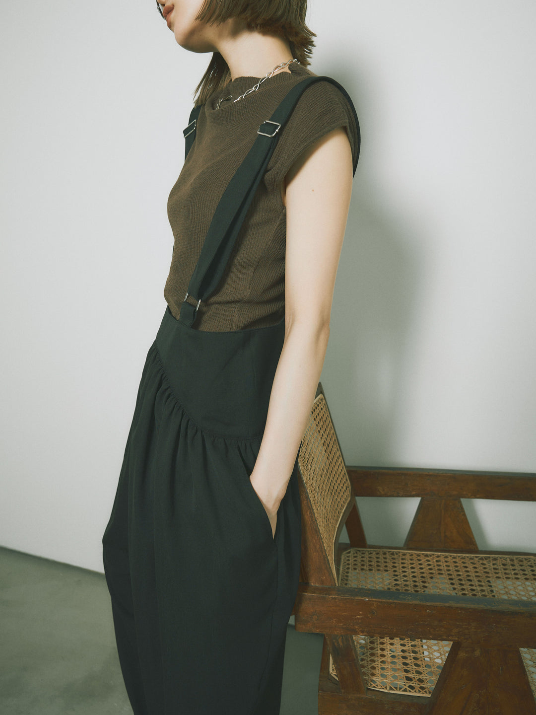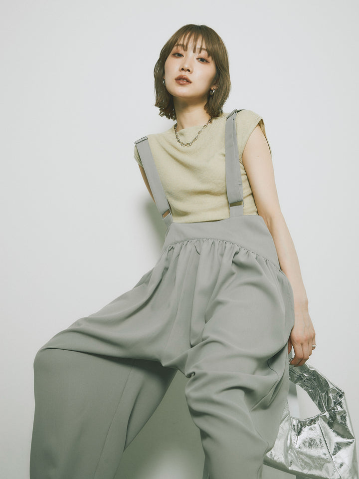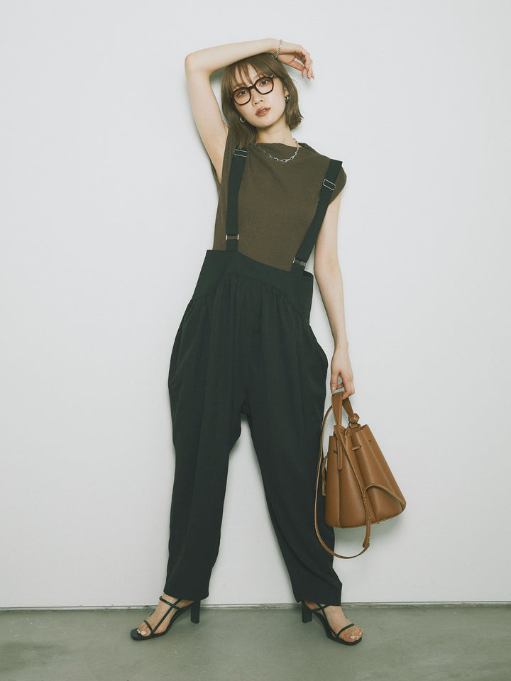[SET]プチネックノースリーブリブニットトップス+サスペンダーバルーンパンツ(2set)