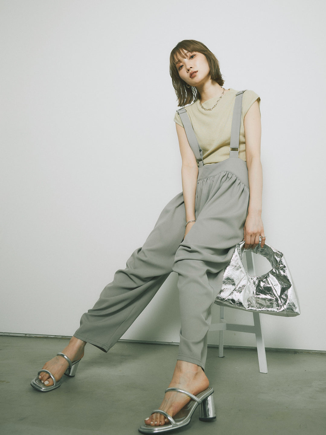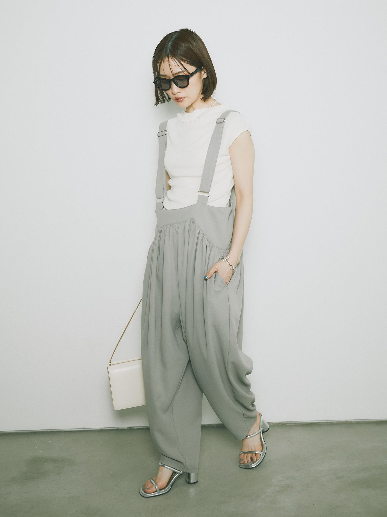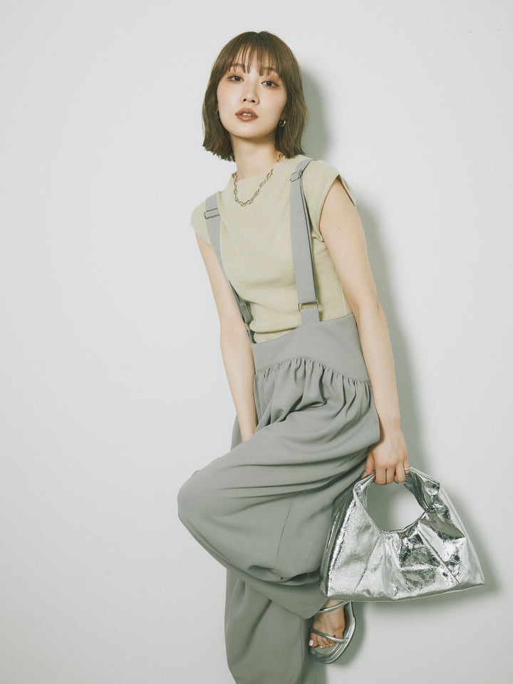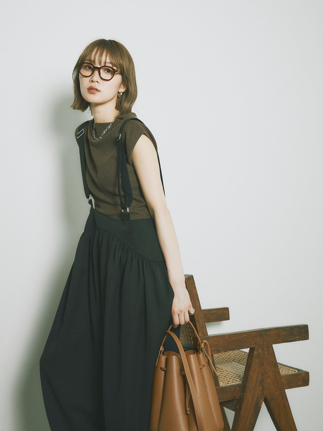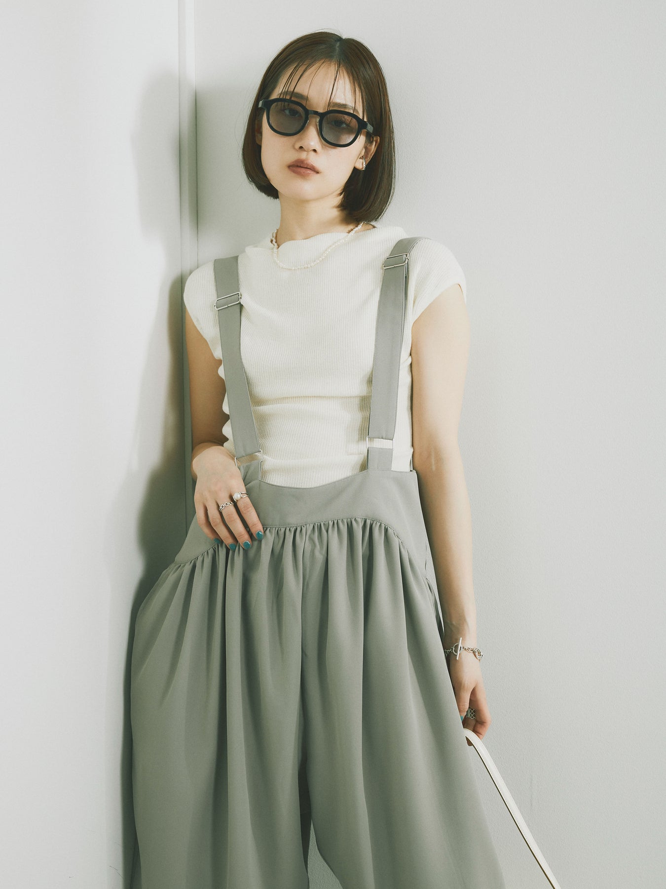 [SET]プチネックノースリーブリブニットトップス+サスペンダーバルーンパンツ(2set)