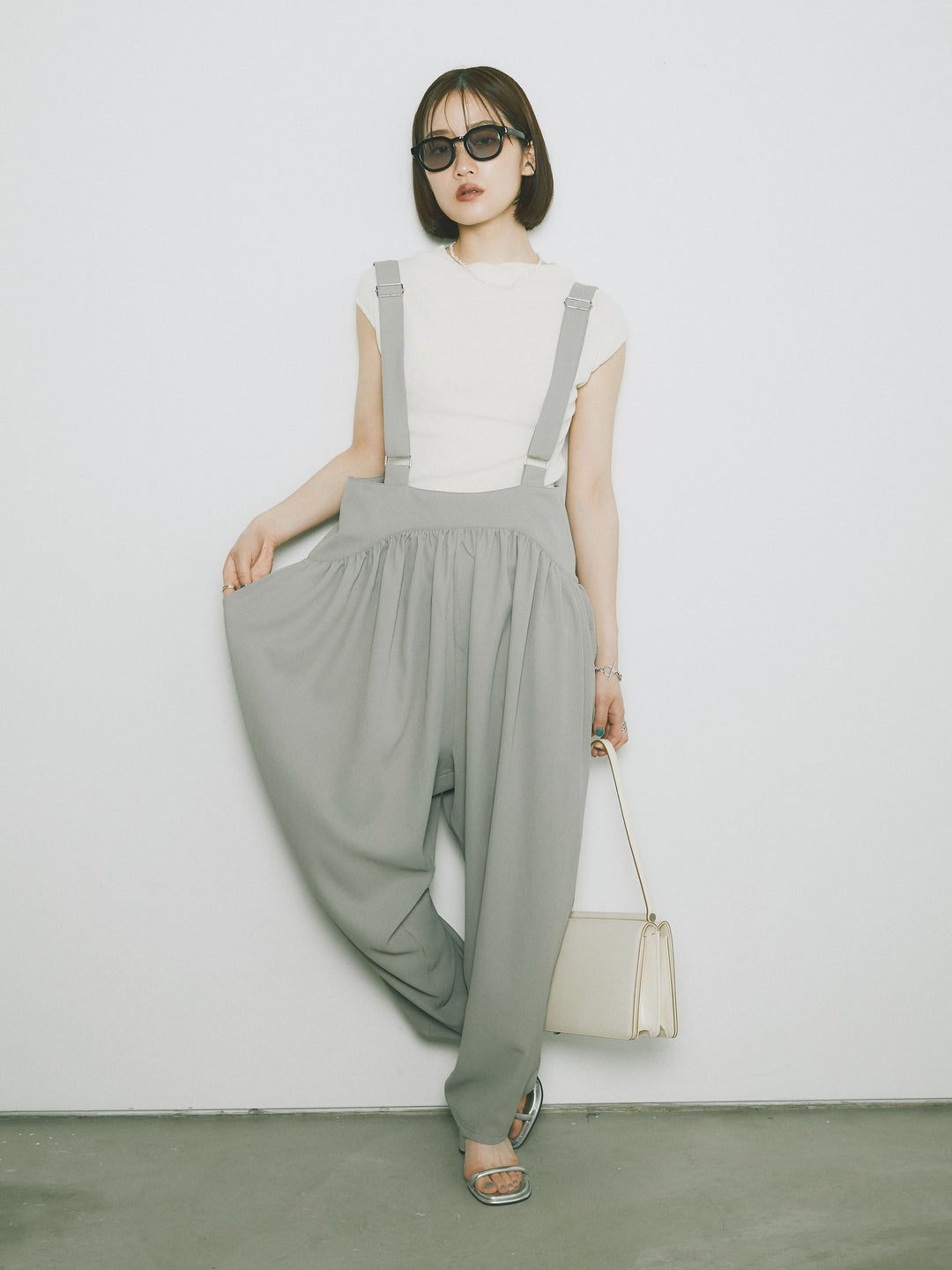 サスペンダーデザインが特徴的なバルーンシルエットのパンツ。肩紐の調整が可能で、自分の体型に合わせてフィット感を調整できるのがポイントです。ウエスト部分はゴム入りで、リラックスした着心地を提供します。ゆったりとしたシルエットながら、すっきりとしたラインを作り出し、スタイルアップ効果も抜群。ブラックとグレーのシンプルなカラー展開で、様々なトップスと合わせやすいアイテムです。