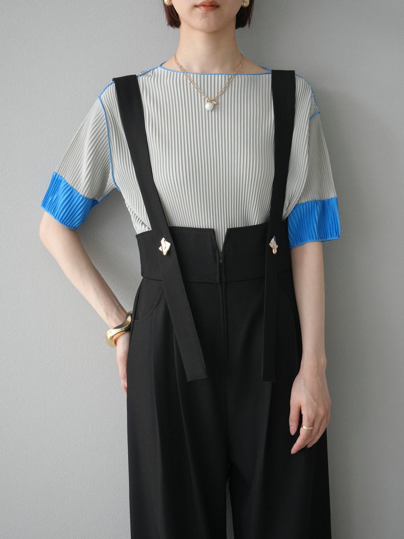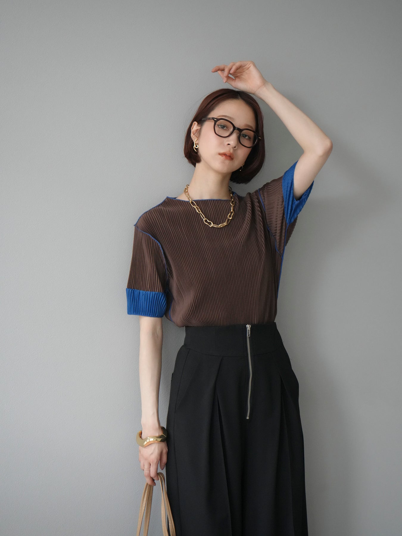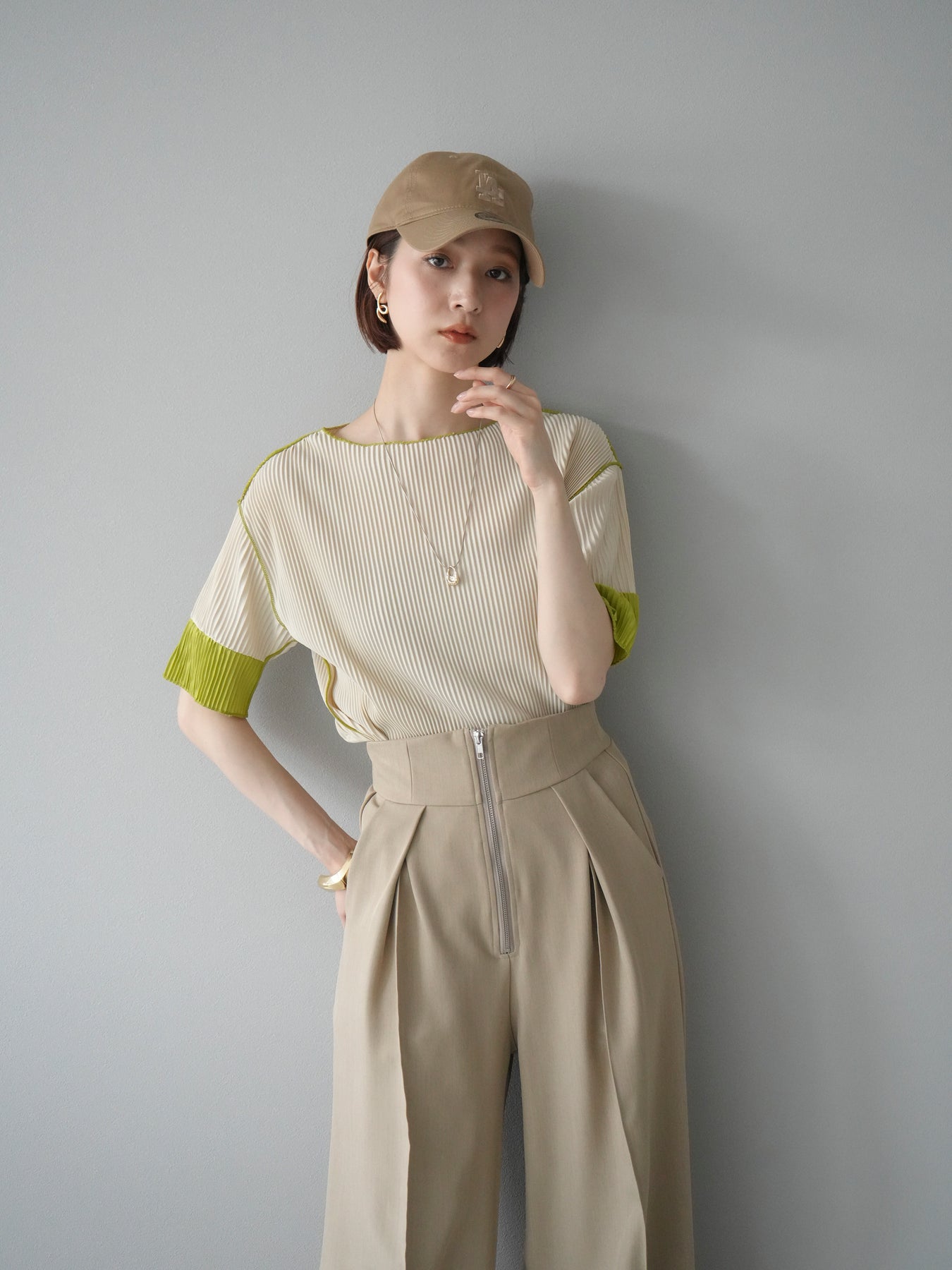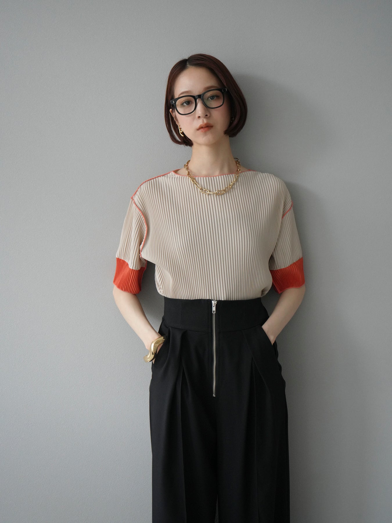 [予約]配色プリーツハーフスリーブトップス + [予約]配色プリーツハーフスリーブトップス