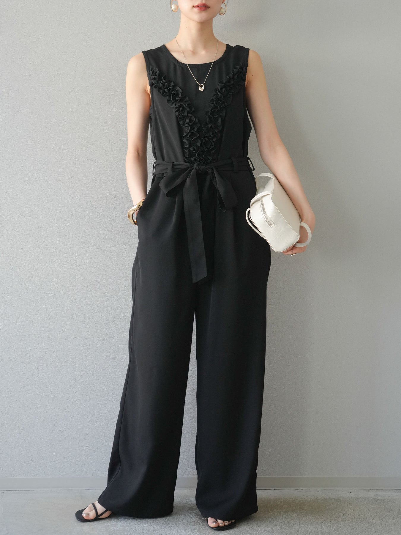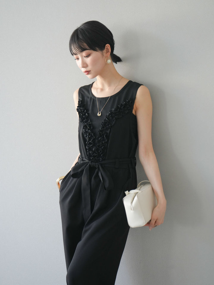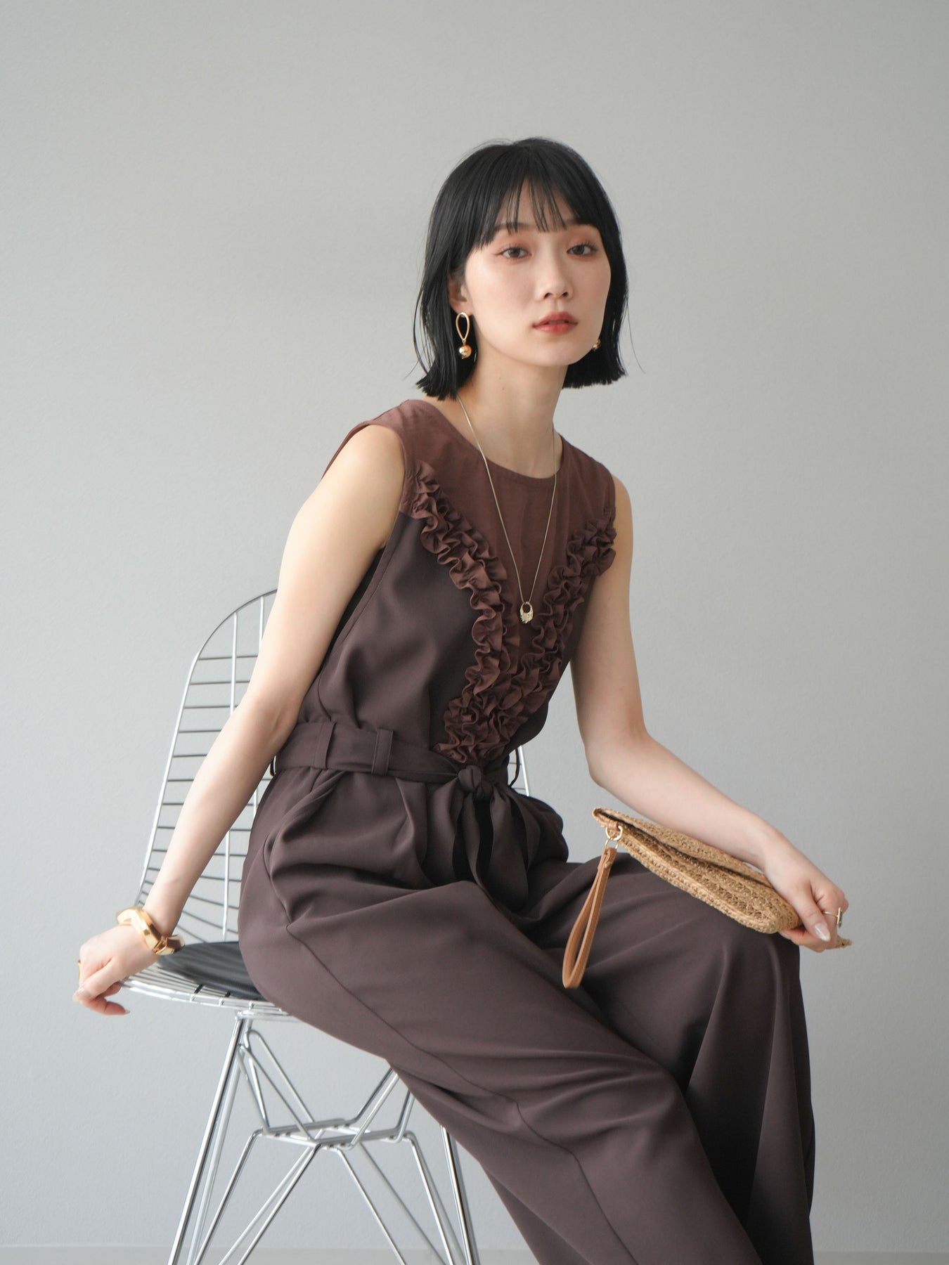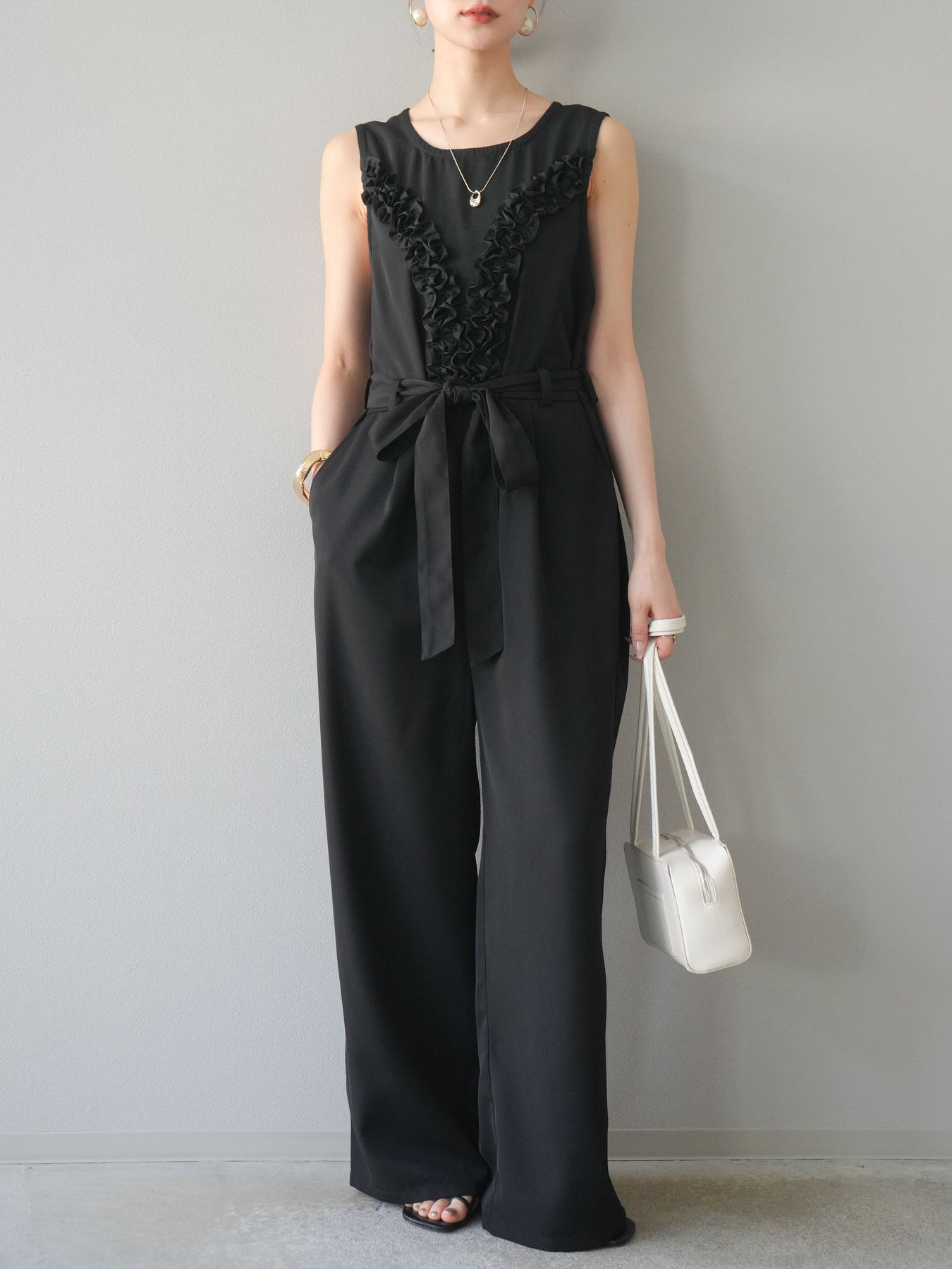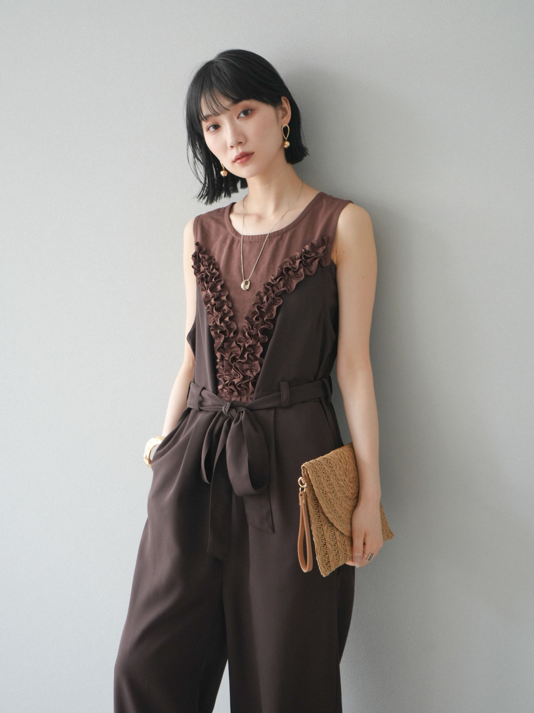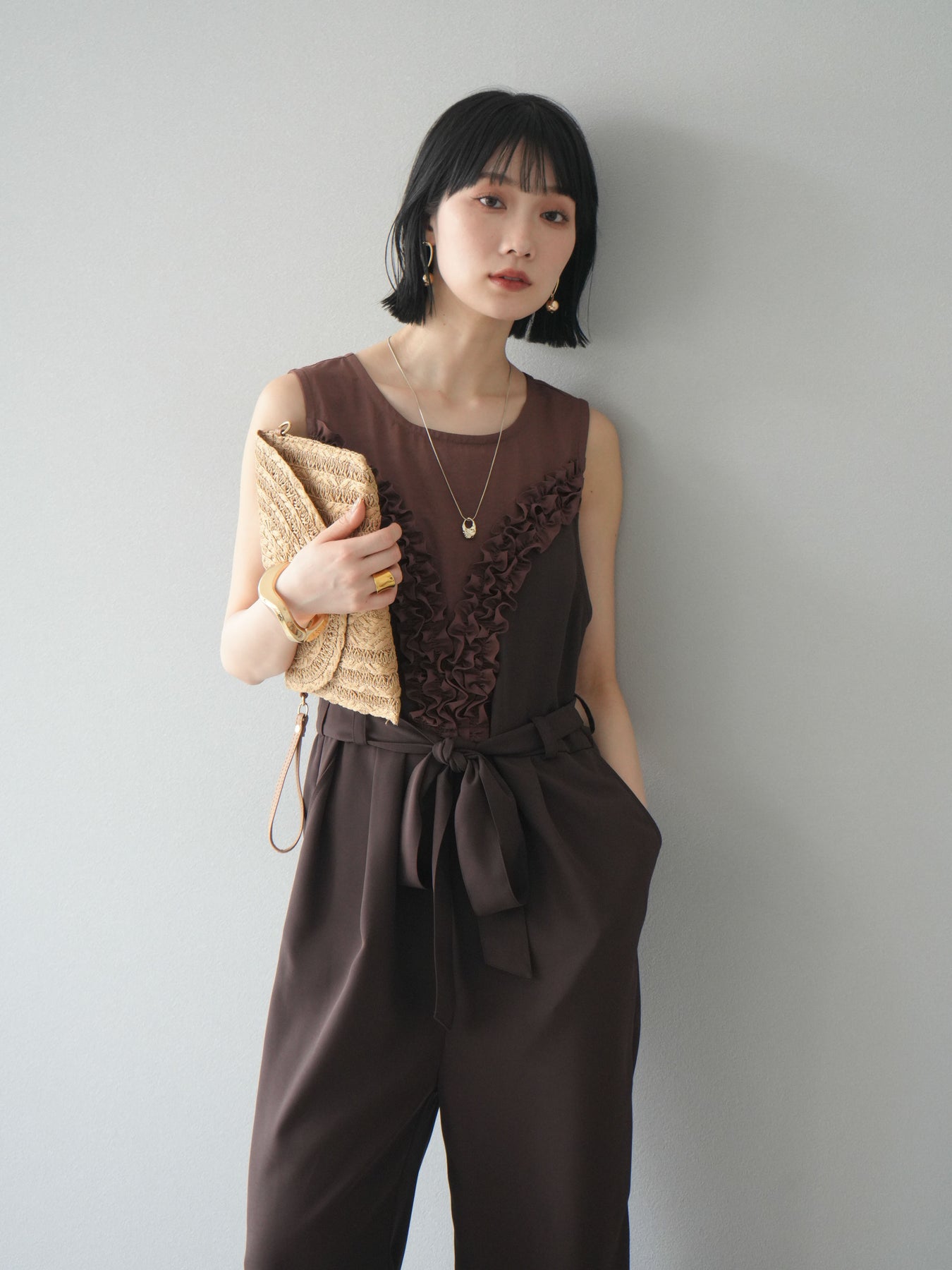 胸元に施した立体感のあるフリルが華やかなアクセントになるジャンプスーツ。ウエストのリボンベルトでメリハリのあるシルエットが叶い、スタイルアップ効果も期待できます。落ち感のある素材で、きれいめにもカジュアルにも着こなせる万能アイテム。トレンド感と女性らしさを両立した一着です。 ※ボトムス、キャミソール(インナー)以外の商品は一律でインナーは付属していません