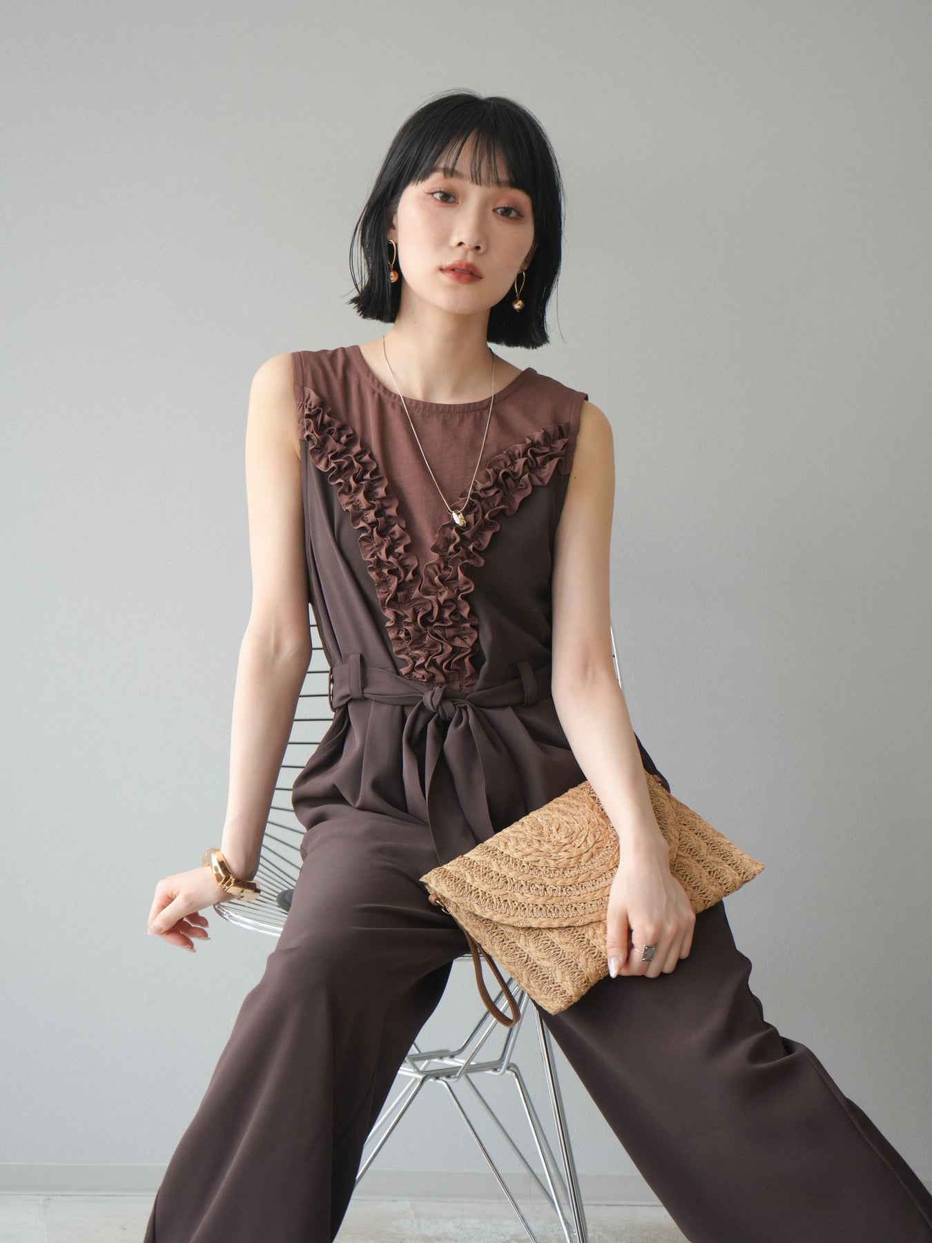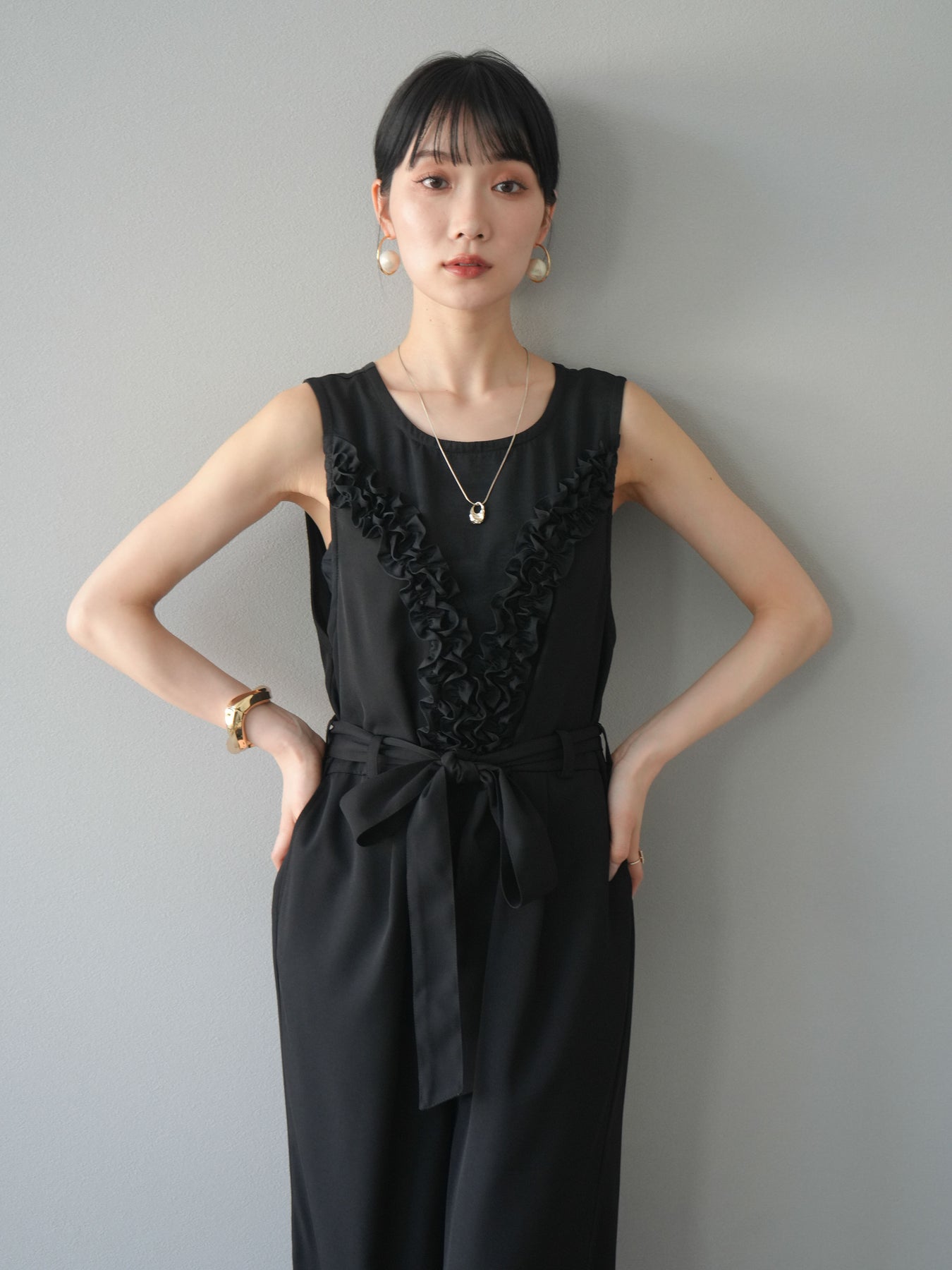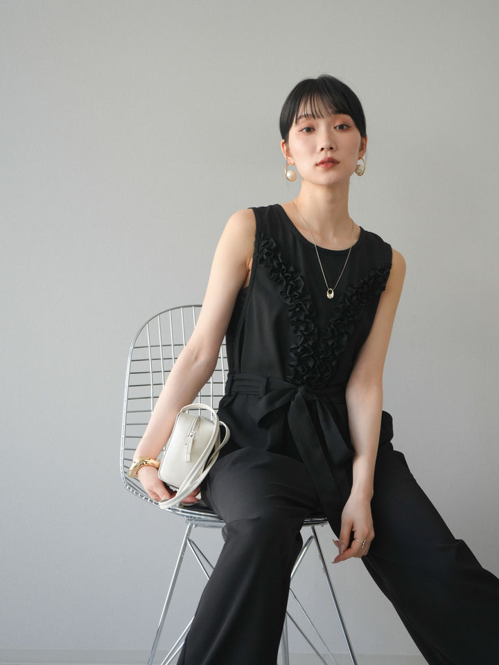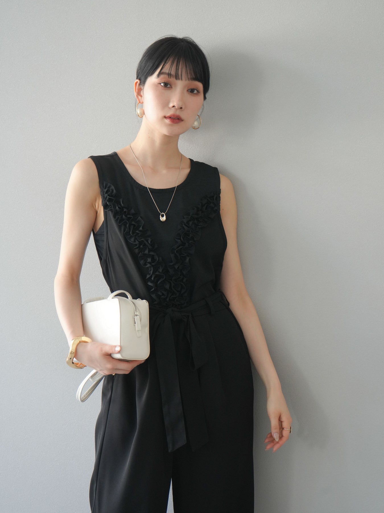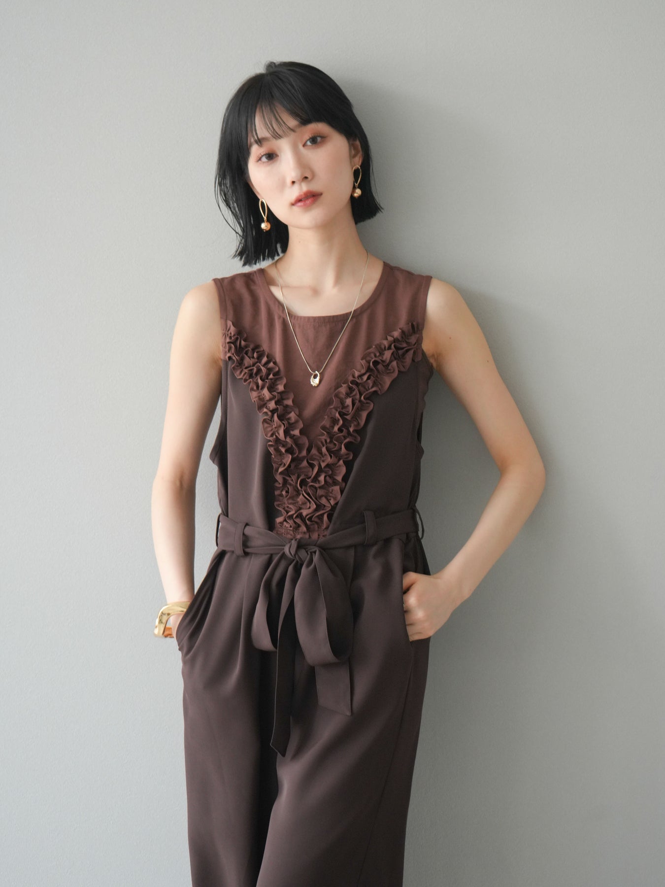 胸元に施した立体感のあるフリルが華やかなアクセントになるジャンプスーツ。ウエストのリボンベルトでメリハリのあるシルエットが叶い、スタイルアップ効果も期待できます。落ち感のある素材で、きれいめにもカジュアルにも着こなせる万能アイテム。トレンド感と女性らしさを両立した一着です。 ※ボトムス、キャミソール(インナー)以外の商品は一律でインナーは付属していません