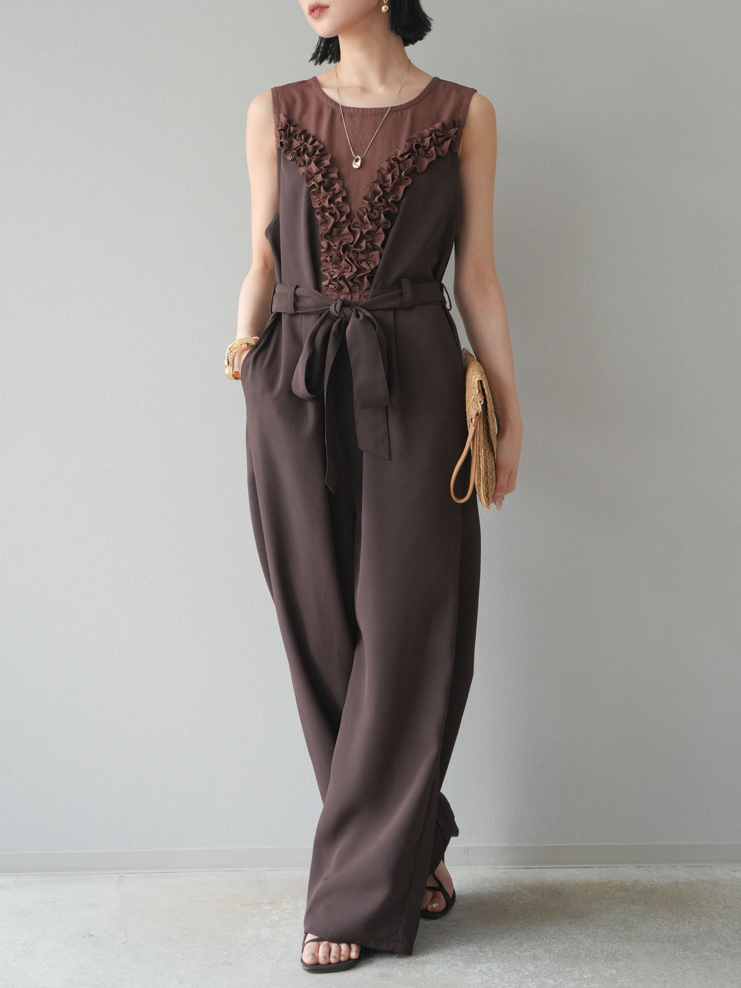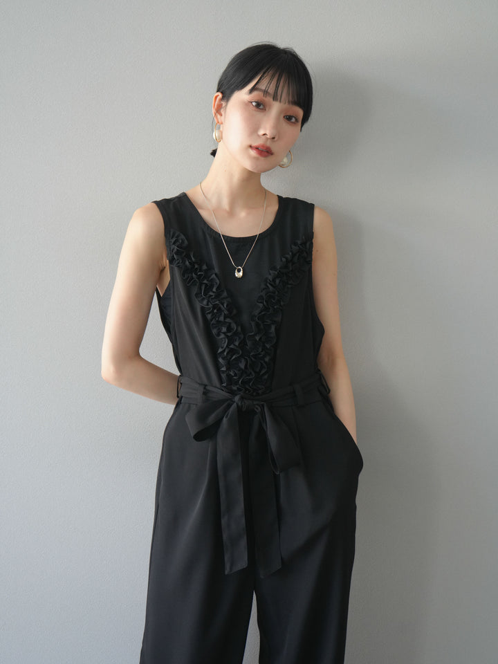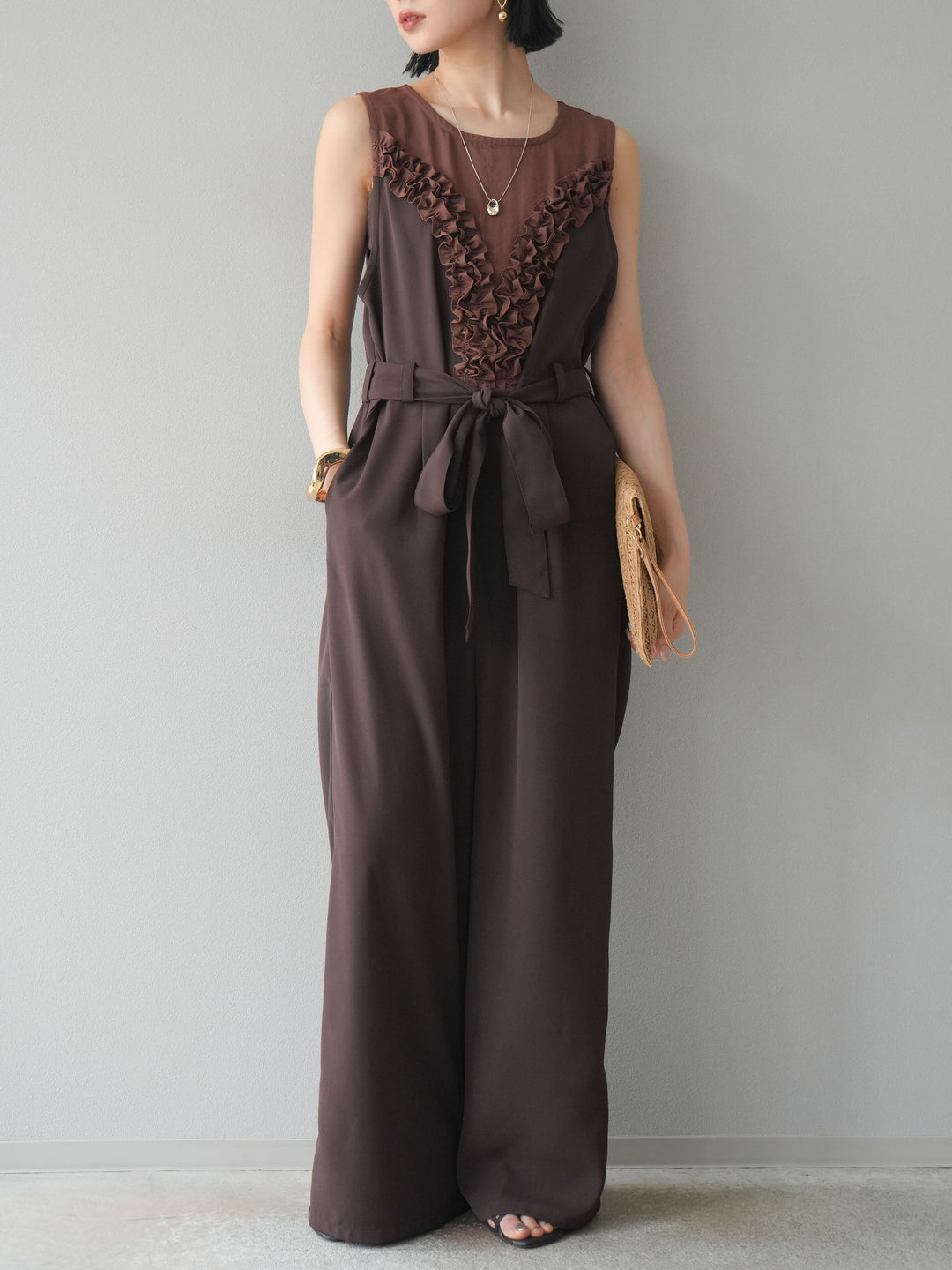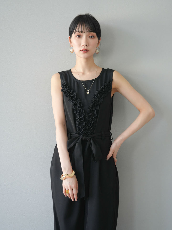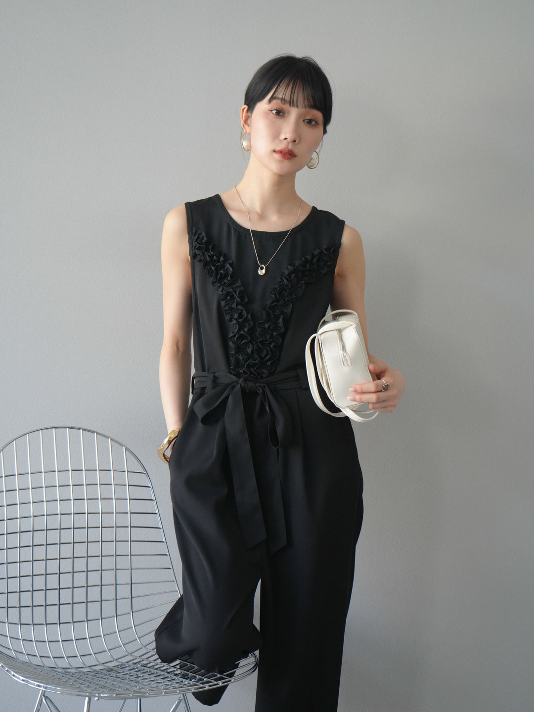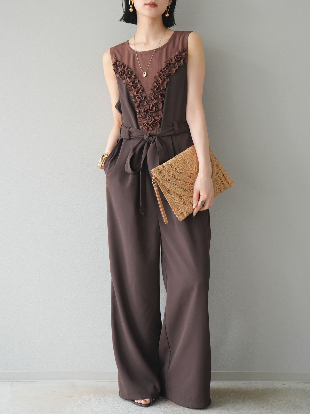 胸元に施した立体感のあるフリルが華やかなアクセントになるジャンプスーツ。ウエストのリボンベルトでメリハリのあるシルエットが叶い、スタイルアップ効果も期待できます。落ち感のある素材で、きれいめにもカジュアルにも着こなせる万能アイテム。トレンド感と女性らしさを両立した一着です。 ※ボトムス、キャミソール(インナー)以外の商品は一律でインナーは付属していません